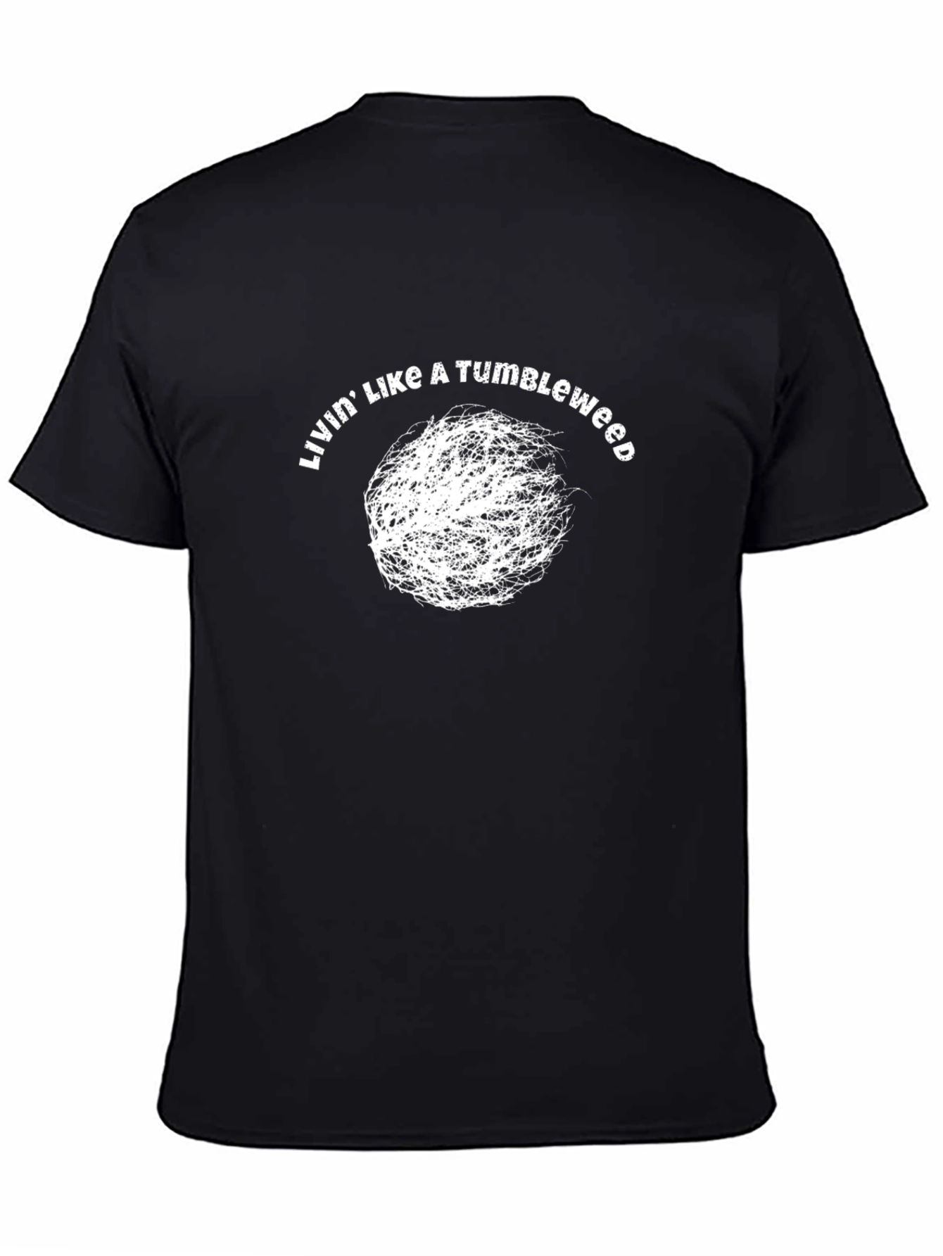 Esta camiseta negra de manga corta presenta un diseño único y llamativo. En el centro, un gráfico blanco que simula un cardo ruso, rodeado de la frase "Livin' Like A Tumbleweed" (Viviendo Como Un Cardo Ruso). La camiseta parece ser de algodón suave, ofreciendo comodidad y estilo casual. Ideal para aquellos que buscan expresar su individualidad y un espíritu libre. Perfecta para usar a diario, en eventos informales, o como una pieza de declaración. Añade un toque de originalidad a tu guardarropa con esta camiseta audaz y divertida.