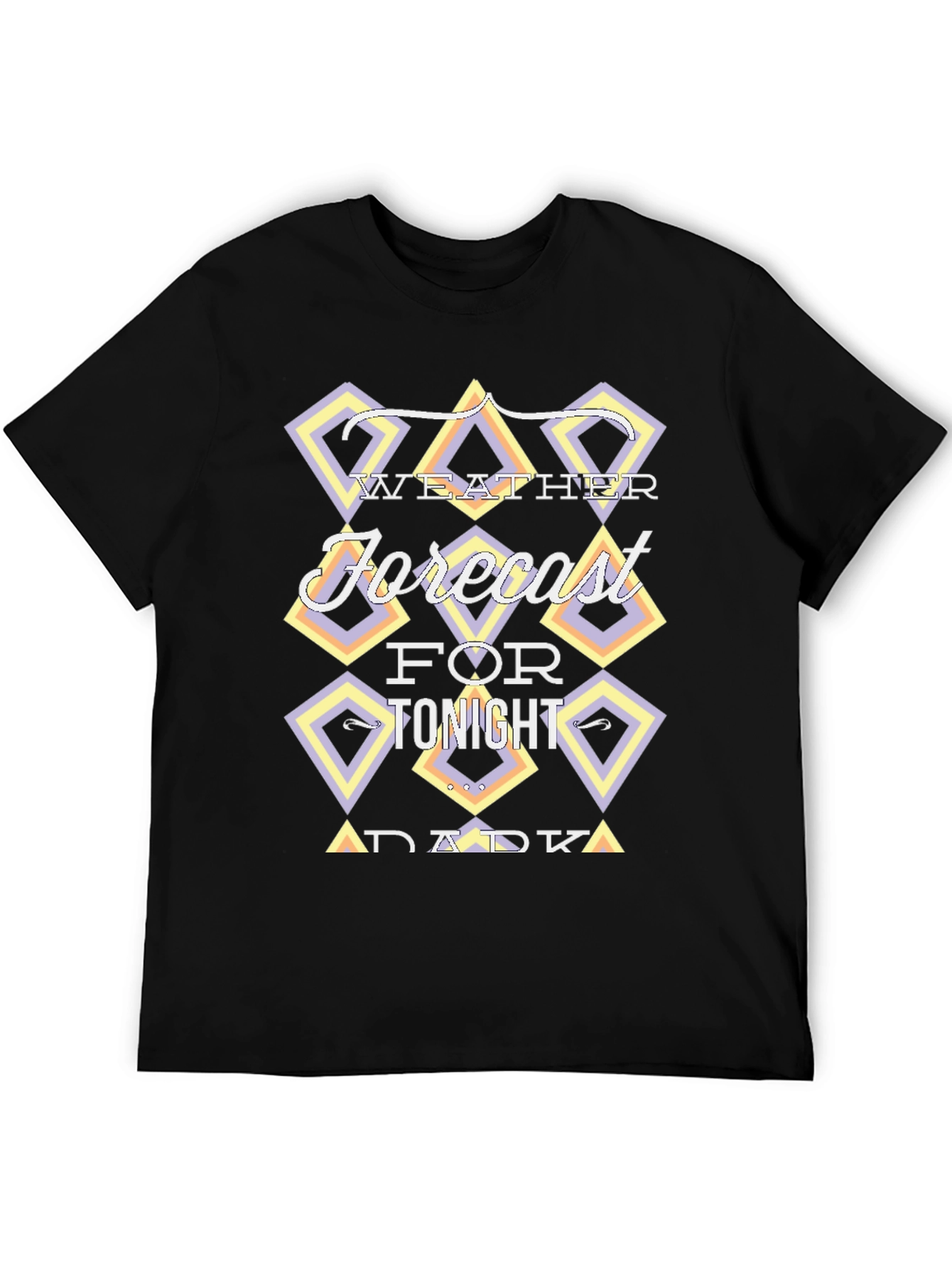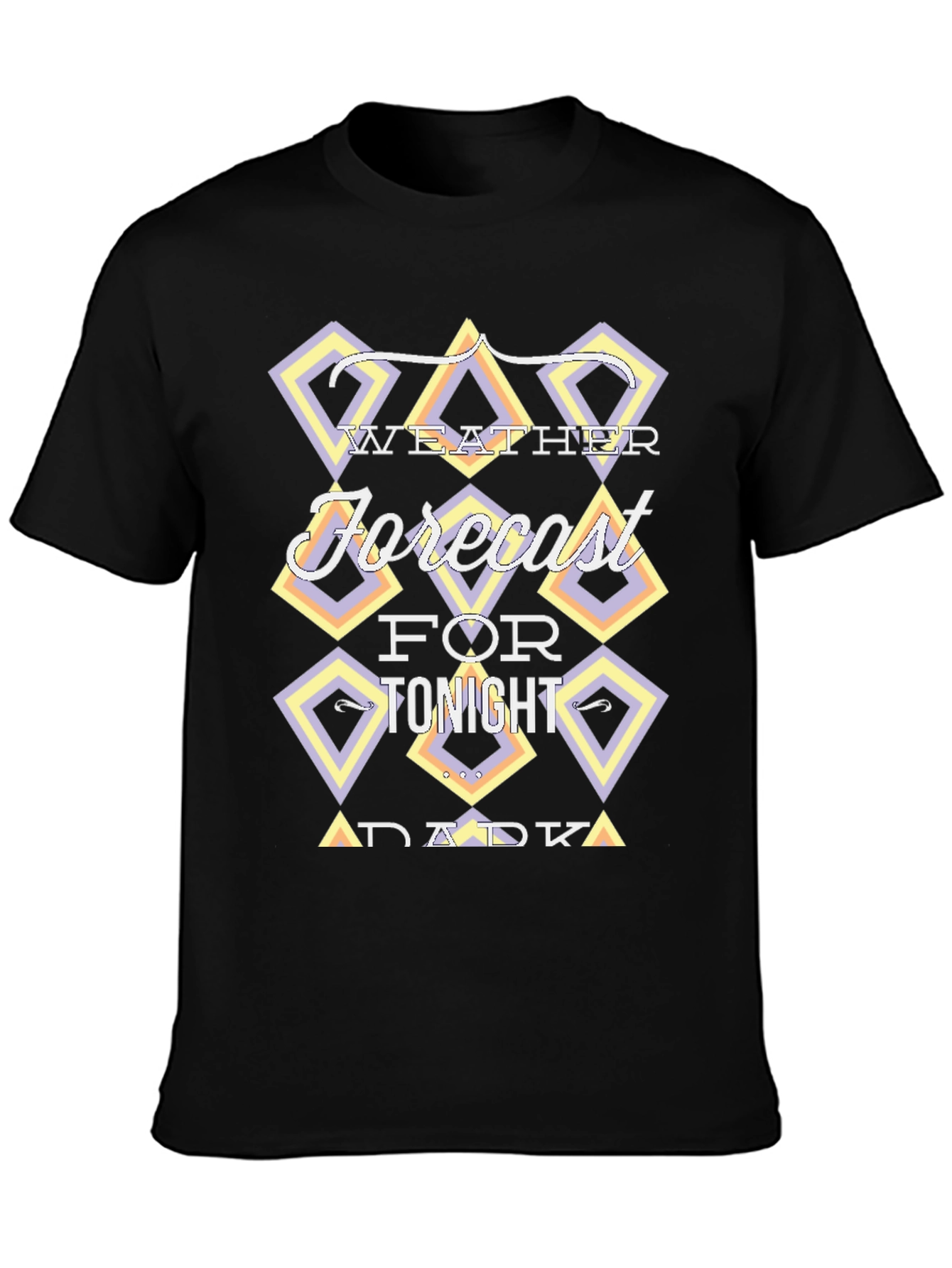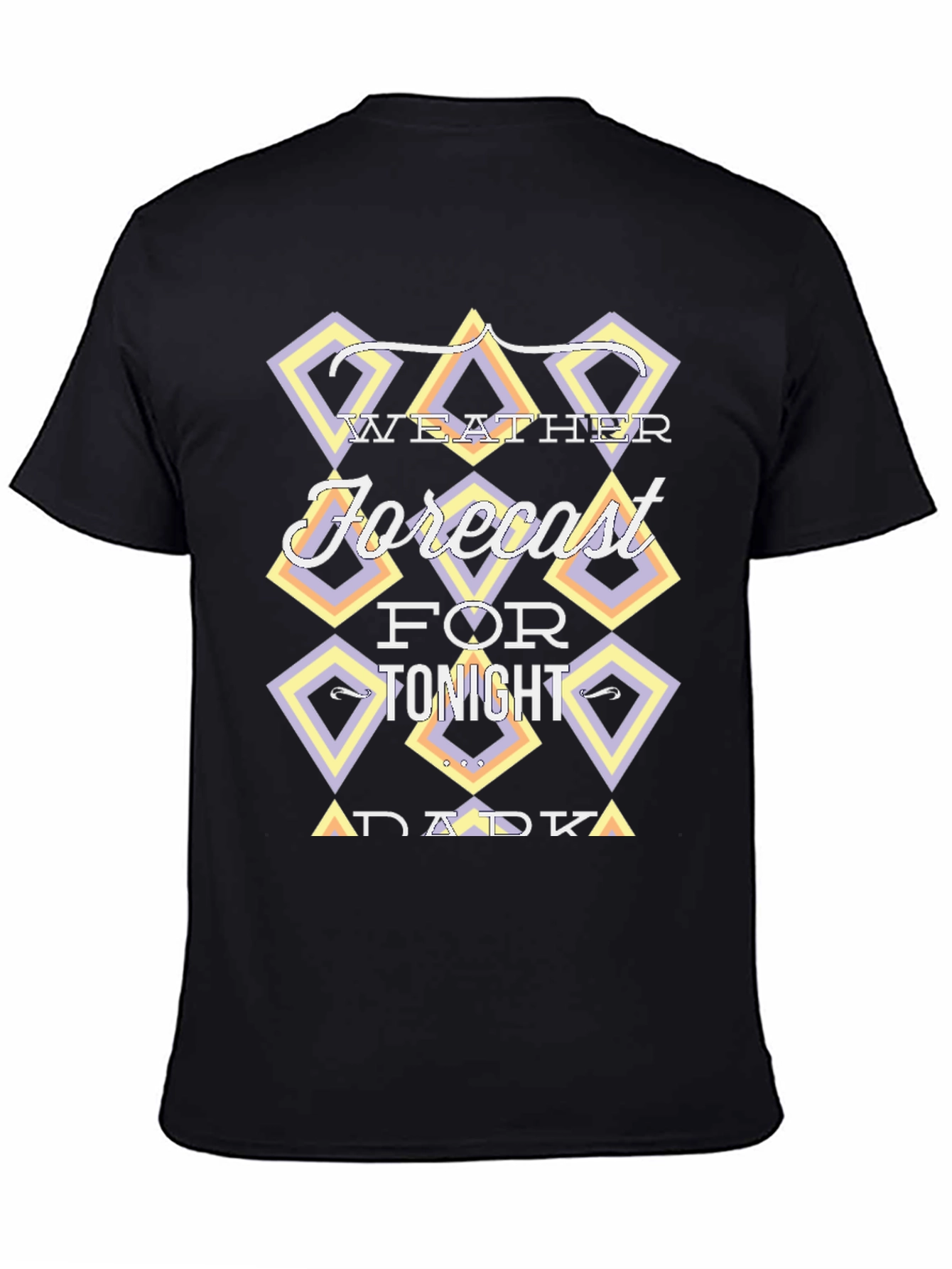 Luce esta camiseta negra de manga corta con un diseño moderno y original. En el pecho presenta un llamativo gráfico con la frase "Weather Forecast for Tonight Dark", enmarcada en rombos con tonalidades pastel como lila y amarillo, que le dan un toque retro y divertido. Ideal para un look casual y desenfadado, perfecta para combinar con tus jeans favoritos y expresar tu estilo único. Su tejido suave al tacto garantiza comodidad durante todo el día. ¡Destaca con esta prenda llena de personalidad!