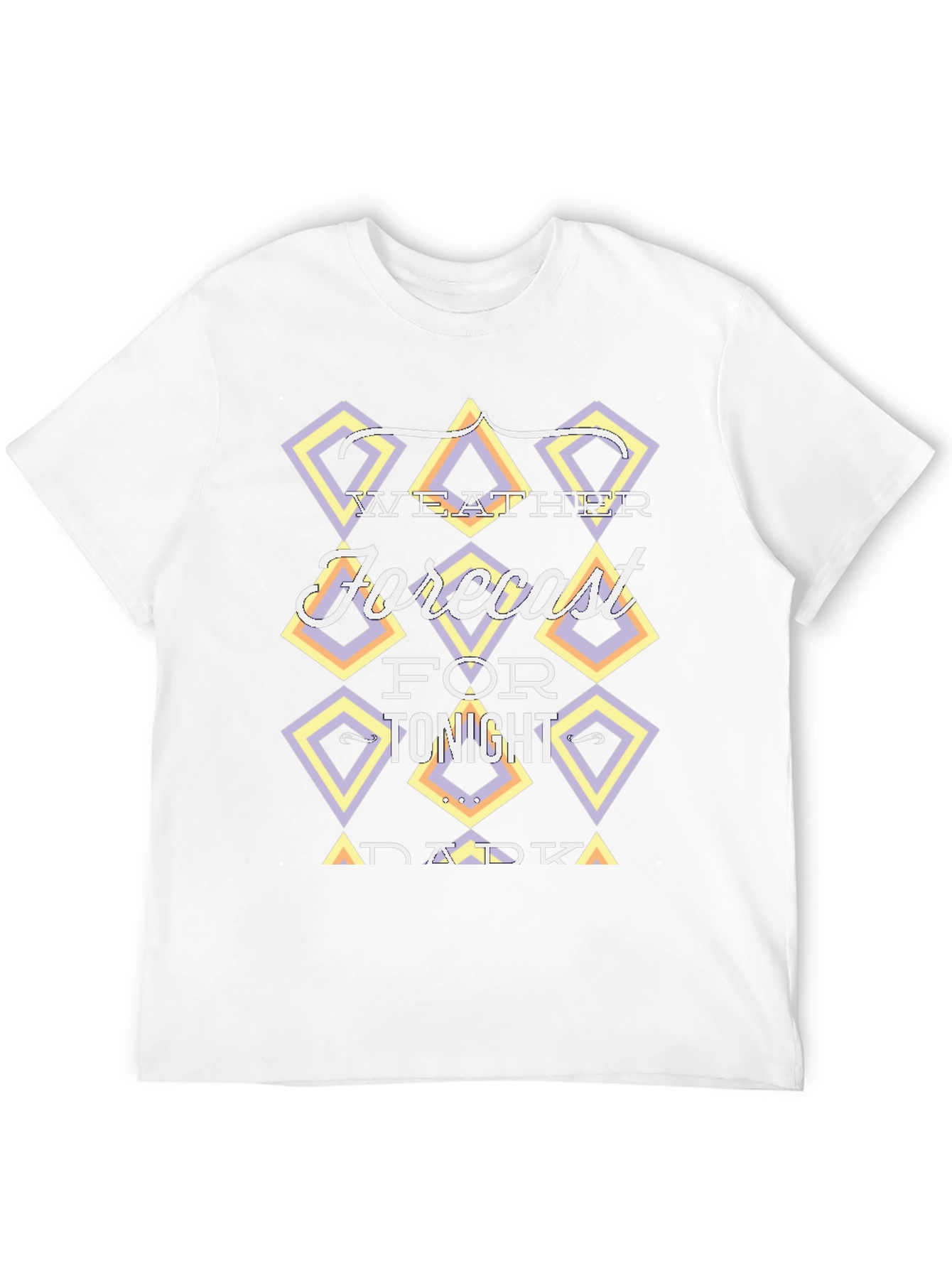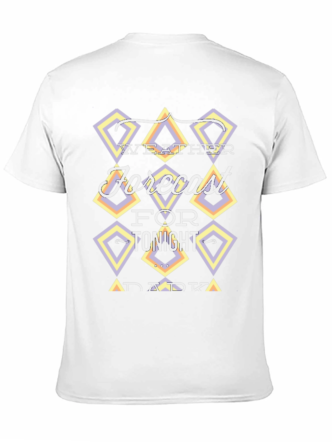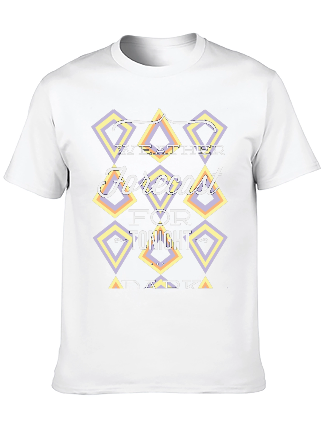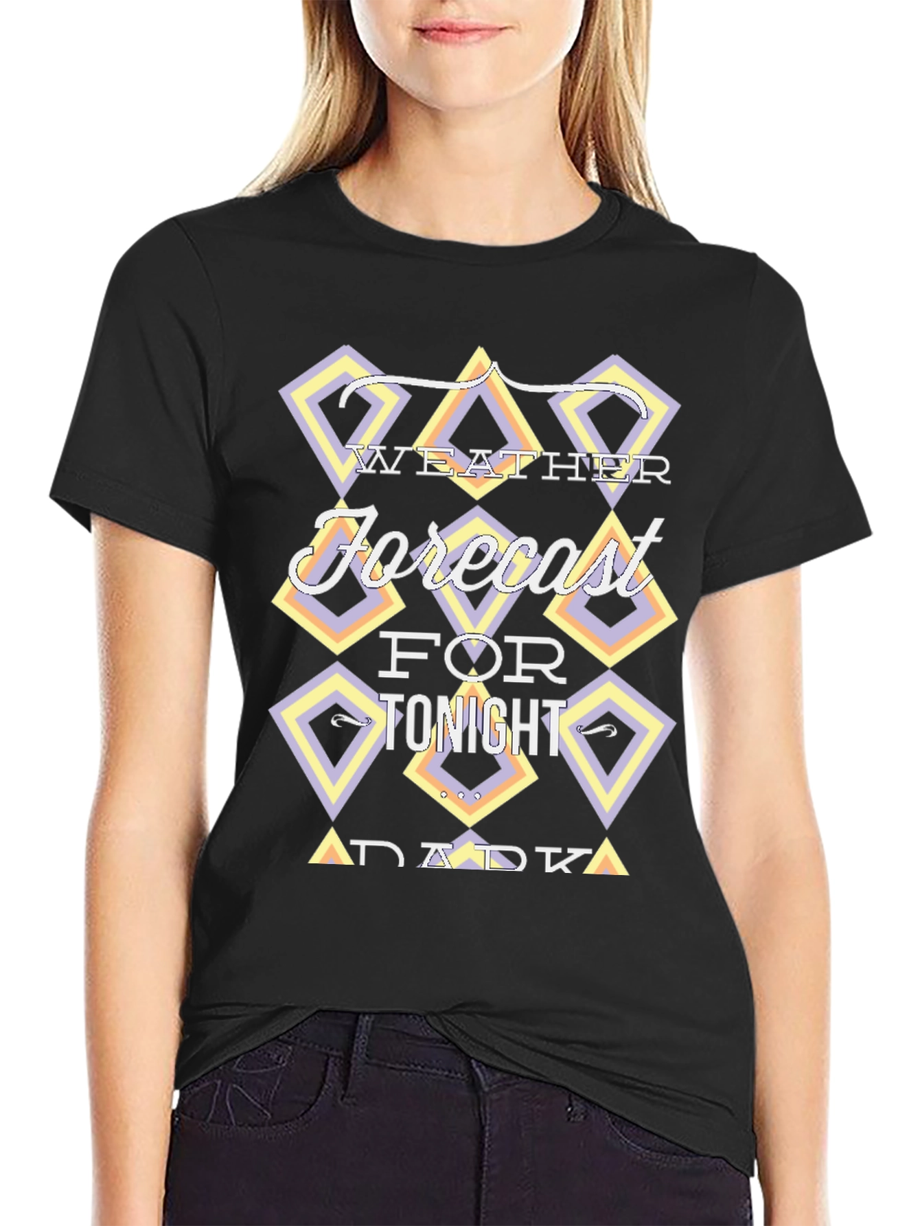 Luce esta camiseta negra de manga corta con un diseño moderno y original. En el pecho presenta un llamativo gráfico con la frase "Weather Forecast for Tonight Dark", enmarcada en rombos con tonalidades pastel como lila y amarillo, que le dan un toque retro y divertido. Ideal para un look casual y desenfadado, perfecta para combinar con tus jeans favoritos y expresar tu estilo único. Su tejido suave al tacto garantiza comodidad durante todo el día. ¡Destaca con esta prenda llena de personalidad!