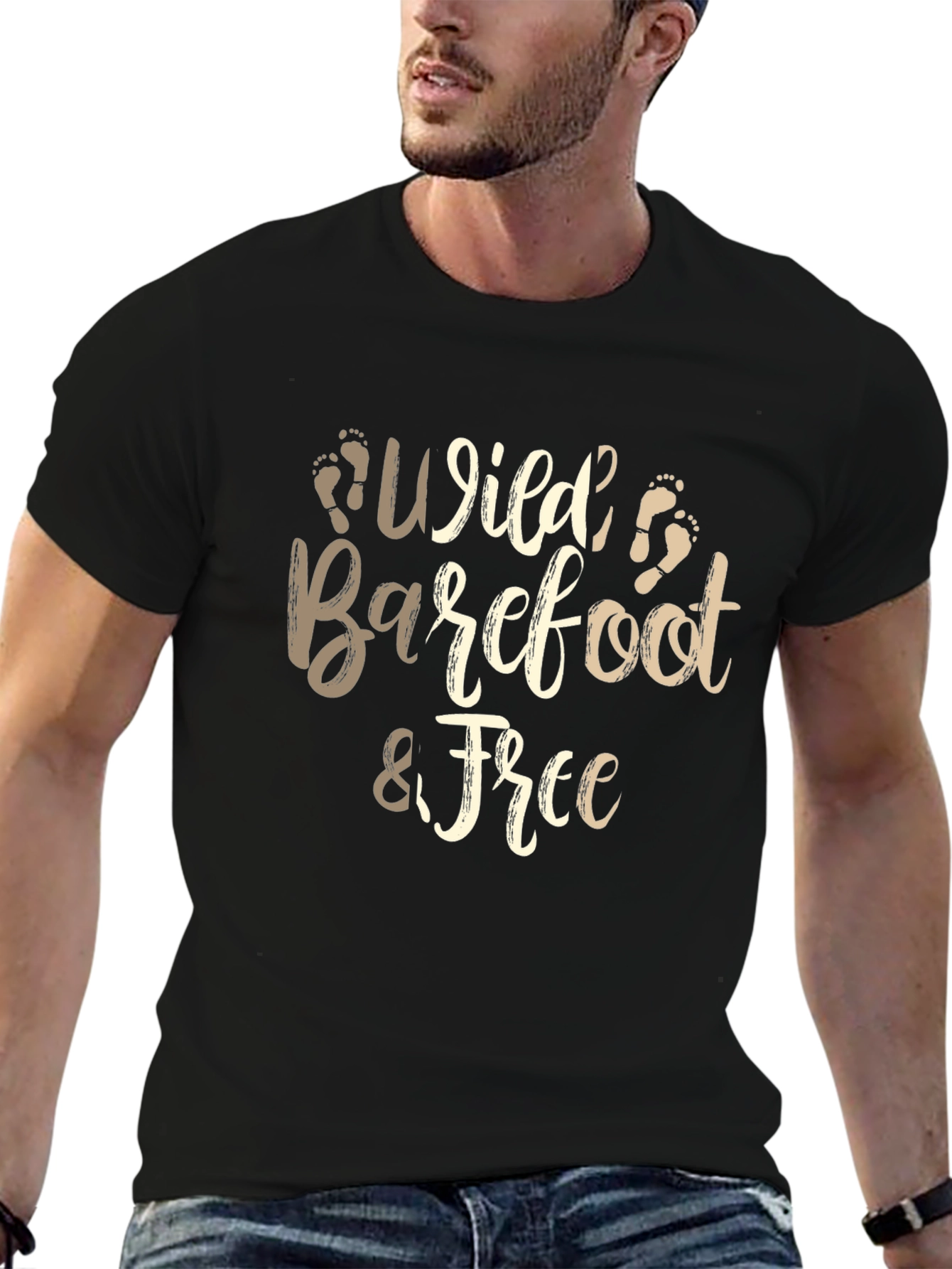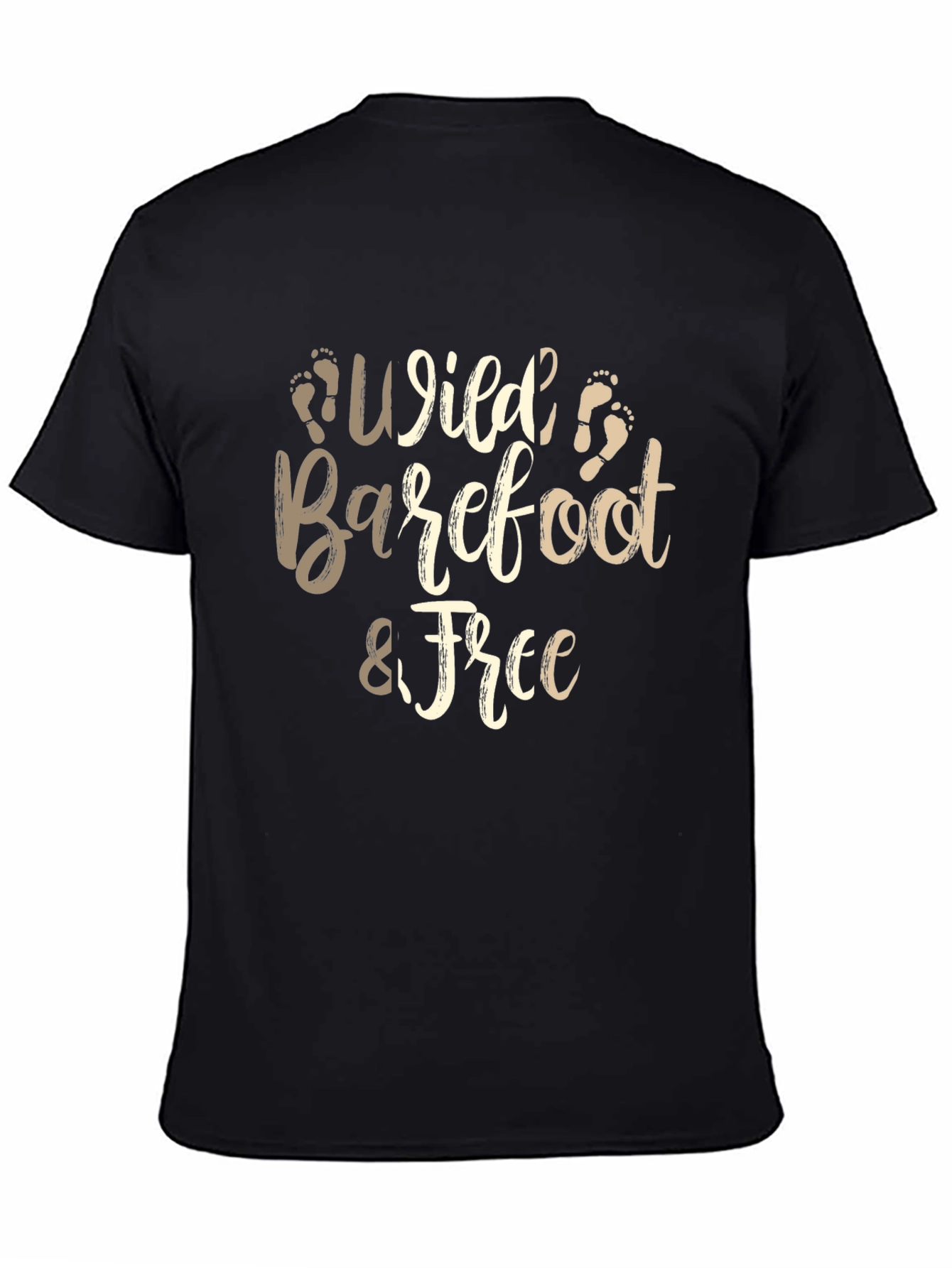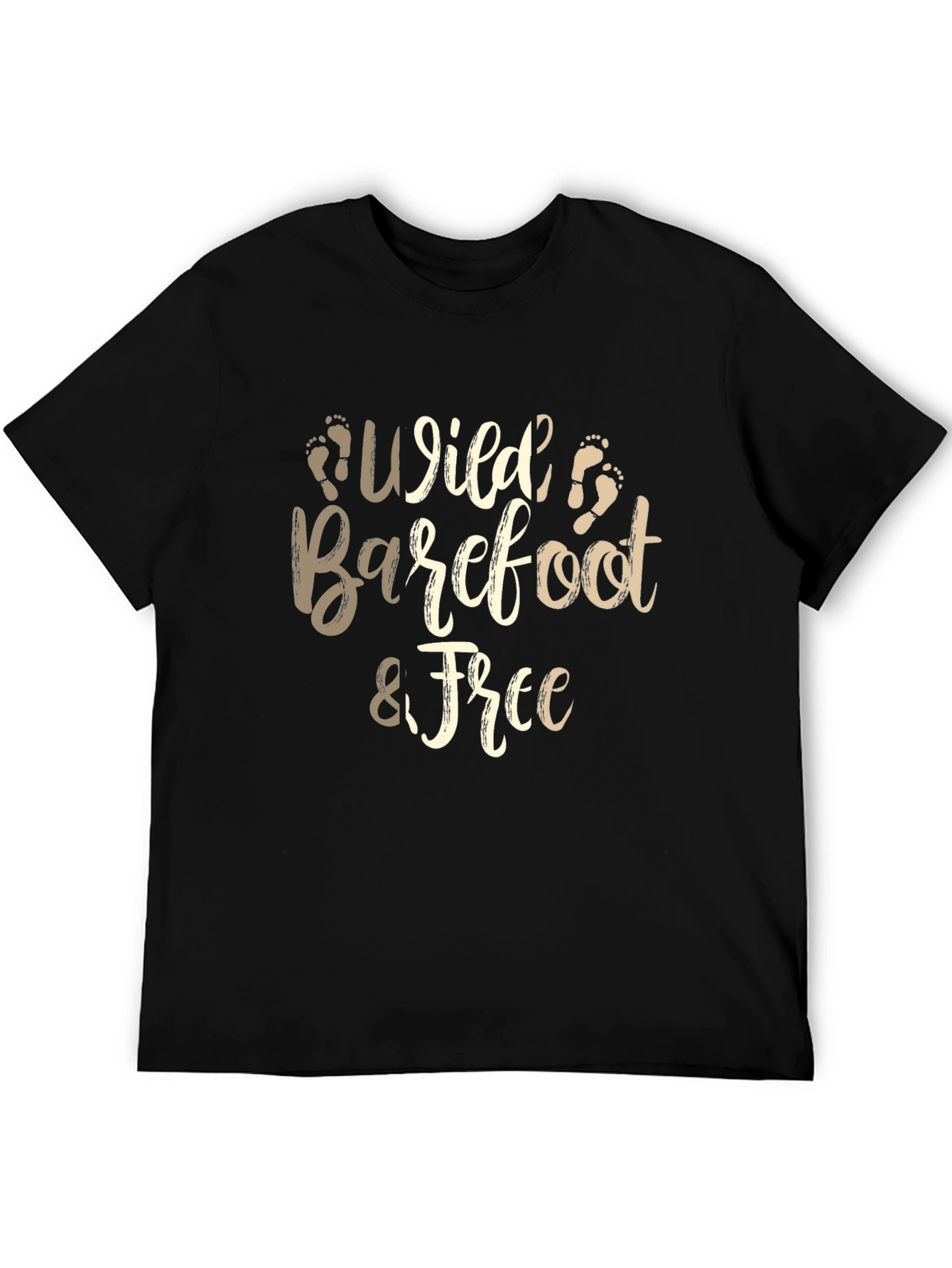 Luce esta camiseta negra de manga corta con un diseño único. En el centro del pecho, se aprecia un estampado con la frase 'Wild Barefoot & Free' en letras de estilo cursivo en tonos dorados y beige, adornado con huellas de pies. Ideal para un estilo casual y relajado, esta camiseta es perfecta para expresar tu espíritu libre y amante de la naturaleza. Su tejido suave y cómodo la hace ideal para el día a día o para actividades al aire libre. Combínala con jeans o shorts para un look desenfadado y lleno de personalidad.