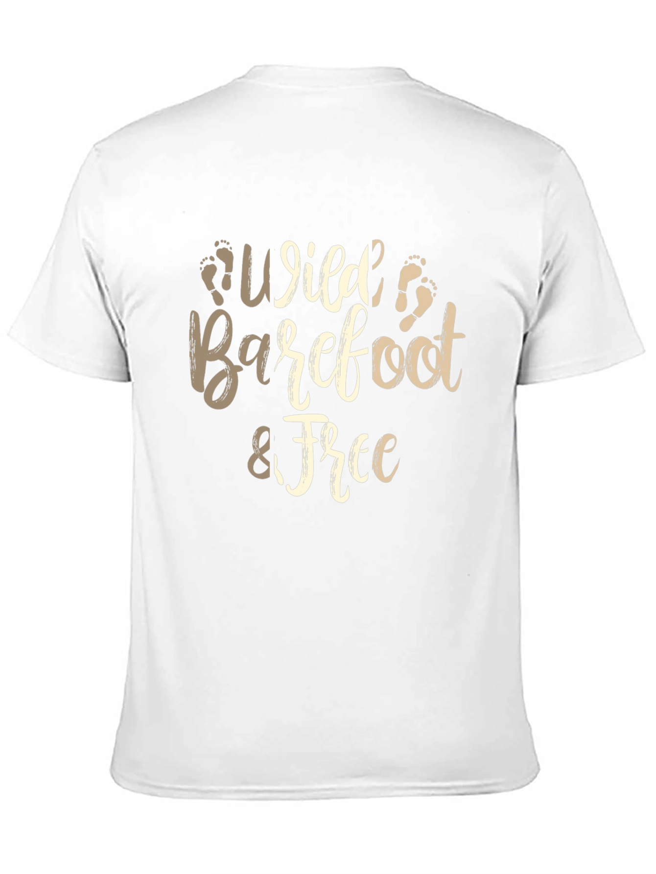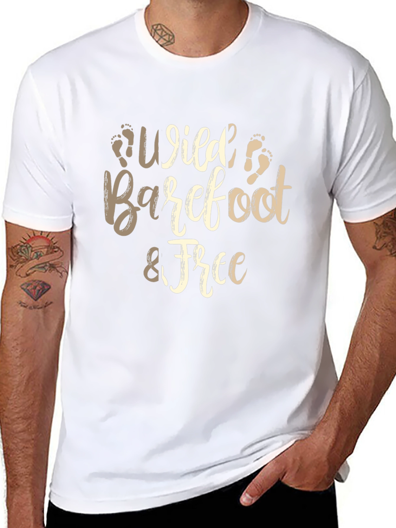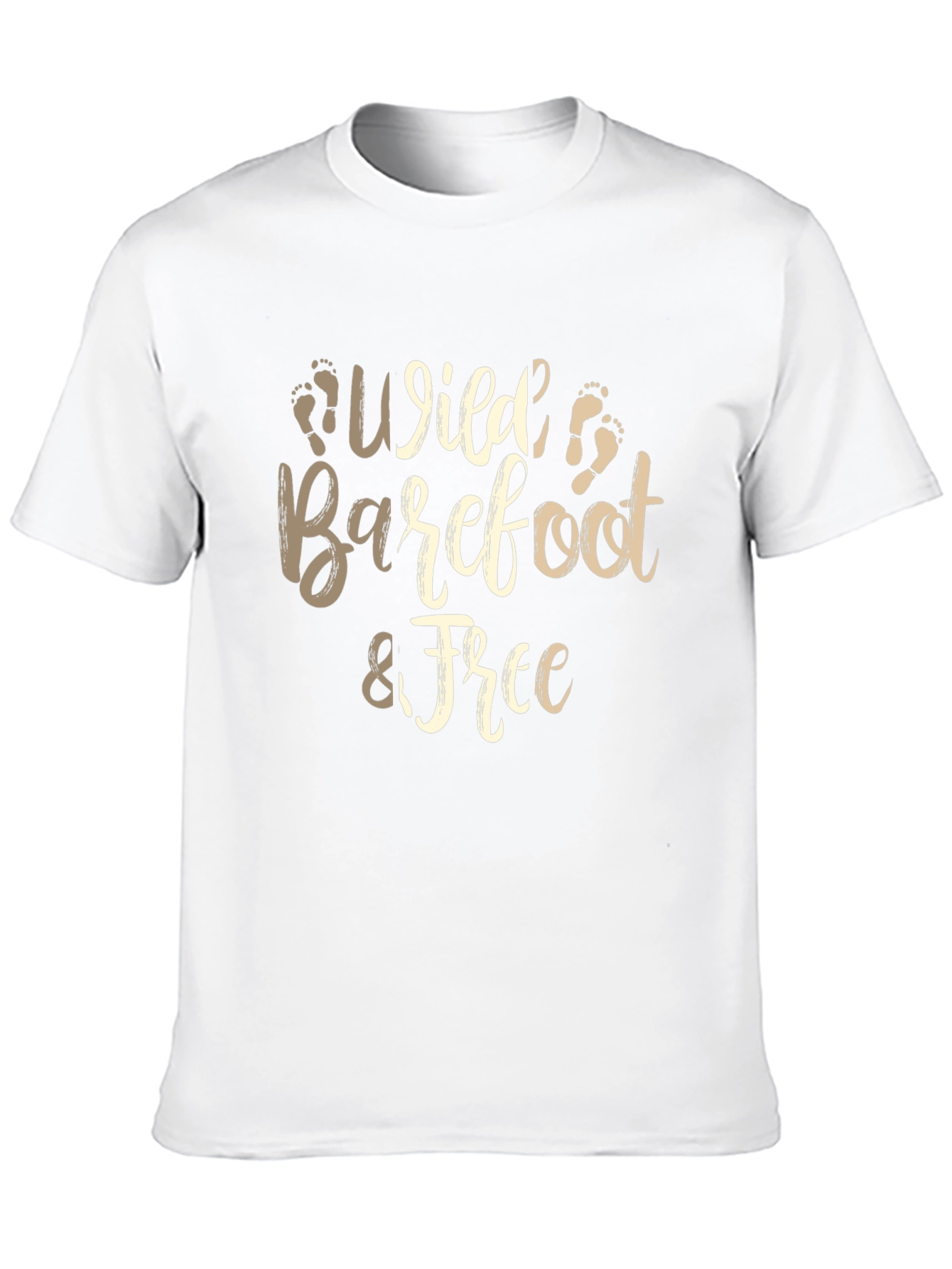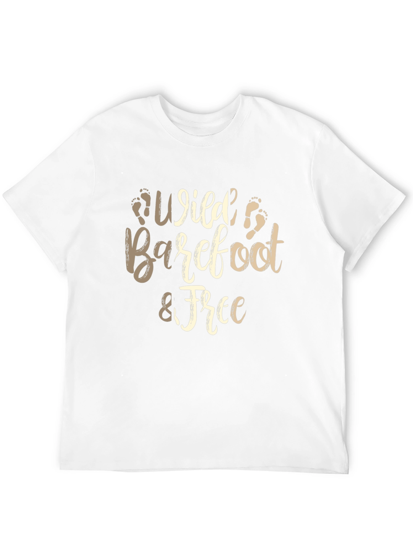 Luce esta camiseta negra de manga corta con un diseño único. En el centro del pecho, se aprecia un estampado con la frase 'Wild Barefoot & Free' en letras de estilo cursivo en tonos dorados y beige, adornado con huellas de pies. Ideal para un estilo casual y relajado, esta camiseta es perfecta para expresar tu espíritu libre y amante de la naturaleza. Su tejido suave y cómodo la hace ideal para el día a día o para actividades al aire libre. Combínala con jeans o shorts para un look desenfadado y lleno de personalidad.