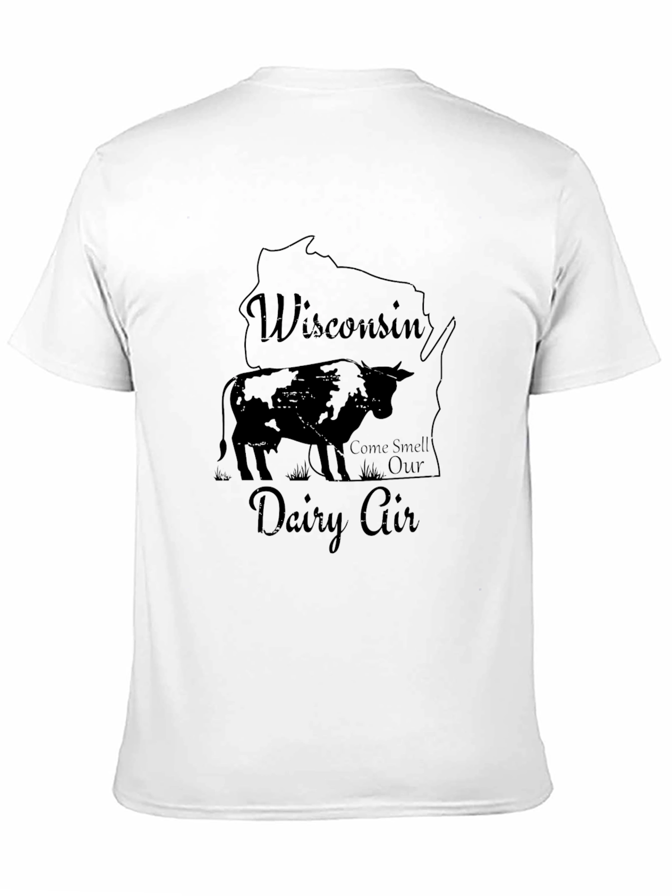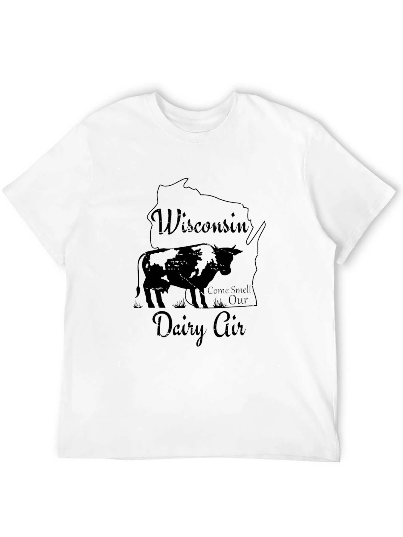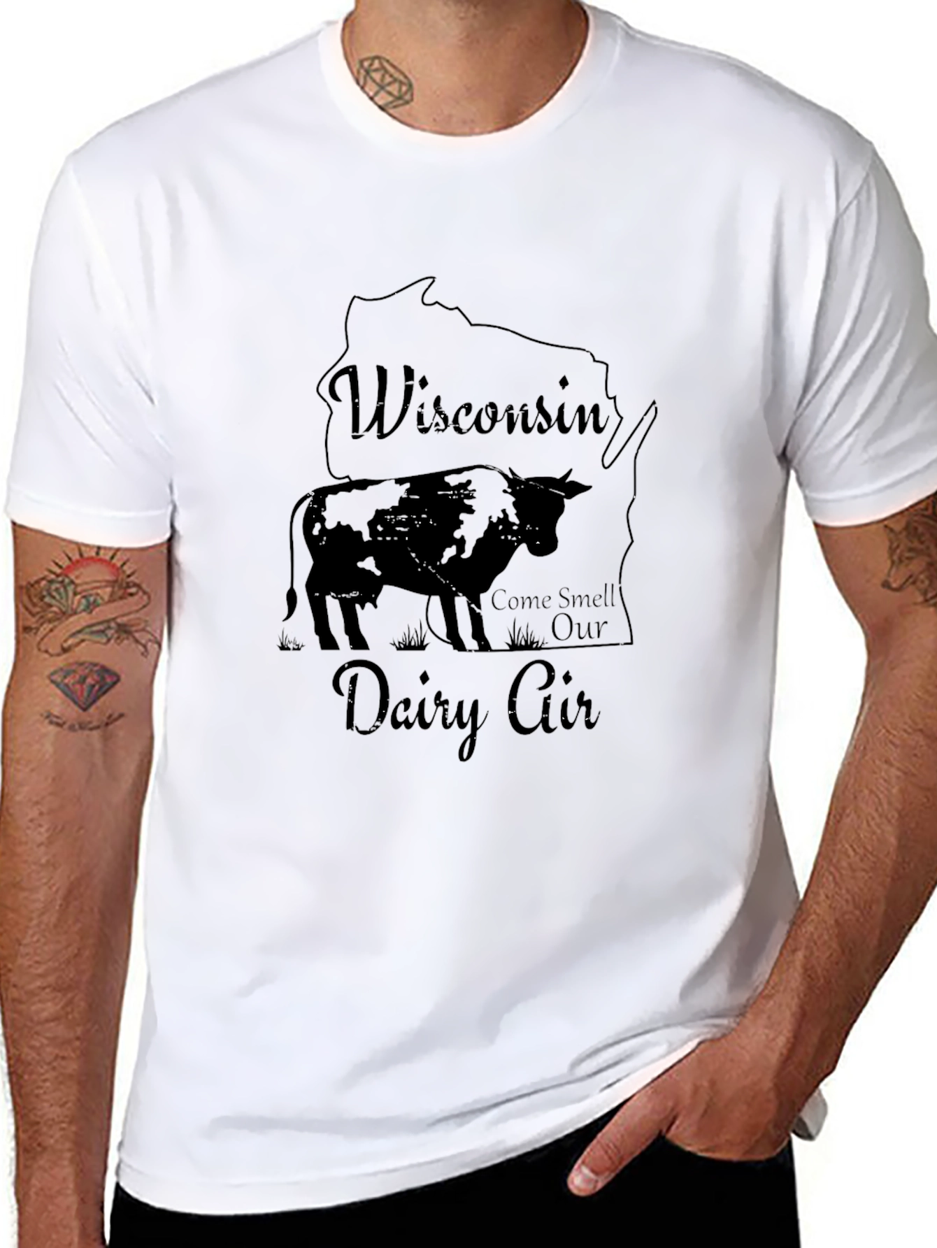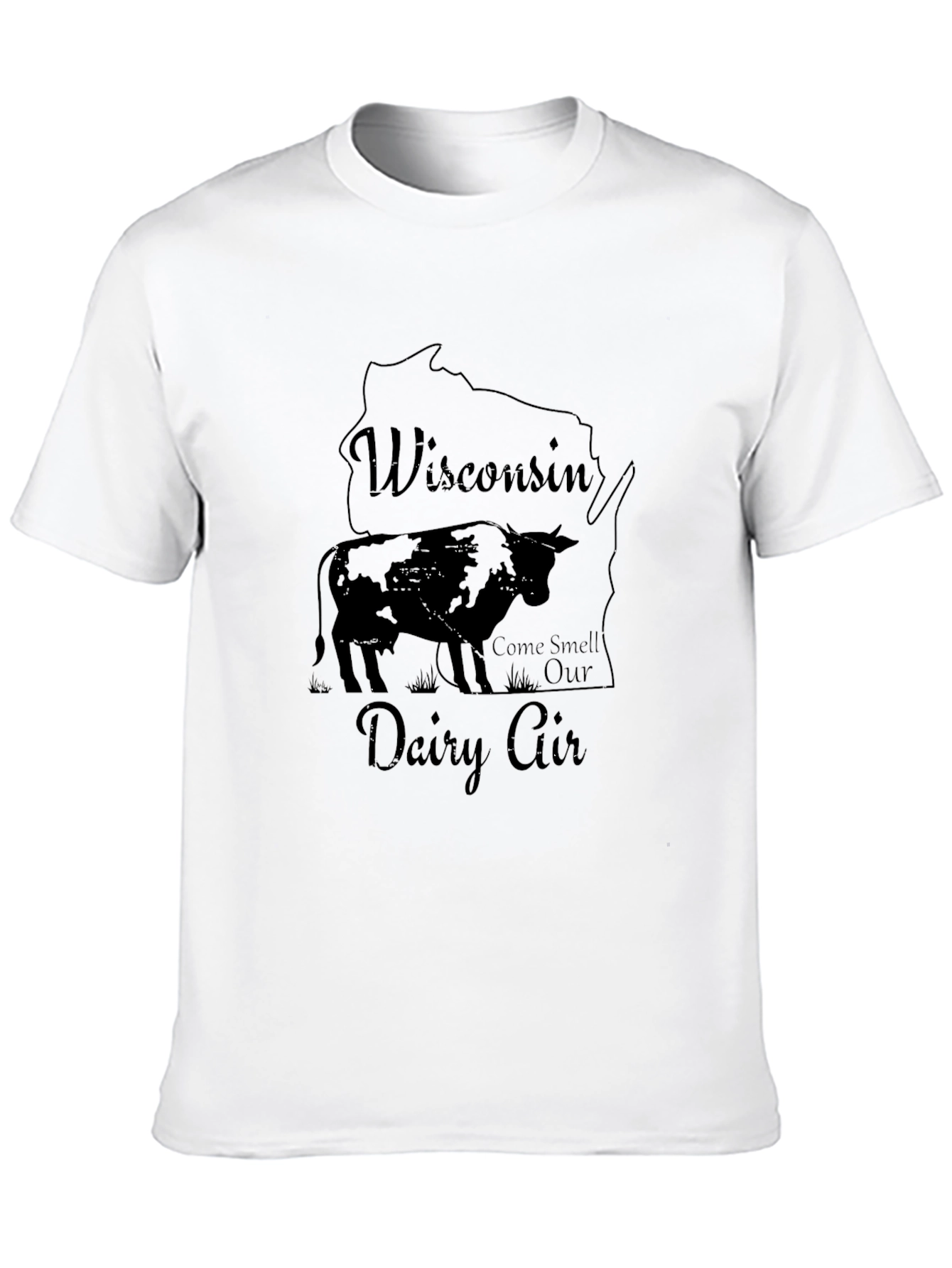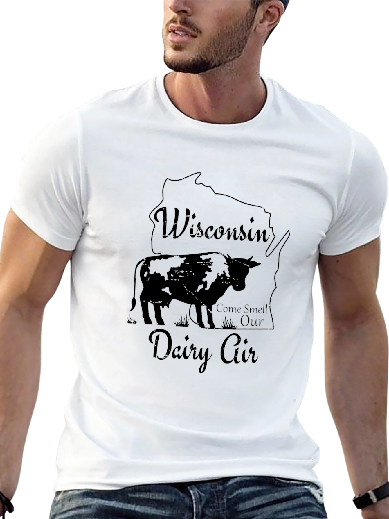 Luce esta camiseta negra con un diseño único que celebra el estado de Wisconsin y su famosa industria lechera. En el centro, se presenta el contorno del estado, acompañado de la silueta de una vaca lechera. La frase "Come Smell Our Dairy Air" añade un toque divertido y original. Esta camiseta es perfecta para mostrar tu amor por Wisconsin o como un regalo divertido para alguien que lo aprecie. Su diseño sencillo la hace ideal para usar en cualquier ocasión casual.