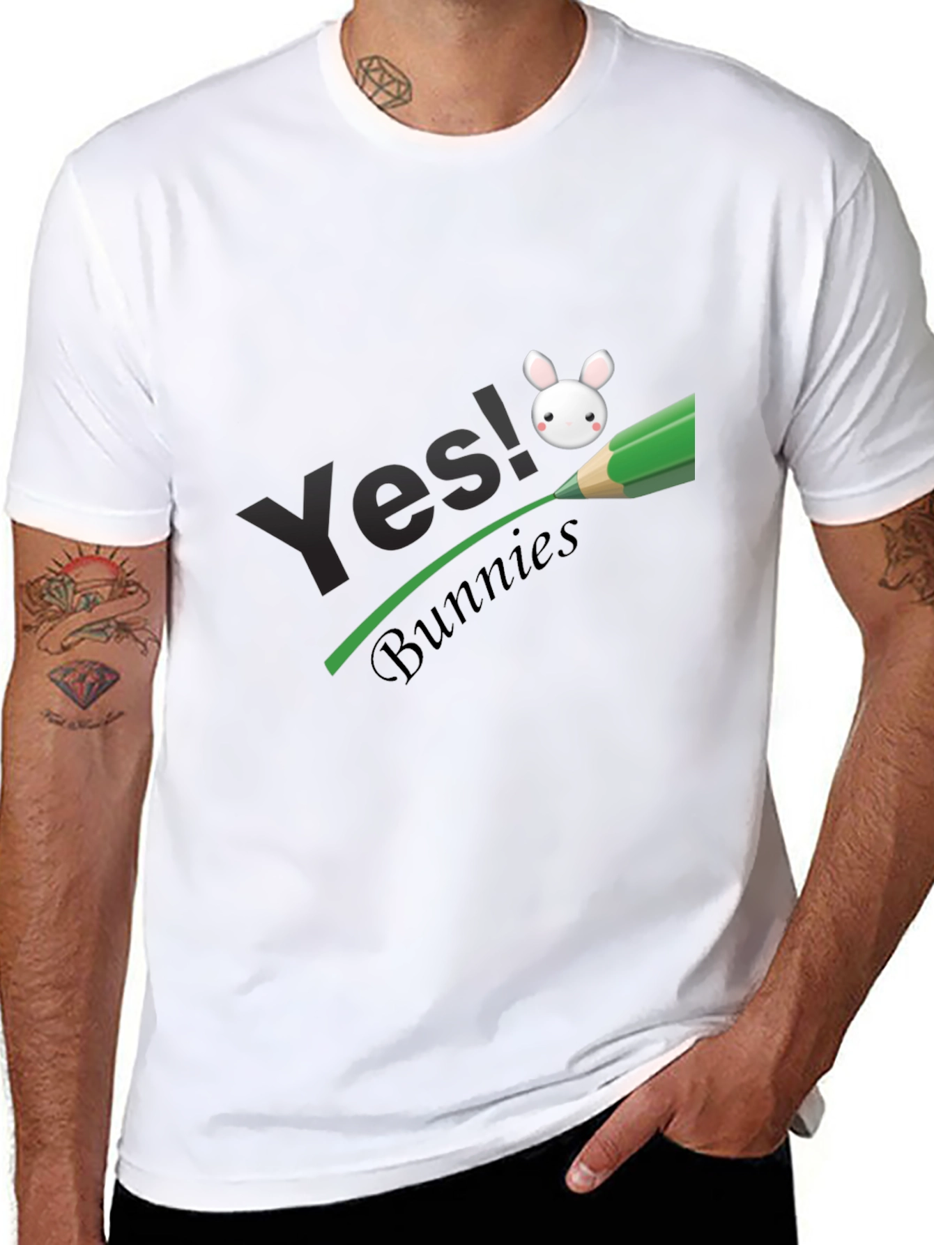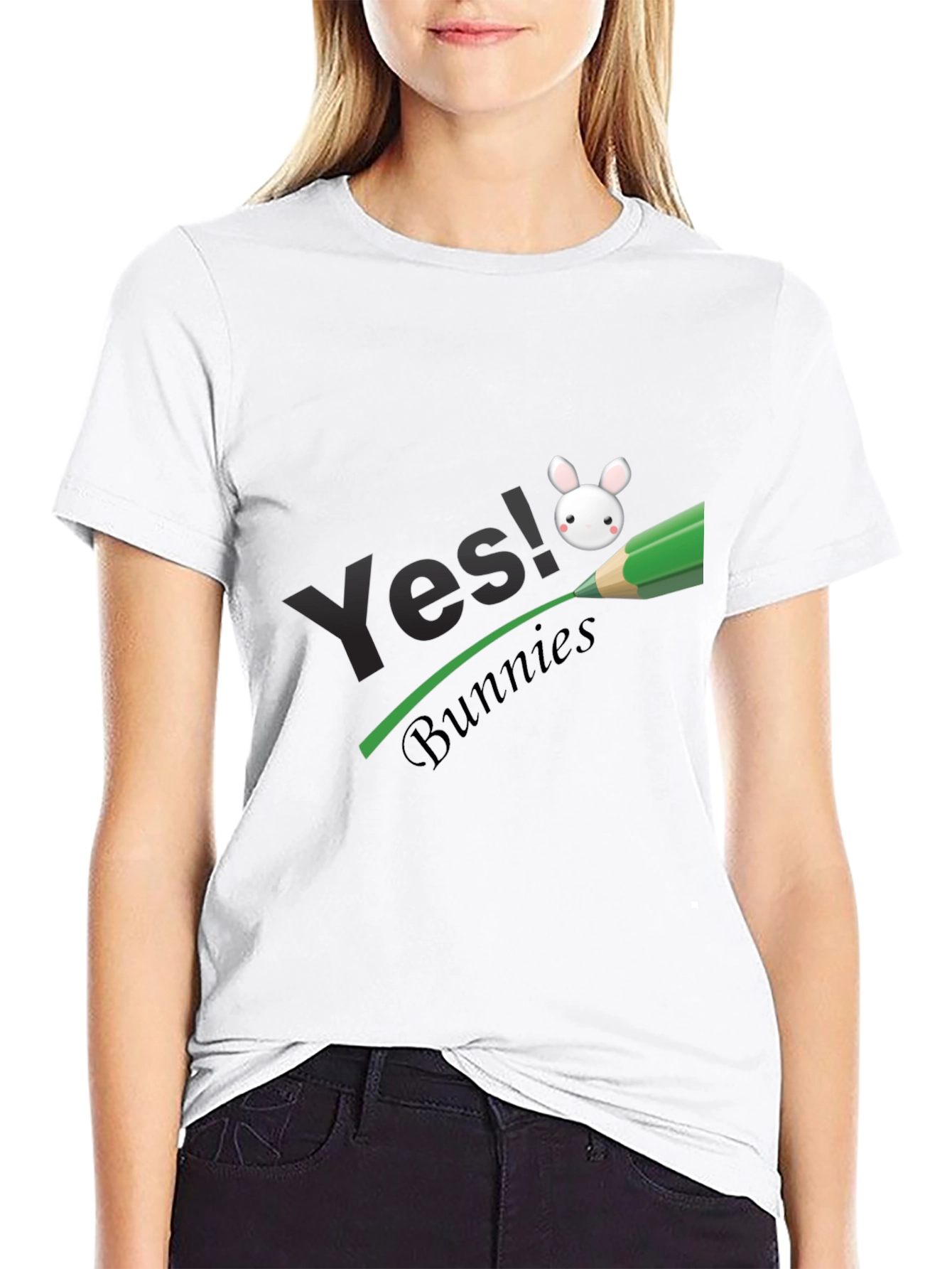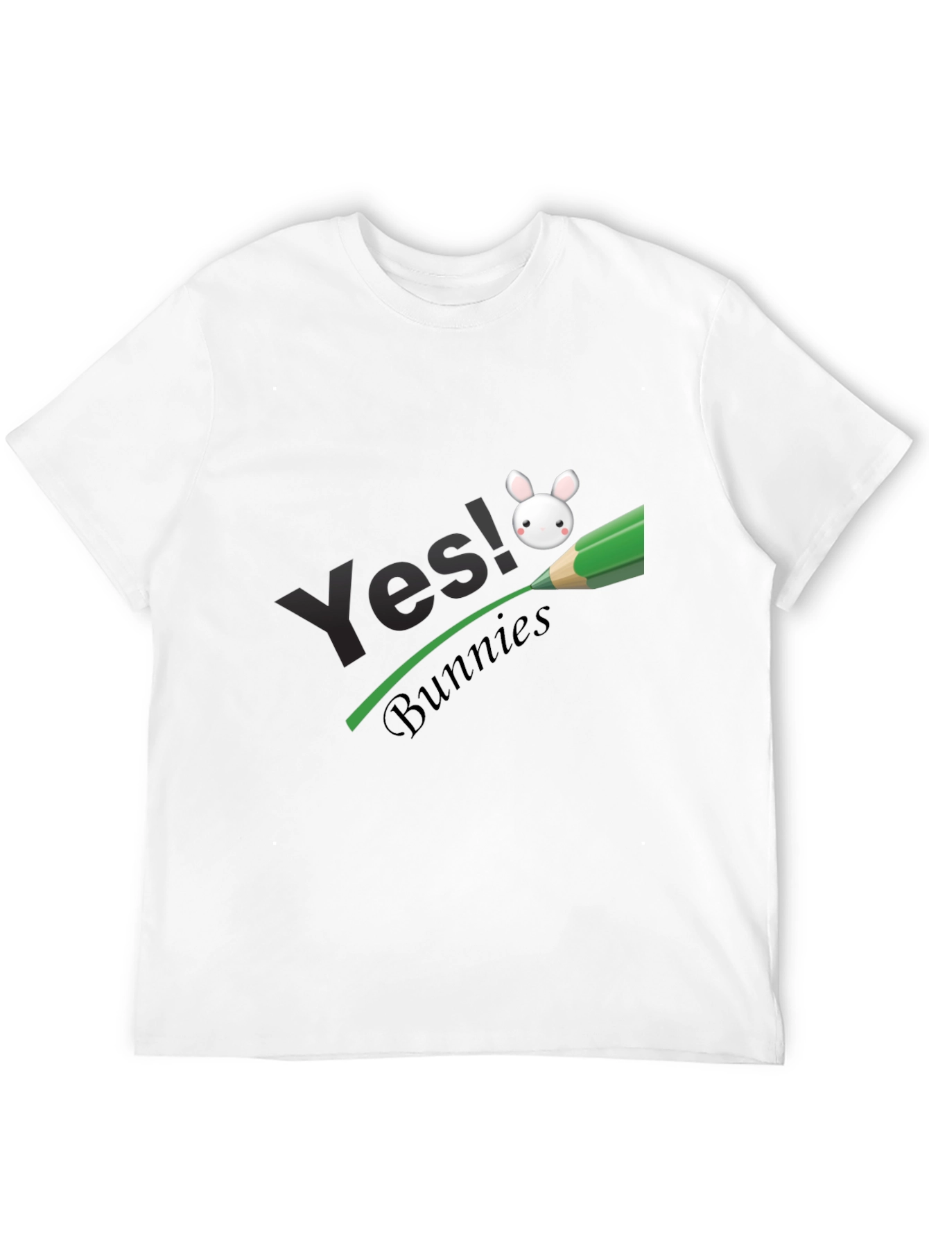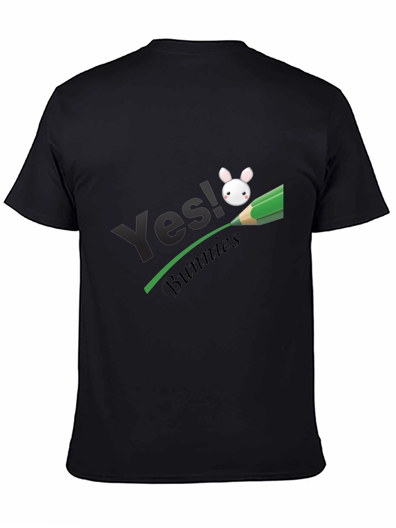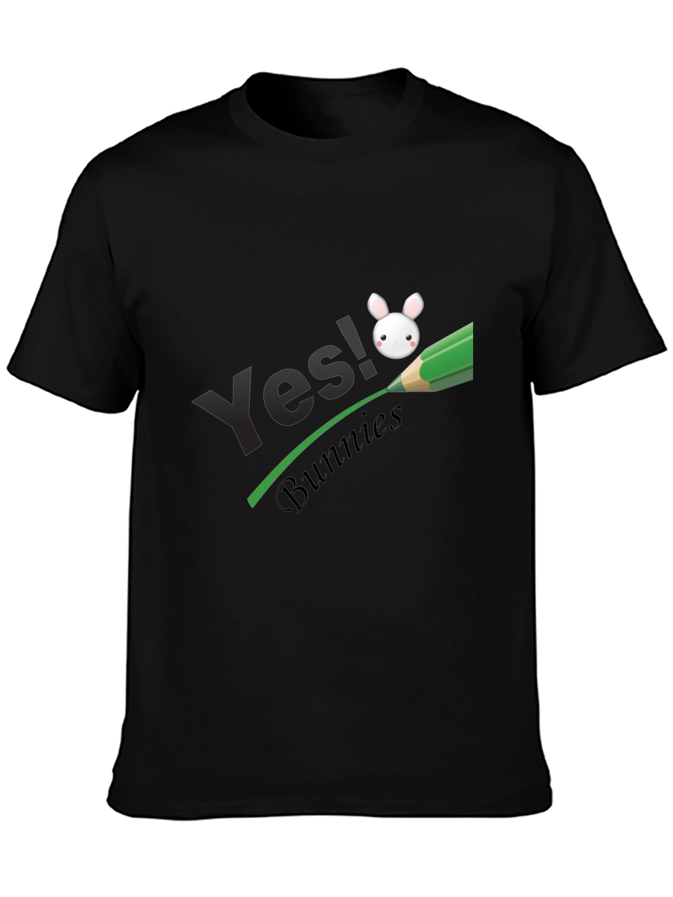 Esta elegante camiseta negra presenta un diseño llamativo y divertido. Destaca el texto "Yes!" en una tipografía moderna, complementado por la palabra "Bunnies" en una fuente cursiva más pequeña. Un simpático dibujo de un conejito blanco se encuentra sobre una línea verde que simula ser dibujada por un lápiz, lo que le da un toque creativo y original. Fabricada con un tejido suave y cómodo, esta camiseta es perfecta para el uso diario o para expresar tu amor por los conejos de una manera única. Su color negro la hace versátil y fácil de combinar con cualquier estilo. ¡Añade un toque de alegría y personalidad a tu guardarropa con esta prenda excepcional!