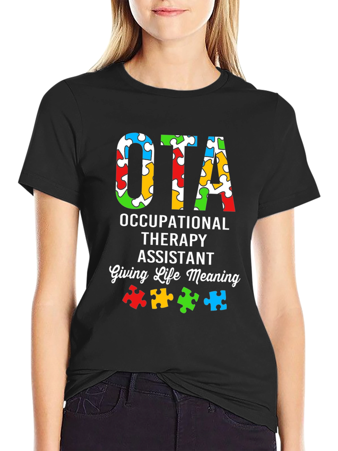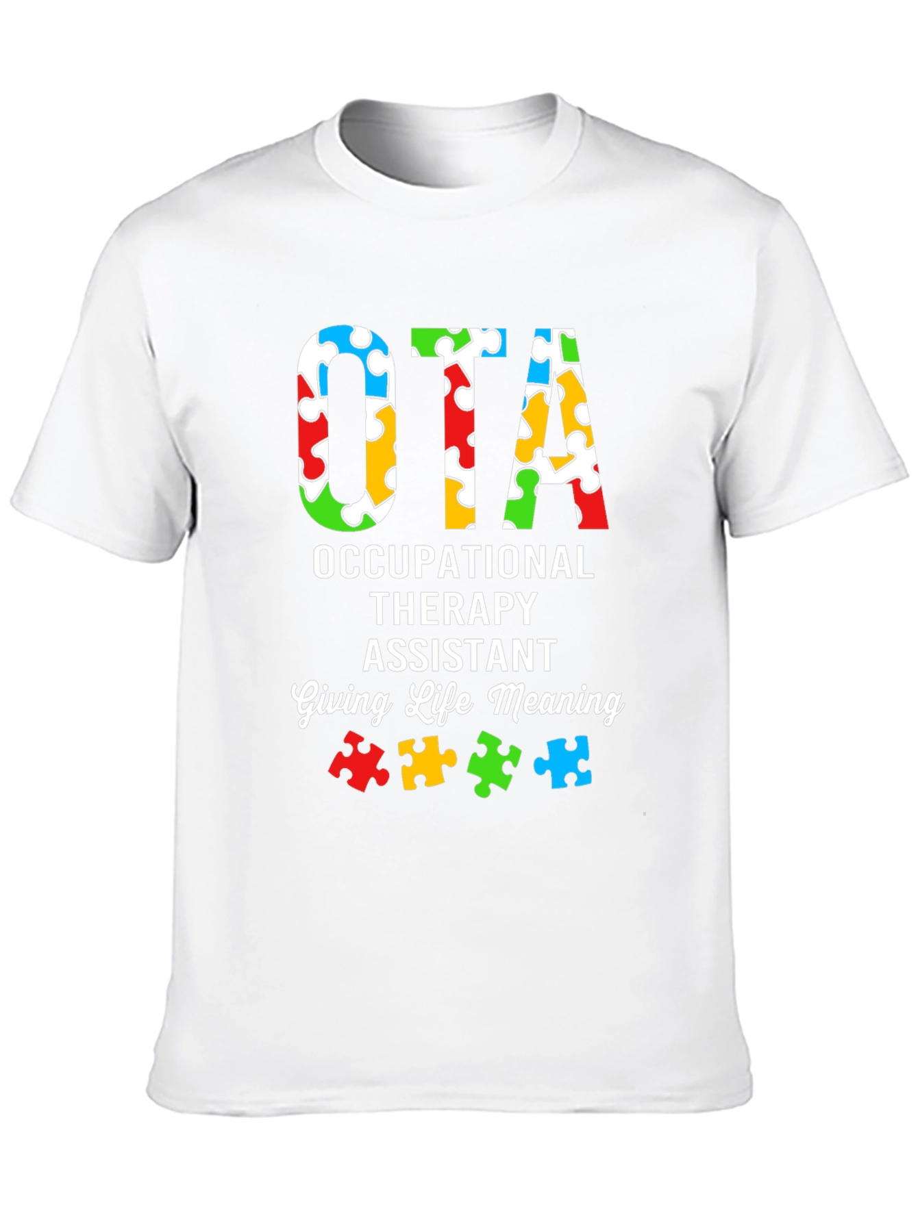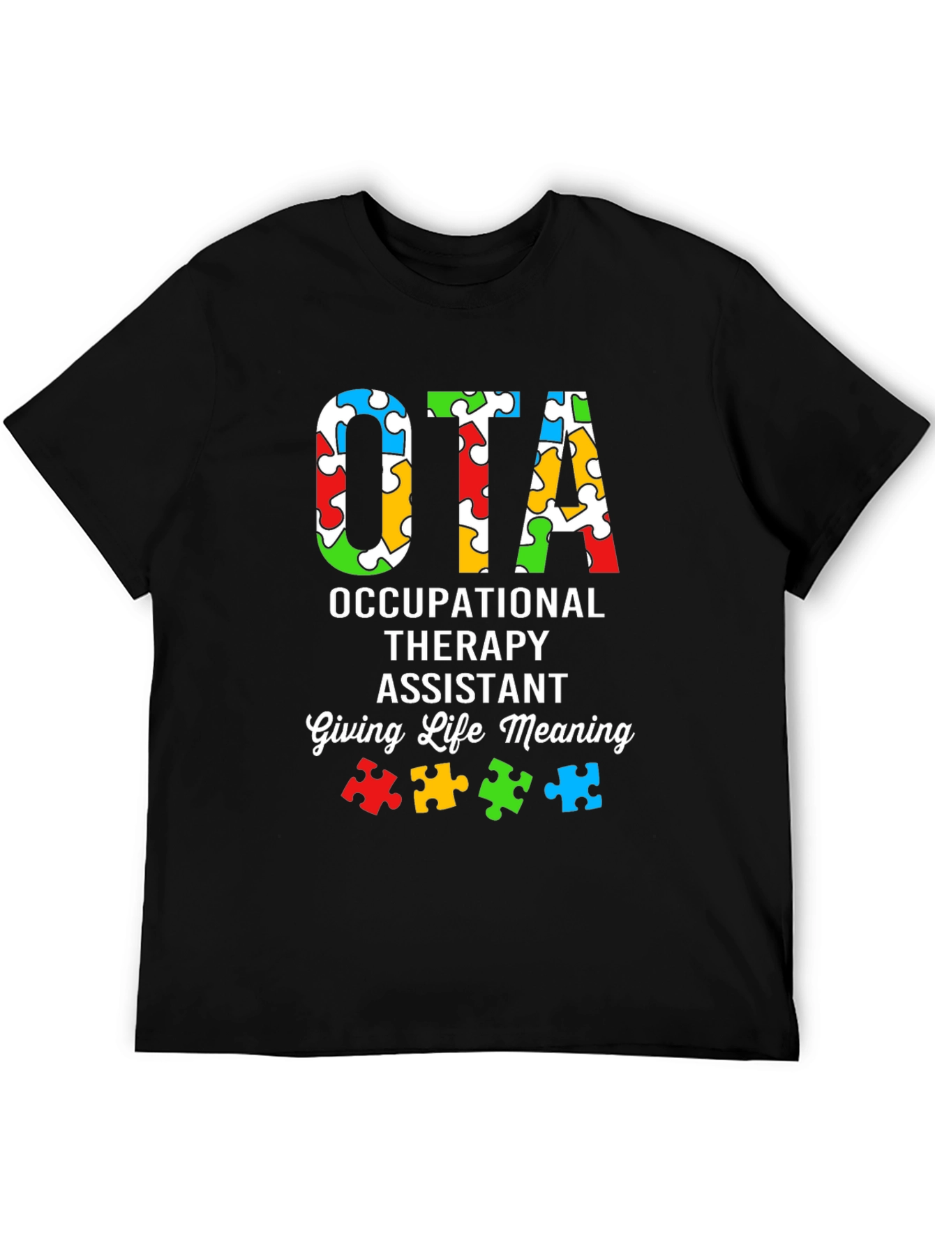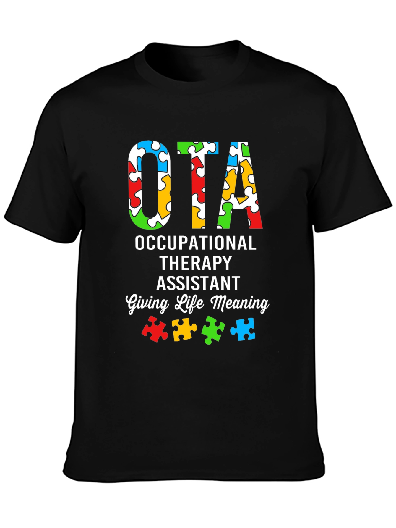 Muestra tu apoyo y conciencia con esta camiseta única de OTA (Asistente de Terapia Ocupacional). Con un diseño llamativo, la camiseta presenta las letras "OTA" rellenas con un patrón colorido de piezas de rompecabezas, simbolizando la conciencia del autismo. Debajo, se lee "OCCUPATIONAL THERAPY ASSISTANT" y "Giving Life Meaning", resaltando la importancia del trabajo del terapeuta ocupacional. Fabricada con un material suave y cómodo, esta camiseta de color negro es ideal para usar en el trabajo, eventos de concienciación o simplemente para mostrar tu pasión por la terapia ocupacional. Un regalo perfecto para cualquier OTA que marque la diferencia.