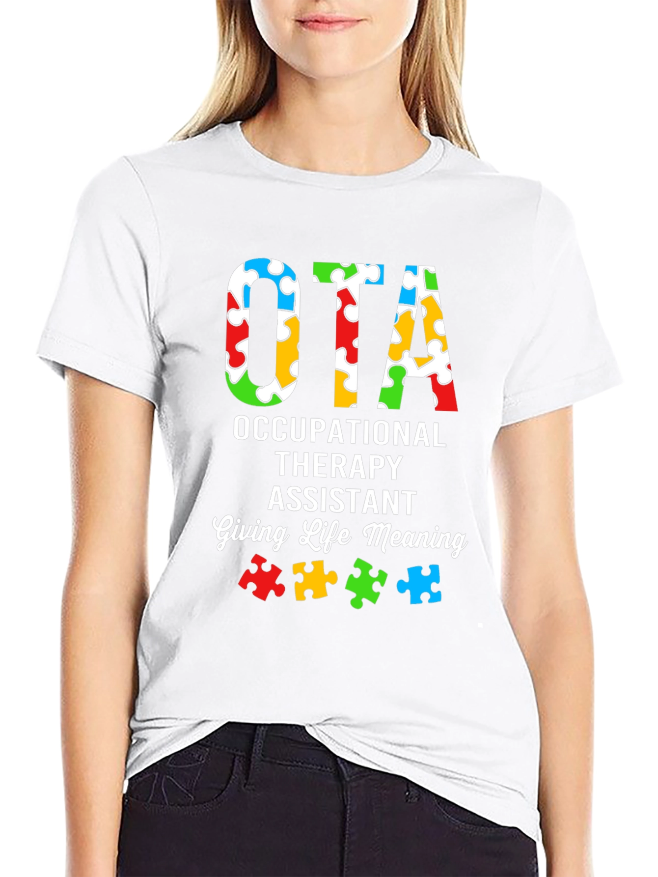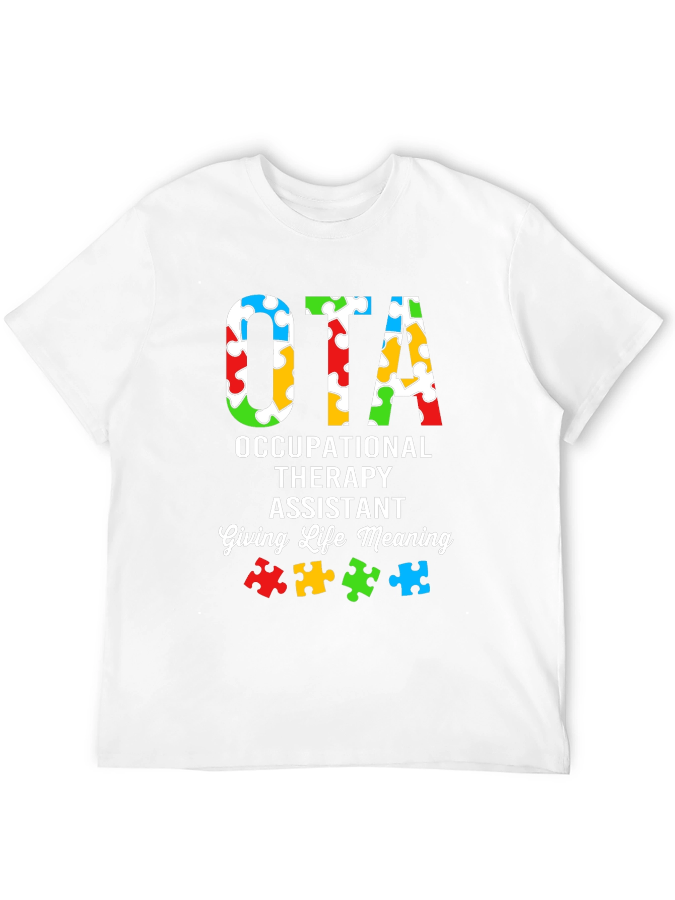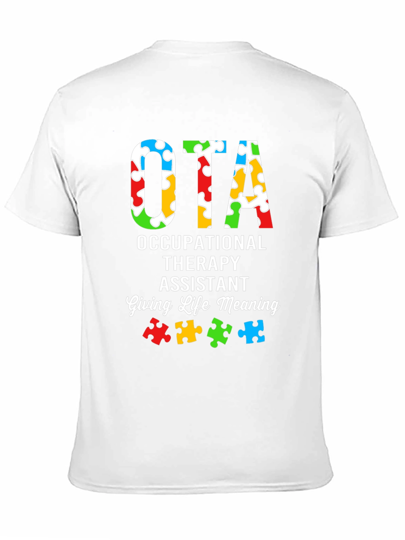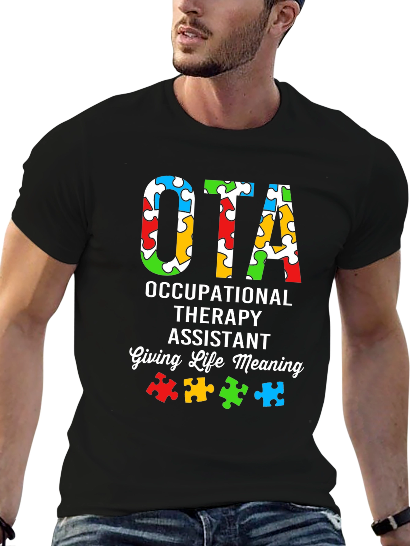 Muestra tu apoyo y conciencia con esta camiseta única de OTA (Asistente de Terapia Ocupacional). Con un diseño llamativo, la camiseta presenta las letras "OTA" rellenas con un patrón colorido de piezas de rompecabezas, simbolizando la conciencia del autismo. Debajo, se lee "OCCUPATIONAL THERAPY ASSISTANT" y "Giving Life Meaning", resaltando la importancia del trabajo del terapeuta ocupacional. Fabricada con un material suave y cómodo, esta camiseta de color negro es ideal para usar en el trabajo, eventos de concienciación o simplemente para mostrar tu pasión por la terapia ocupacional. Un regalo perfecto para cualquier OTA que marque la diferencia.