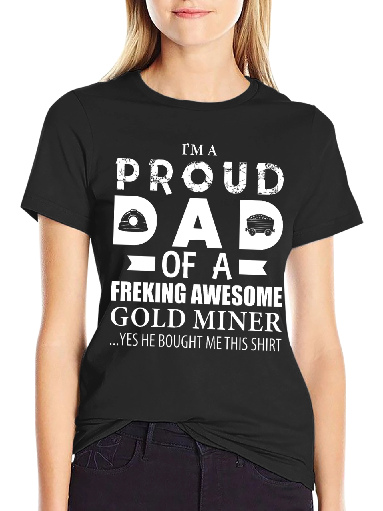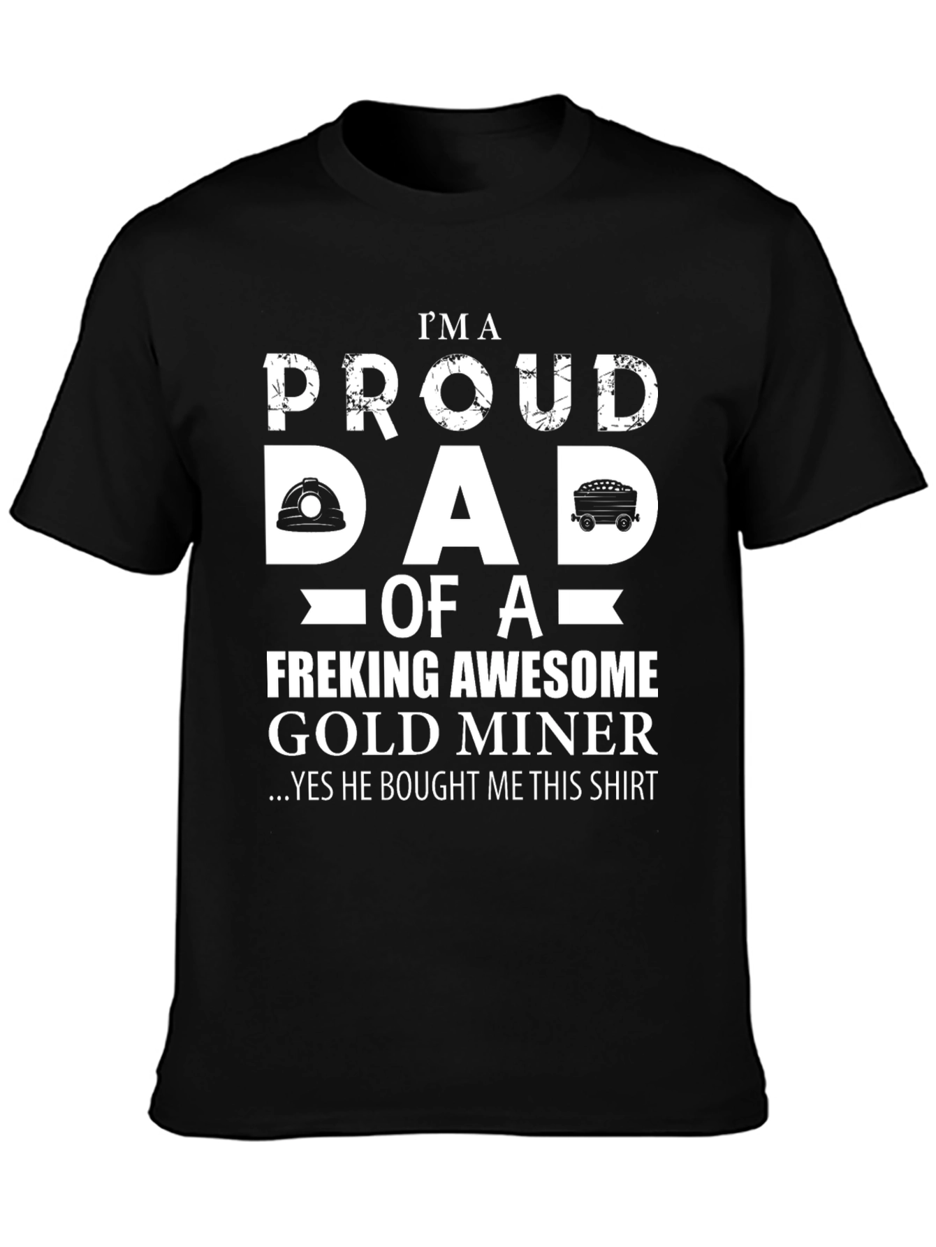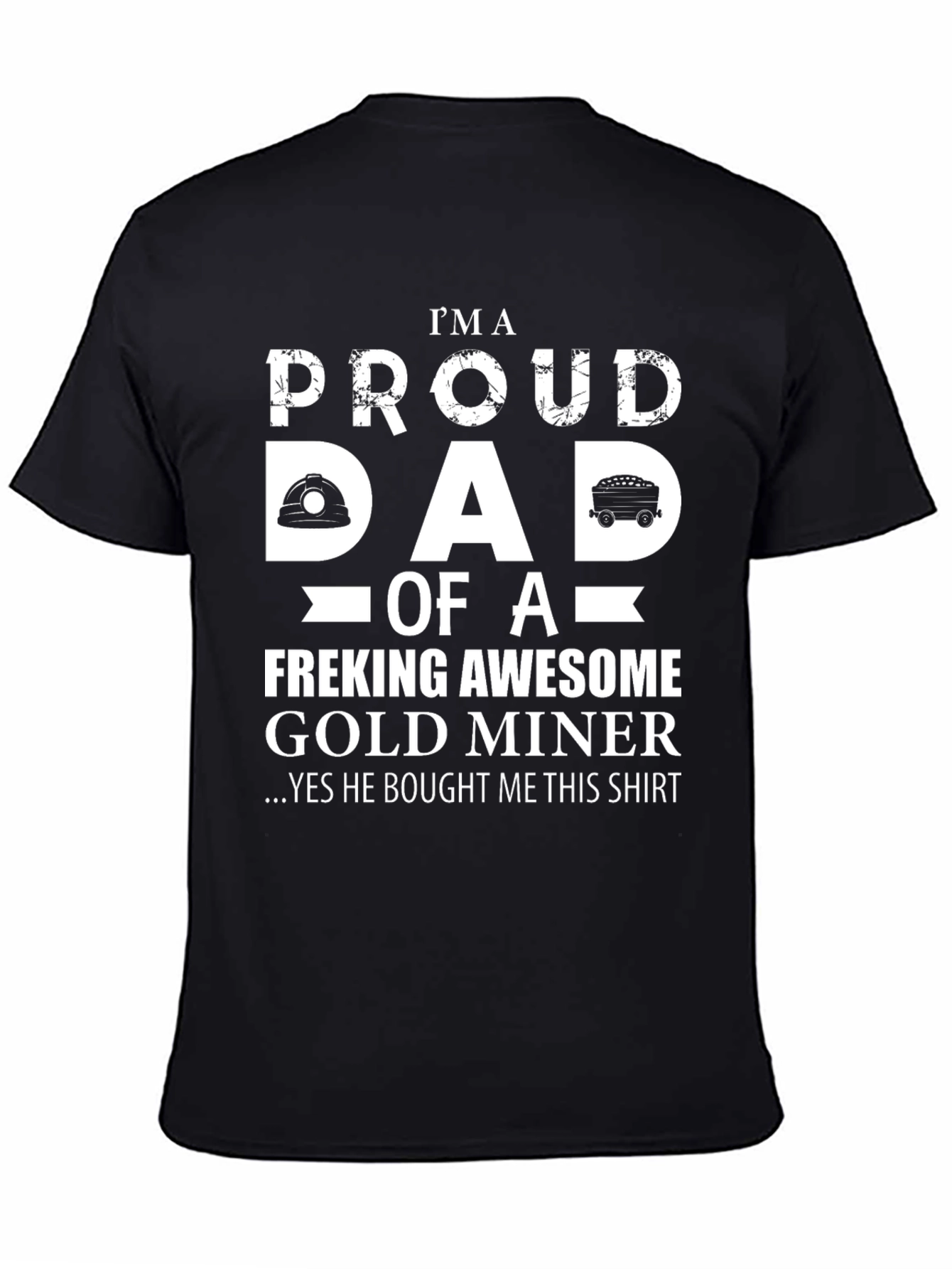 ¡Muestra tu orgullo con esta camiseta negra! Presenta un diseño llamativo con las palabras "I'M A PROUD DAD OF A FREKING AWESOME GOLD MINER", acompañado de gráficos de un casco de minero y un vagón de mina. Perfecta para padres orgullosos de mineros de oro. El mensaje adicional "...YES HE BOUGHT ME THIS SHIRT" añade un toque divertido. Ideal para usar en el día a día o para regalar a un padre especial. ¡Consigue la tuya hoy y presume de tu hijo minero!