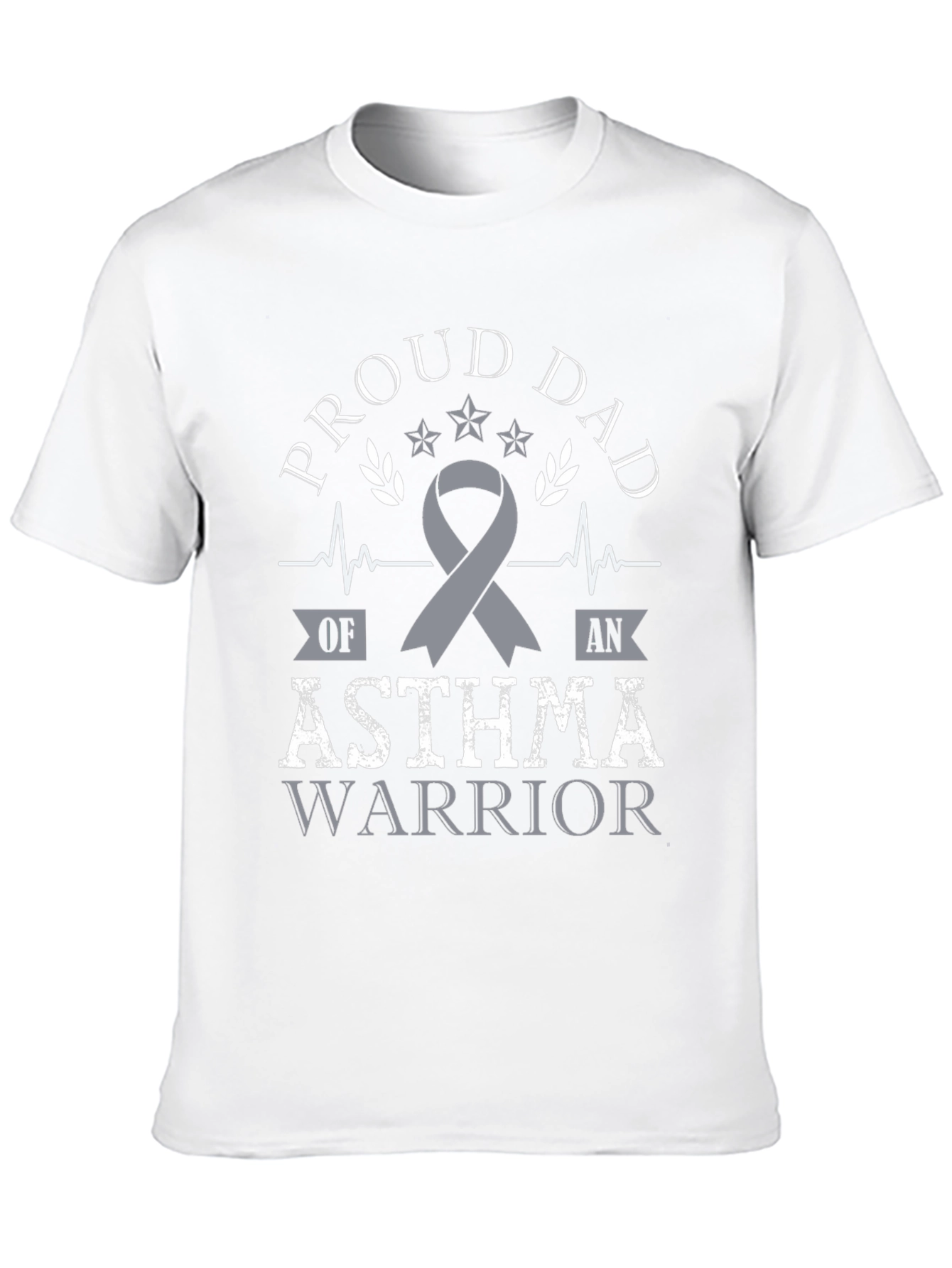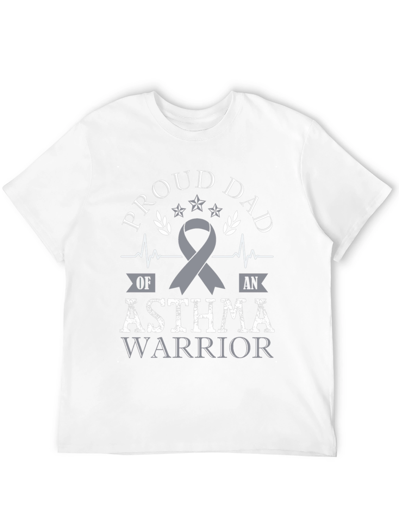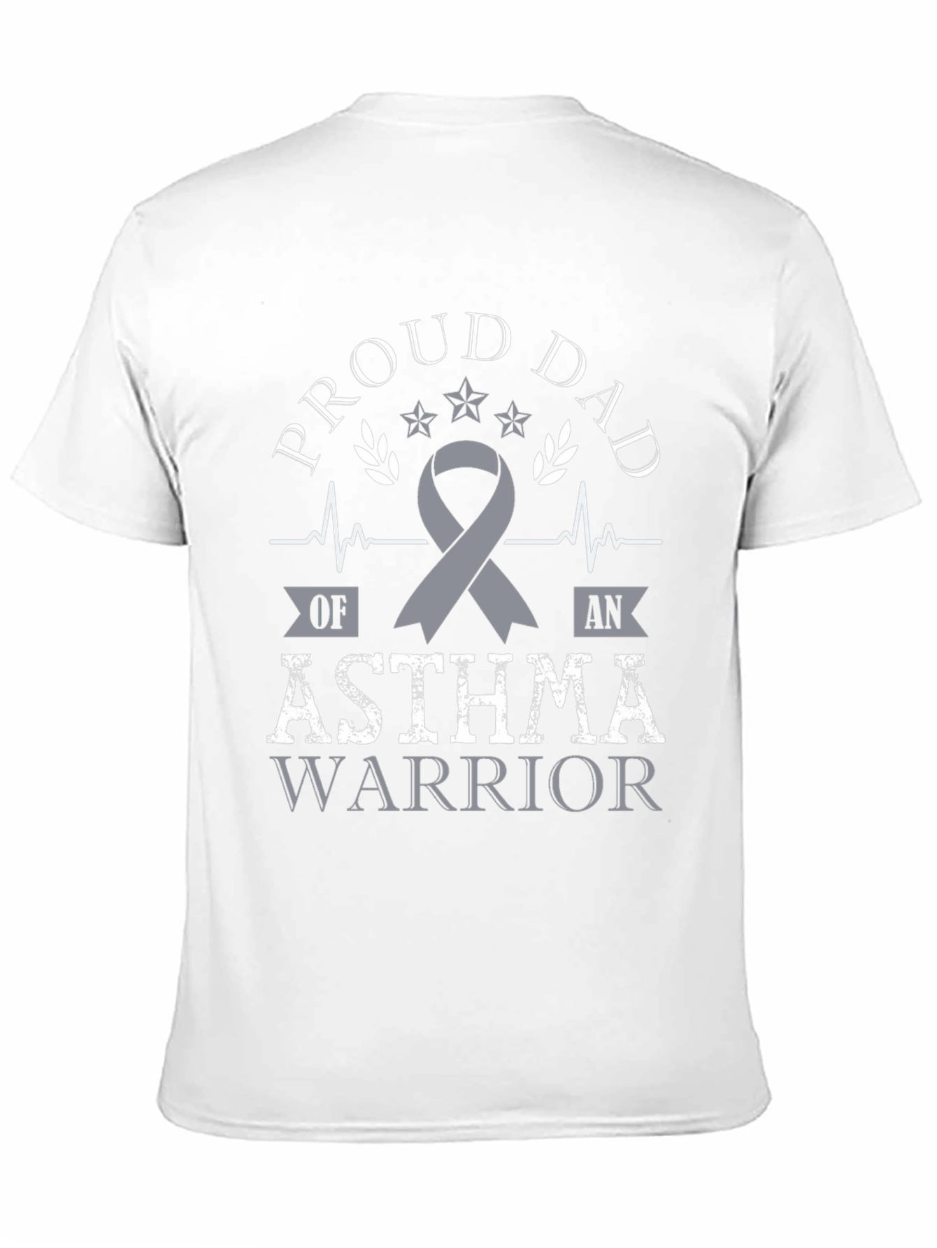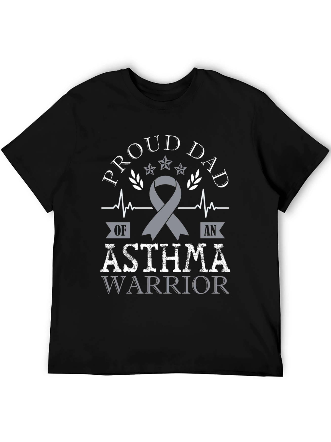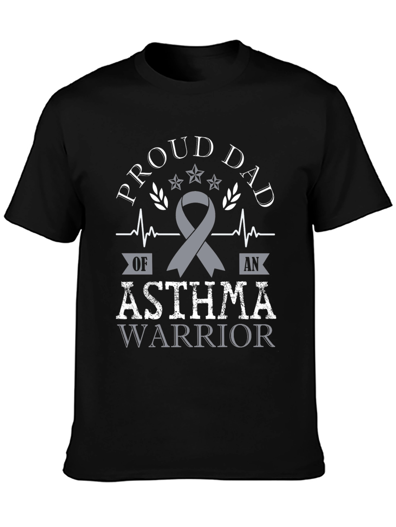 Luce con orgullo esta camiseta negra con un llamativo diseño. Presenta un texto estilizado que dice 'Proud Dad' (Papá Orgulloso), junto con la frase 'Asthma Warrior' (Guerrero del Asma) en un diseño llamativo. Un lazo gris simboliza la conciencia sobre el asma. El diseño incorpora elementos gráficos como estrellas, ramas de olivo y líneas de pulso, dándole un toque distintivo. Ideal para padres que apoyan a sus hijos guerreros del asma y desean mostrar su orgullo y solidaridad. Perfecta para uso diario, eventos de concientización o como un regalo significativo.