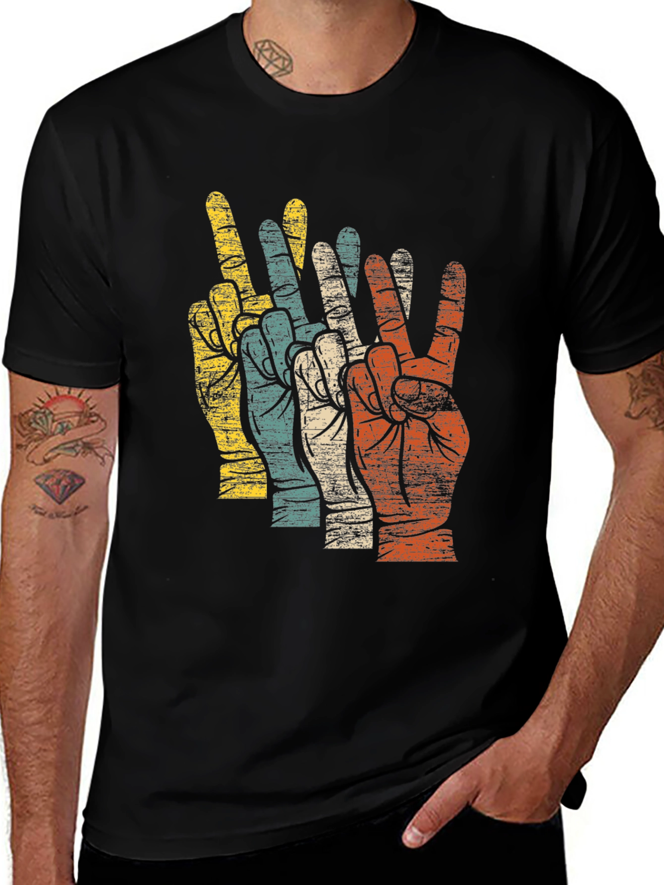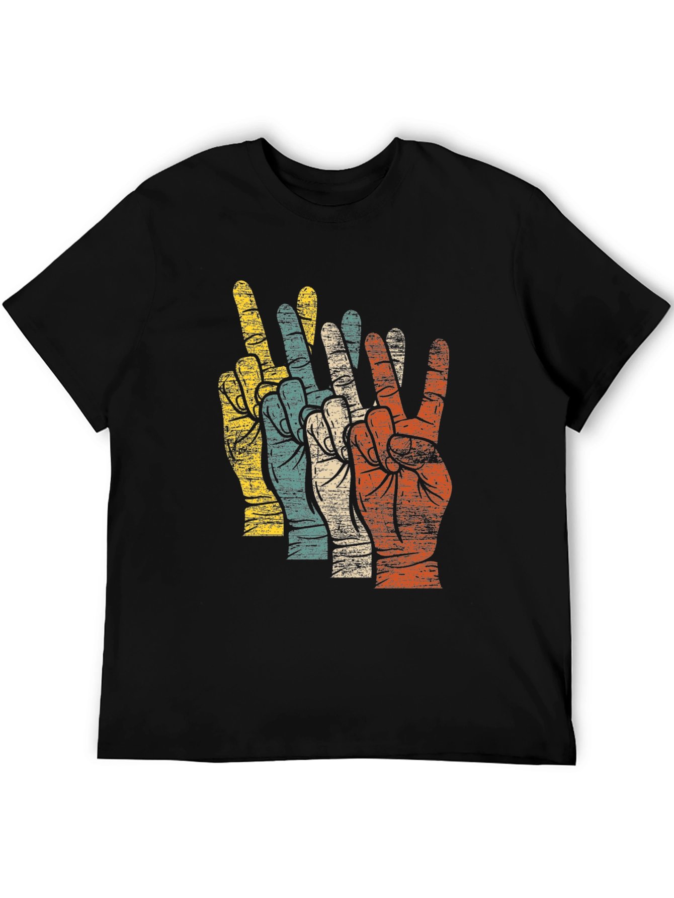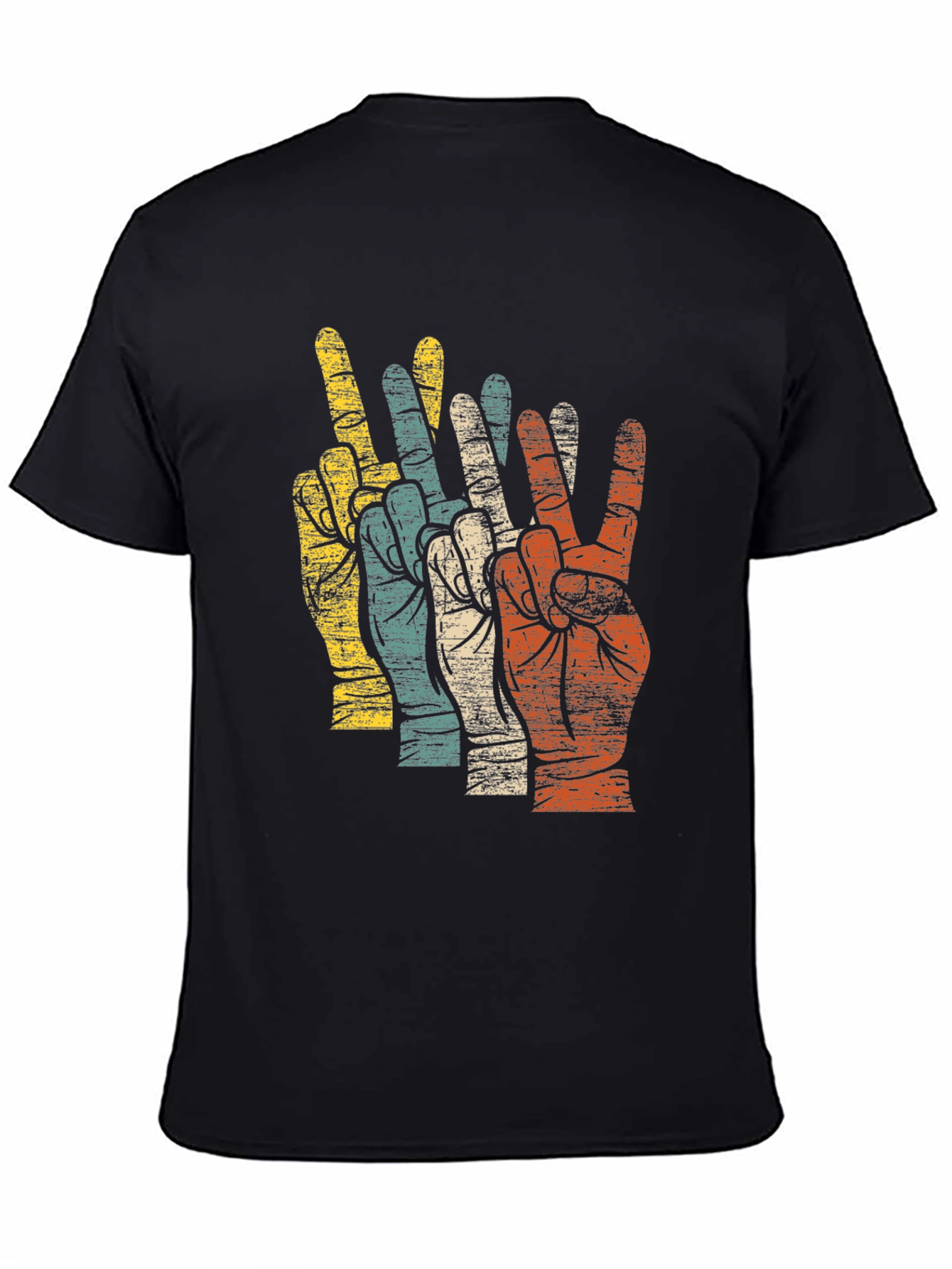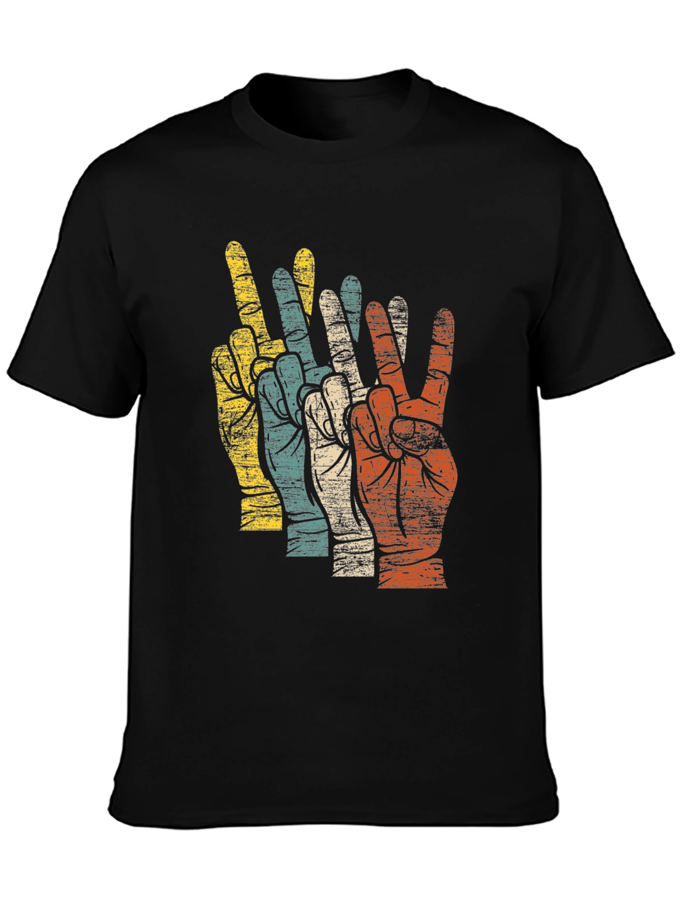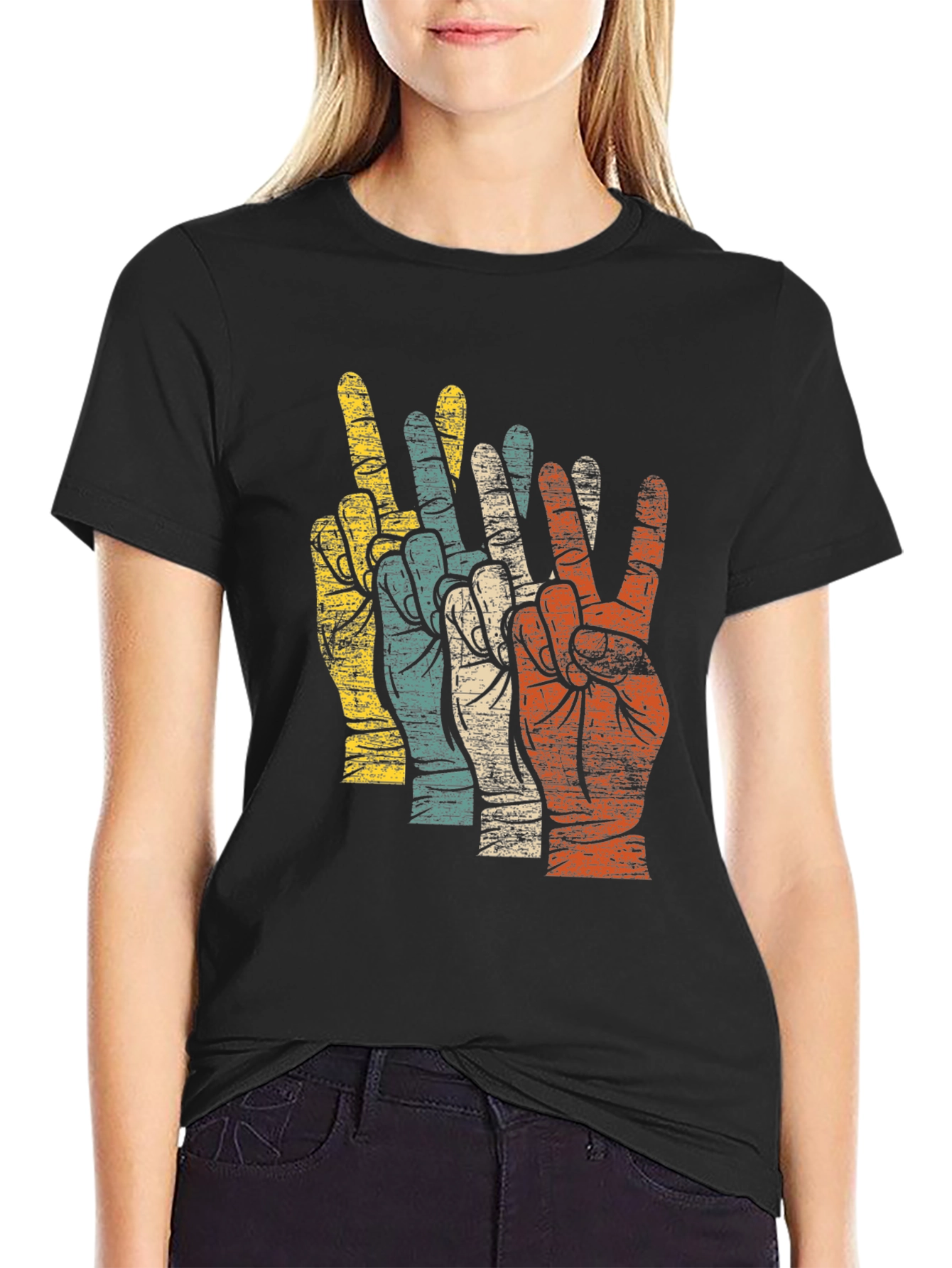 Luce un estilo vintage y relajado con esta camiseta negra de manga corta. Presenta un llamativo diseño retro de cuatro manos en fila mostrando el signo de la paz, cada una en un color desvanecido: amarillo, azul, blanco y naranja. Su estética desgastada le da un toque auténtico y relajado, ideal para un look casual con un toque de originalidad. Perfecta para expresar tu espíritu libre y amor por los años 70. Hecha con un tejido suave y cómodo, esta camiseta se convertirá en tu favorita para el día a día. Combínala con jeans, pantalones cortos o faldas para un estilo único.