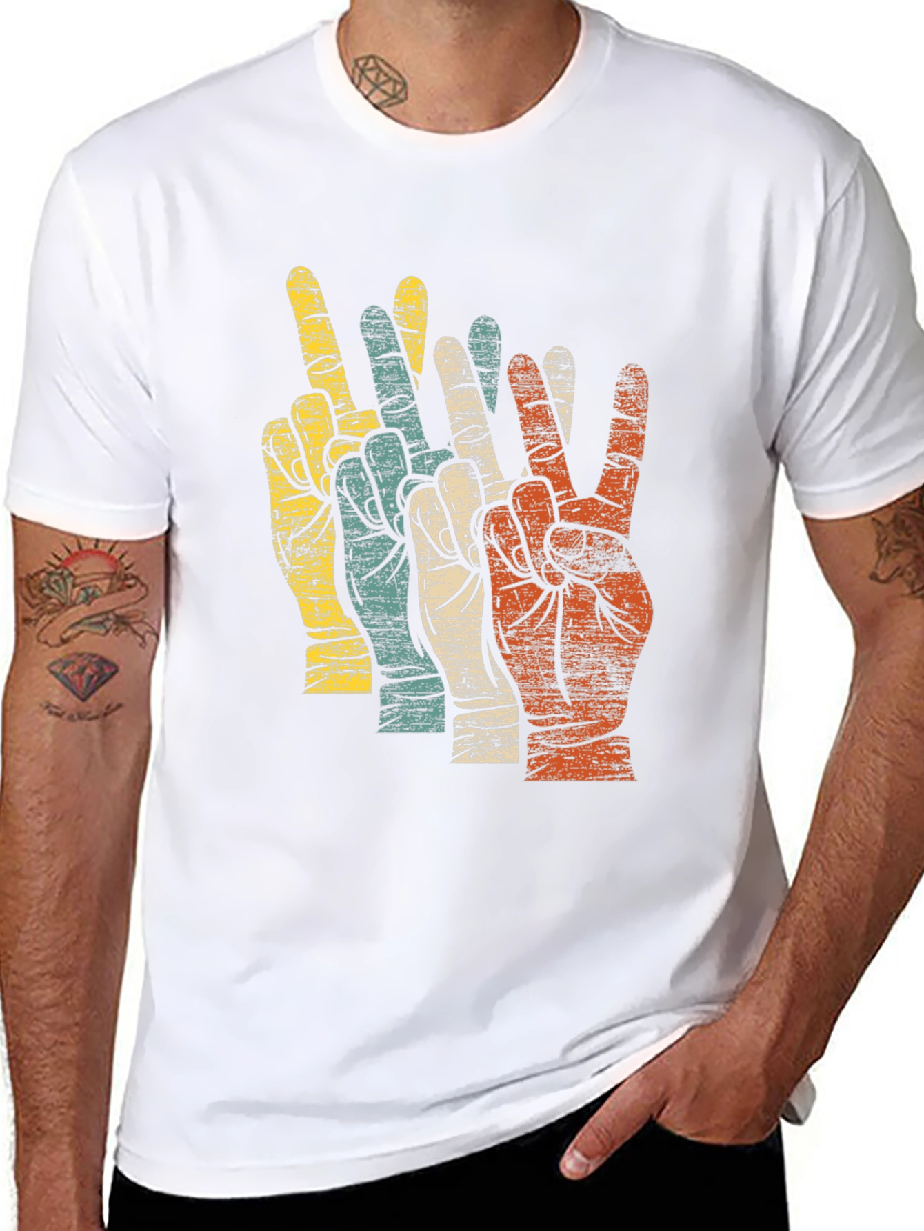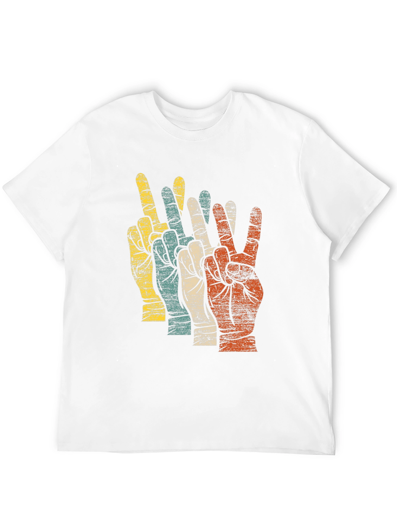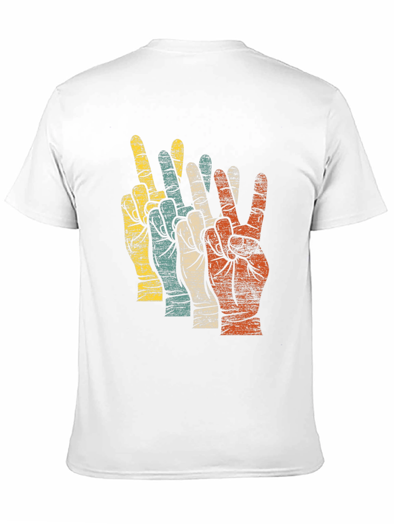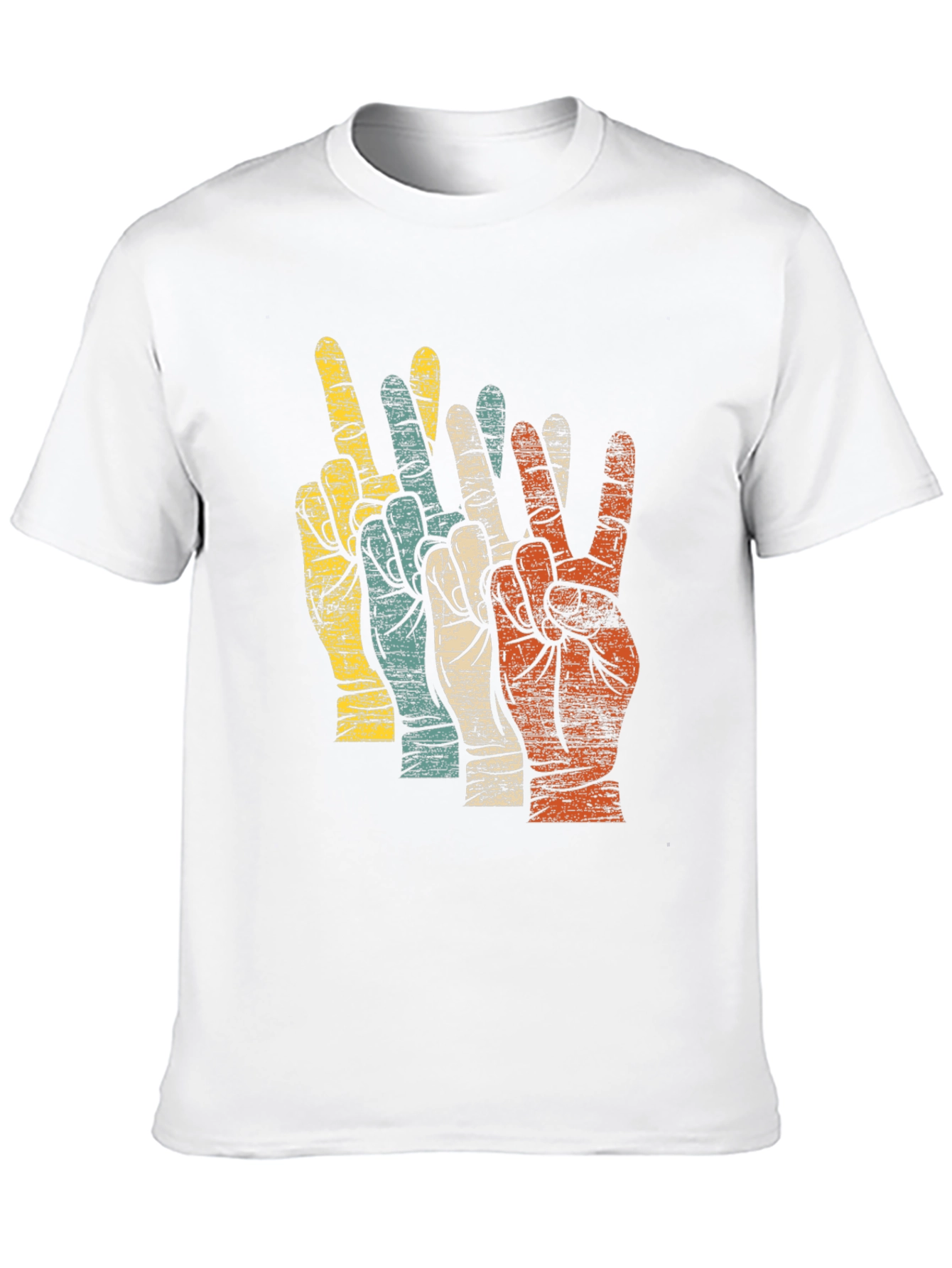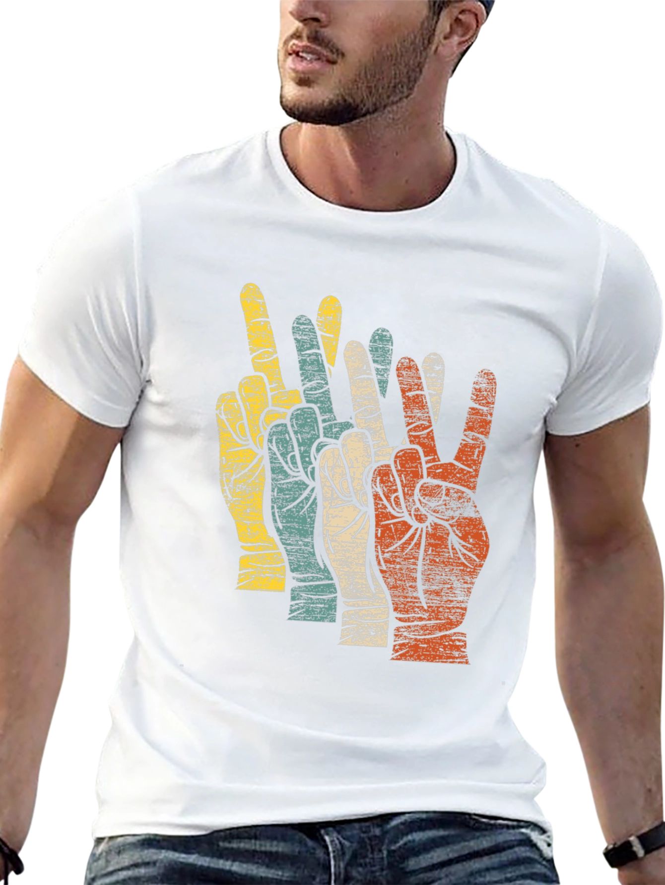 Luce un estilo vintage y relajado con esta camiseta negra de manga corta. Presenta un llamativo diseño retro de cuatro manos en fila mostrando el signo de la paz, cada una en un color desvanecido: amarillo, azul, blanco y naranja. Su estética desgastada le da un toque auténtico y relajado, ideal para un look casual con un toque de originalidad. Perfecta para expresar tu espíritu libre y amor por los años 70. Hecha con un tejido suave y cómodo, esta camiseta se convertirá en tu favorita para el día a día. Combínala con jeans, pantalones cortos o faldas para un estilo único.