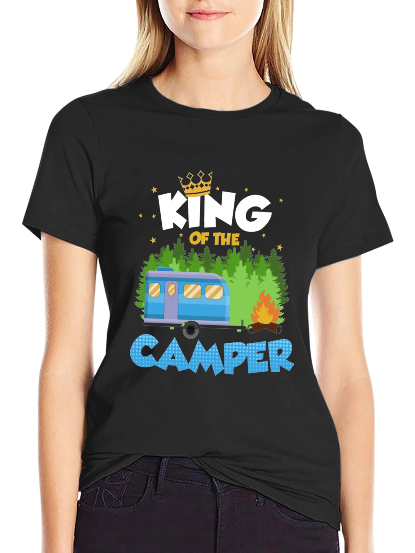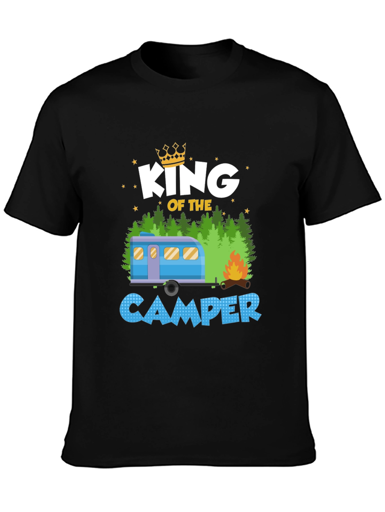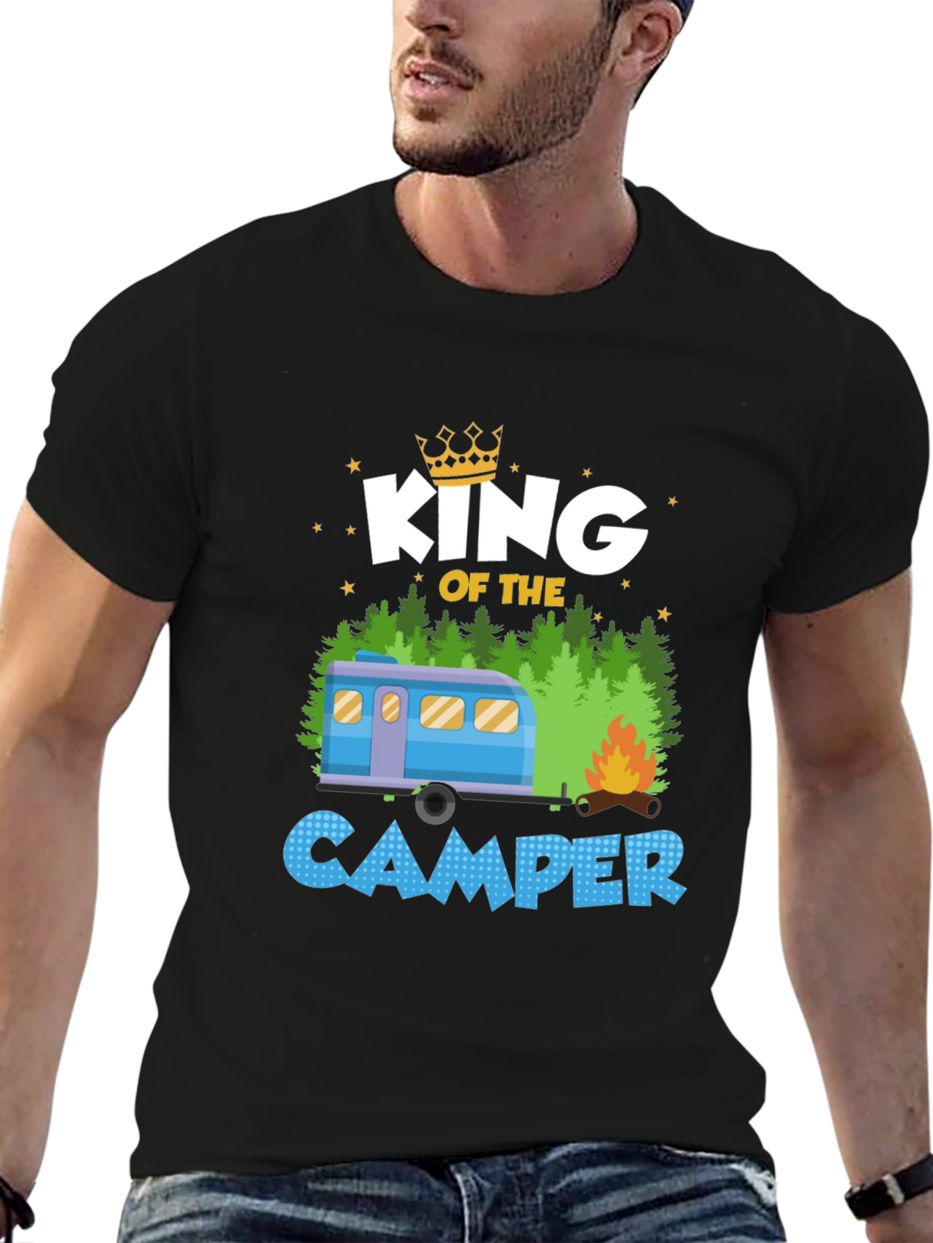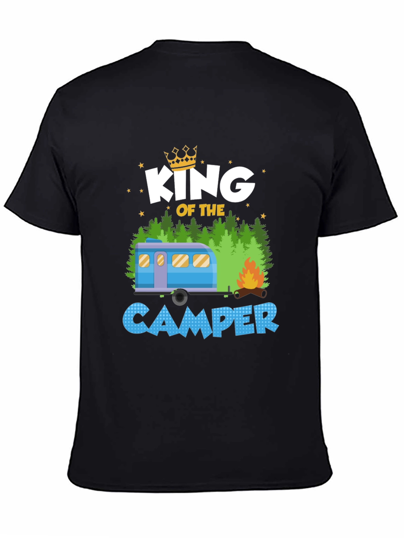 Presume de tu amor por el camping con esta divertida camiseta negra para hombre. El diseño llamativo presenta una corona dorada sobre el texto "KING OF THE", debajo una ilustración de una caravana azul frente a un bosque verde y una fogata. La frase "CAMPER" en letras azules con diseño de lunares completa el diseño. Fabricada en un material suave y cómodo, ideal para llevar en tu próxima aventura al aire libre o simplemente para expresar tu pasión por el camping en tu día a día. Perfecta para regalar a ese campista especial en tu vida.