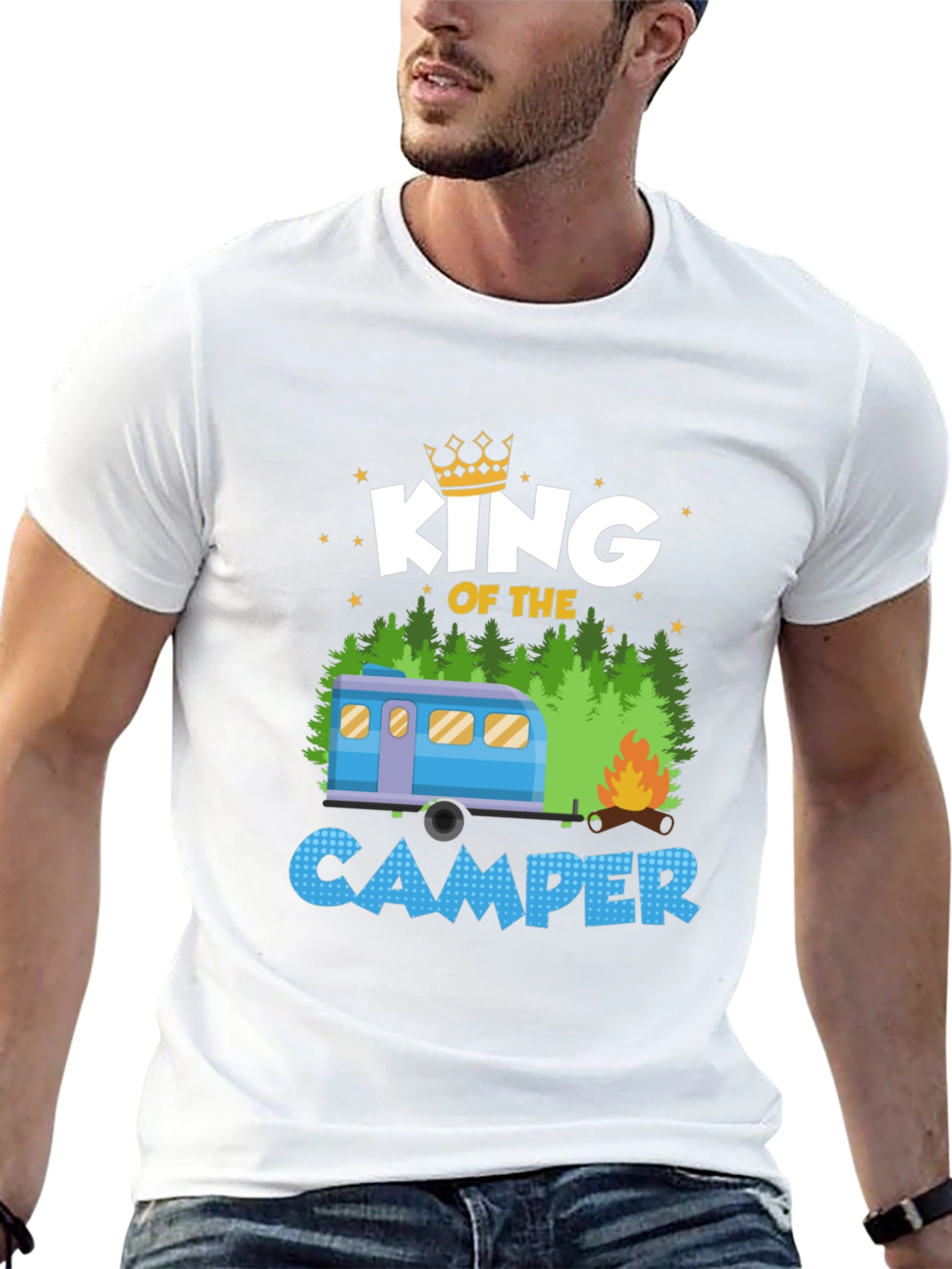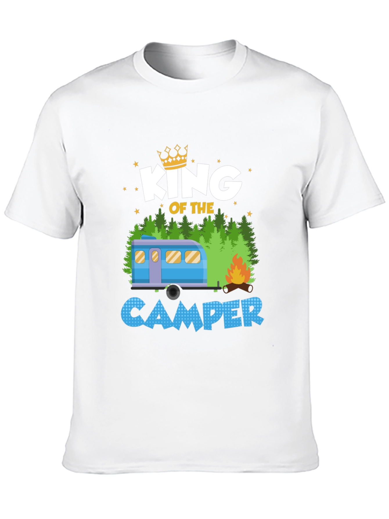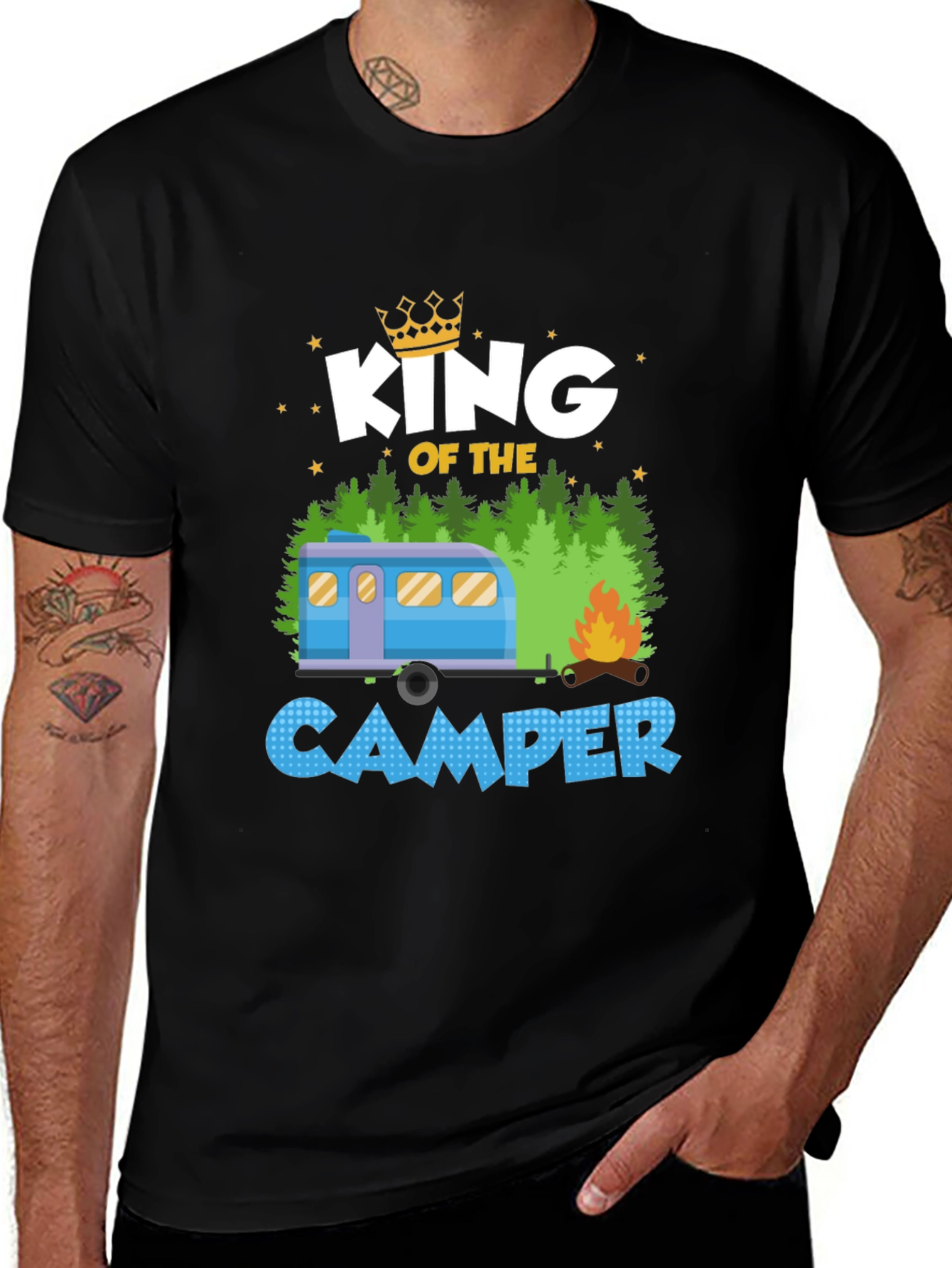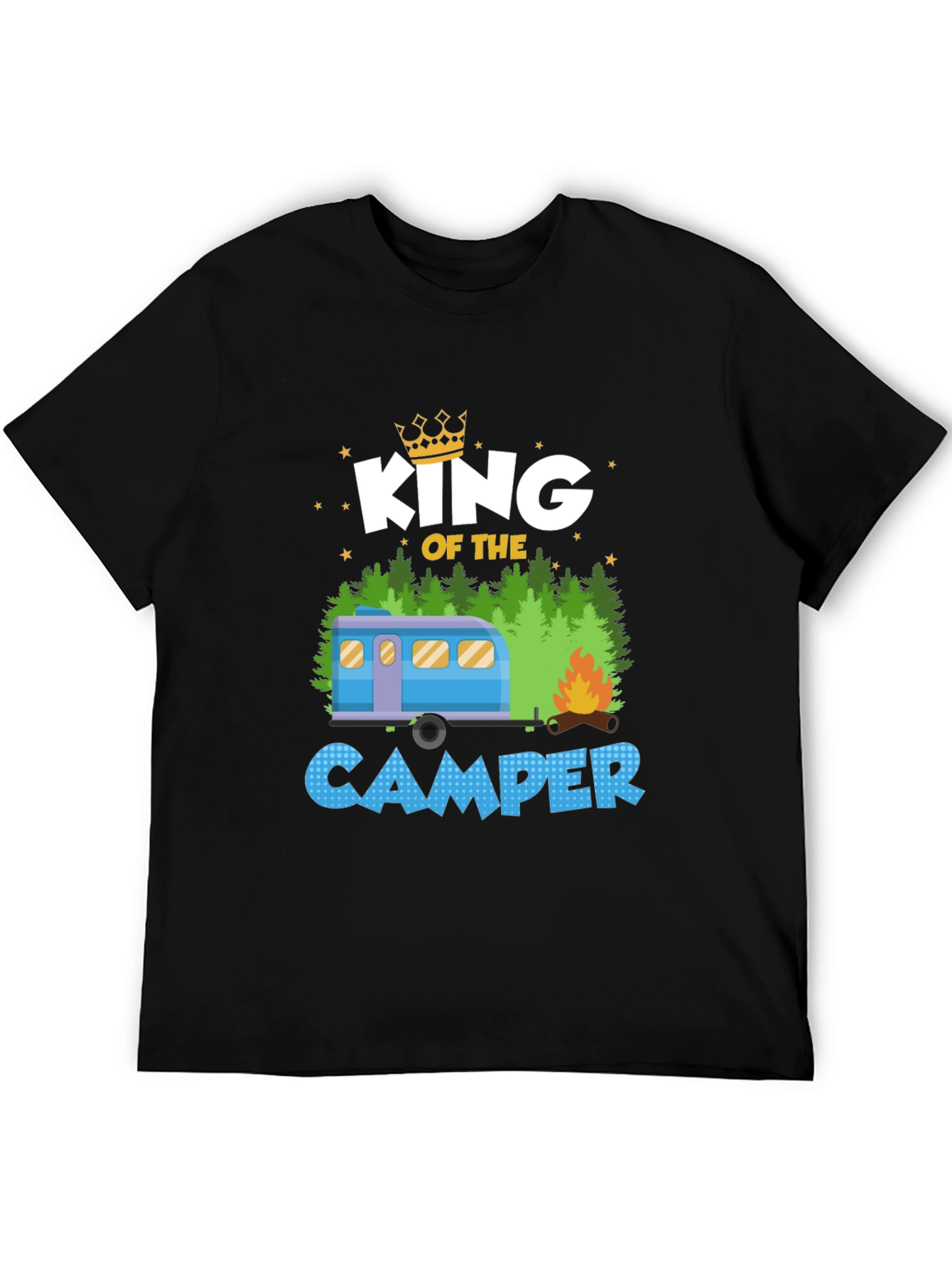 Presume de tu amor por el camping con esta divertida camiseta negra para hombre. El diseño llamativo presenta una corona dorada sobre el texto "KING OF THE", debajo una ilustración de una caravana azul frente a un bosque verde y una fogata. La frase "CAMPER" en letras azules con diseño de lunares completa el diseño. Fabricada en un material suave y cómodo, ideal para llevar en tu próxima aventura al aire libre o simplemente para expresar tu pasión por el camping en tu día a día. Perfecta para regalar a ese campista especial en tu vida.