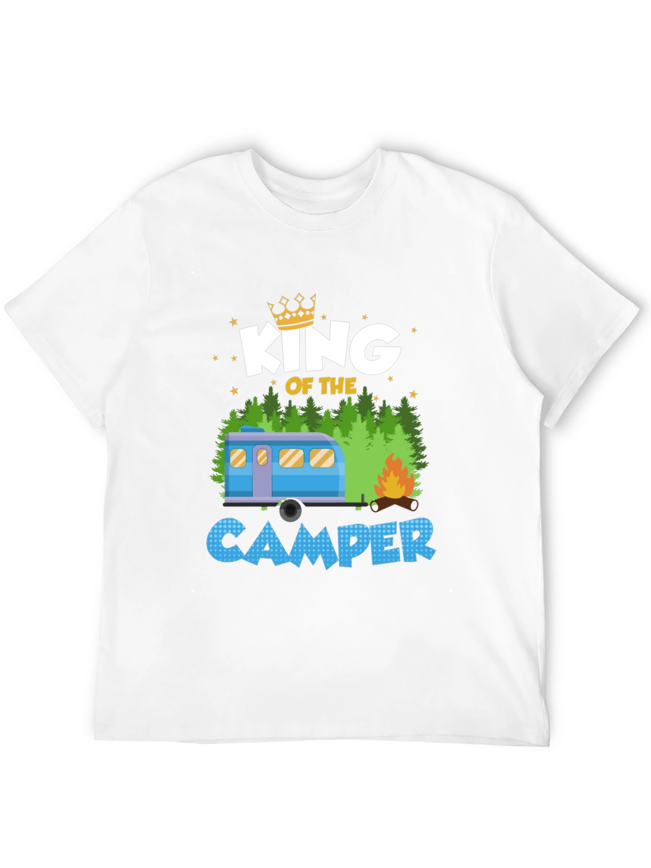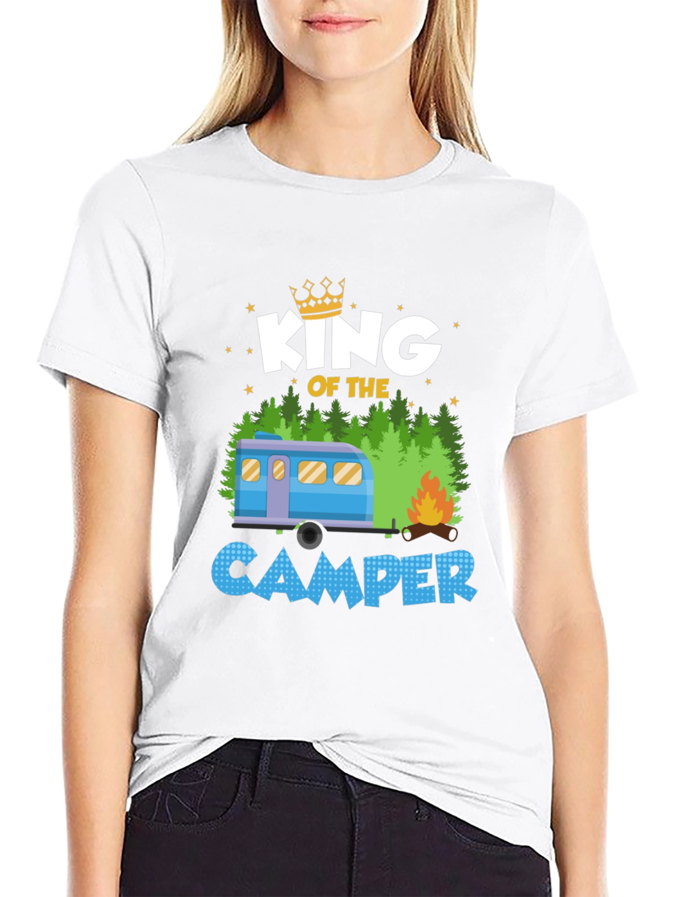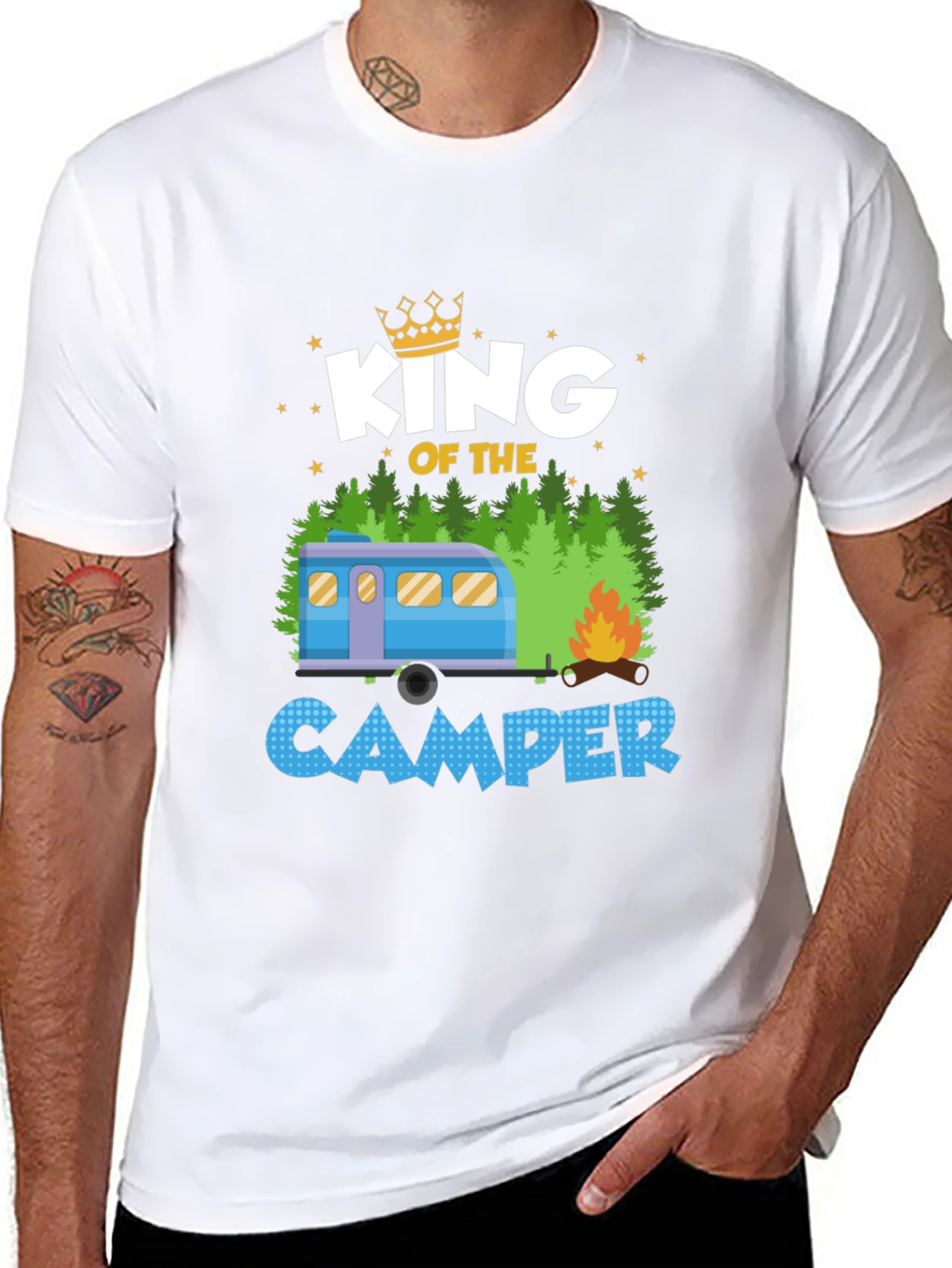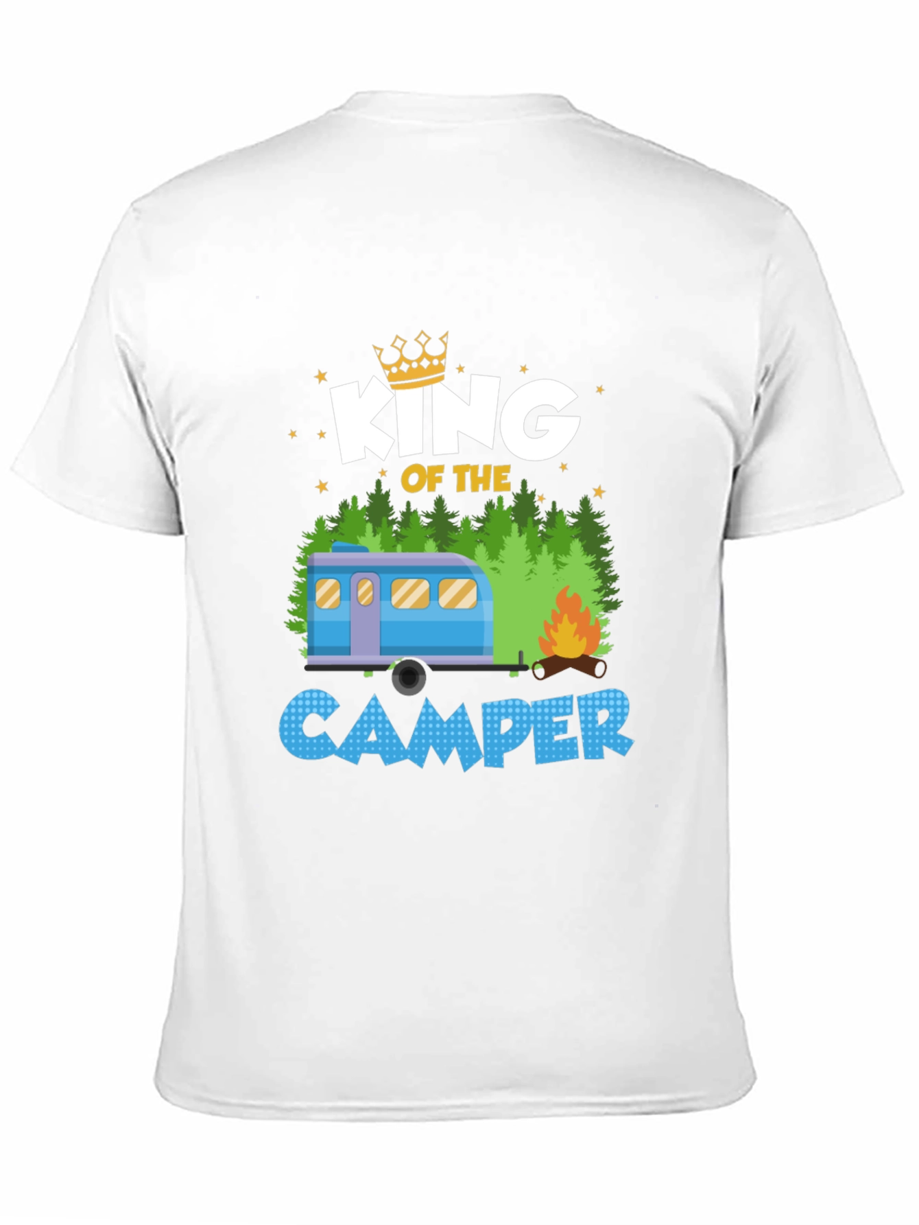 Presume de tu amor por el camping con esta divertida camiseta negra para hombre. El diseño llamativo presenta una corona dorada sobre el texto "KING OF THE", debajo una ilustración de una caravana azul frente a un bosque verde y una fogata. La frase "CAMPER" en letras azules con diseño de lunares completa el diseño. Fabricada en un material suave y cómodo, ideal para llevar en tu próxima aventura al aire libre o simplemente para expresar tu pasión por el camping en tu día a día. Perfecta para regalar a ese campista especial en tu vida.