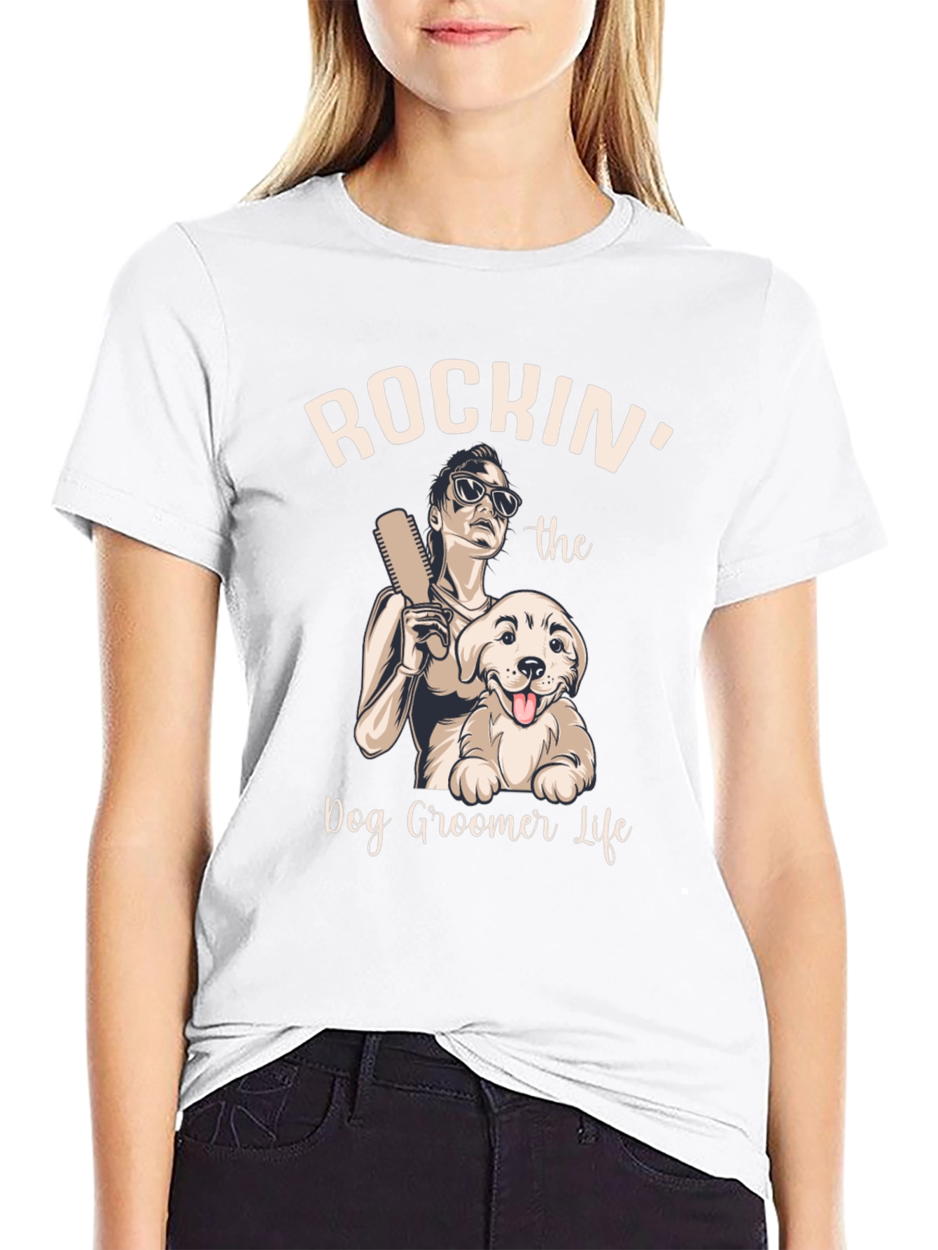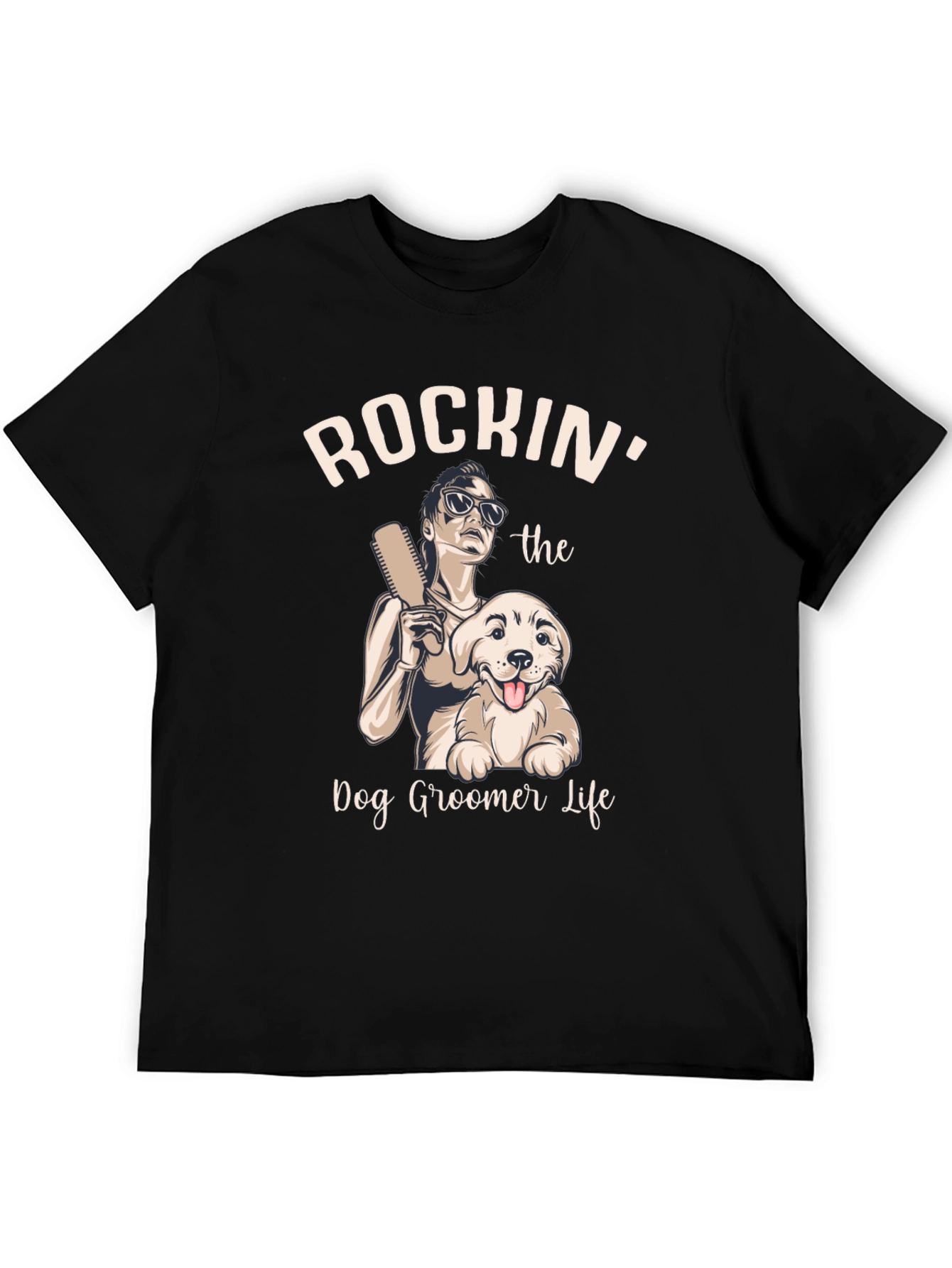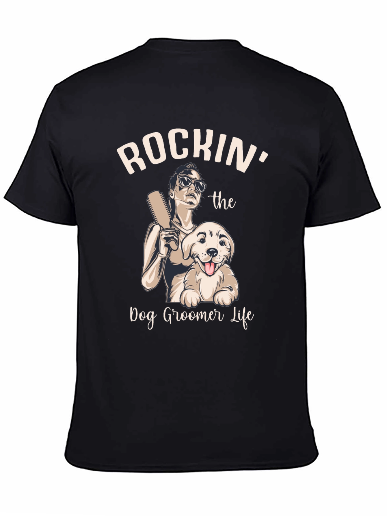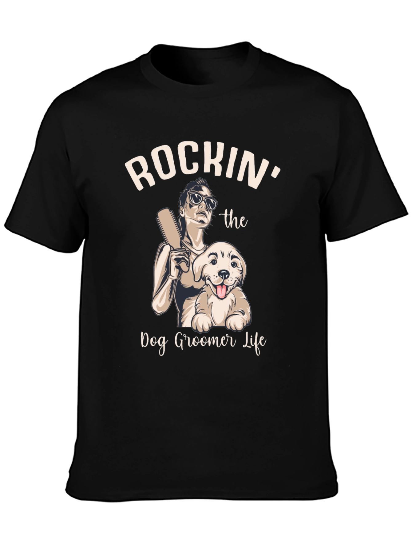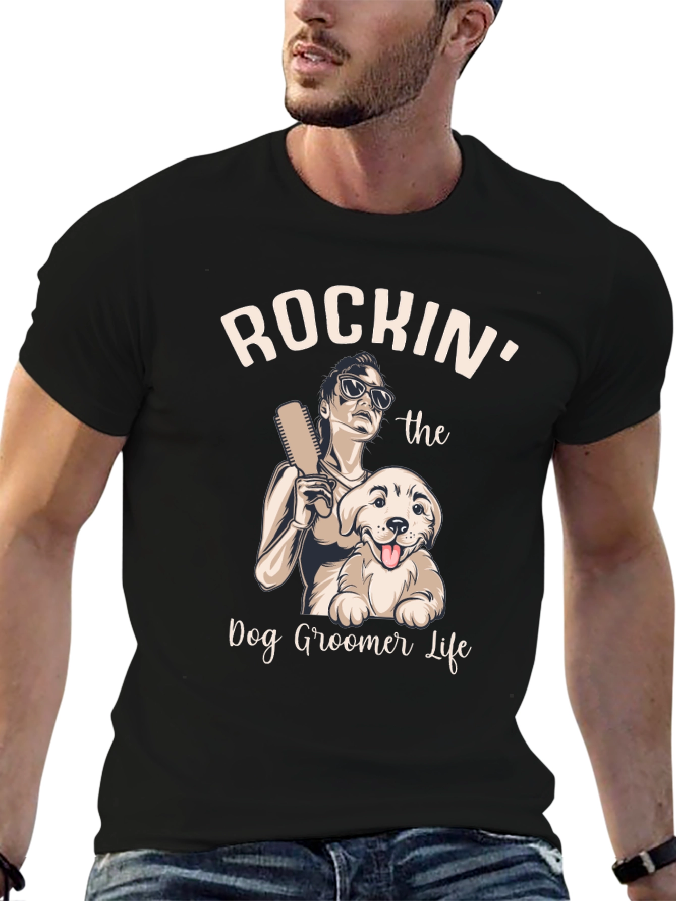 Luce tu pasión con esta camiseta negra de diseño exclusivo. Presenta un estampado llamativo con la leyenda "ROCKIN' the Dog Groomer Life", ideal para los amantes de los perros y el cuidado canino. En la imagen se aprecia una persona con gafas y un cepillo junto a un adorable perrito, reflejando el cariño y la dedicación del trabajo de un peluquero canino. Confeccionada en un material suave y cómodo, esta camiseta es perfecta para el uso diario, ya sea en el trabajo o en tus momentos de ocio. Un regalo original y divertido para cualquier profesional o aficionado del mundo canino. ¡Demuestra tu orgullo con esta prenda única!