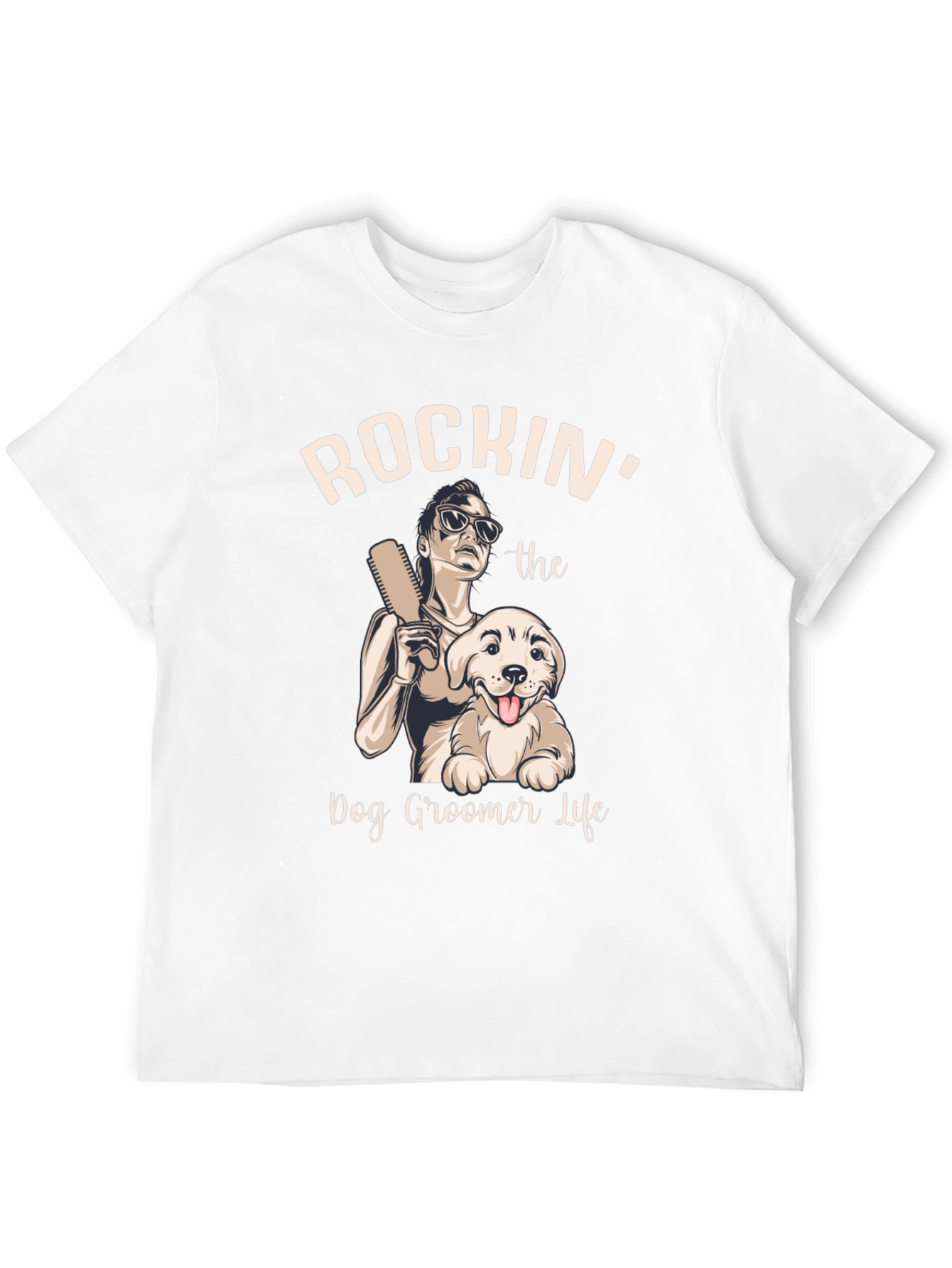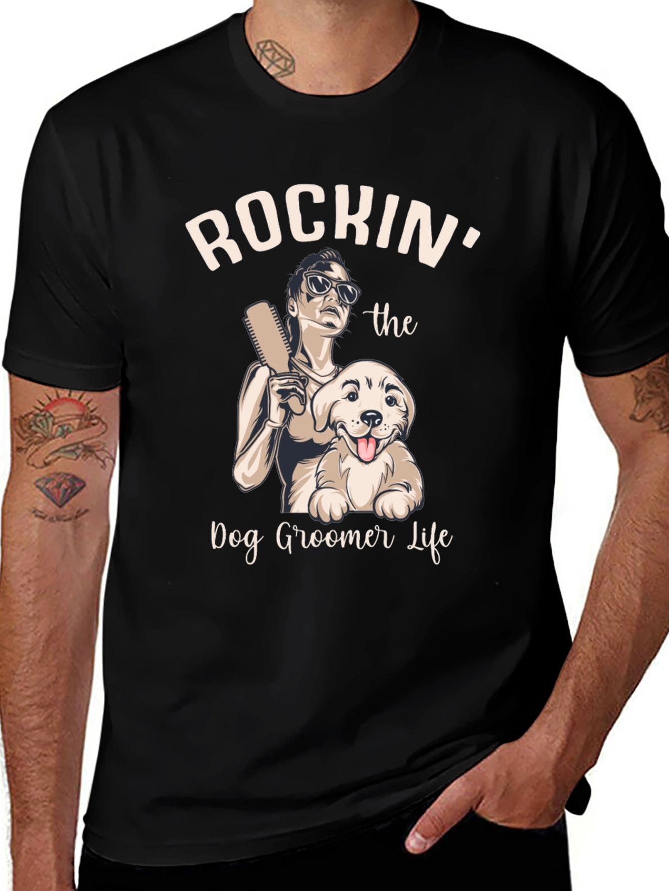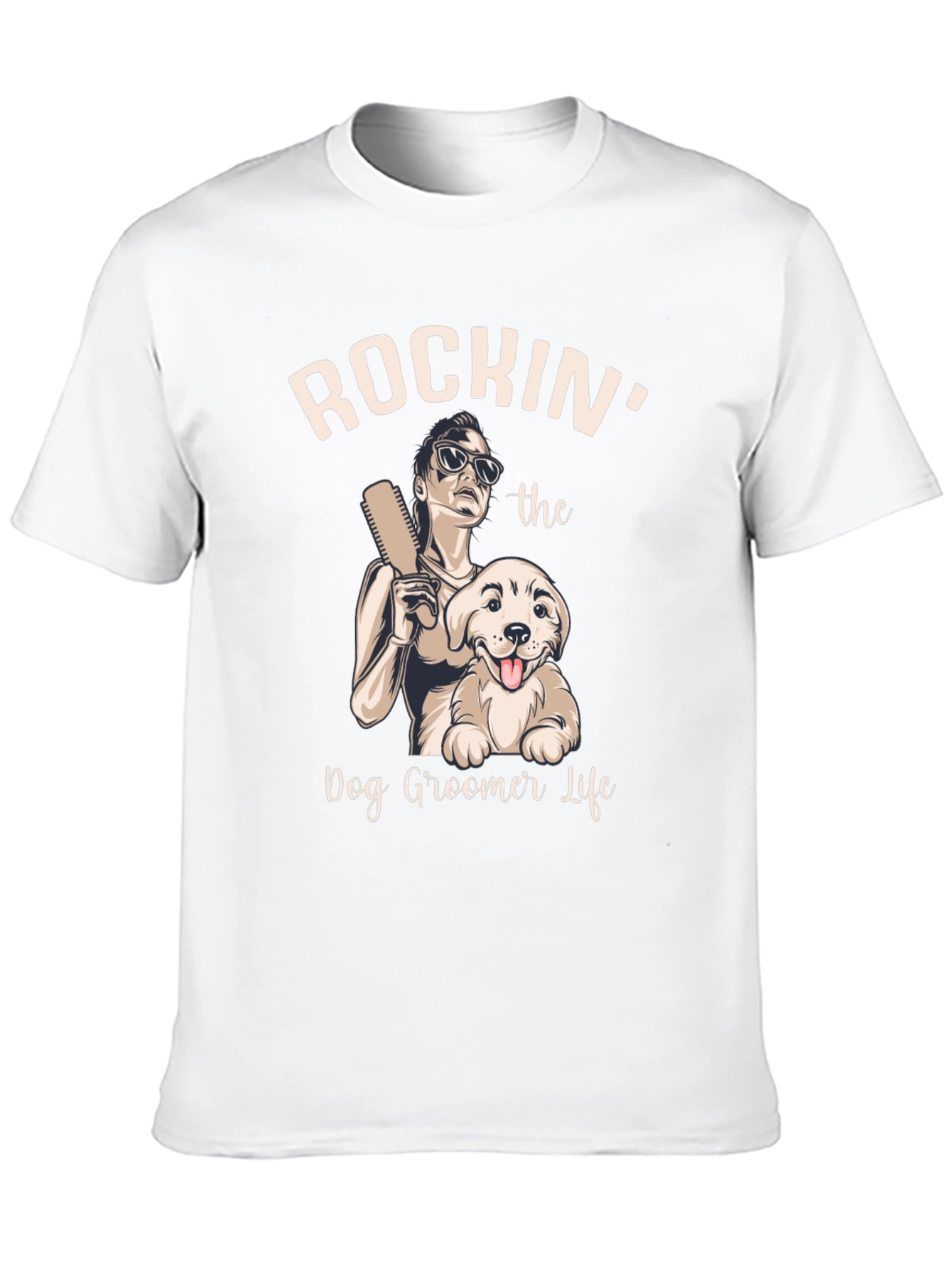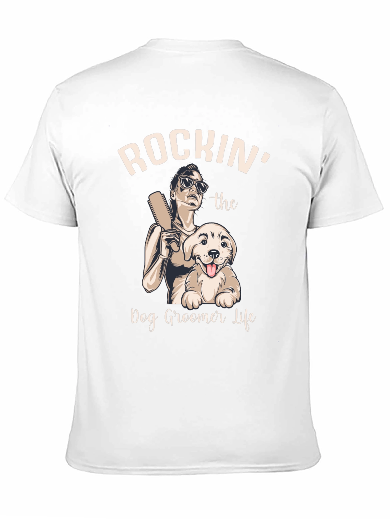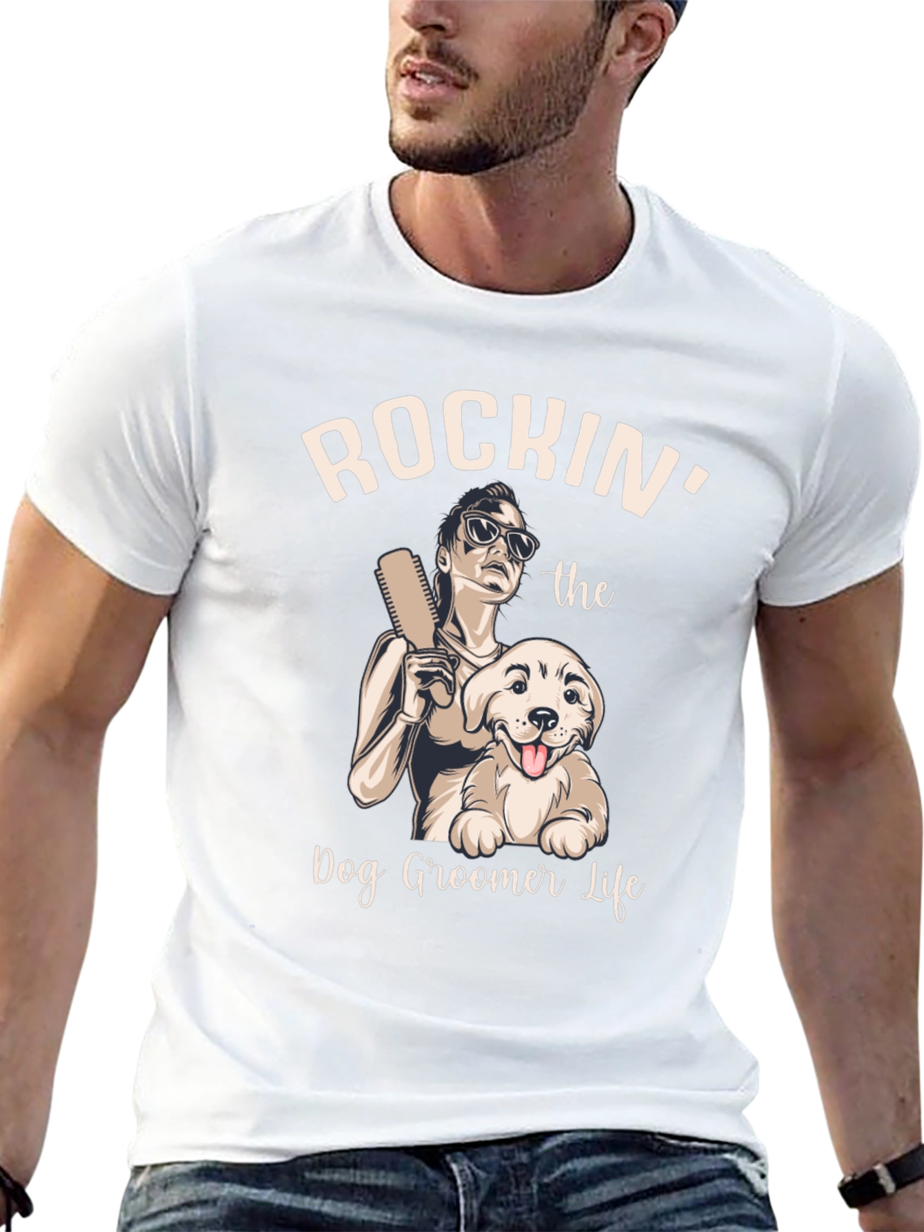 Luce tu pasión con esta camiseta negra de diseño exclusivo. Presenta un estampado llamativo con la leyenda "ROCKIN' the Dog Groomer Life", ideal para los amantes de los perros y el cuidado canino. En la imagen se aprecia una persona con gafas y un cepillo junto a un adorable perrito, reflejando el cariño y la dedicación del trabajo de un peluquero canino. Confeccionada en un material suave y cómodo, esta camiseta es perfecta para el uso diario, ya sea en el trabajo o en tus momentos de ocio. Un regalo original y divertido para cualquier profesional o aficionado del mundo canino. ¡Demuestra tu orgullo con esta prenda única!