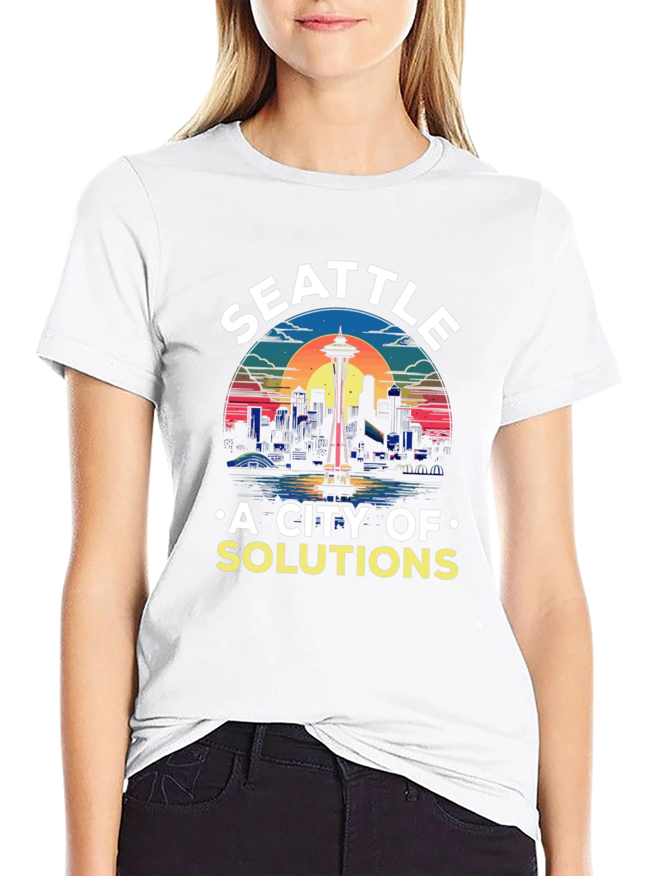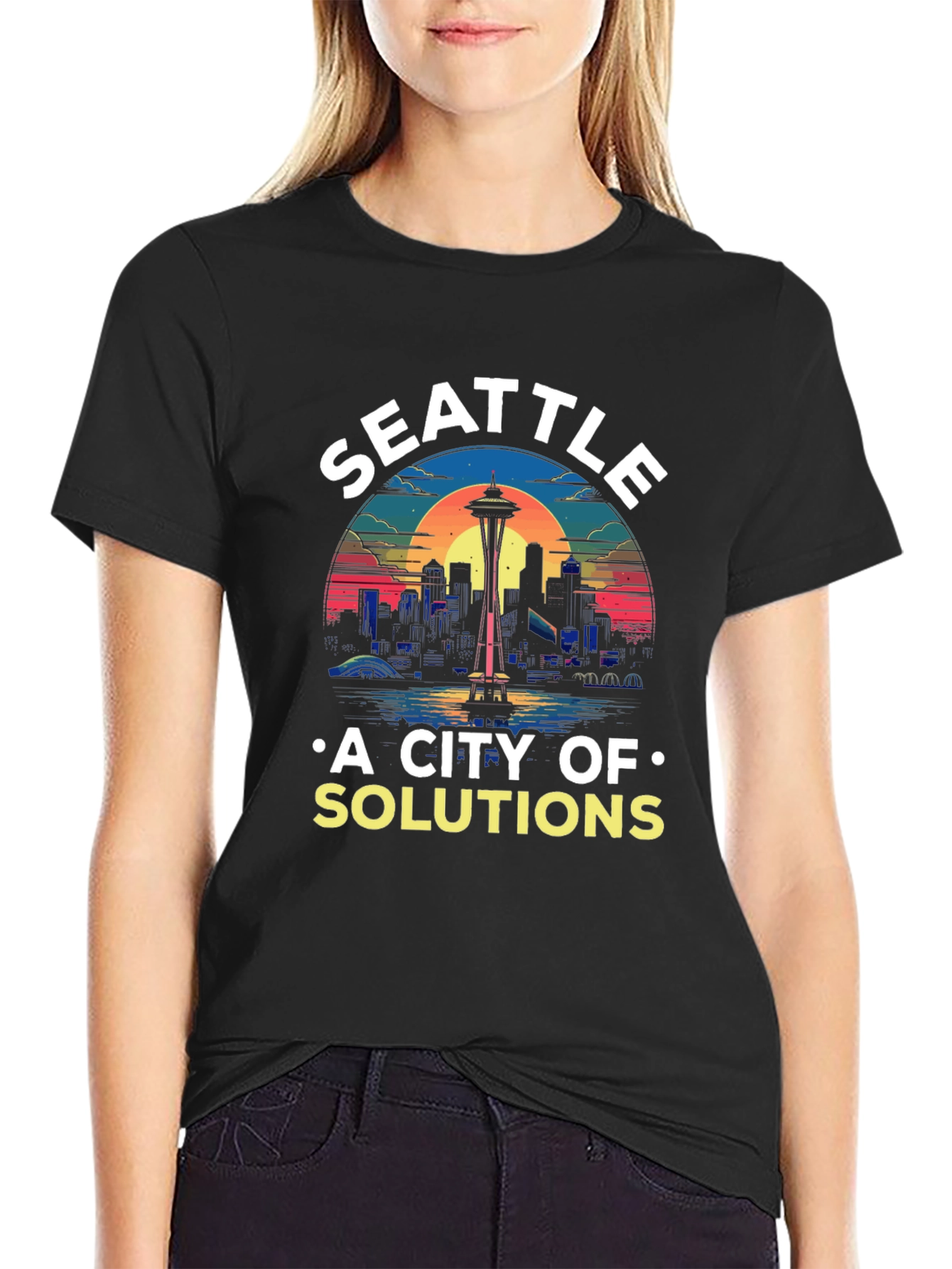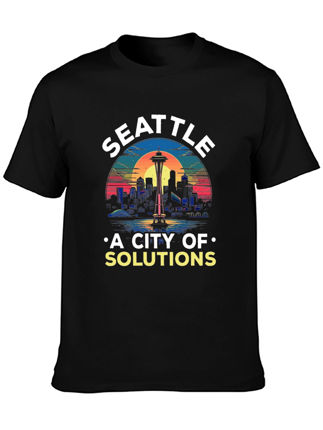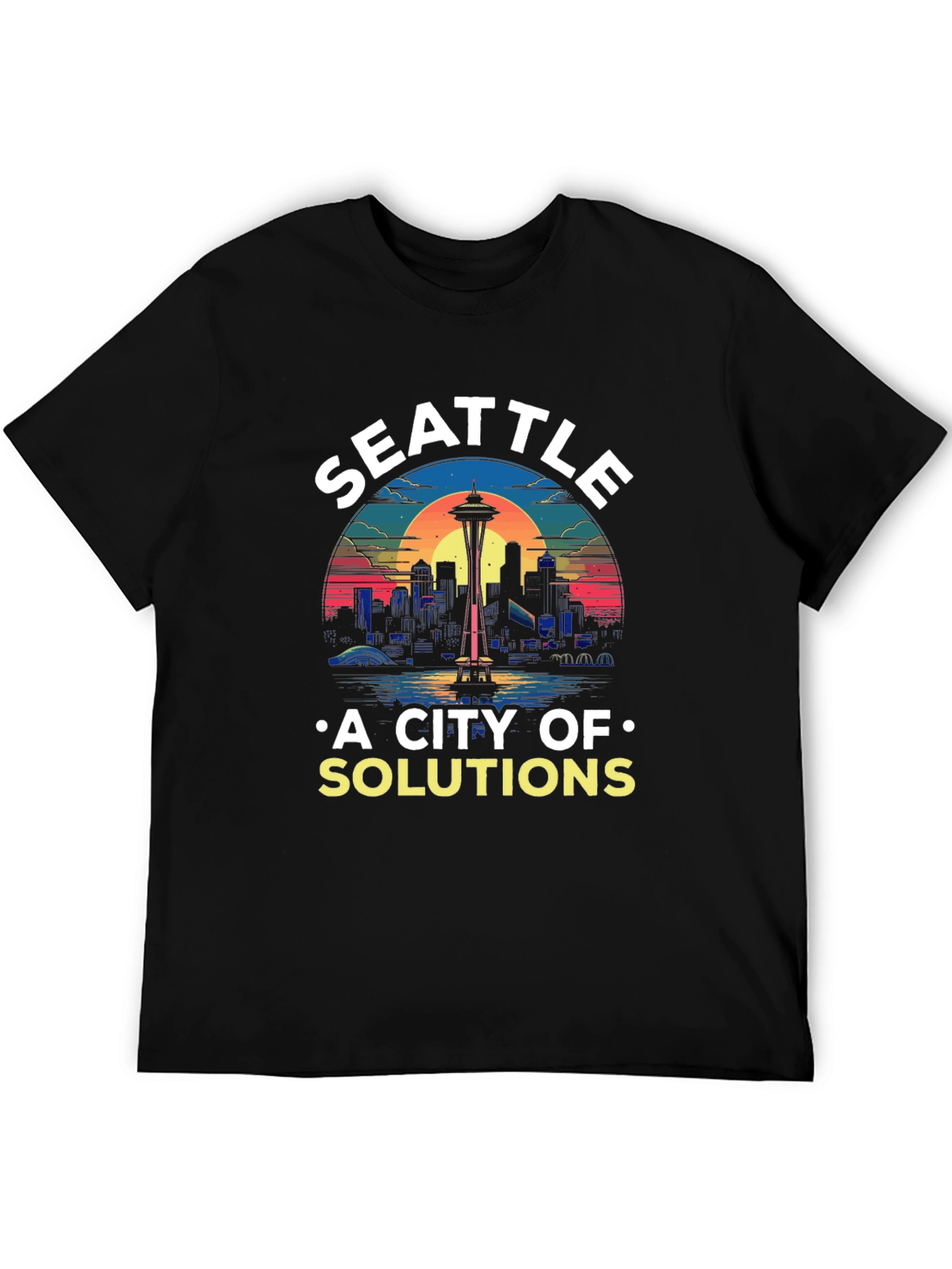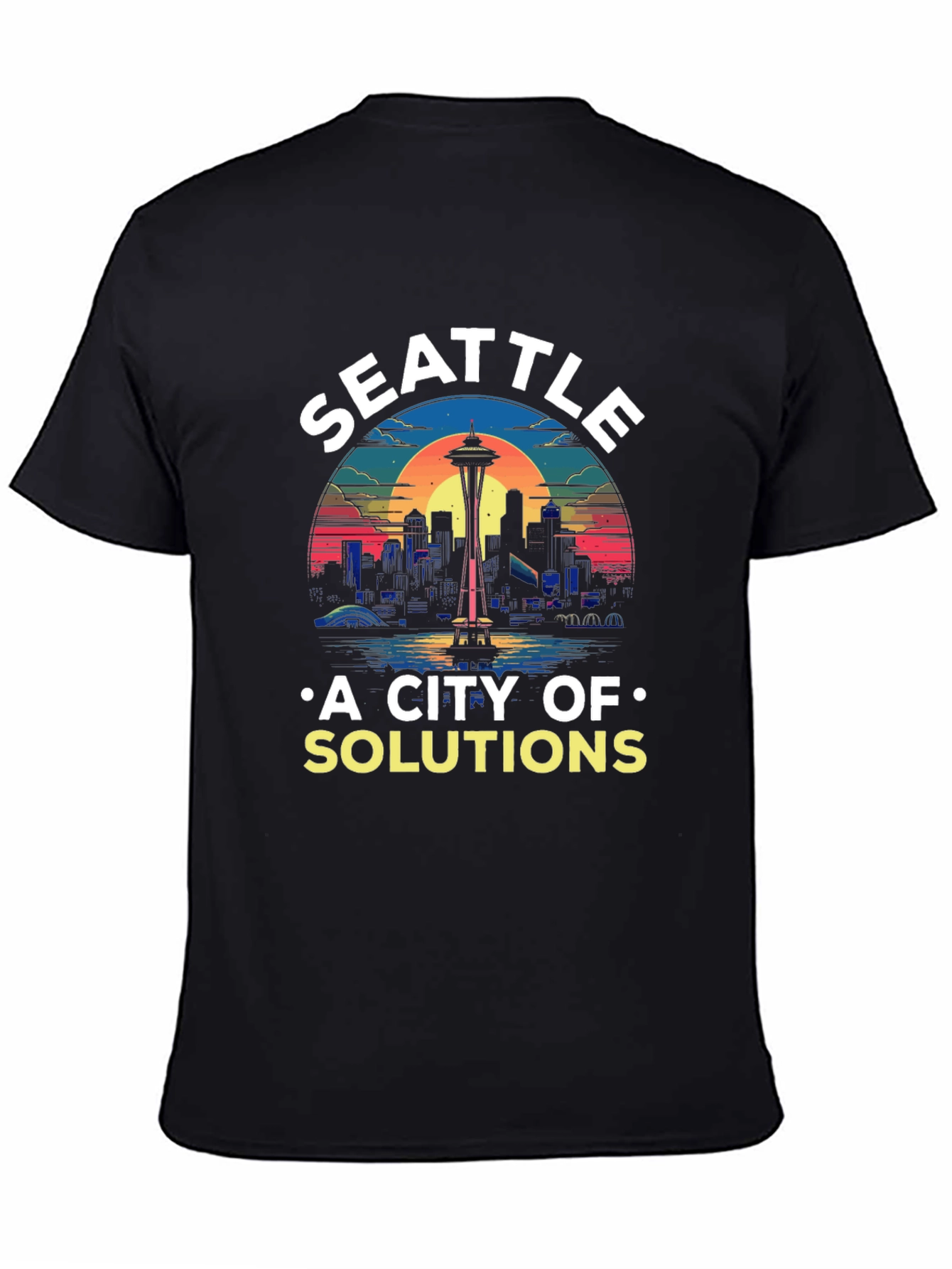 Luce esta camiseta negra con un diseño vibrante de Seattle. El horizonte de la ciudad, coronado por la emblemática Space Needle, se presenta en un estilo retro con colores llamativos al atardecer. La frase "A CITY OF SOLUTIONS" añade un toque único y positivo. Ideal para amantes de Seattle, esta camiseta es perfecta para uso casual, eventos o como un regalo especial. Fabricada con materiales suaves y cómodos, garantiza durabilidad y estilo. Destaca con esta prenda original y muestra tu admiración por la ciudad esmeralda.