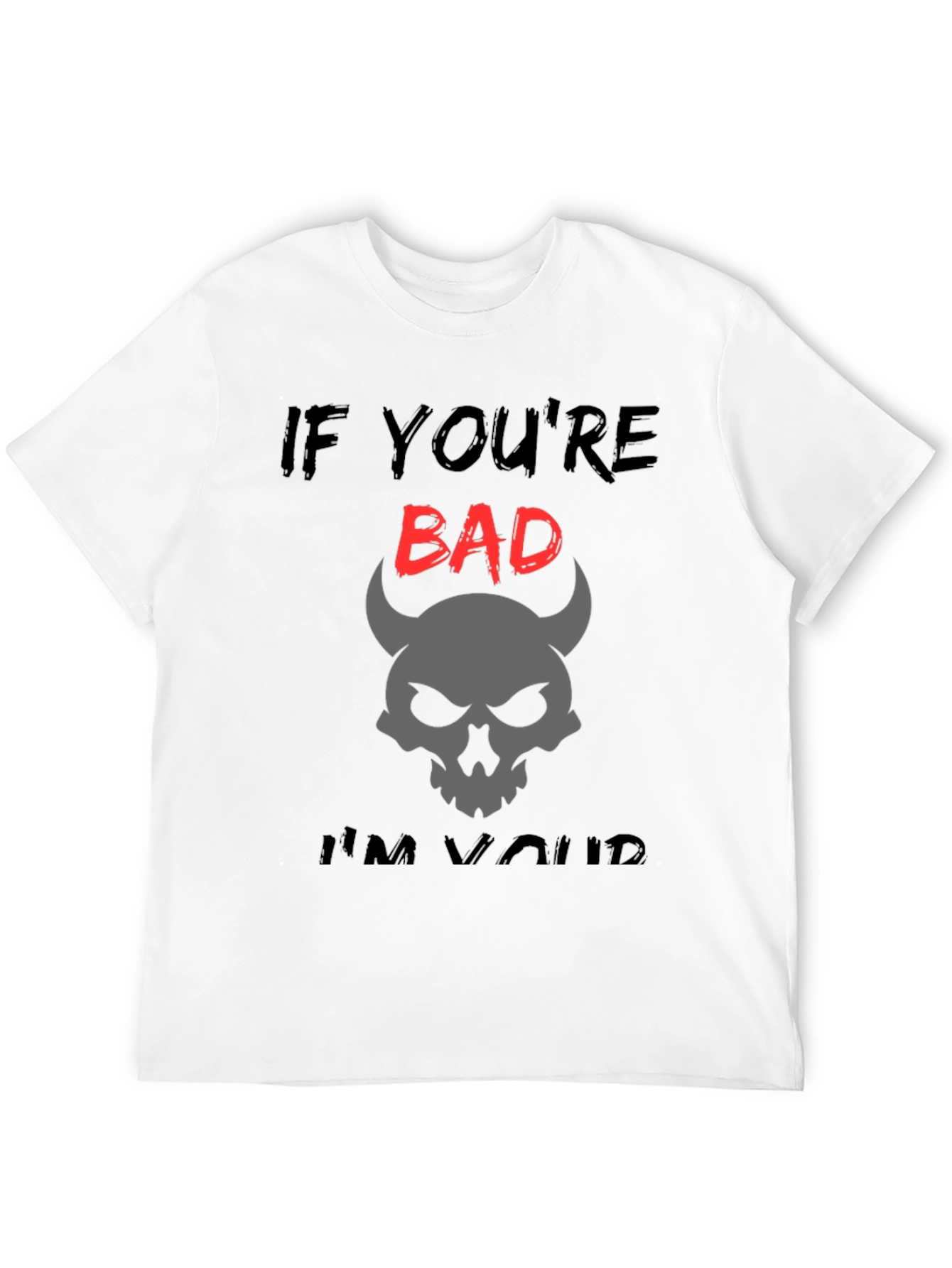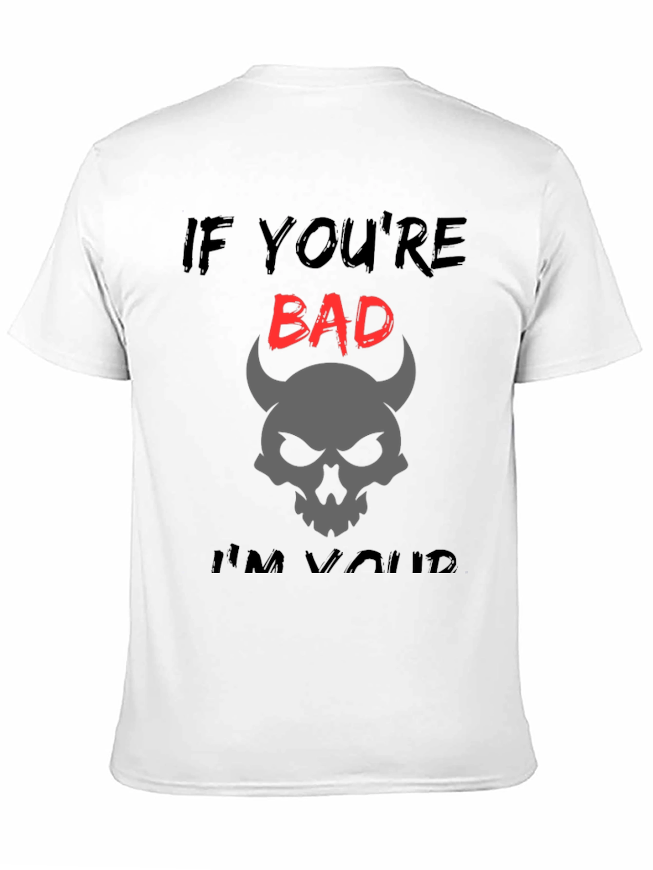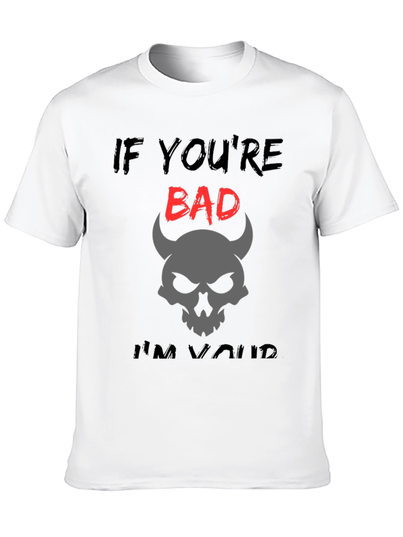 Luce un estilo audaz con esta camiseta negra de corte clásico. Presenta un diseño llamativo con la frase "IF YOU'RE BAD... I'M YOURS", donde la palabra "BAD" destaca en rojo vibrante. Bajo la frase, una calavera con cuernos de diablo en color gris añade un toque misterioso y rebelde. Esta camiseta es ideal para quienes buscan expresar su personalidad con un toque de humor y oscuridad. Perfecta para un look casual, conciertos, o simplemente para destacar entre la multitud. Fabricada en tela suave y cómoda, te garantiza un ajuste perfecto y durabilidad.