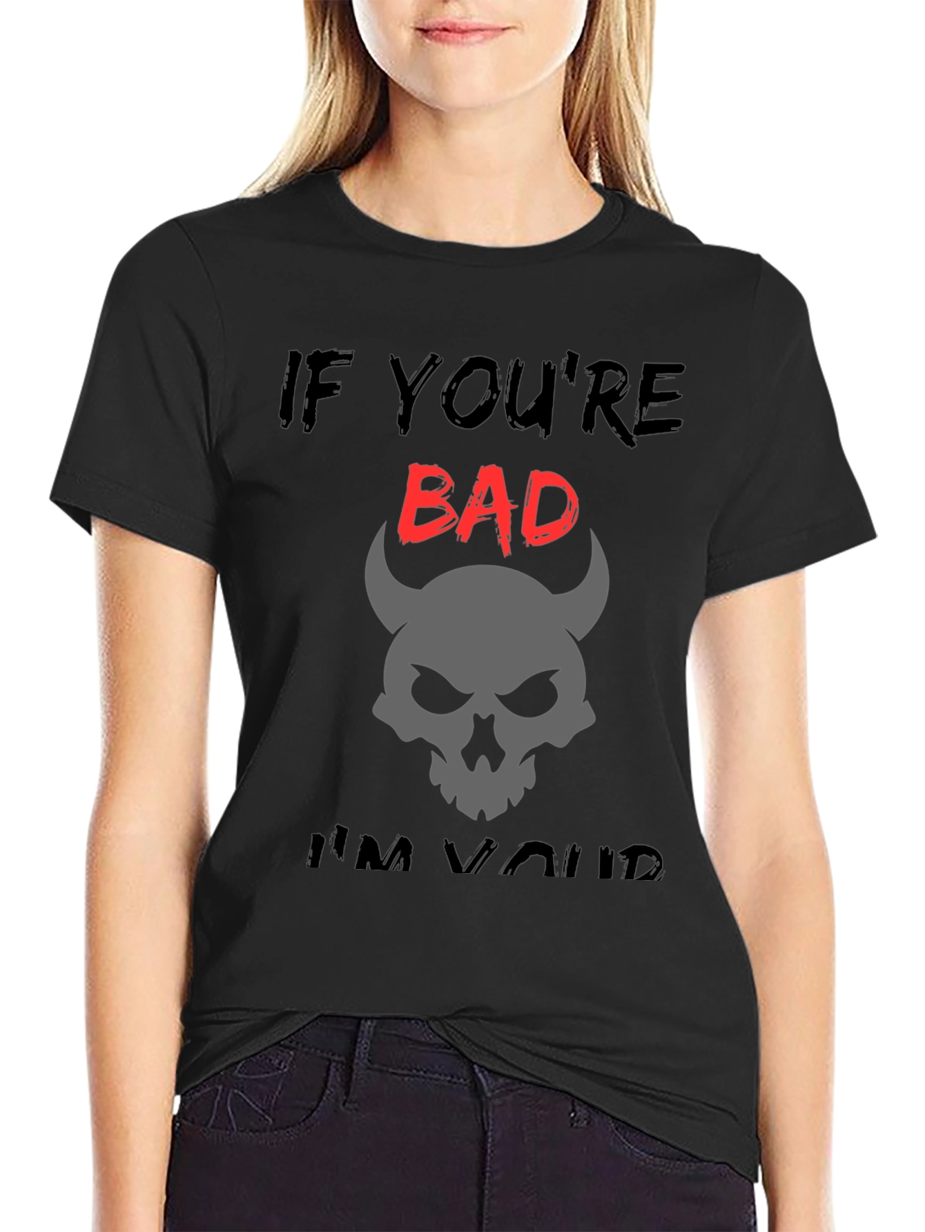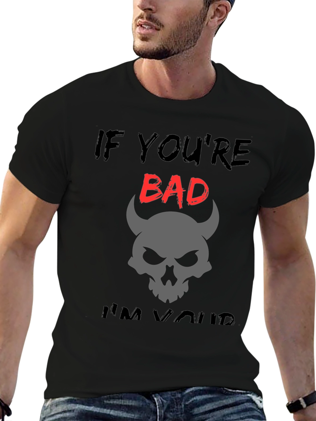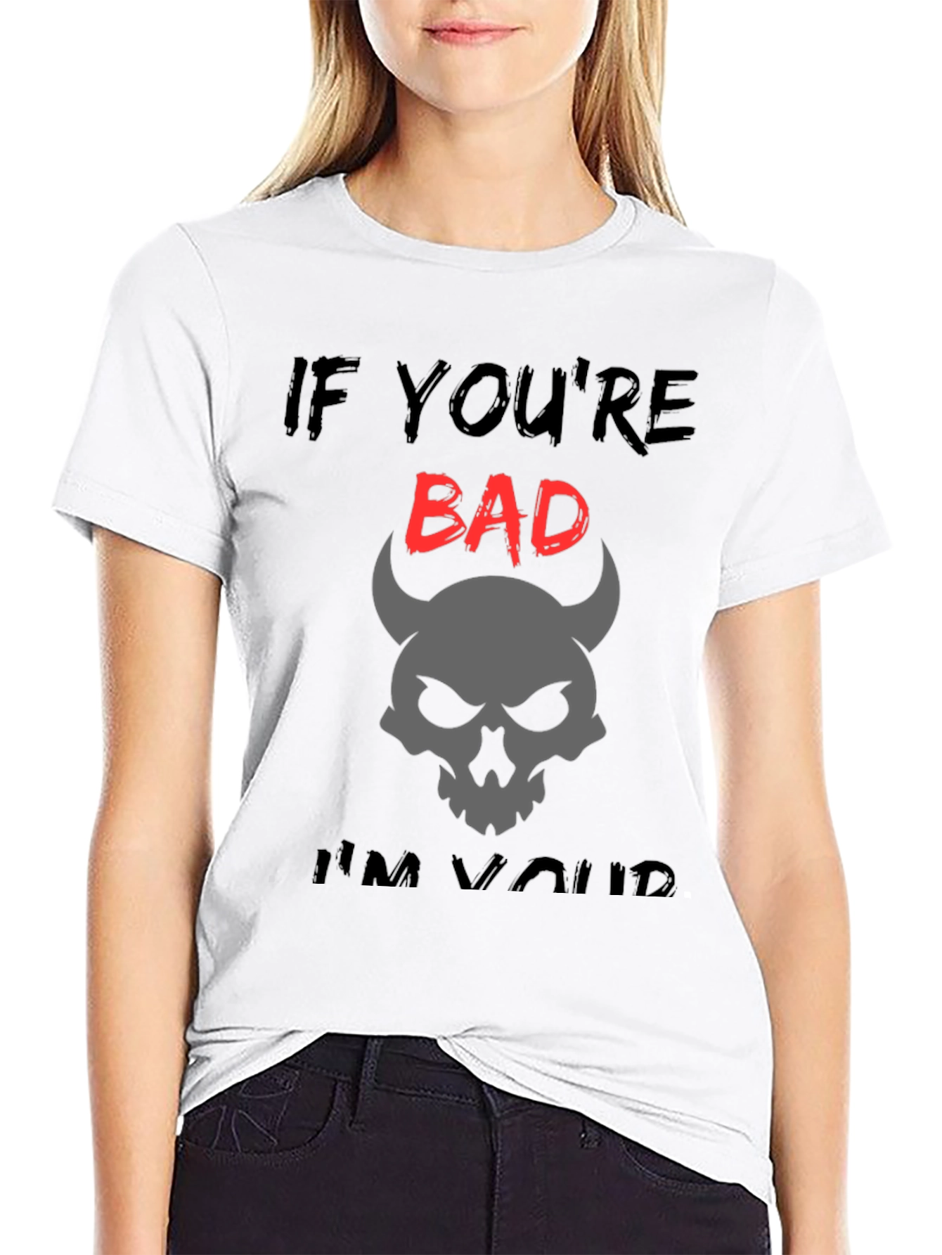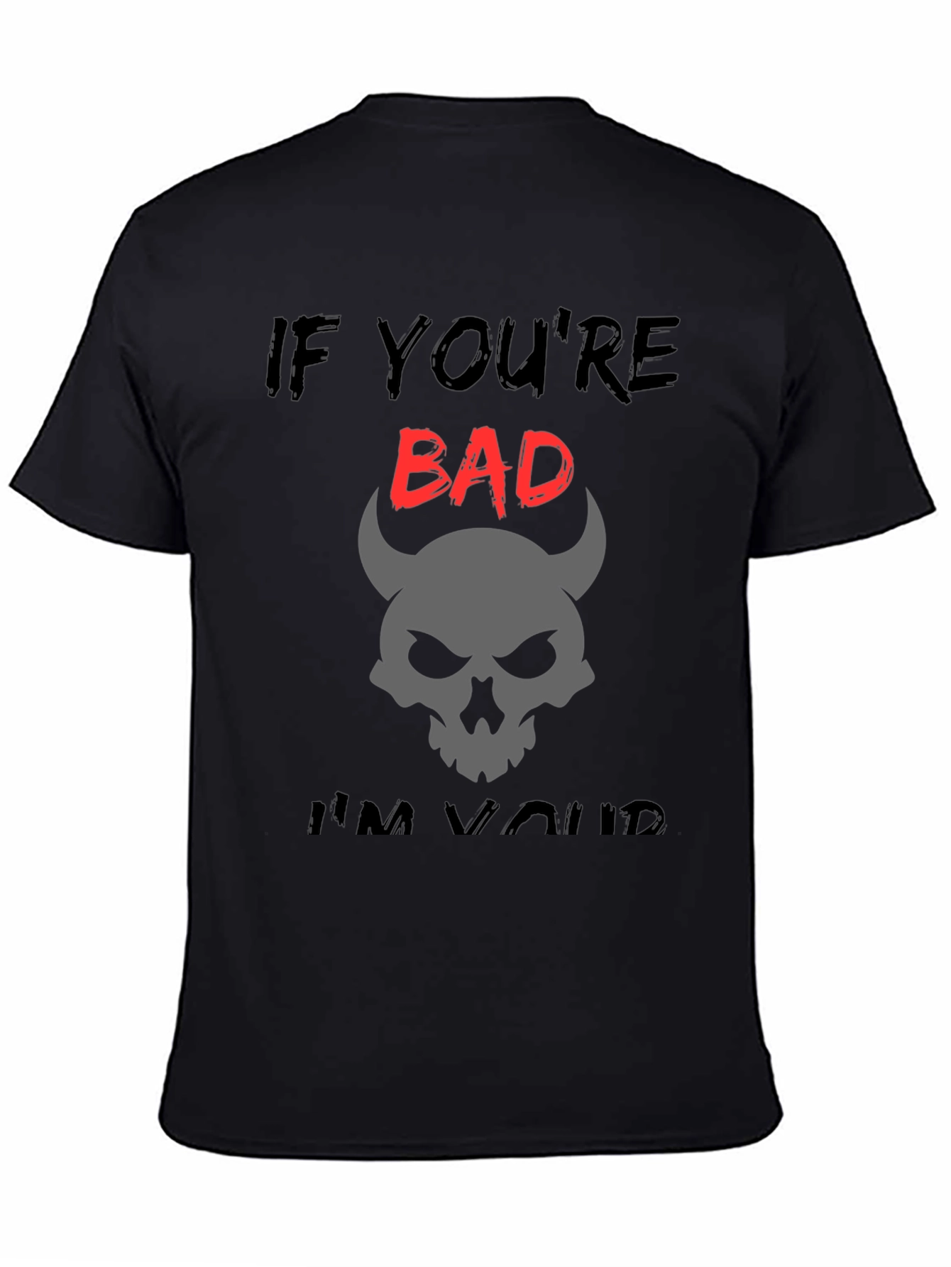 Luce un estilo audaz con esta camiseta negra de corte clásico. Presenta un diseño llamativo con la frase "IF YOU'RE BAD... I'M YOURS", donde la palabra "BAD" destaca en rojo vibrante. Bajo la frase, una calavera con cuernos de diablo en color gris añade un toque misterioso y rebelde. Esta camiseta es ideal para quienes buscan expresar su personalidad con un toque de humor y oscuridad. Perfecta para un look casual, conciertos, o simplemente para destacar entre la multitud. Fabricada en tela suave y cómoda, te garantiza un ajuste perfecto y durabilidad.