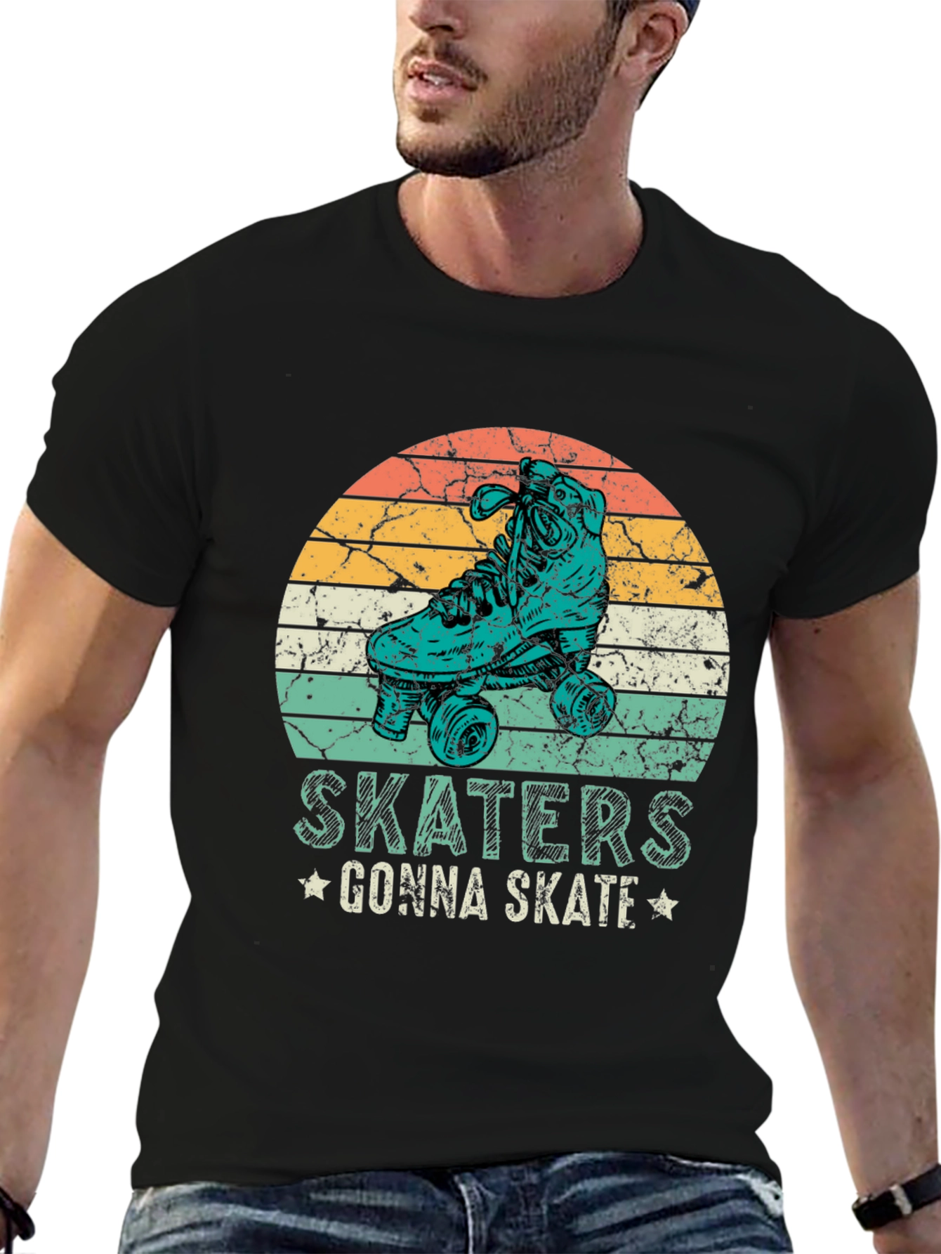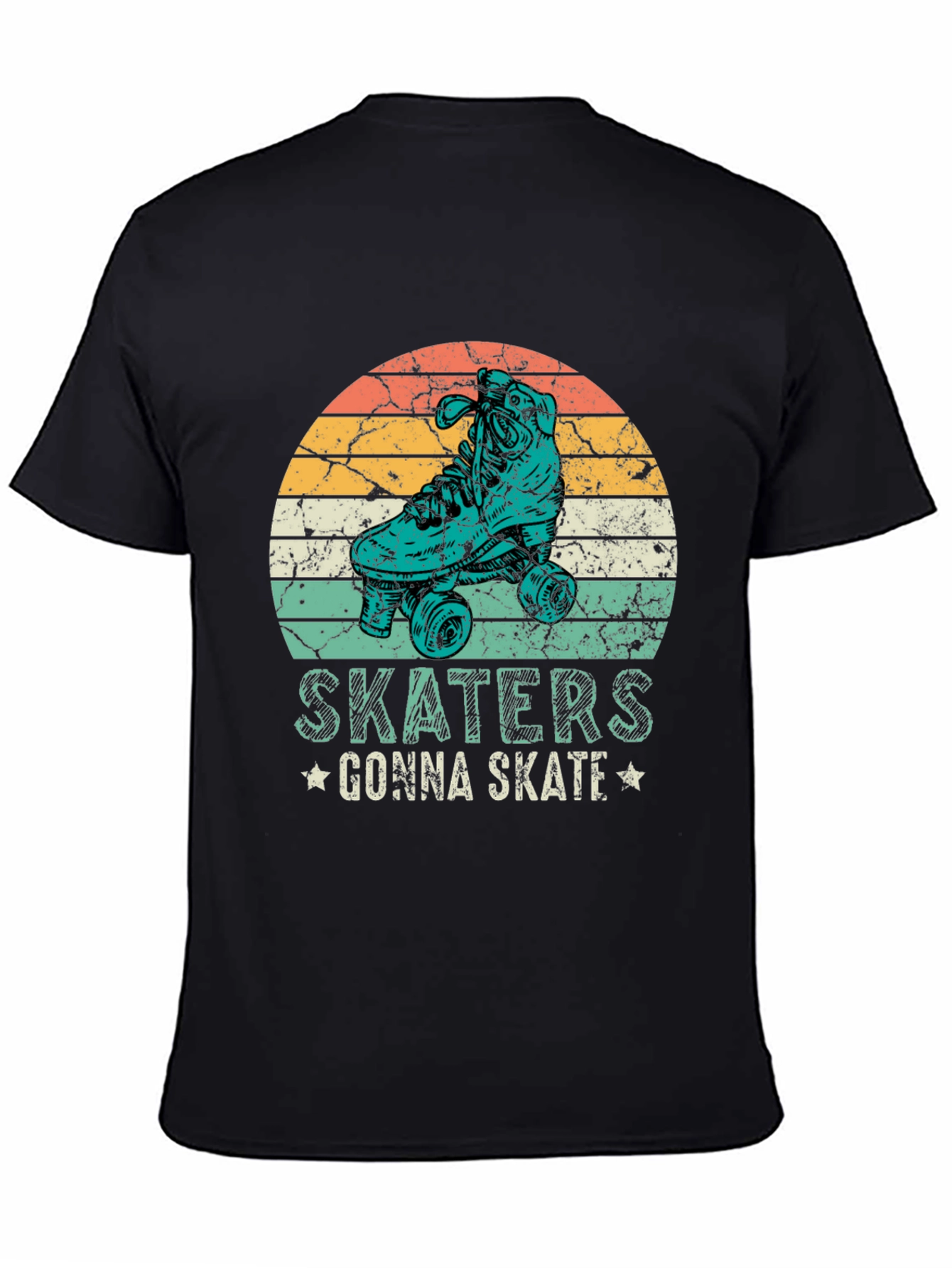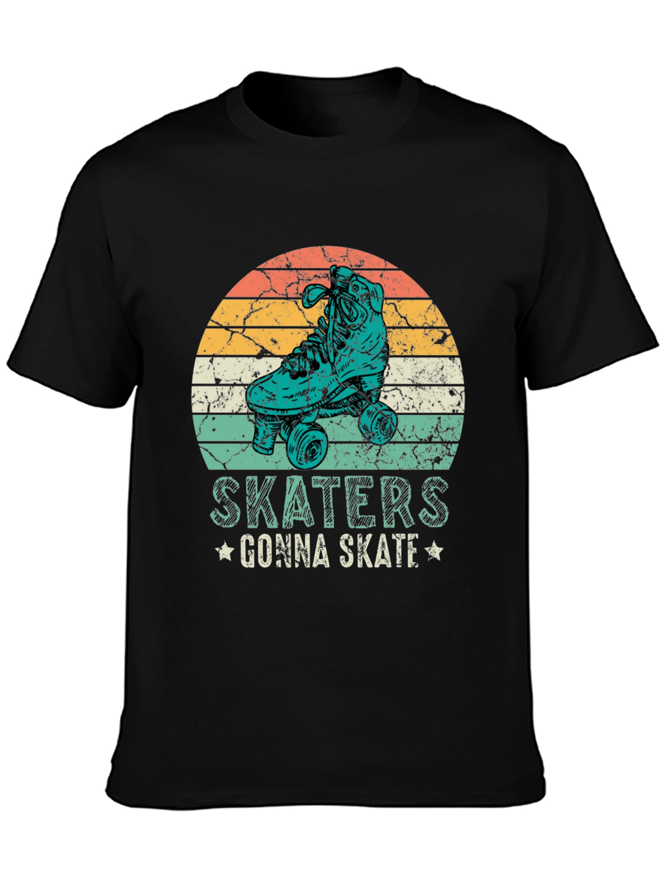 Esta camiseta negra presenta un diseño retro con un patín en un círculo con franjas de colores anaranjados, amarillos y turquesas, que evocan un estilo vintage. Debajo del diseño, se puede leer la frase "SKATERS GONNA SKATE" adornada con pequeñas estrellas. Fabricada con un tejido suave y cómodo, esta camiseta de manga corta es ideal para los amantes del patinaje y para aquellos que buscan un look casual con un toque nostálgico. Perfecta para usar en el día a día, en eventos informales o simplemente para expresar tu pasión por el skateboarding. Su diseño llamativo seguro que atraerá miradas y te hará destacar con estilo.