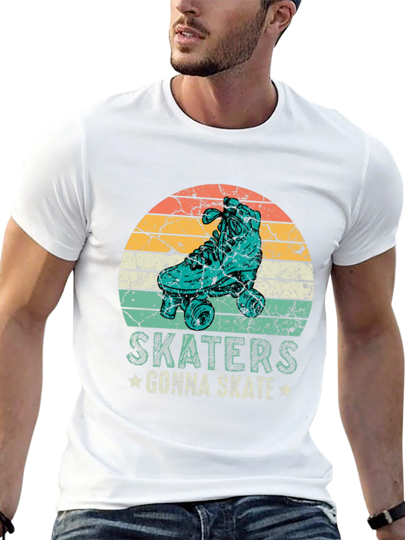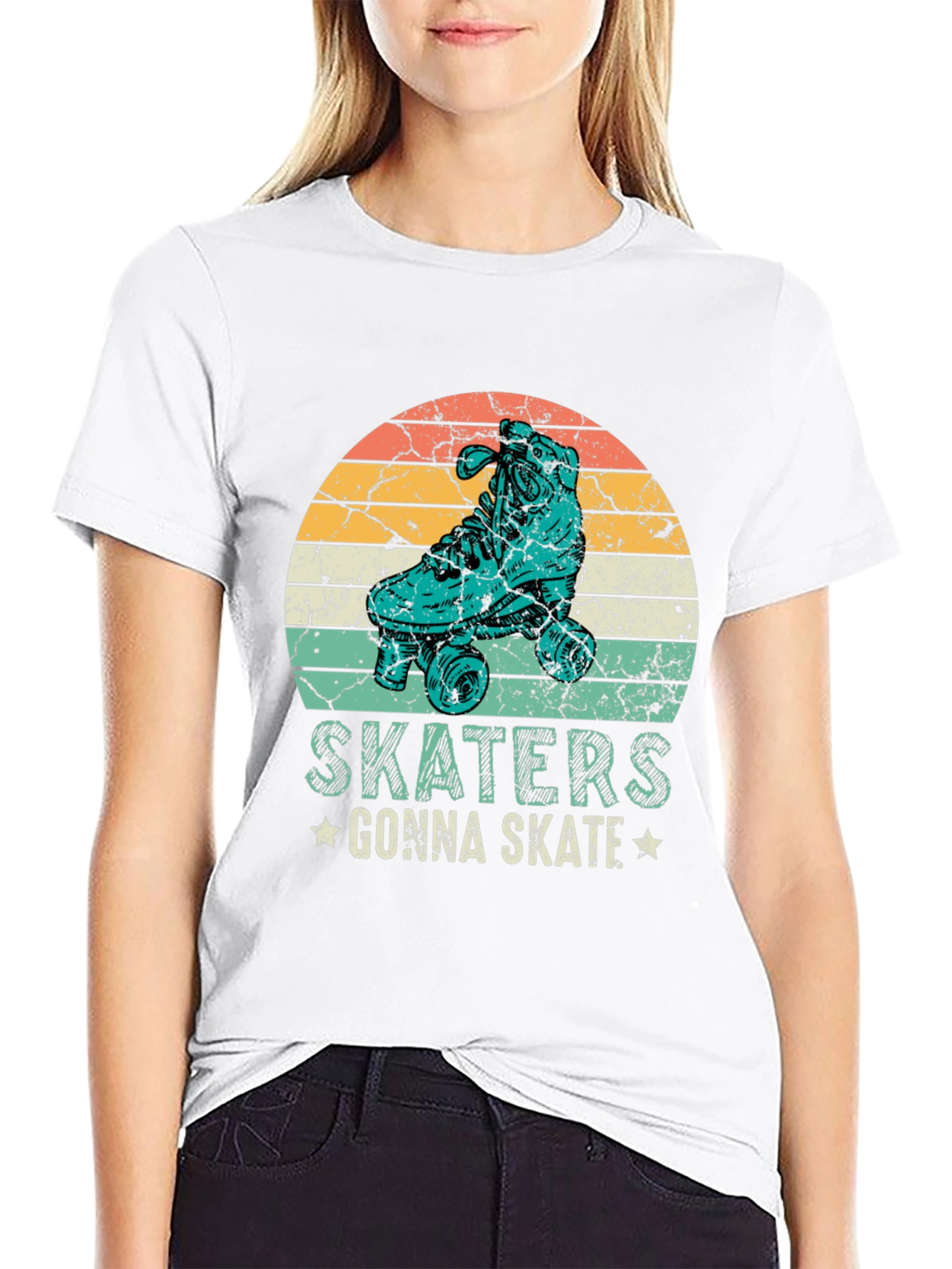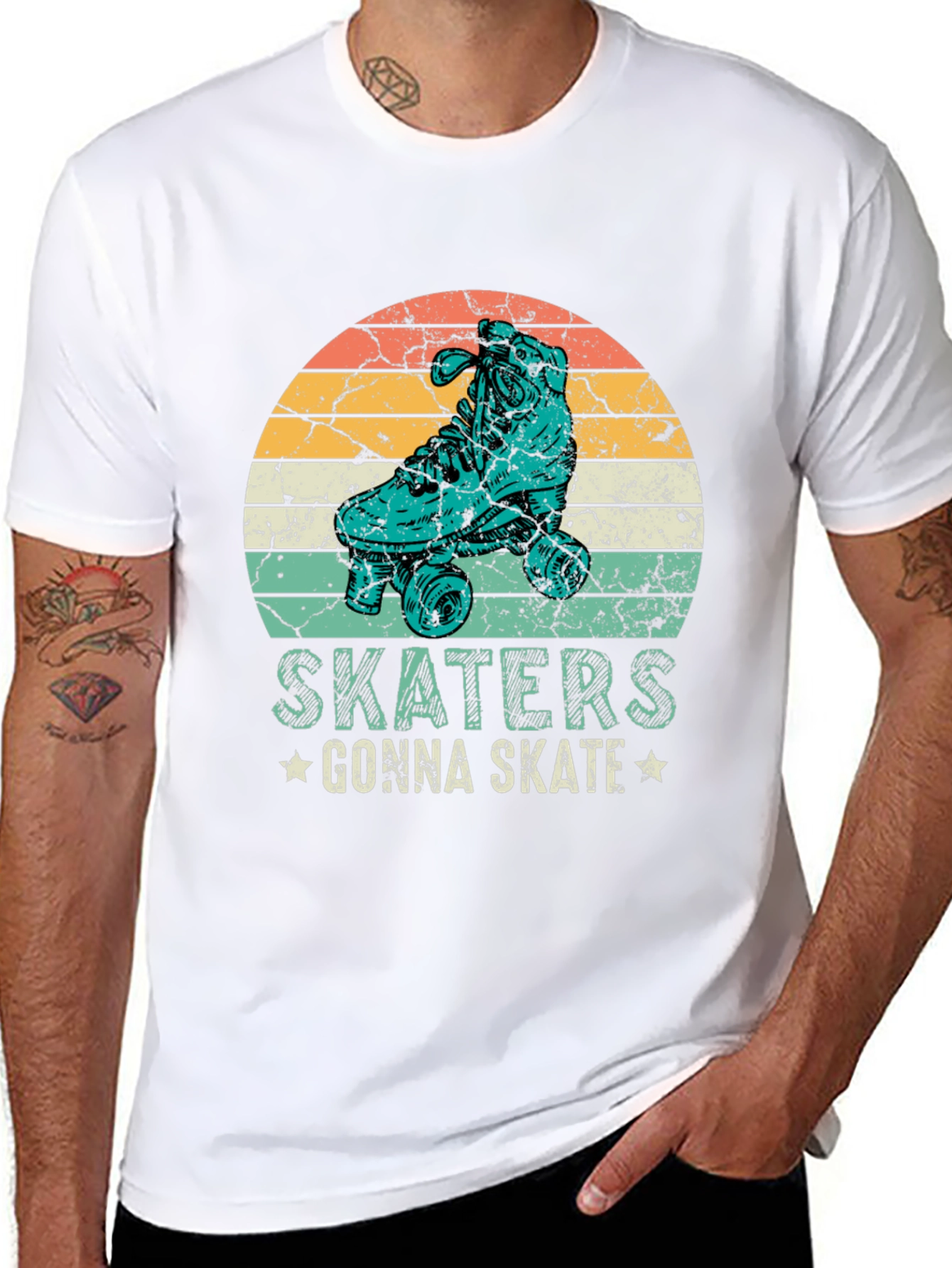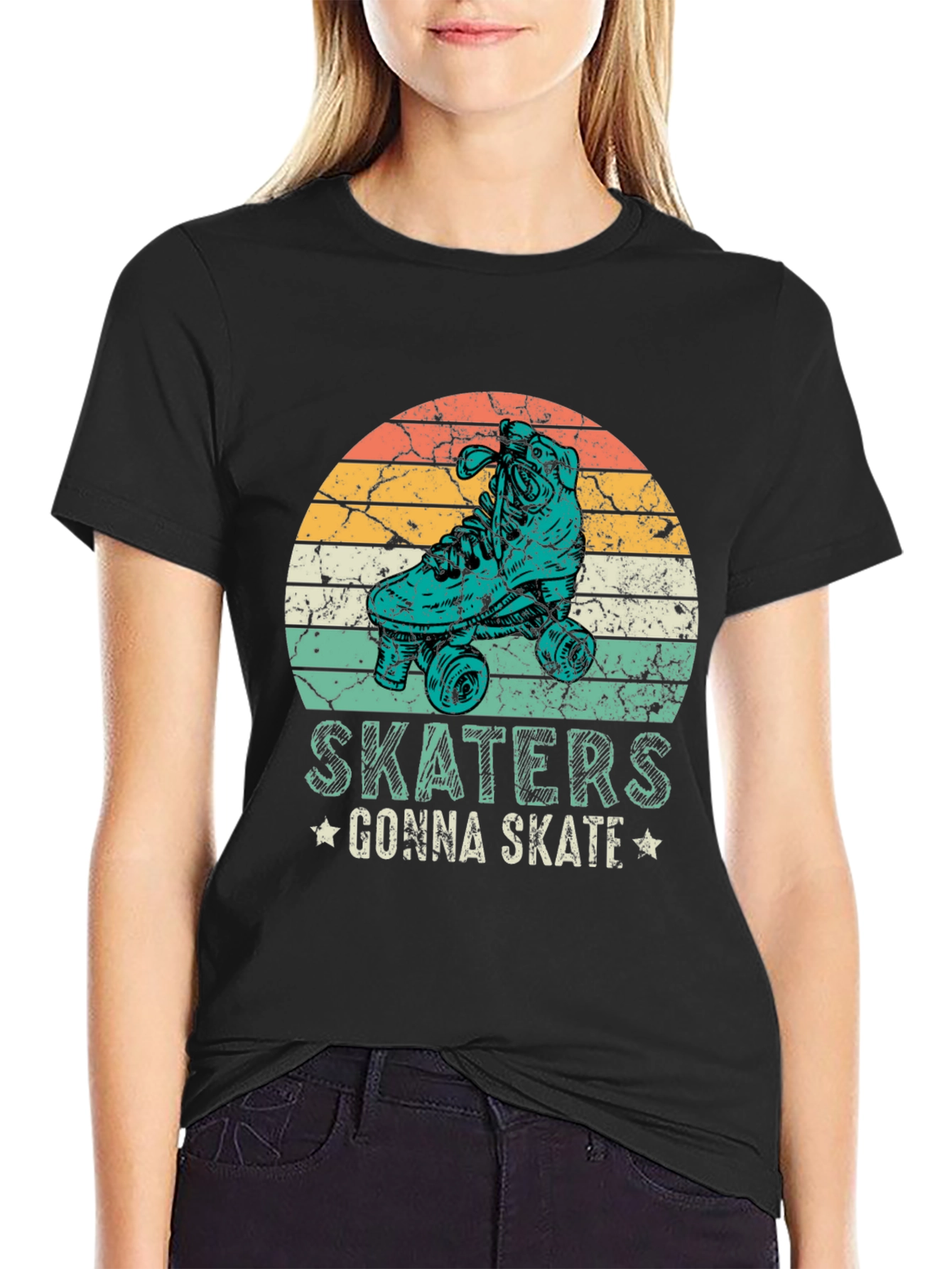 Esta camiseta negra presenta un diseño retro con un patín en un círculo con franjas de colores anaranjados, amarillos y turquesas, que evocan un estilo vintage. Debajo del diseño, se puede leer la frase "SKATERS GONNA SKATE" adornada con pequeñas estrellas. Fabricada con un tejido suave y cómodo, esta camiseta de manga corta es ideal para los amantes del patinaje y para aquellos que buscan un look casual con un toque nostálgico. Perfecta para usar en el día a día, en eventos informales o simplemente para expresar tu pasión por el skateboarding. Su diseño llamativo seguro que atraerá miradas y te hará destacar con estilo.