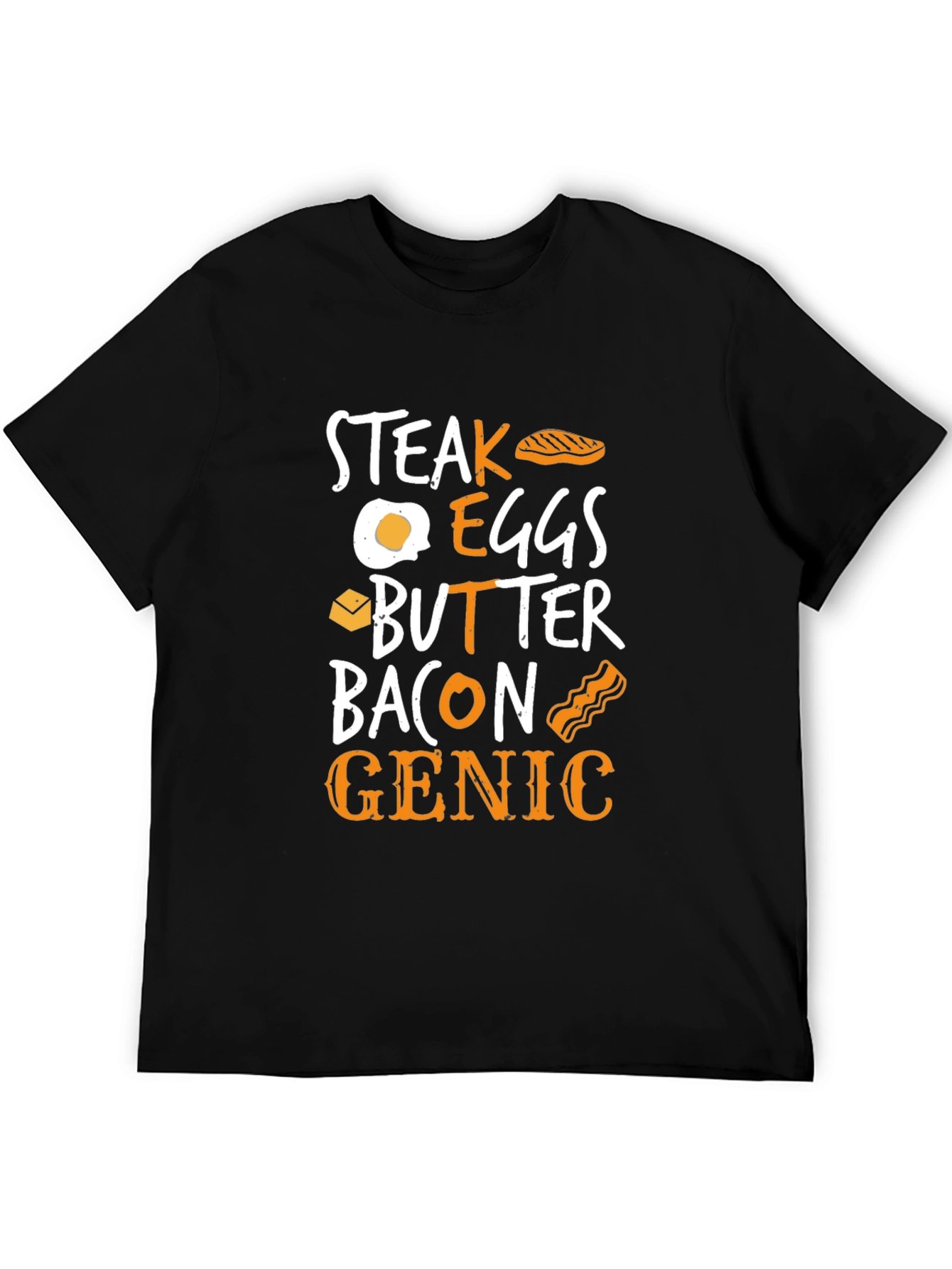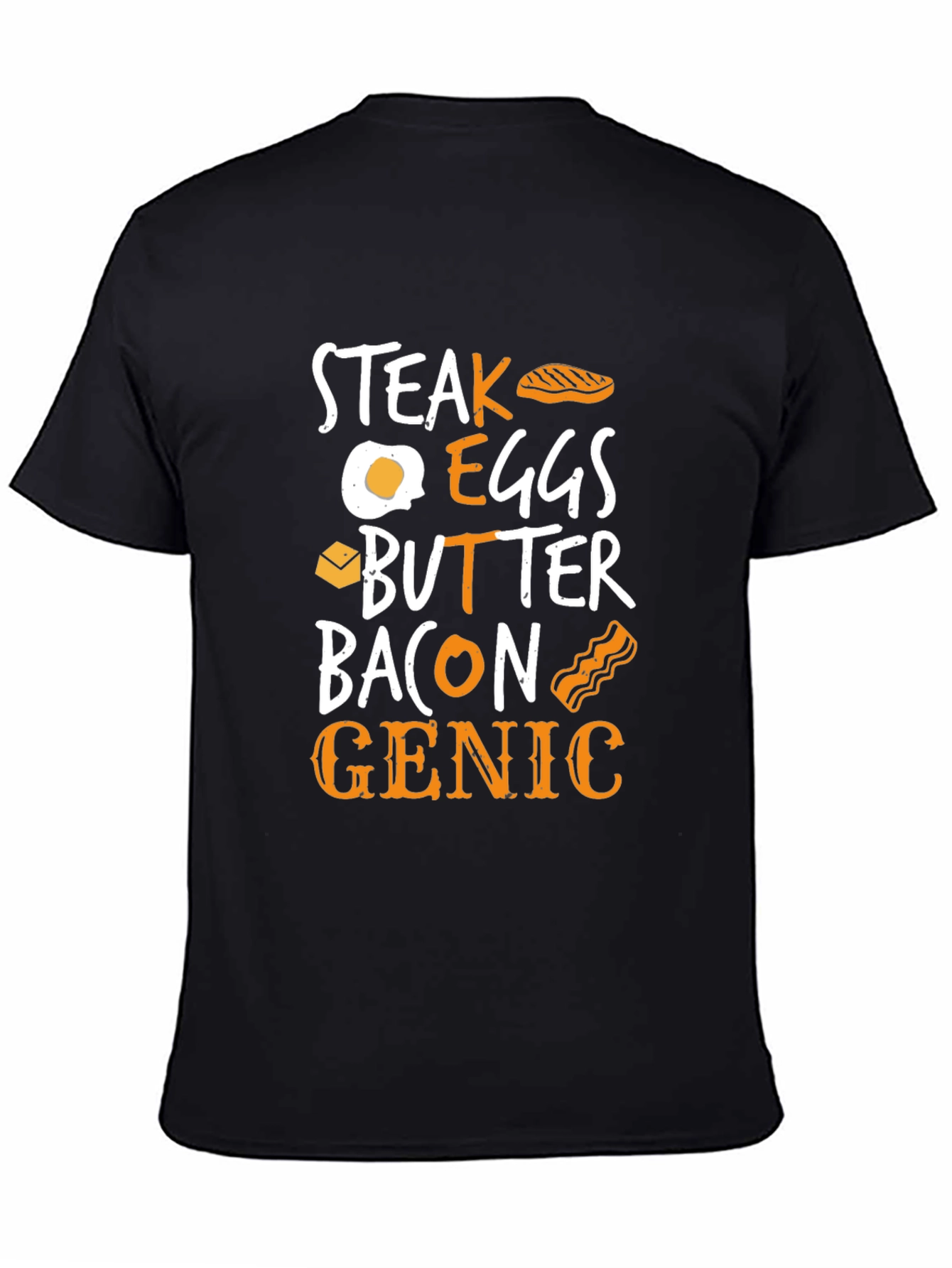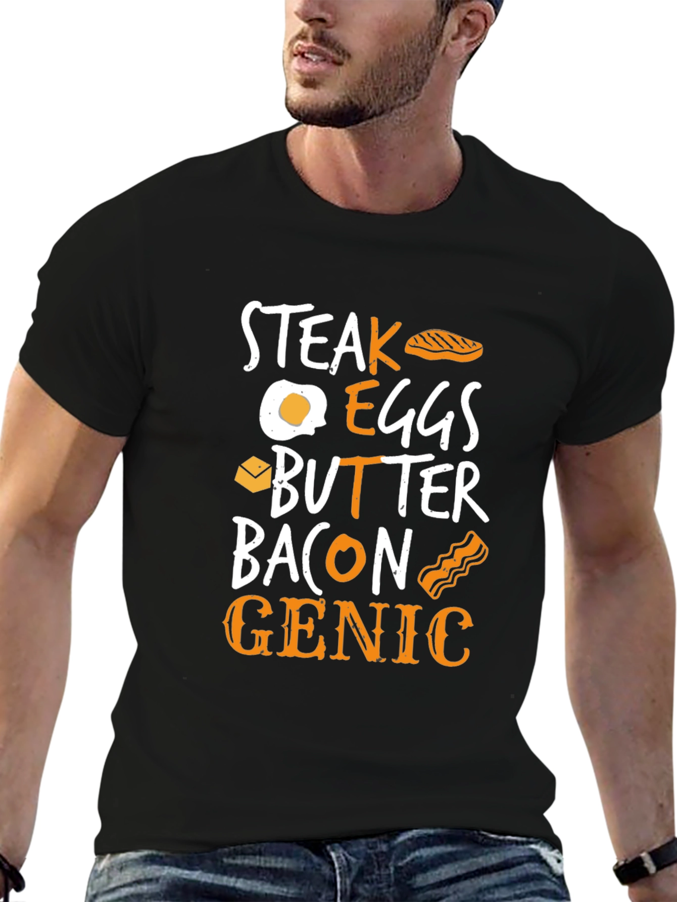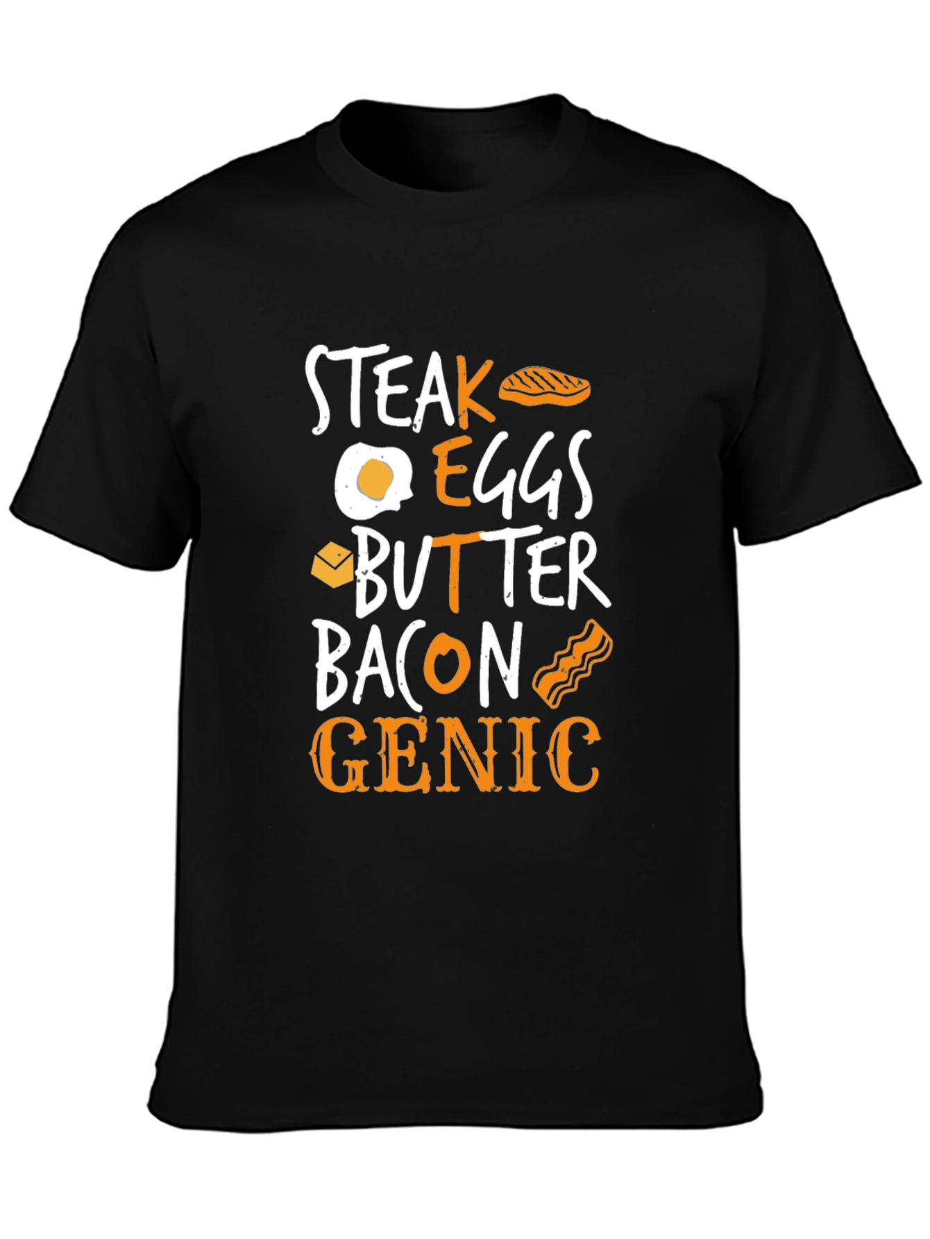 Esta camiseta negra para hombre presenta un diseño llamativo y divertido, ideal para los amantes de la buena comida. La frase "Steak Eggs Butter Bacon Genic" está impresa en letras blancas y naranjas, con ilustraciones que acompañan cada palabra: un filete, un huevo frito, un trozo de mantequilla y tocino crujiente. El diseño sugiere un estilo de vida centrado en alimentos ricos y sabrosos. Perfecta para usar en barbacoas, reuniones informales o simplemente para expresar tu pasión por la comida. Fabricada con materiales cómodos y duraderos, esta camiseta es una adición original a tu guardarropa.