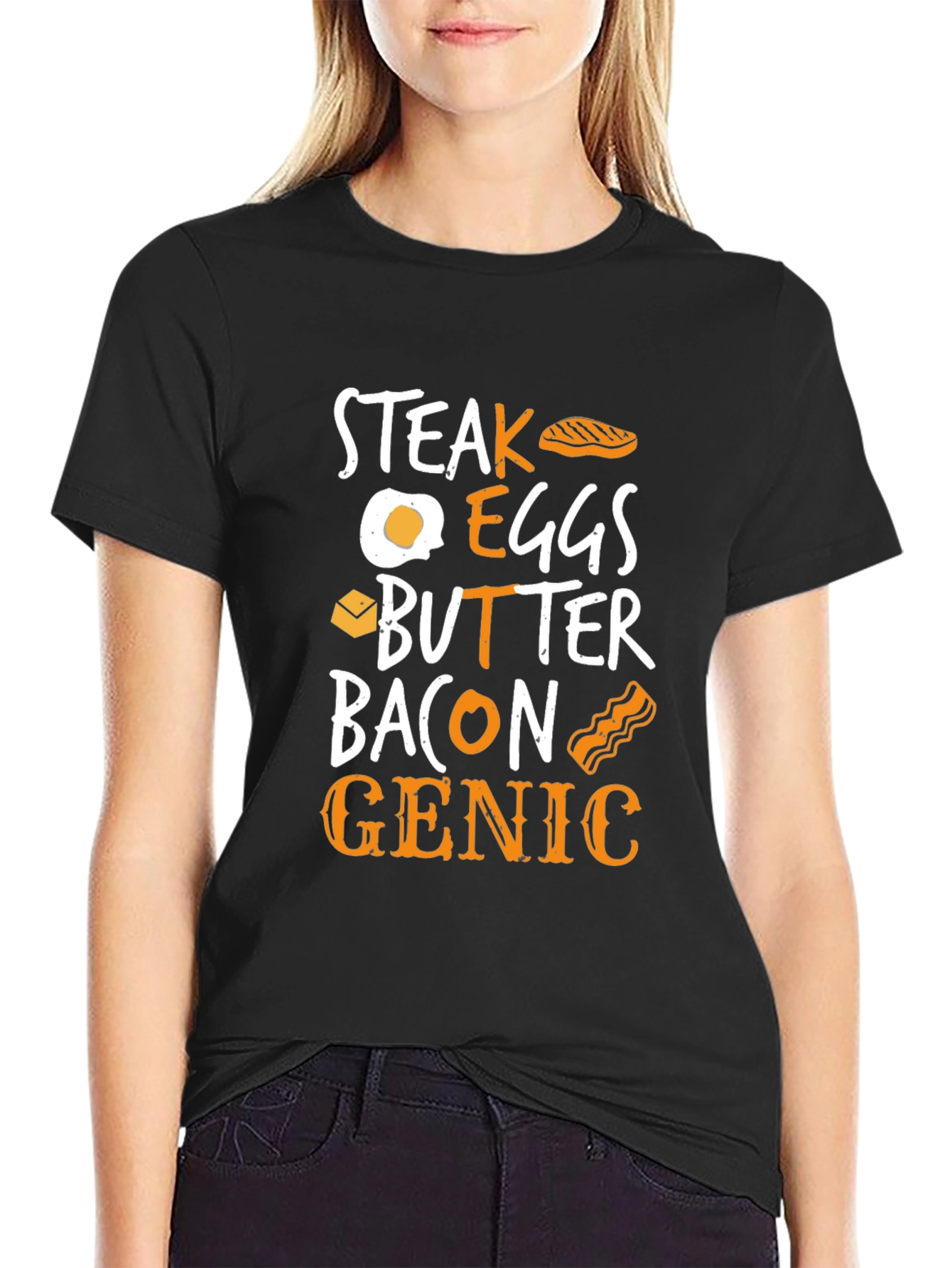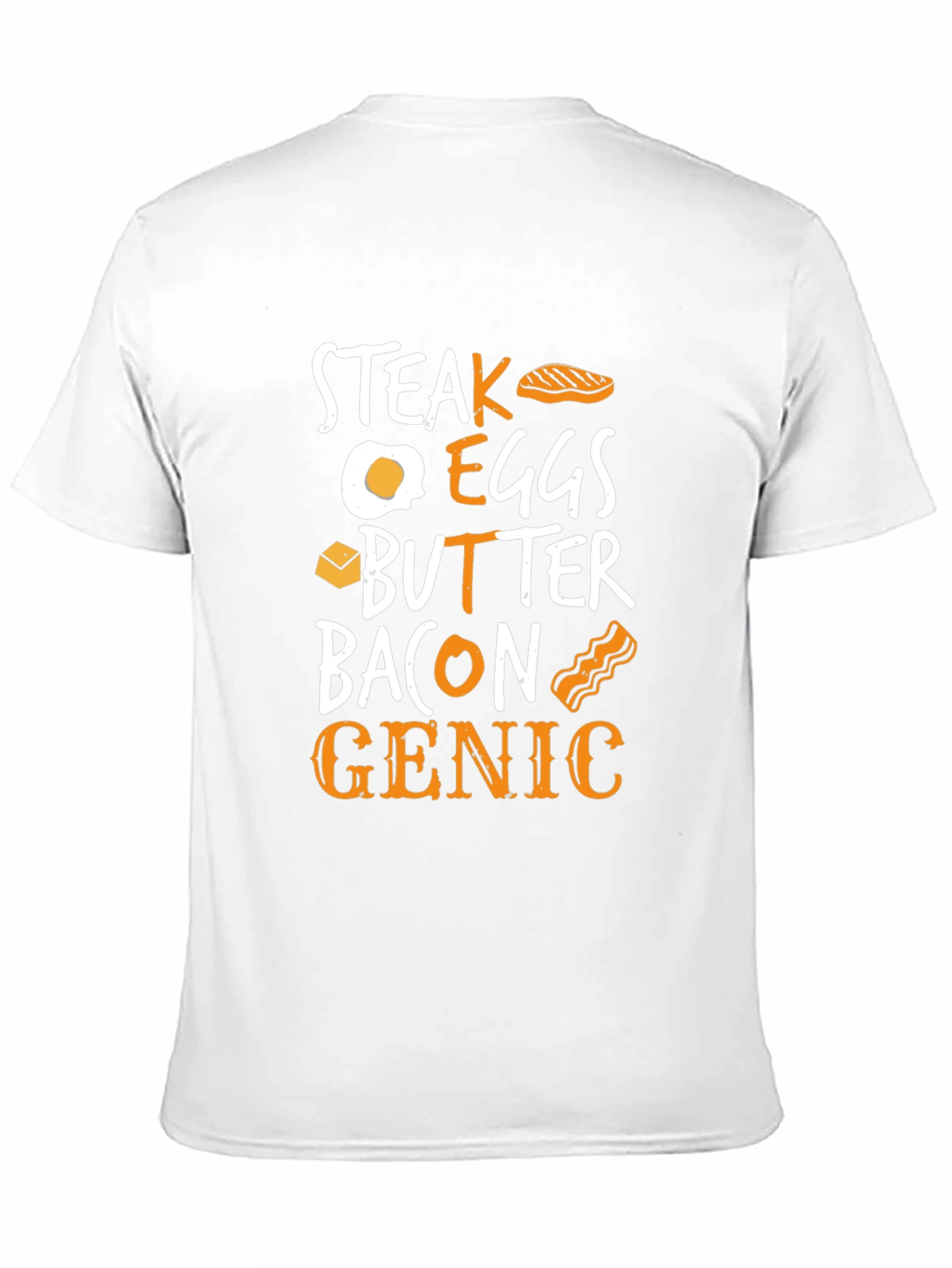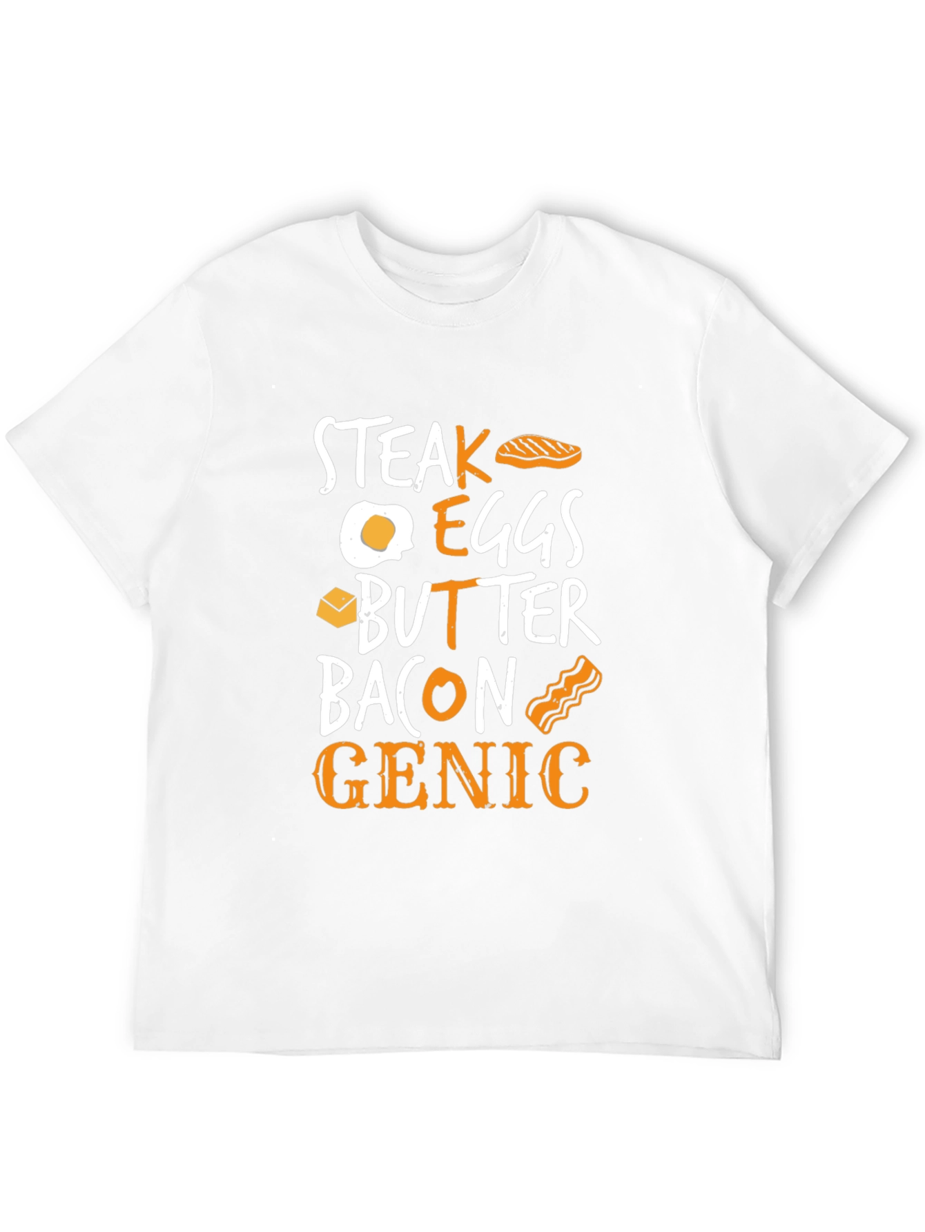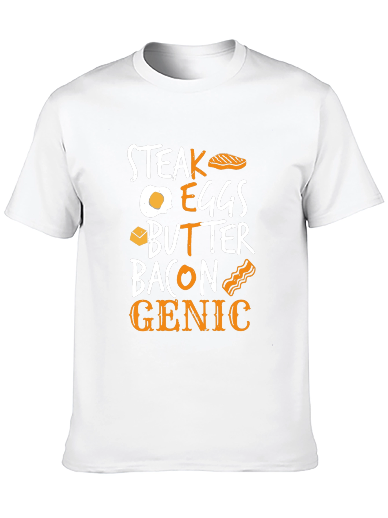 Esta camiseta negra para hombre presenta un diseño llamativo y divertido, ideal para los amantes de la buena comida. La frase "Steak Eggs Butter Bacon Genic" está impresa en letras blancas y naranjas, con ilustraciones que acompañan cada palabra: un filete, un huevo frito, un trozo de mantequilla y tocino crujiente. El diseño sugiere un estilo de vida centrado en alimentos ricos y sabrosos. Perfecta para usar en barbacoas, reuniones informales o simplemente para expresar tu pasión por la comida. Fabricada con materiales cómodos y duraderos, esta camiseta es una adición original a tu guardarropa.