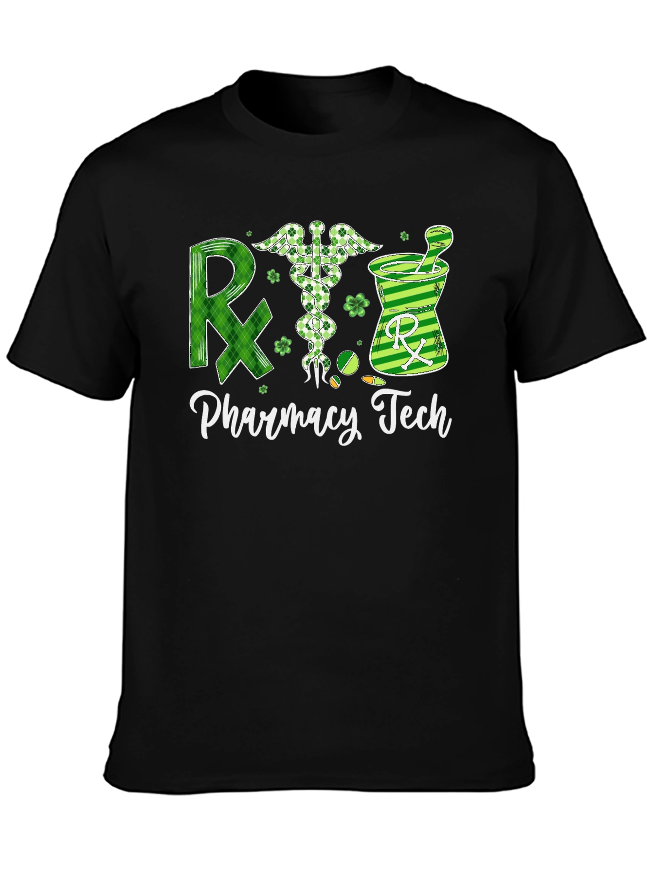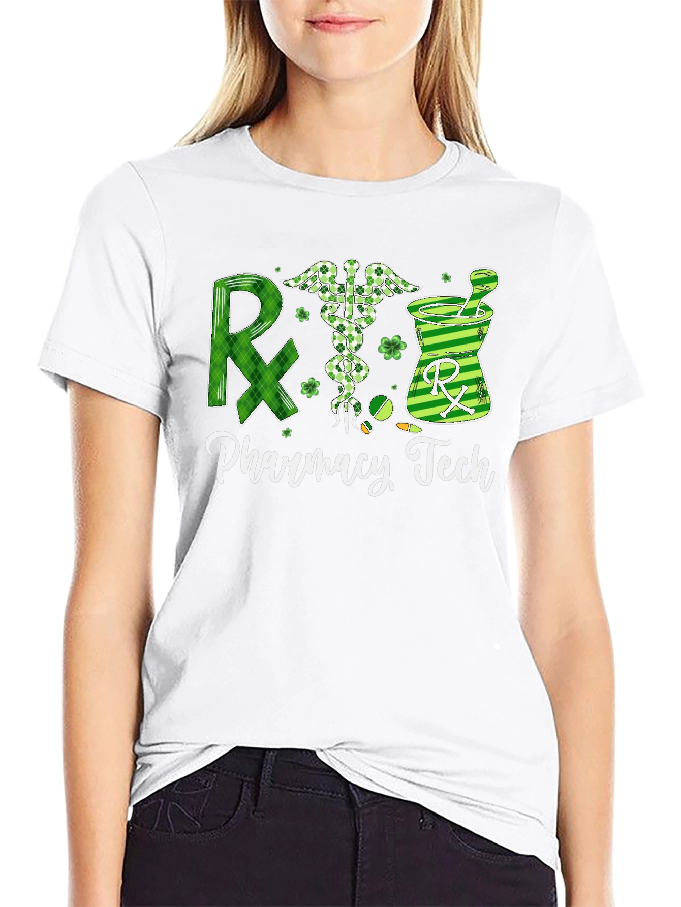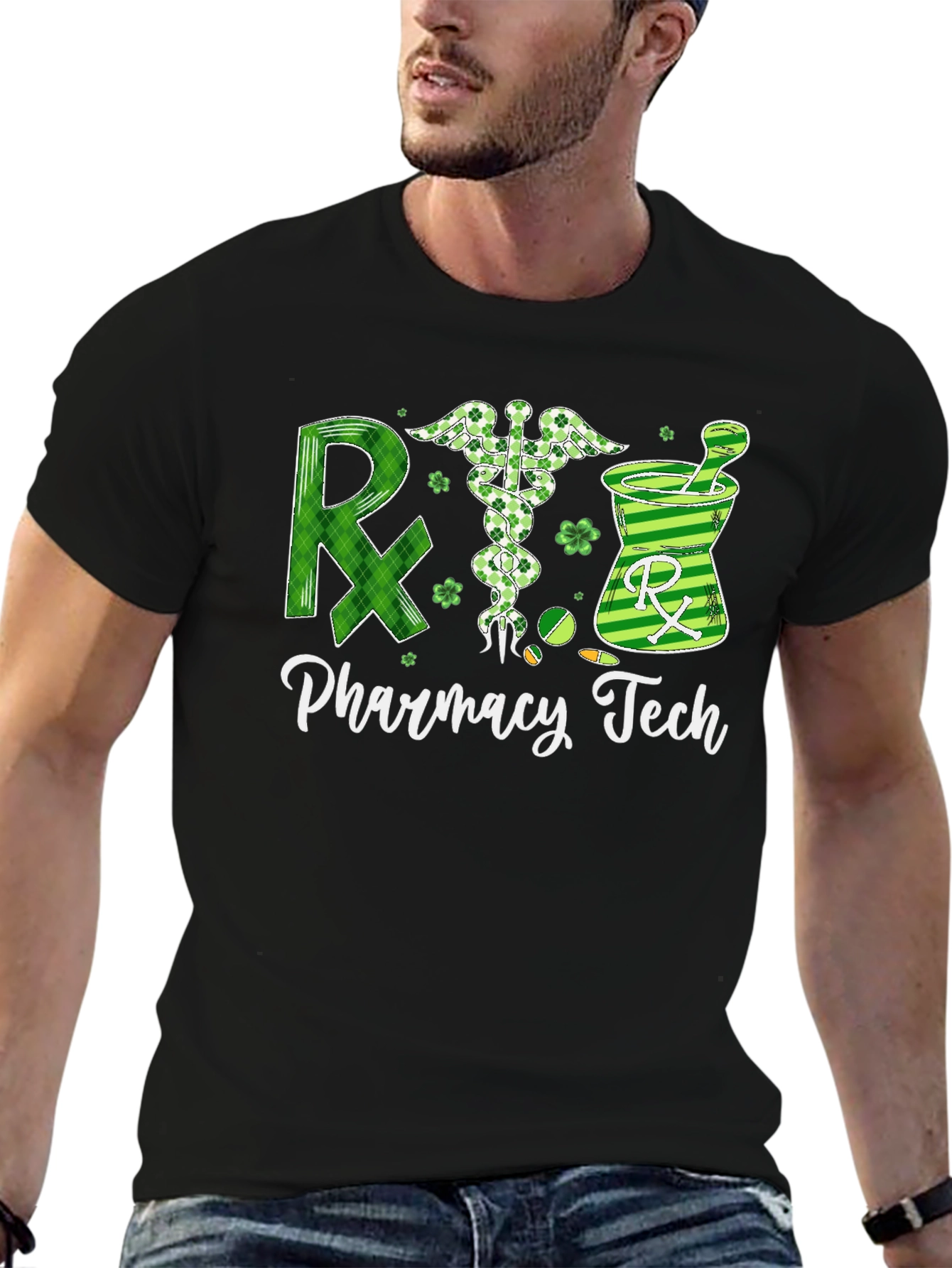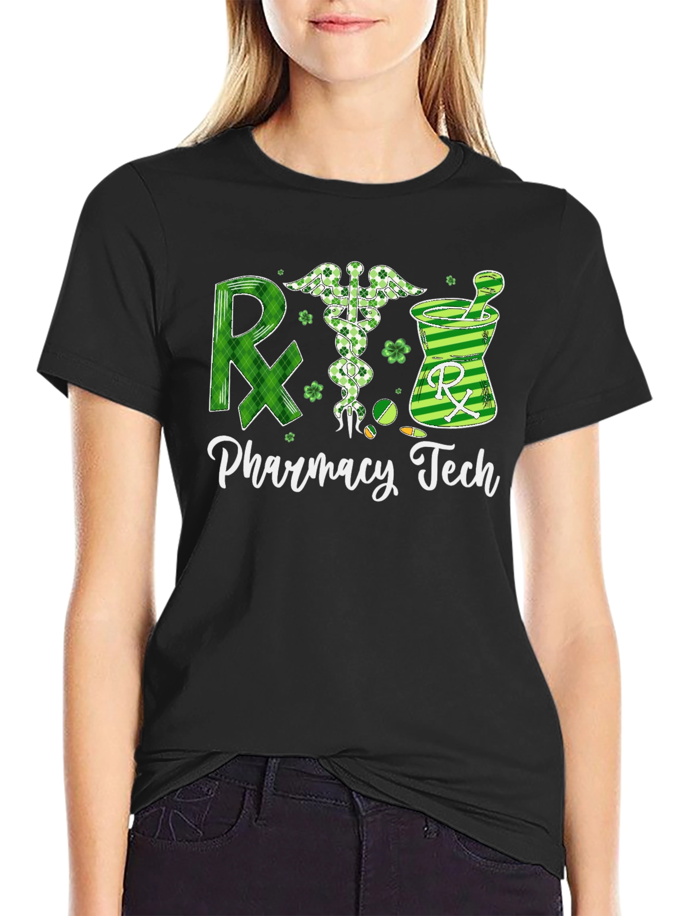 Luce esta original camiseta negra con un divertido diseño temático de farmacia con toques de tréboles. Ideal para técnicos de farmacia y amantes de la suerte. El estampado presenta el símbolo de la receta médica "Rx", el caduceo y un mortero, todos decorados con motivos de tréboles verdes y blancos, perfecto para celebrar San Patricio. Fabricada en un tejido suave y cómodo, esta camiseta es ideal para el uso diario o para lucir tu profesión con orgullo. Un regalo perfecto para compañeros de trabajo o para ti mismo. ¡Muestra tu pasión por la farmacia con estilo!