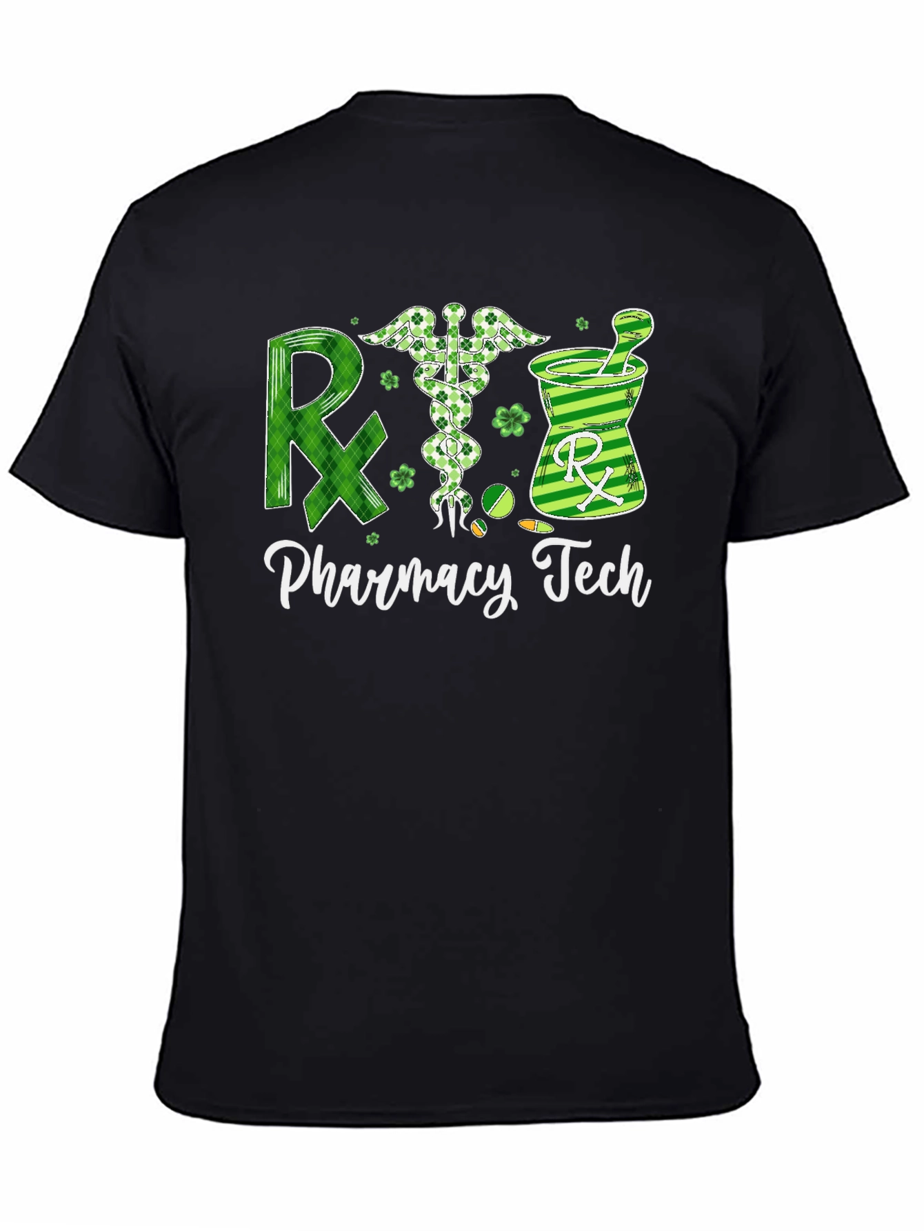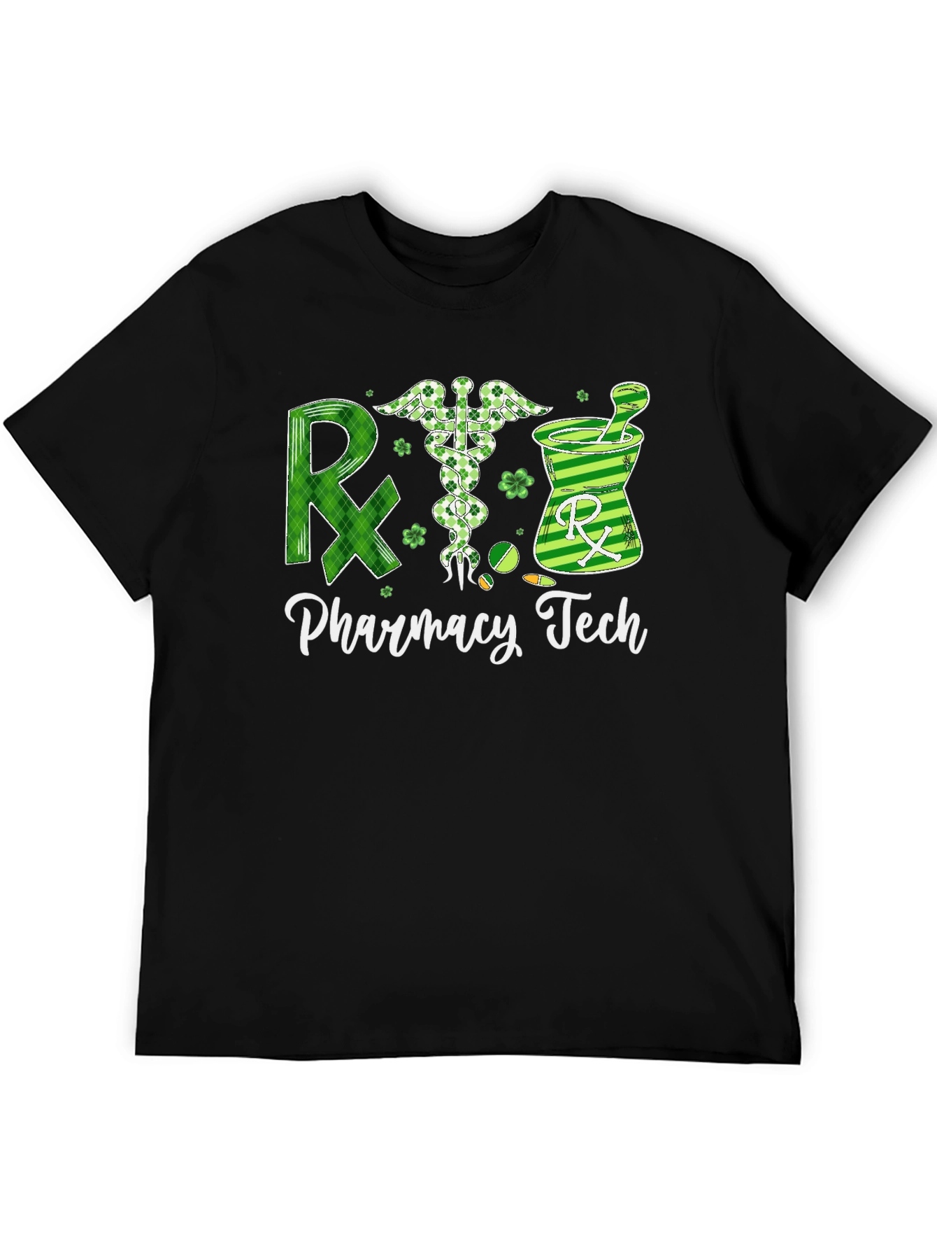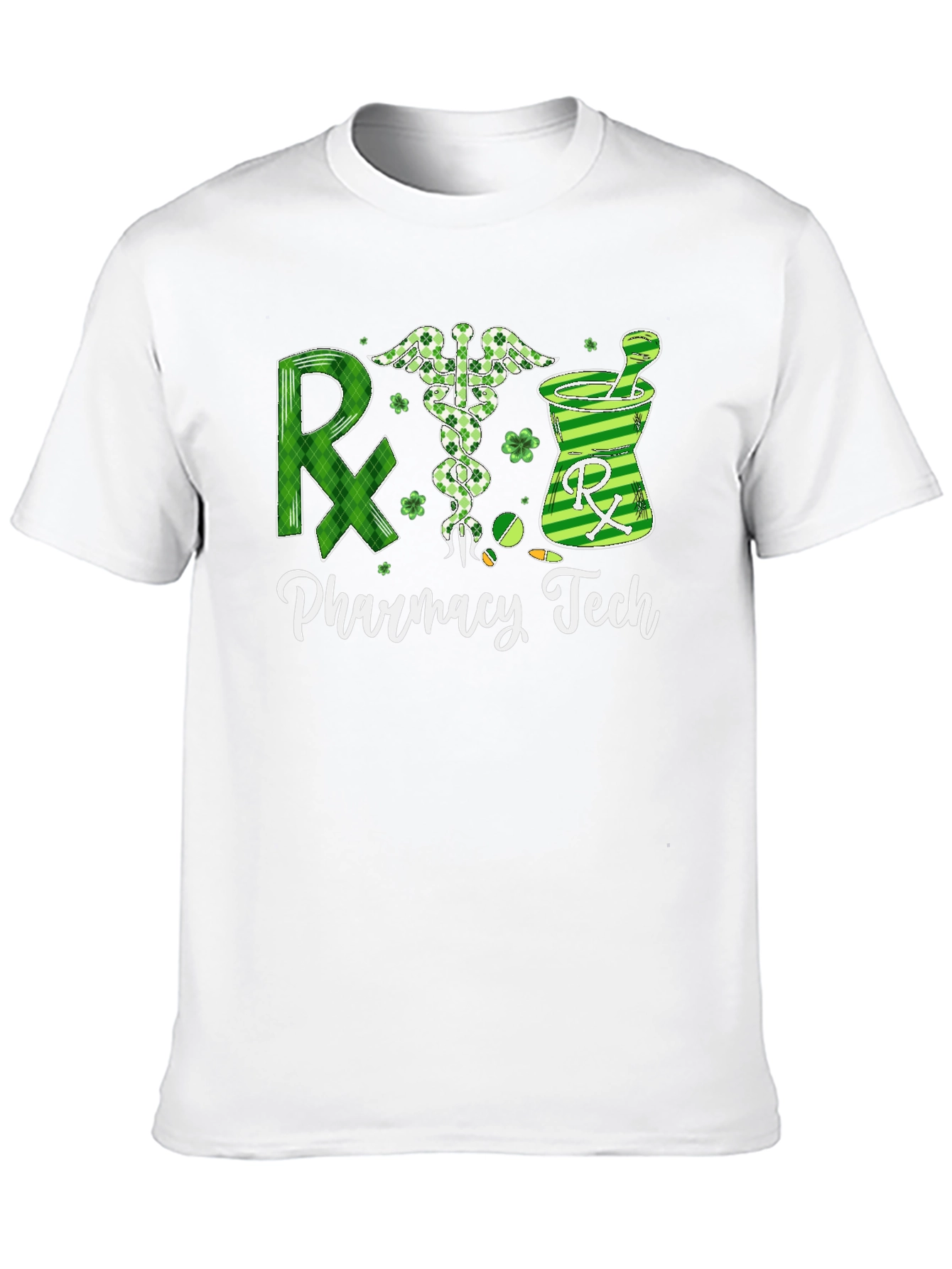 Luce esta original camiseta negra con un divertido diseño temático de farmacia con toques de tréboles. Ideal para técnicos de farmacia y amantes de la suerte. El estampado presenta el símbolo de la receta médica "Rx", el caduceo y un mortero, todos decorados con motivos de tréboles verdes y blancos, perfecto para celebrar San Patricio. Fabricada en un tejido suave y cómodo, esta camiseta es ideal para el uso diario o para lucir tu profesión con orgullo. Un regalo perfecto para compañeros de trabajo o para ti mismo. ¡Muestra tu pasión por la farmacia con estilo!