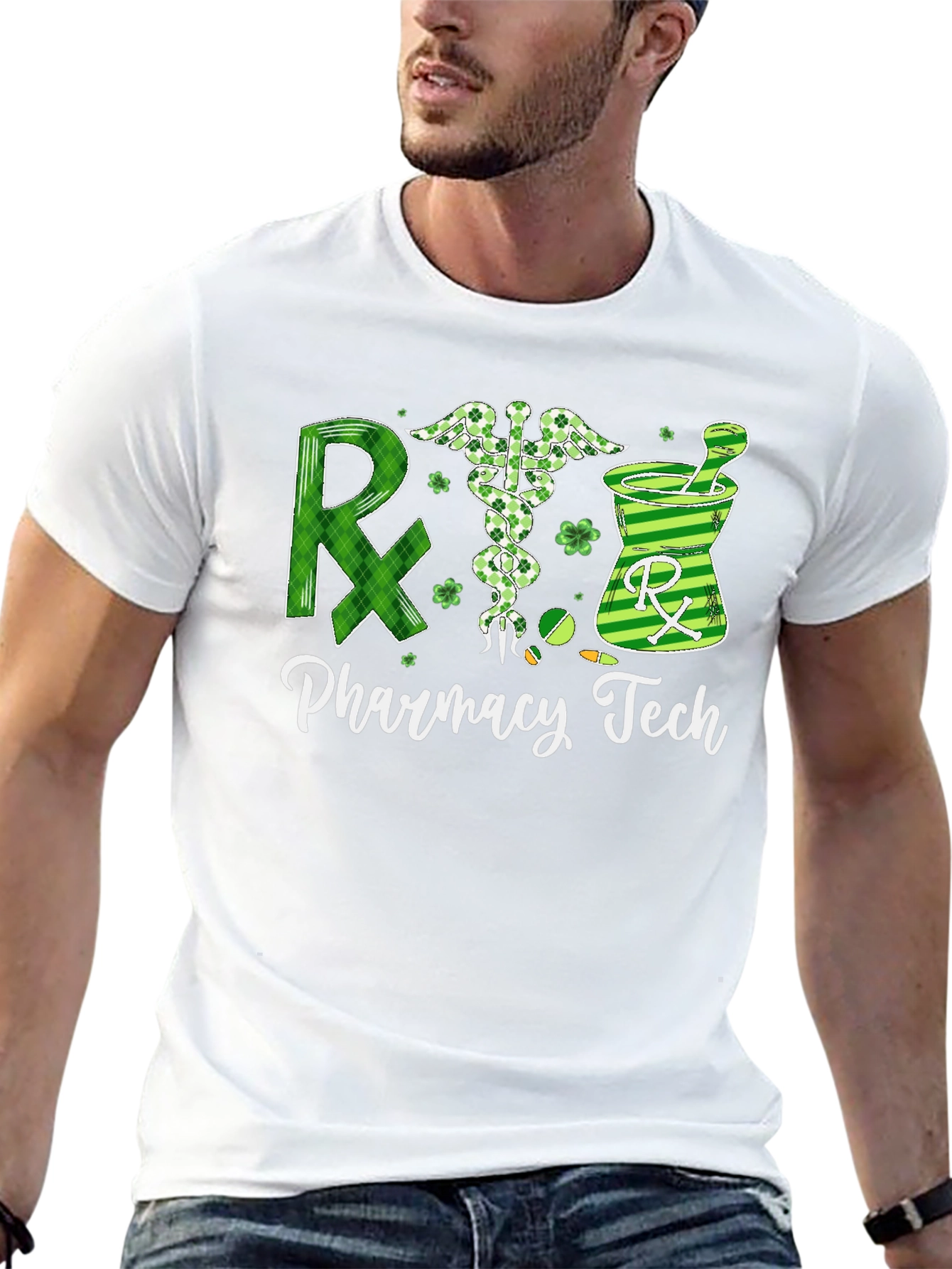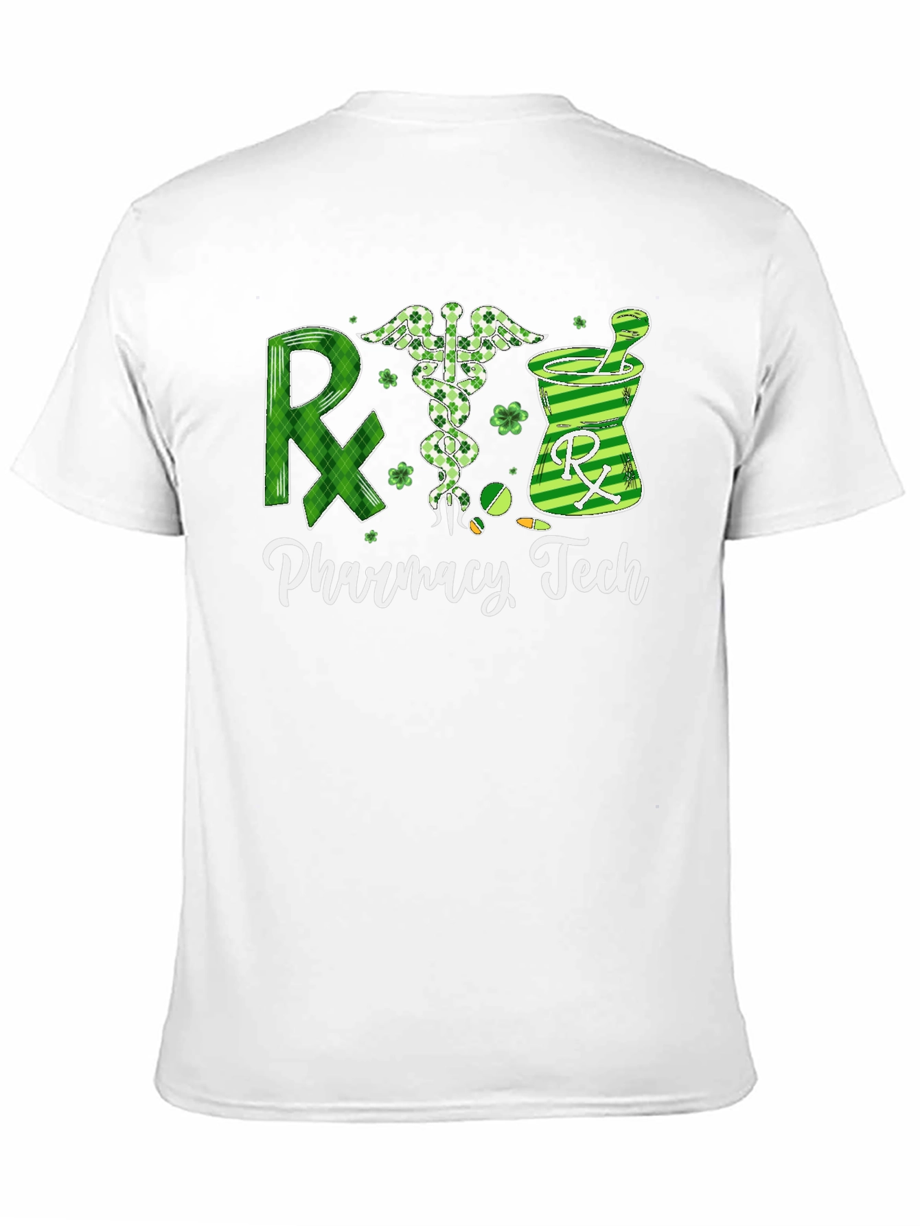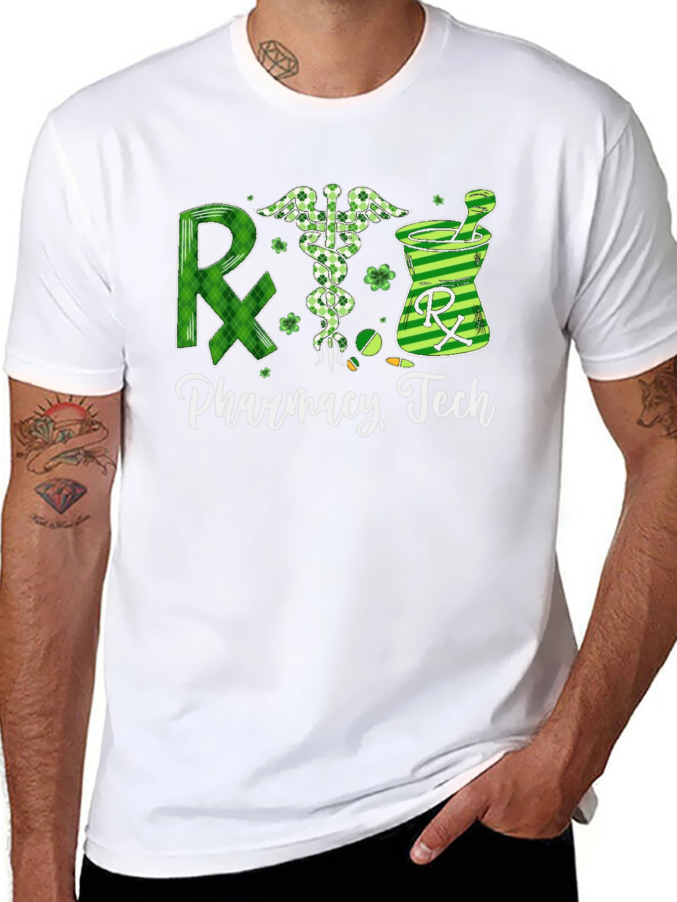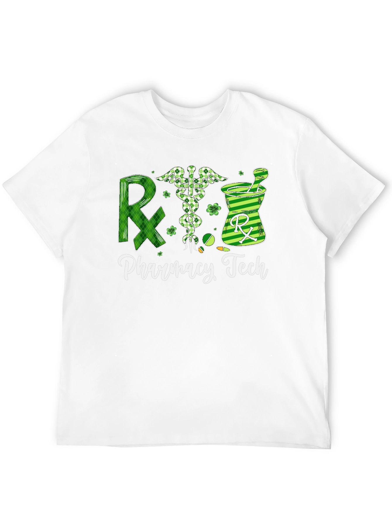 Luce esta original camiseta negra con un divertido diseño temático de farmacia con toques de tréboles. Ideal para técnicos de farmacia y amantes de la suerte. El estampado presenta el símbolo de la receta médica "Rx", el caduceo y un mortero, todos decorados con motivos de tréboles verdes y blancos, perfecto para celebrar San Patricio. Fabricada en un tejido suave y cómodo, esta camiseta es ideal para el uso diario o para lucir tu profesión con orgullo. Un regalo perfecto para compañeros de trabajo o para ti mismo. ¡Muestra tu pasión por la farmacia con estilo!