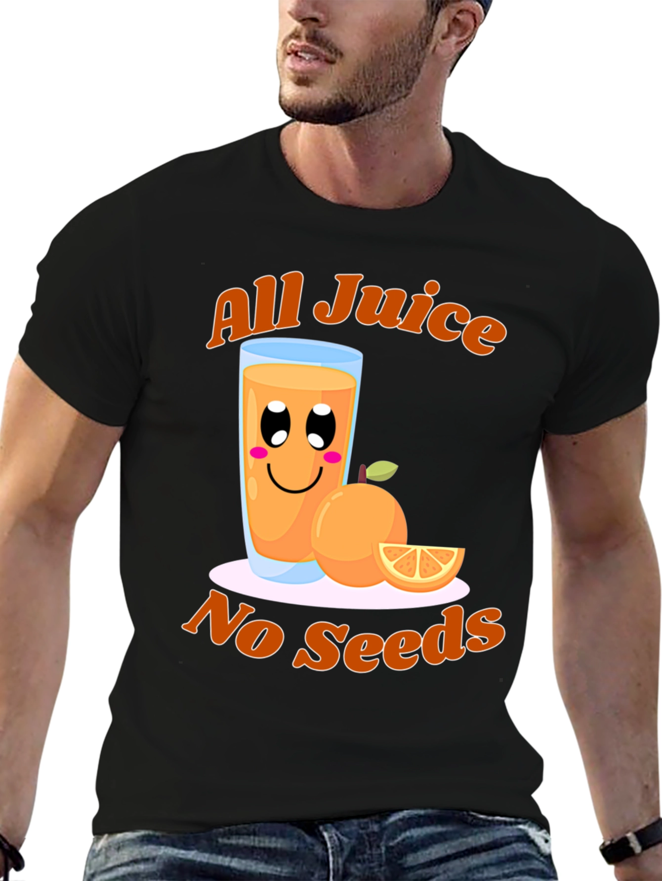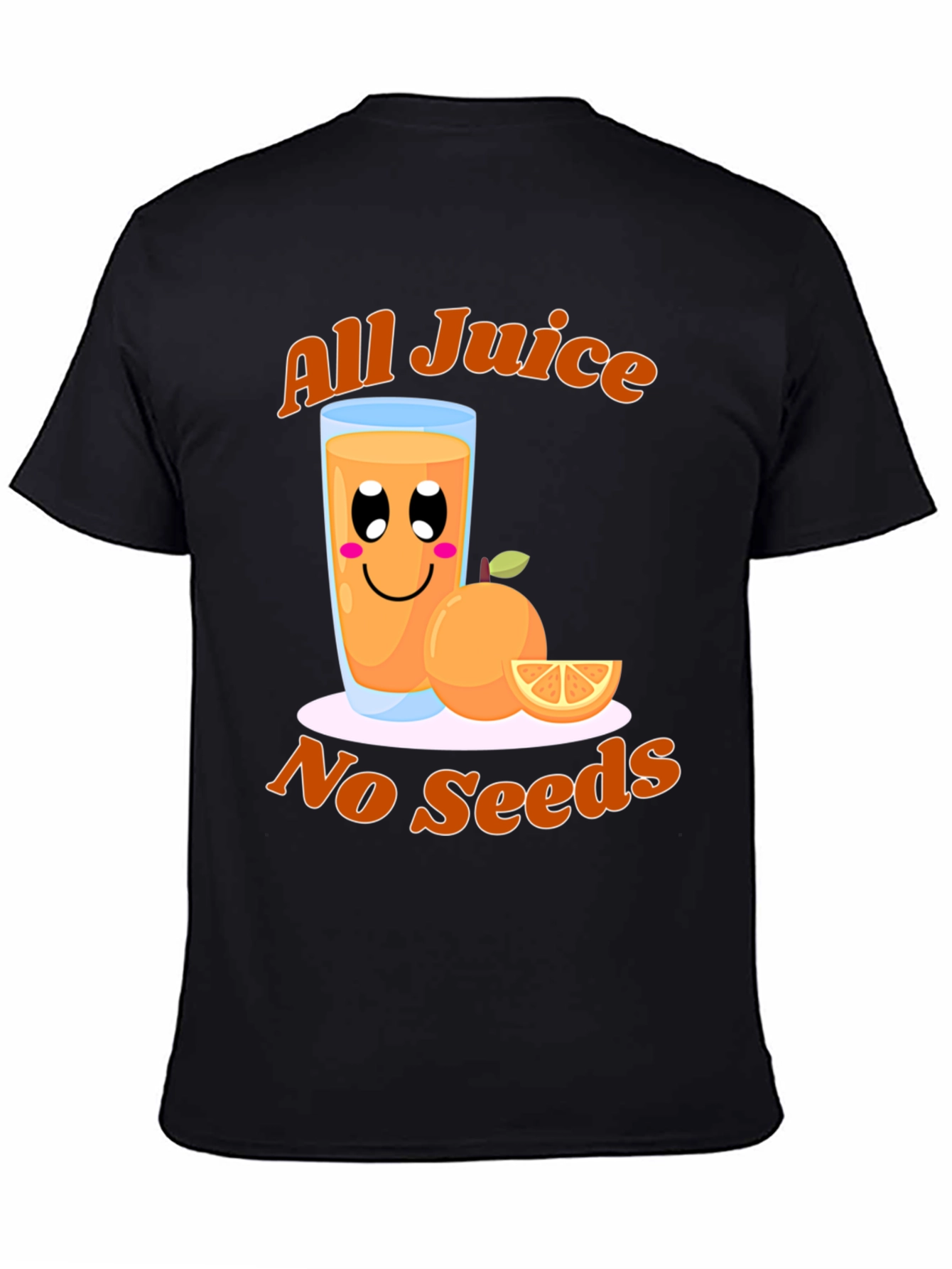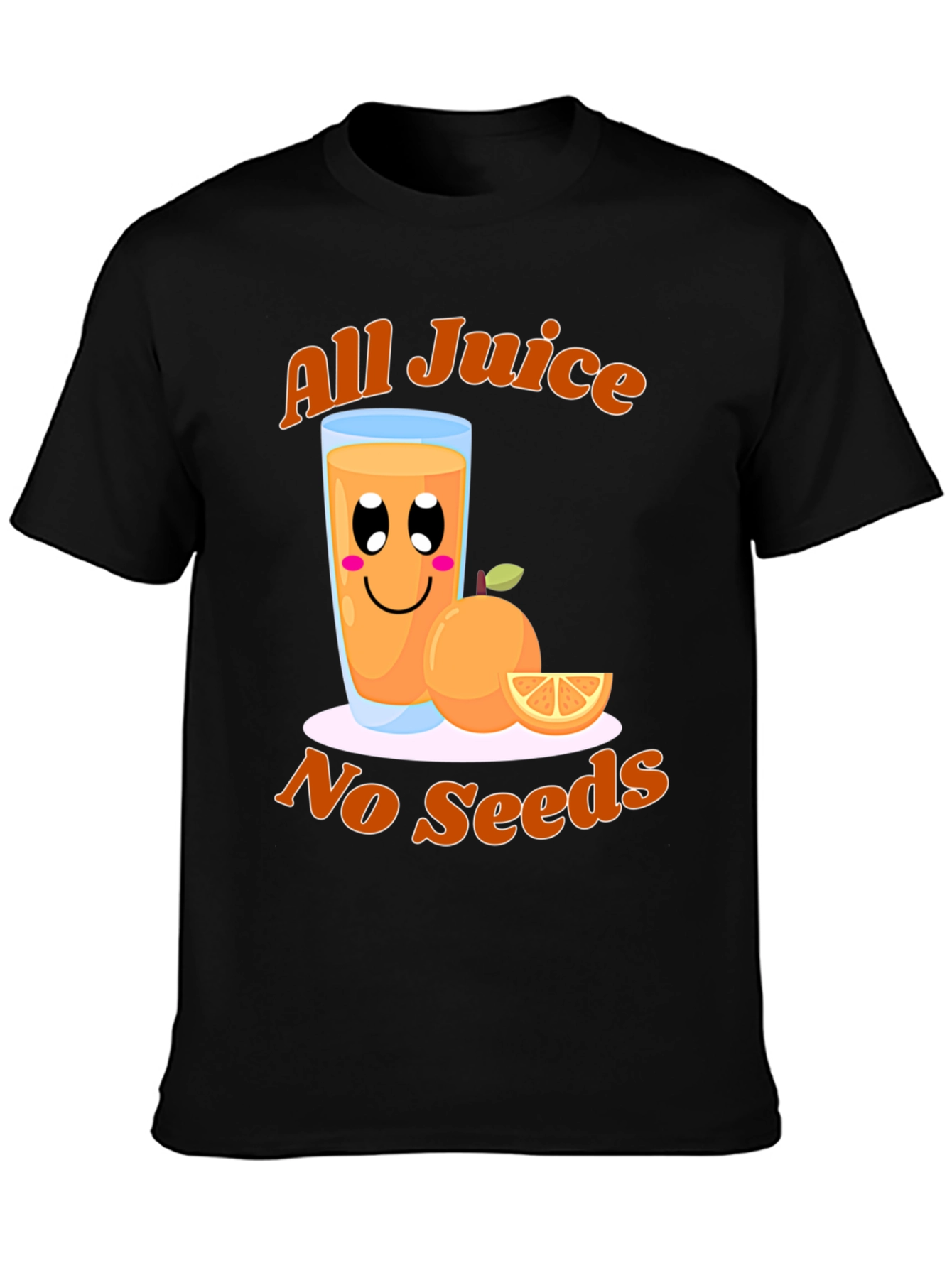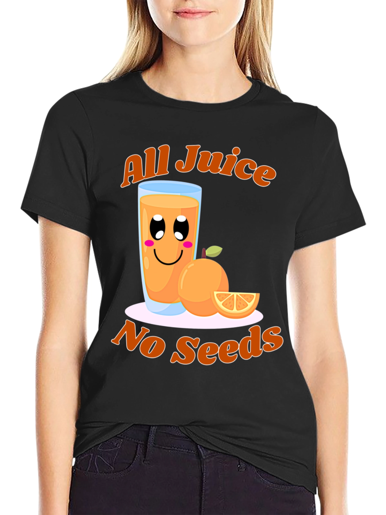 Esta camiseta negra presenta un diseño divertido y llamativo, perfecto para los amantes del jugo de naranja. Muestra una ilustración de un vaso de jugo de naranja sonriente junto a una naranja entera y una rodaja, con el texto "All Juice No Seeds" (Todo Jugo, Sin Semillas) en letras curvas de color naranja. La camiseta parece estar hecha de un material suave y cómodo, ideal para el uso diario. Su diseño único la convierte en una excelente opción para expresar tu personalidad y sentido del humor. Ideal para usar en un día casual, en el gimnasio o como un regalo original para un amigo o familiar. ¡Lleva tu pasión por el jugo de naranja con estilo!