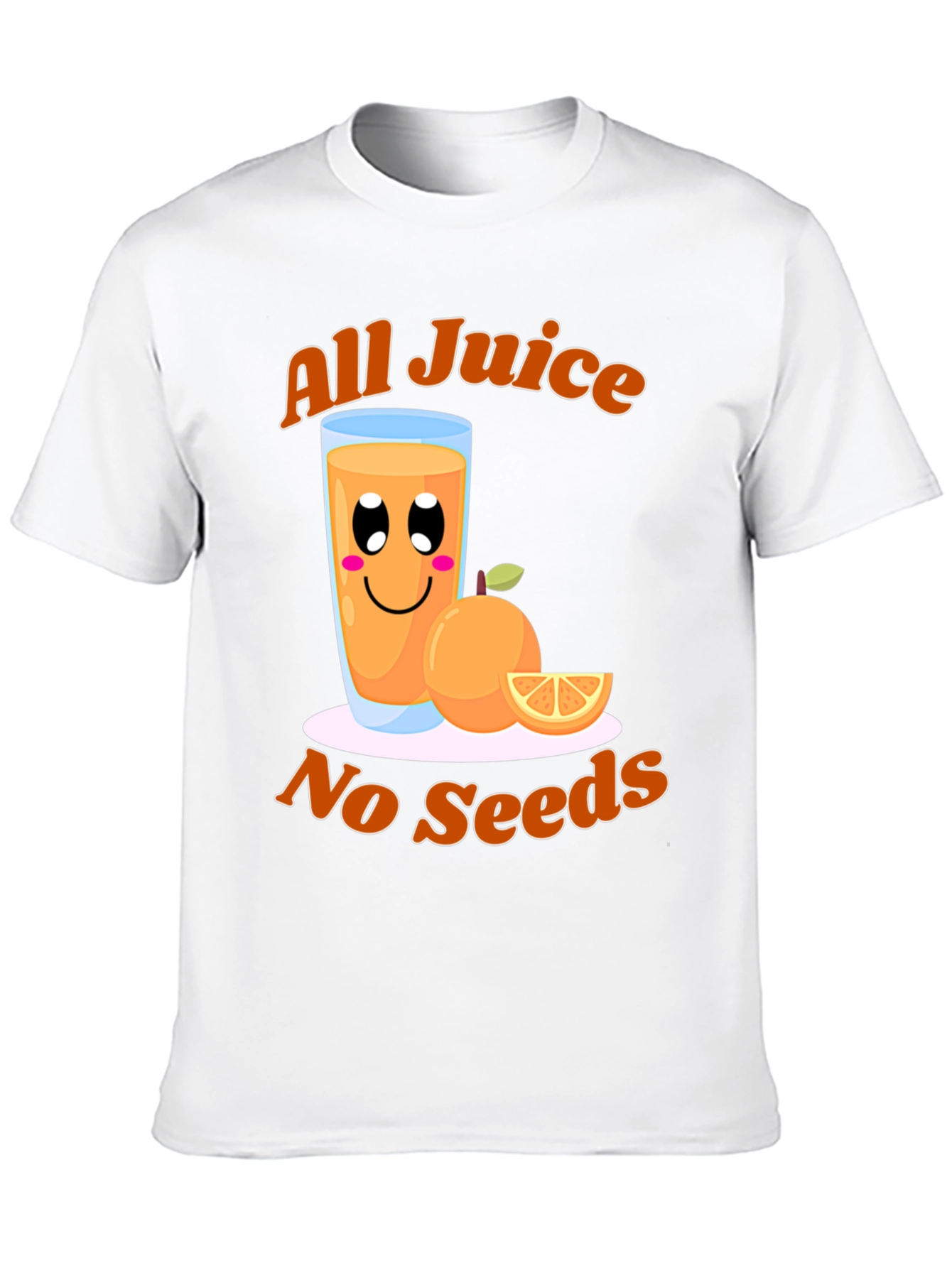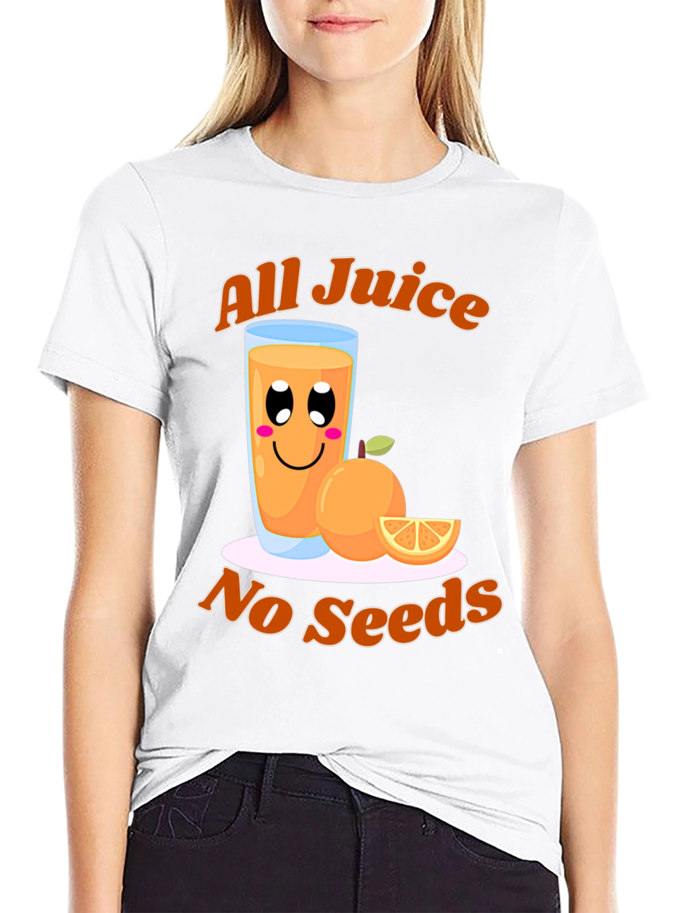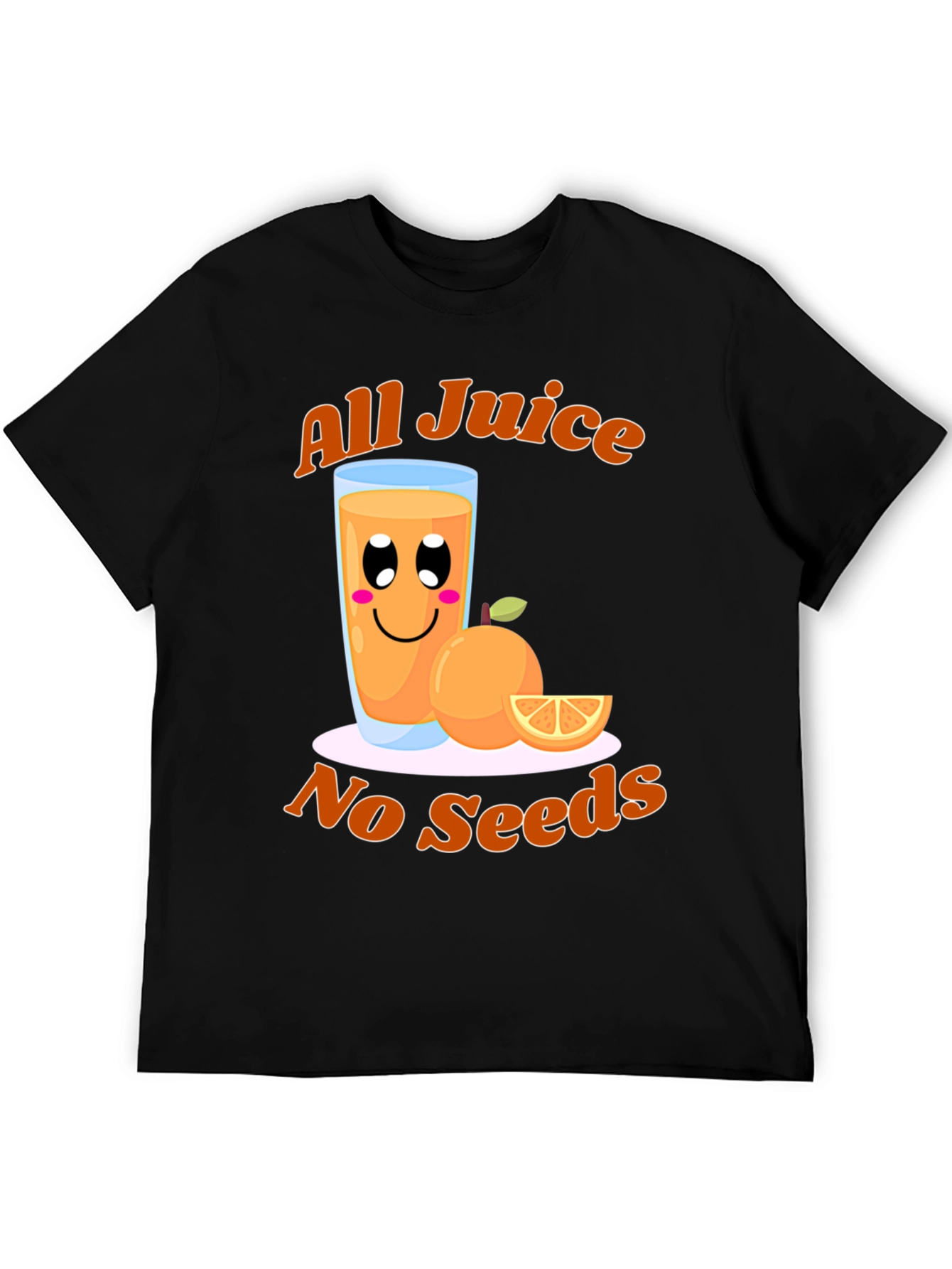Esta camiseta negra presenta un diseño divertido y llamativo, perfecto para los amantes del jugo de naranja. Muestra una ilustración de un vaso de jugo de naranja sonriente junto a una naranja entera y una rodaja, con el texto "All Juice No Seeds" (Todo Jugo, Sin Semillas) en letras curvas de color naranja. La camiseta parece estar hecha de un material suave y cómodo, ideal para el uso diario. Su diseño único la convierte en una excelente opción para expresar tu personalidad y sentido del humor. Ideal para usar en un día casual, en el gimnasio o como un regalo original para un amigo o familiar. ¡Lleva tu pasión por el jugo de naranja con estilo!