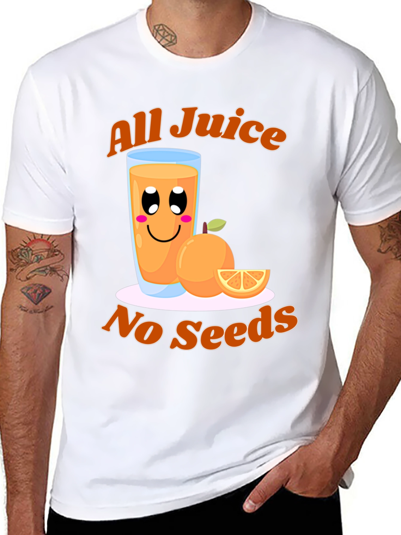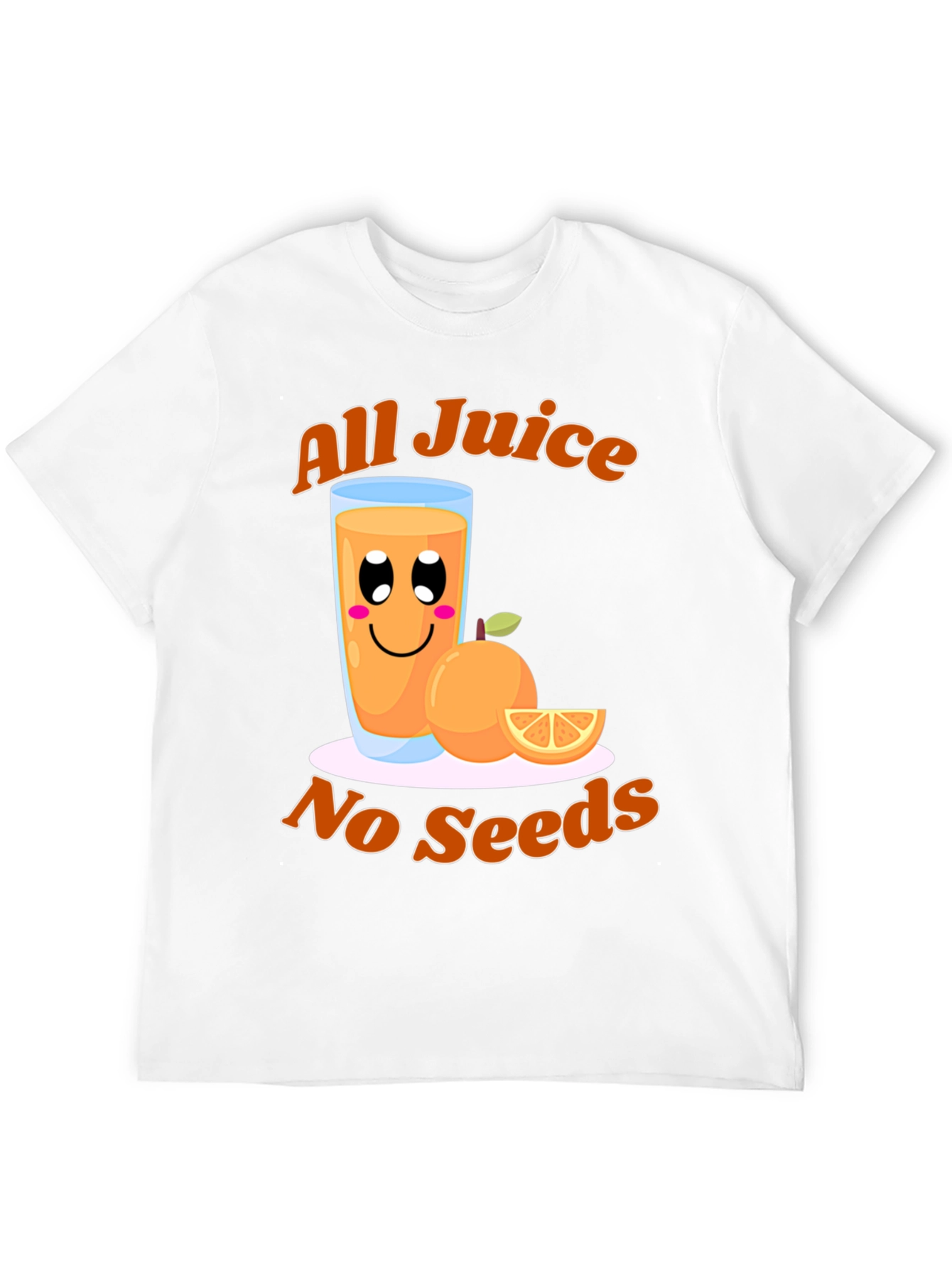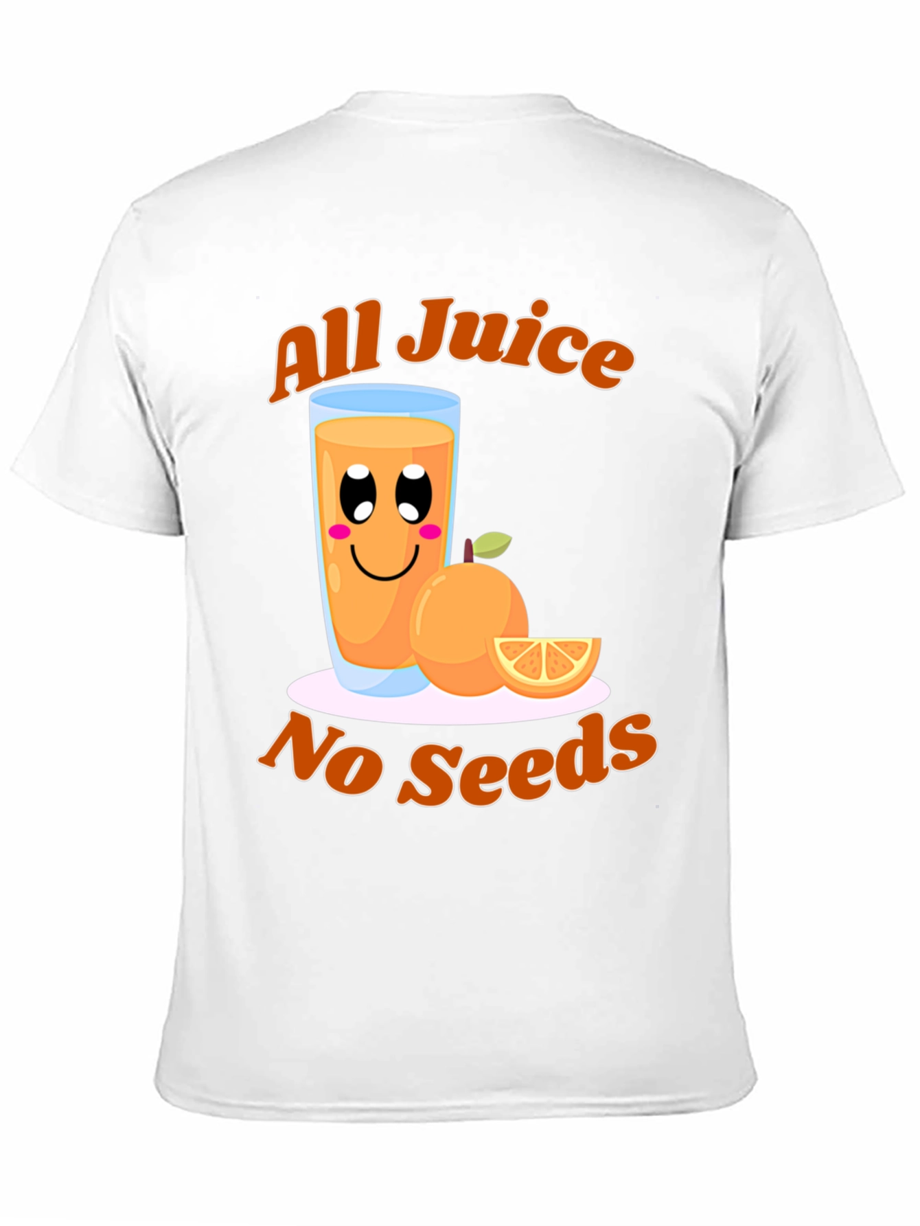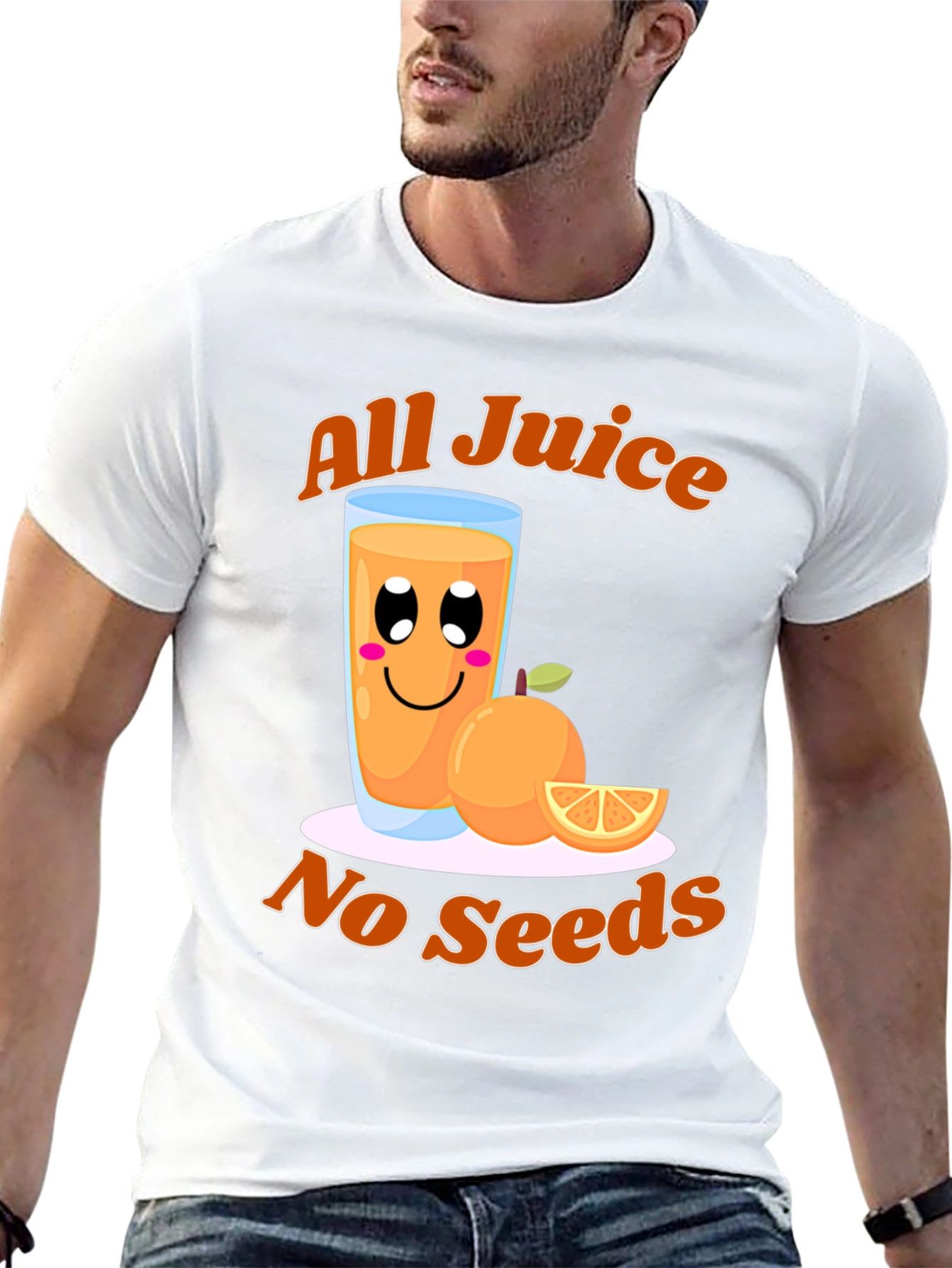 Esta camiseta negra presenta un diseño divertido y llamativo, perfecto para los amantes del jugo de naranja. Muestra una ilustración de un vaso de jugo de naranja sonriente junto a una naranja entera y una rodaja, con el texto "All Juice No Seeds" (Todo Jugo, Sin Semillas) en letras curvas de color naranja. La camiseta parece estar hecha de un material suave y cómodo, ideal para el uso diario. Su diseño único la convierte en una excelente opción para expresar tu personalidad y sentido del humor. Ideal para usar en un día casual, en el gimnasio o como un regalo original para un amigo o familiar. ¡Lleva tu pasión por el jugo de naranja con estilo!
