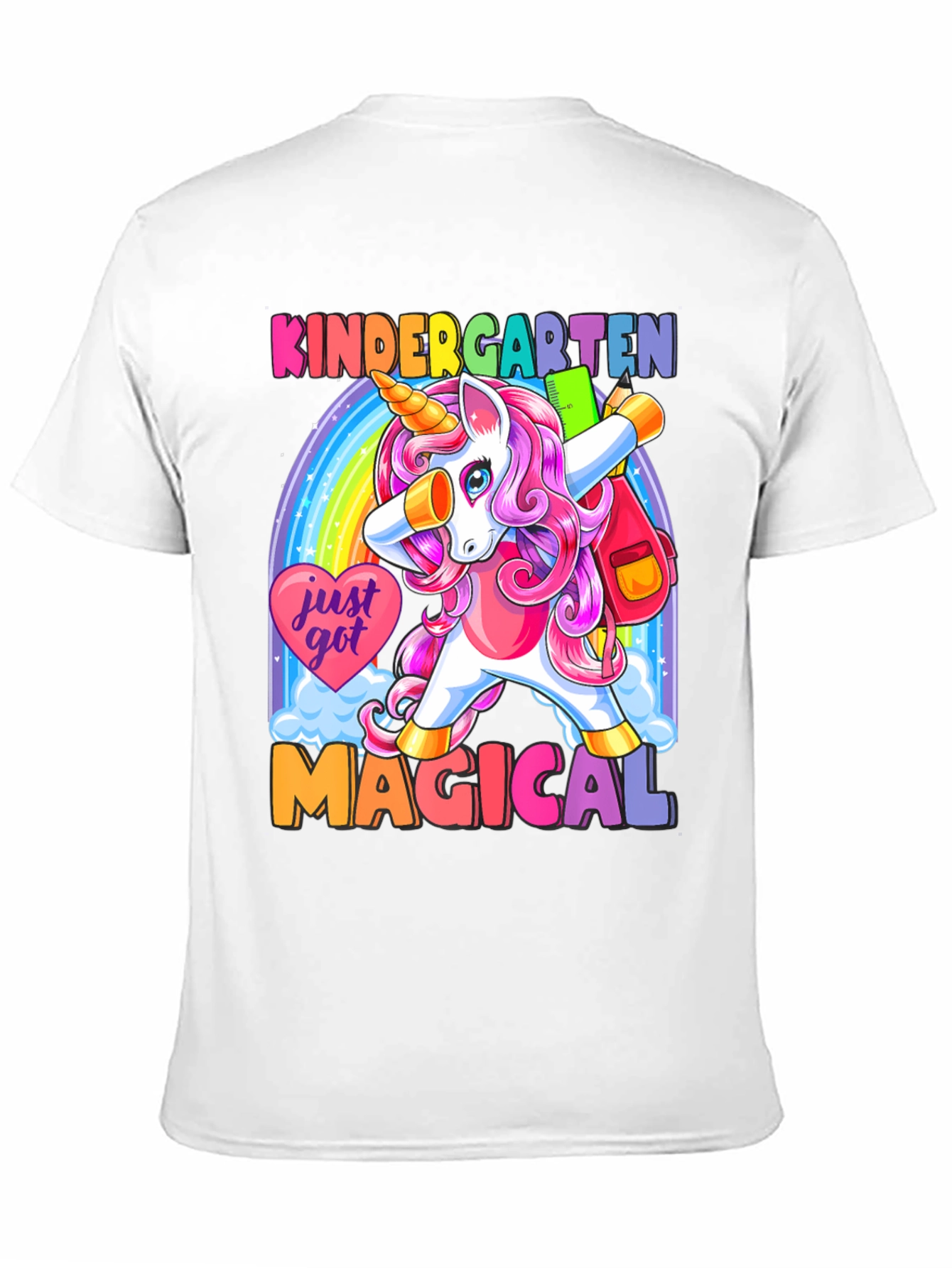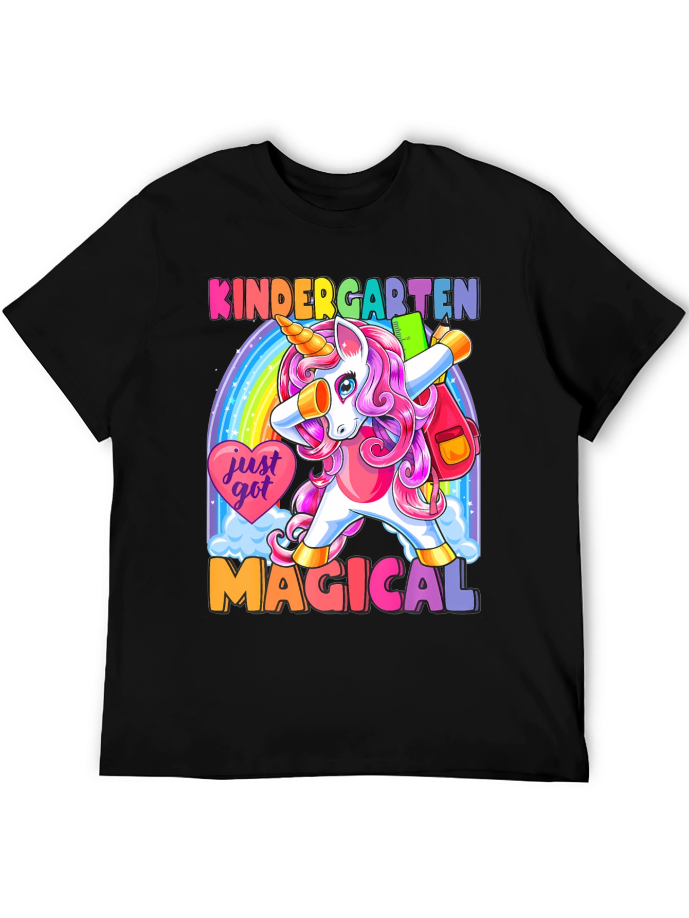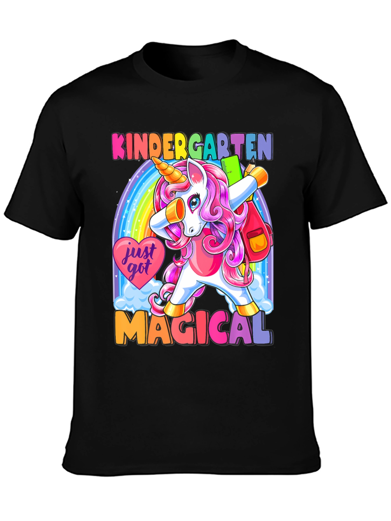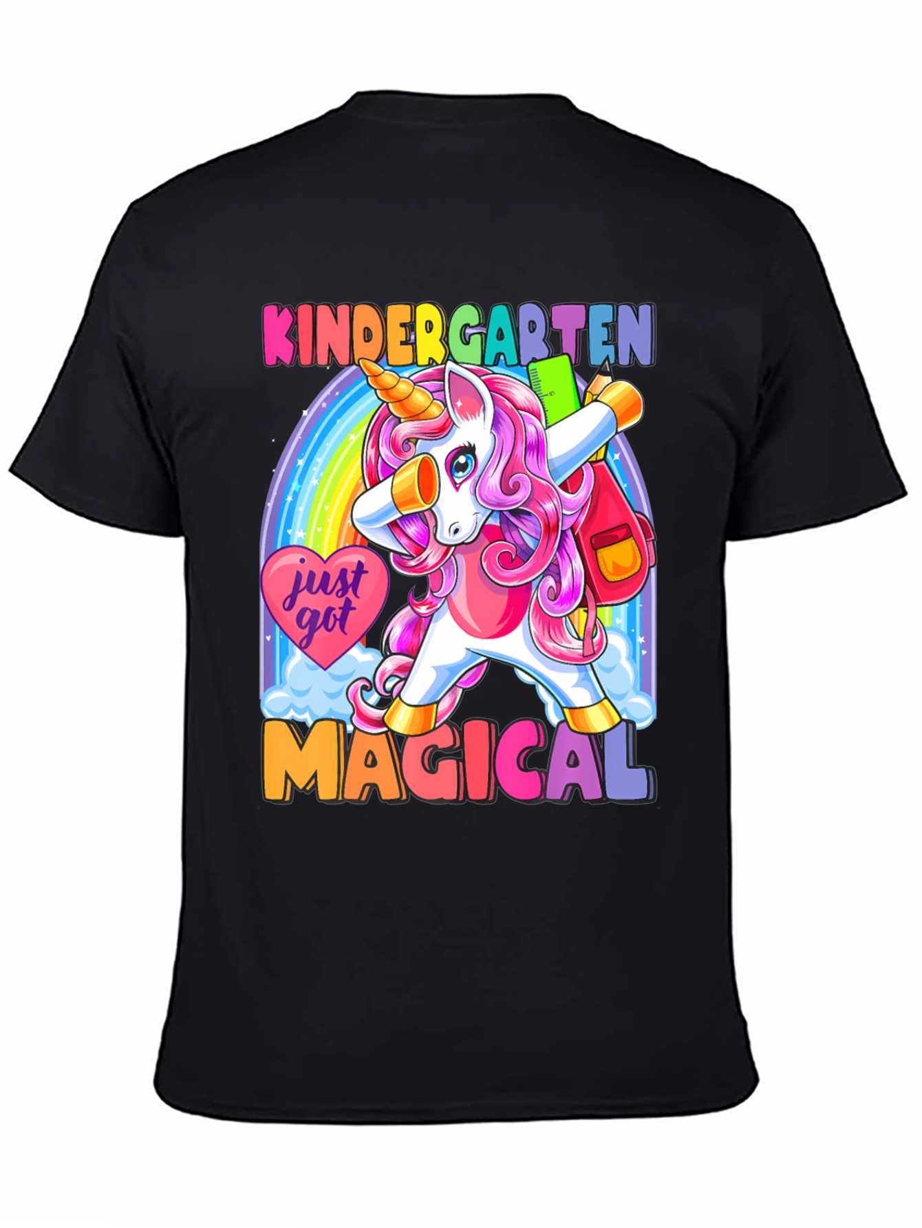 ¡Prepárate para la escuela con estilo! Esta camiseta negra presenta un adorable unicornio de cabello rosa haciendo un dab frente a un arcoíris brillante. Con el texto "KINDERGARTEN MAGICAL", esta prenda es perfecta para los más pequeños. Su diseño colorido y divertido seguro que destacará en el aula. Hecha con materiales suaves y cómodos, esta camiseta es ideal para el uso diario. ¡Deja que tu hijo exprese su magia con esta camiseta única y llamativa! Perfecta para el primer día de clases o cualquier ocasión especial.