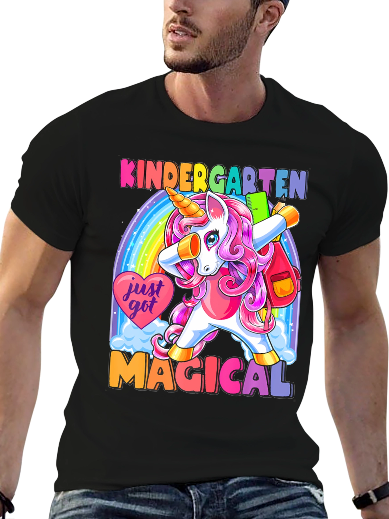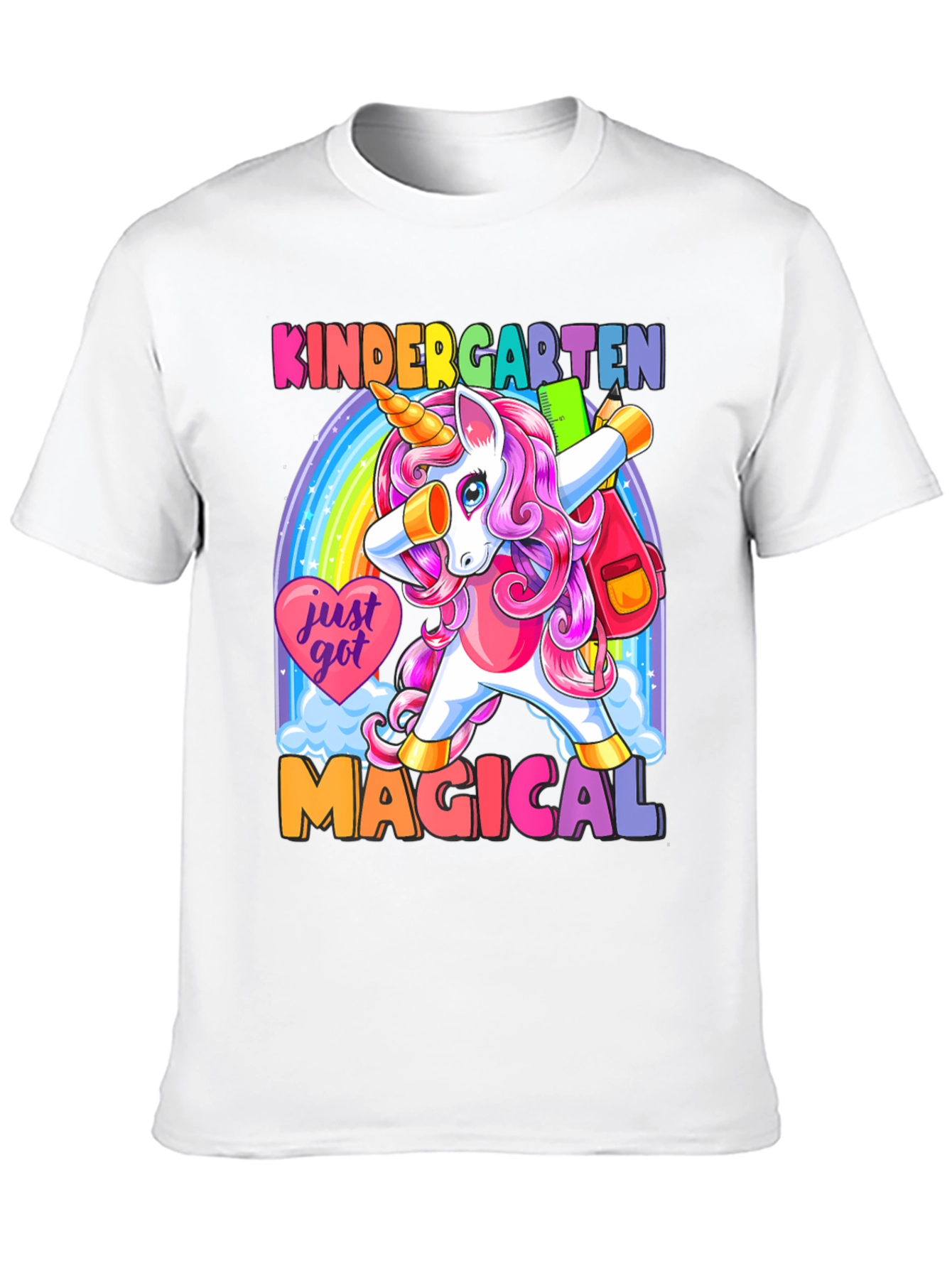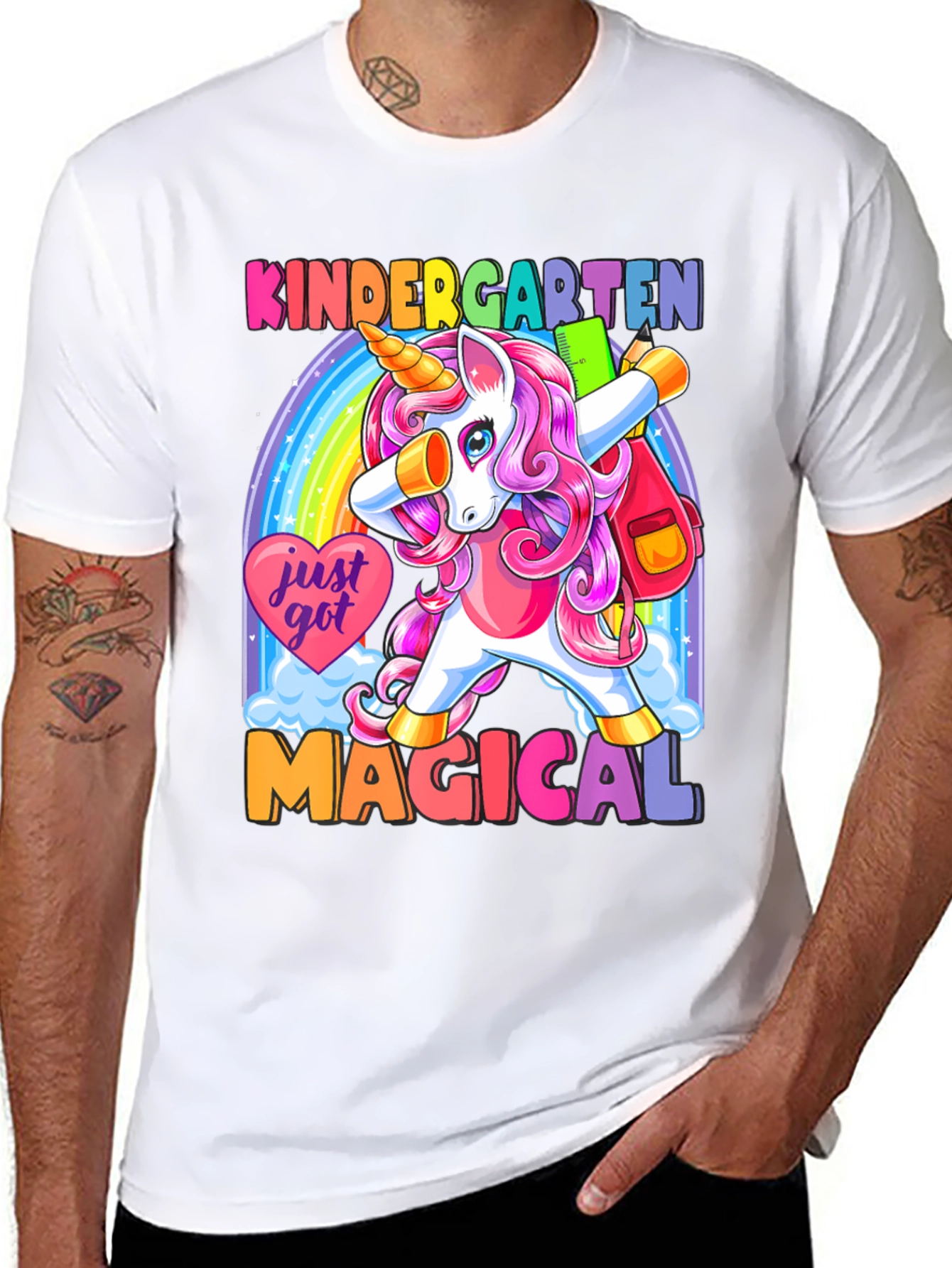 ¡Prepárate para la escuela con estilo! Esta camiseta negra presenta un adorable unicornio de cabello rosa haciendo un dab frente a un arcoíris brillante. Con el texto "KINDERGARTEN MAGICAL", esta prenda es perfecta para los más pequeños. Su diseño colorido y divertido seguro que destacará en el aula. Hecha con materiales suaves y cómodos, esta camiseta es ideal para el uso diario. ¡Deja que tu hijo exprese su magia con esta camiseta única y llamativa! Perfecta para el primer día de clases o cualquier ocasión especial.