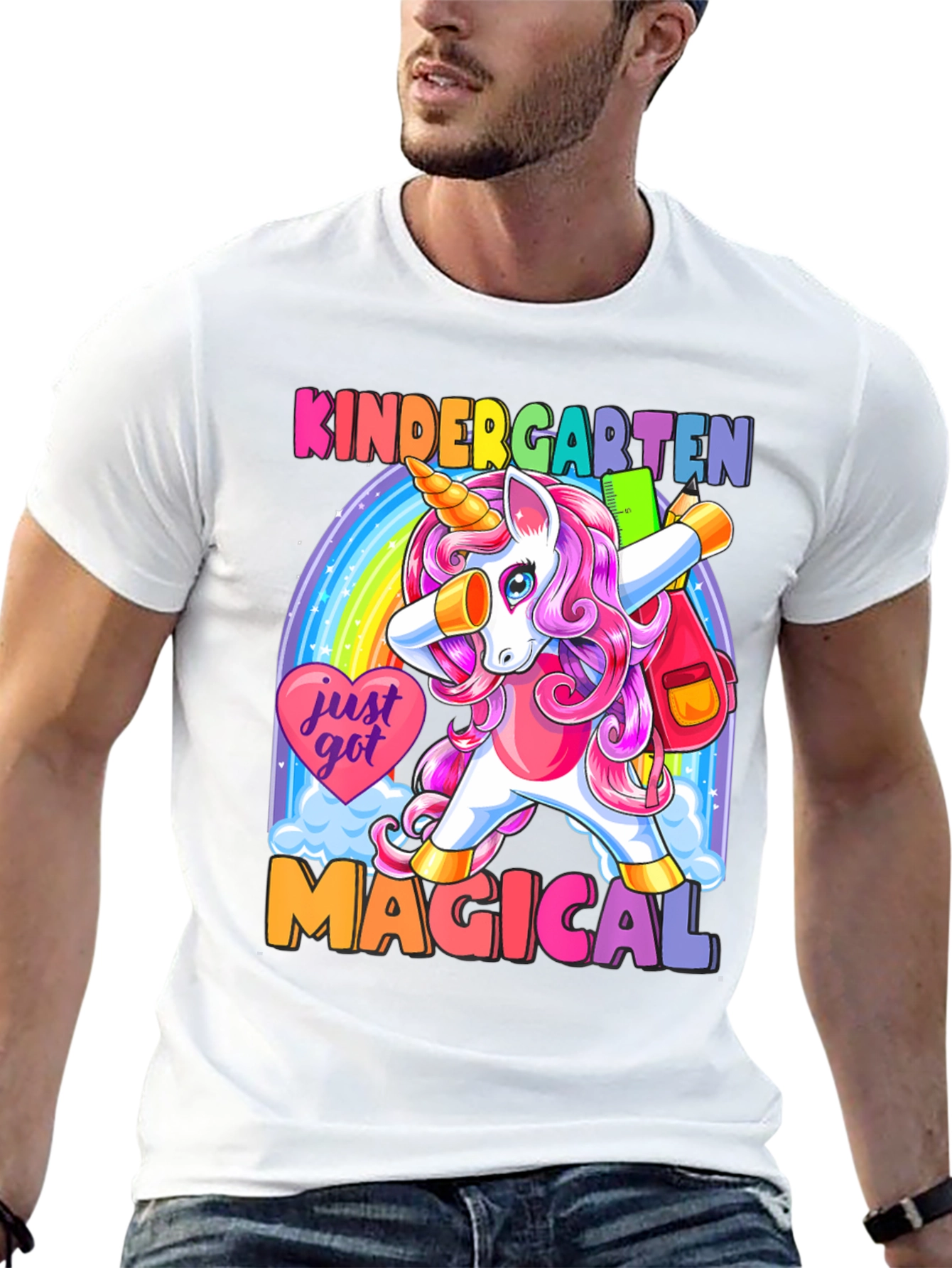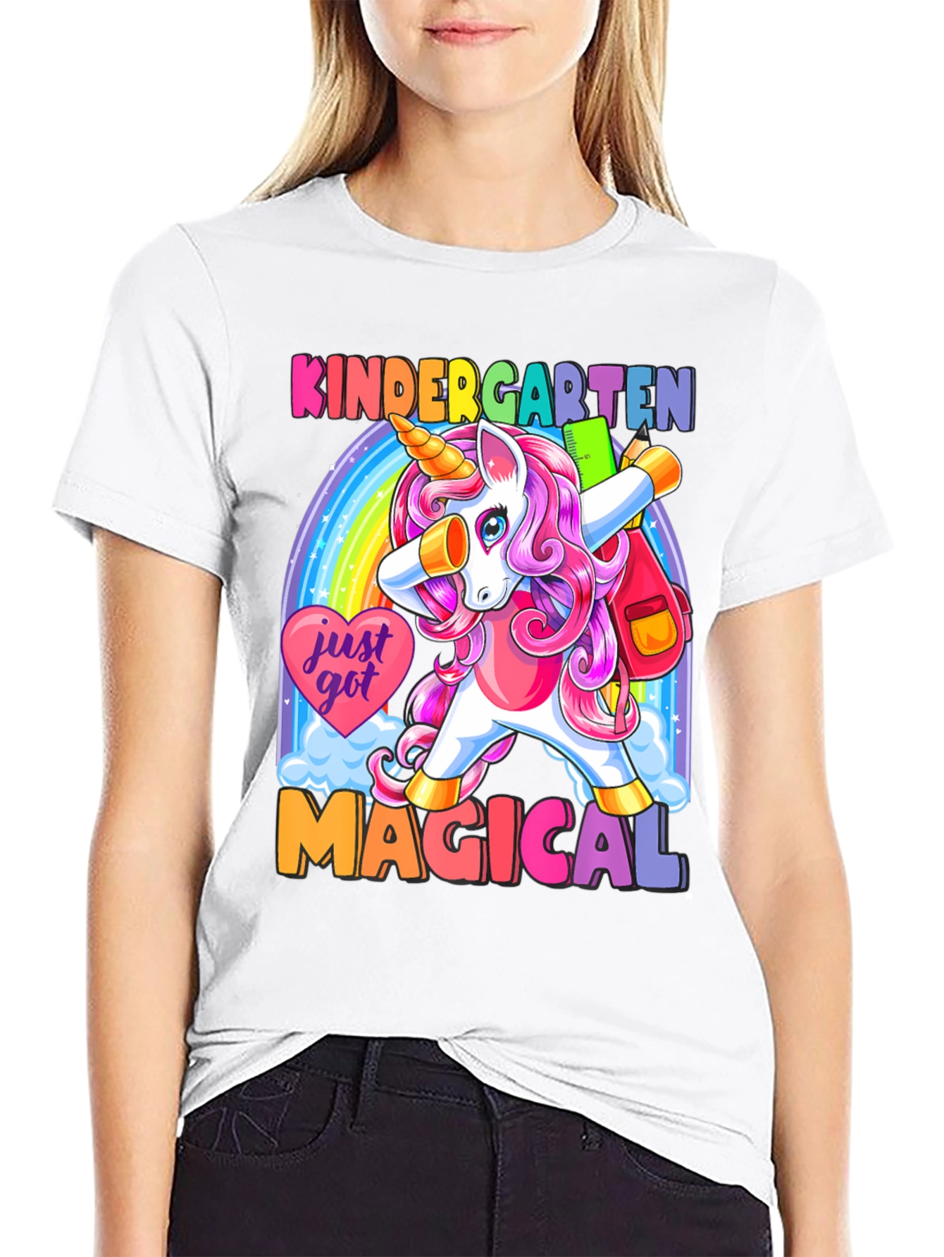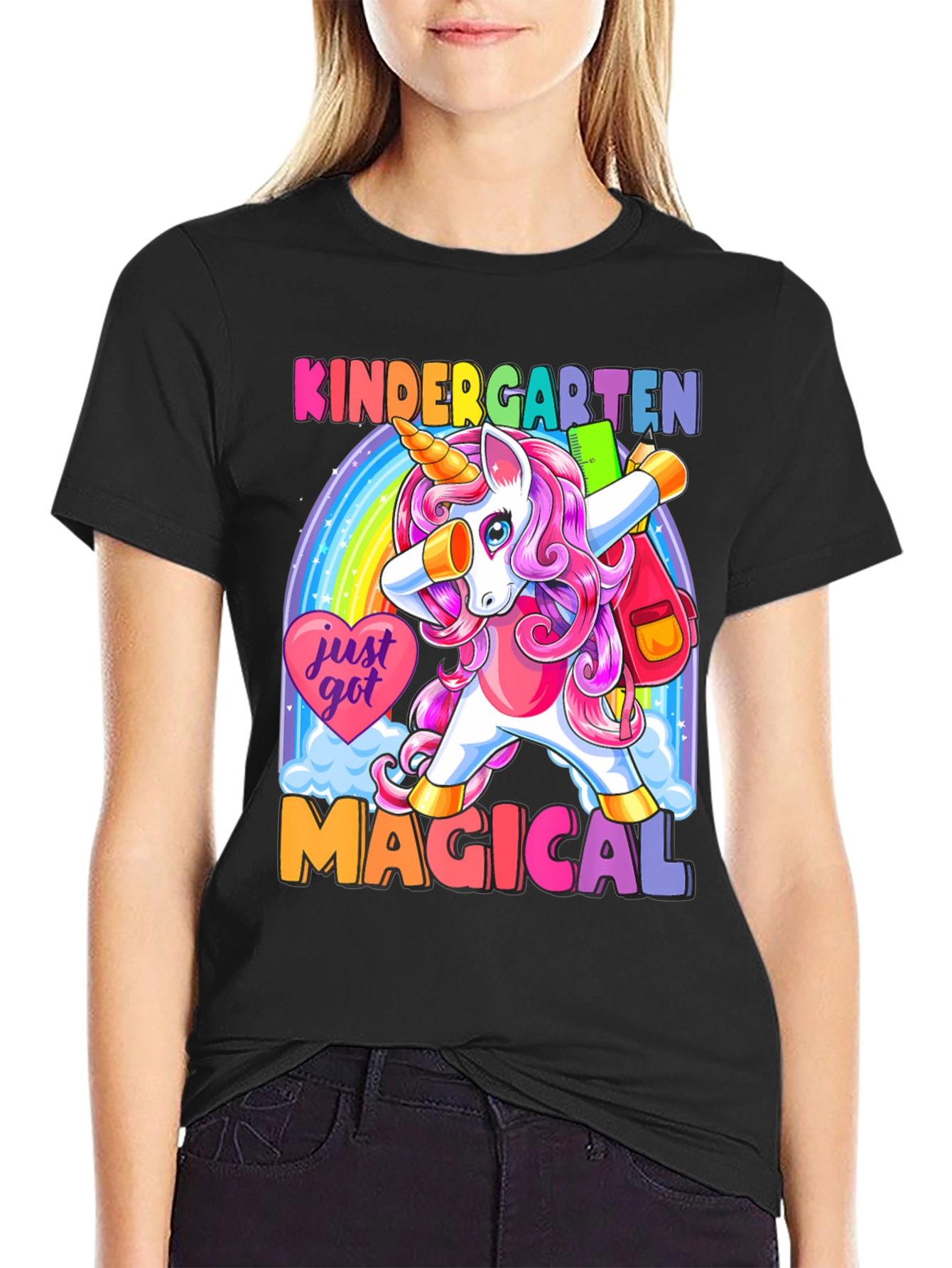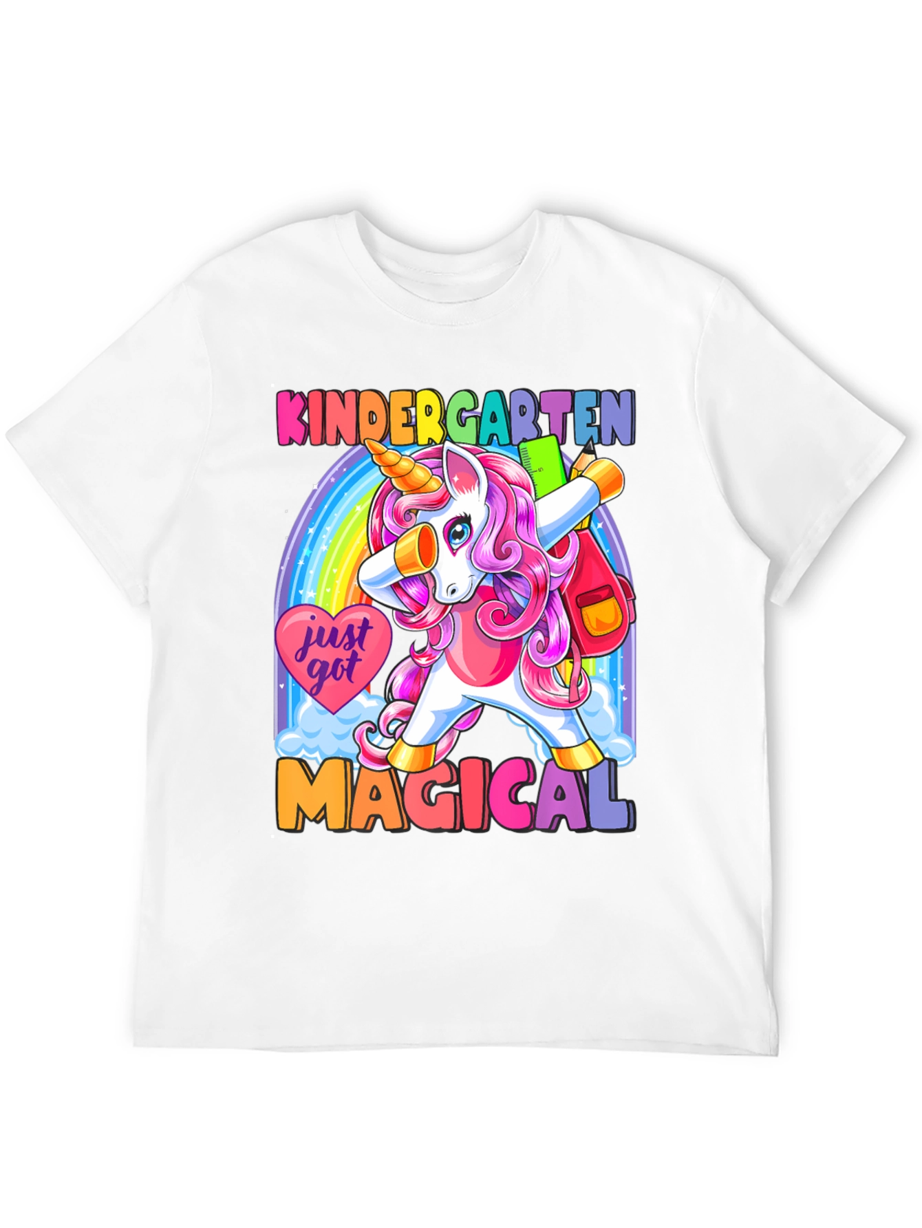 ¡Prepárate para la escuela con estilo! Esta camiseta negra presenta un adorable unicornio de cabello rosa haciendo un dab frente a un arcoíris brillante. Con el texto "KINDERGARTEN MAGICAL", esta prenda es perfecta para los más pequeños. Su diseño colorido y divertido seguro que destacará en el aula. Hecha con materiales suaves y cómodos, esta camiseta es ideal para el uso diario. ¡Deja que tu hijo exprese su magia con esta camiseta única y llamativa! Perfecta para el primer día de clases o cualquier ocasión especial.