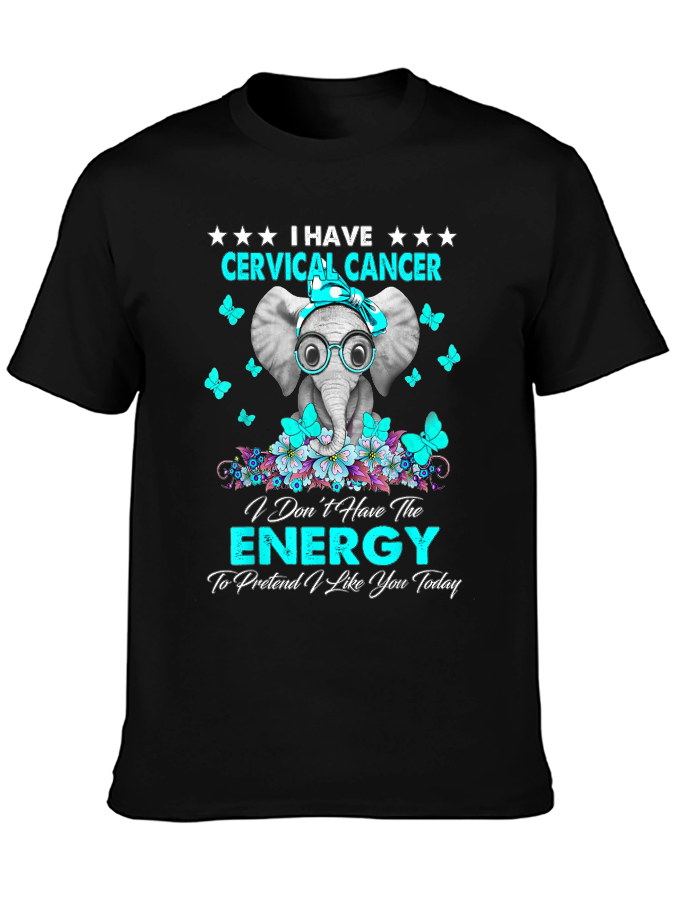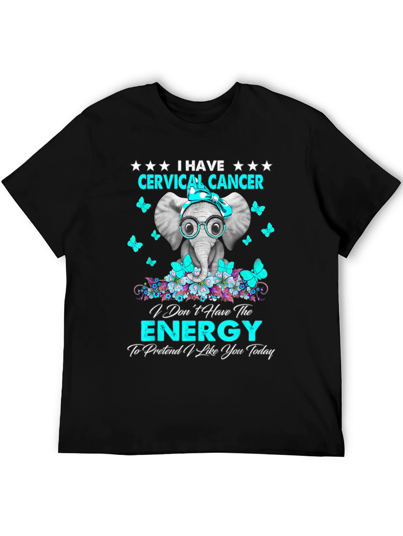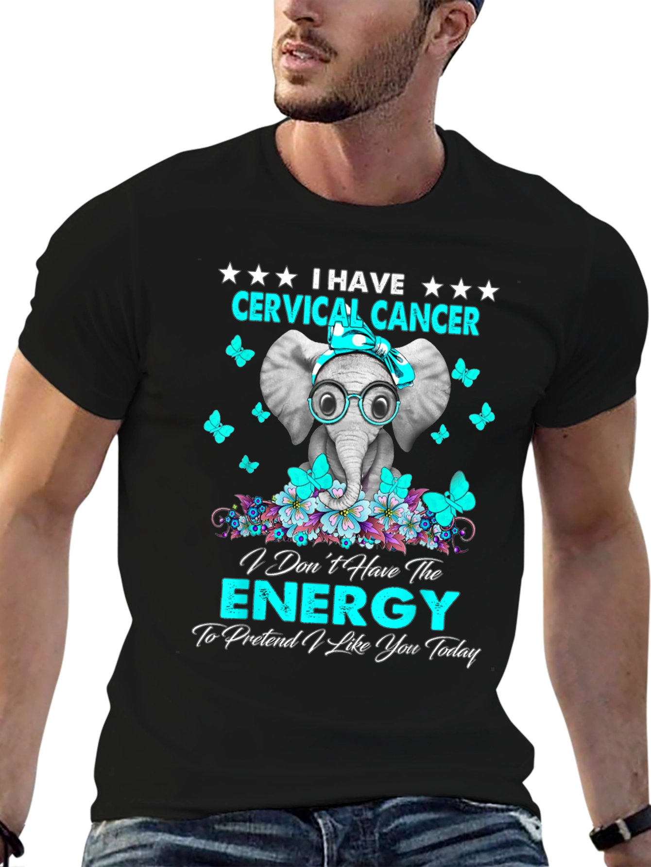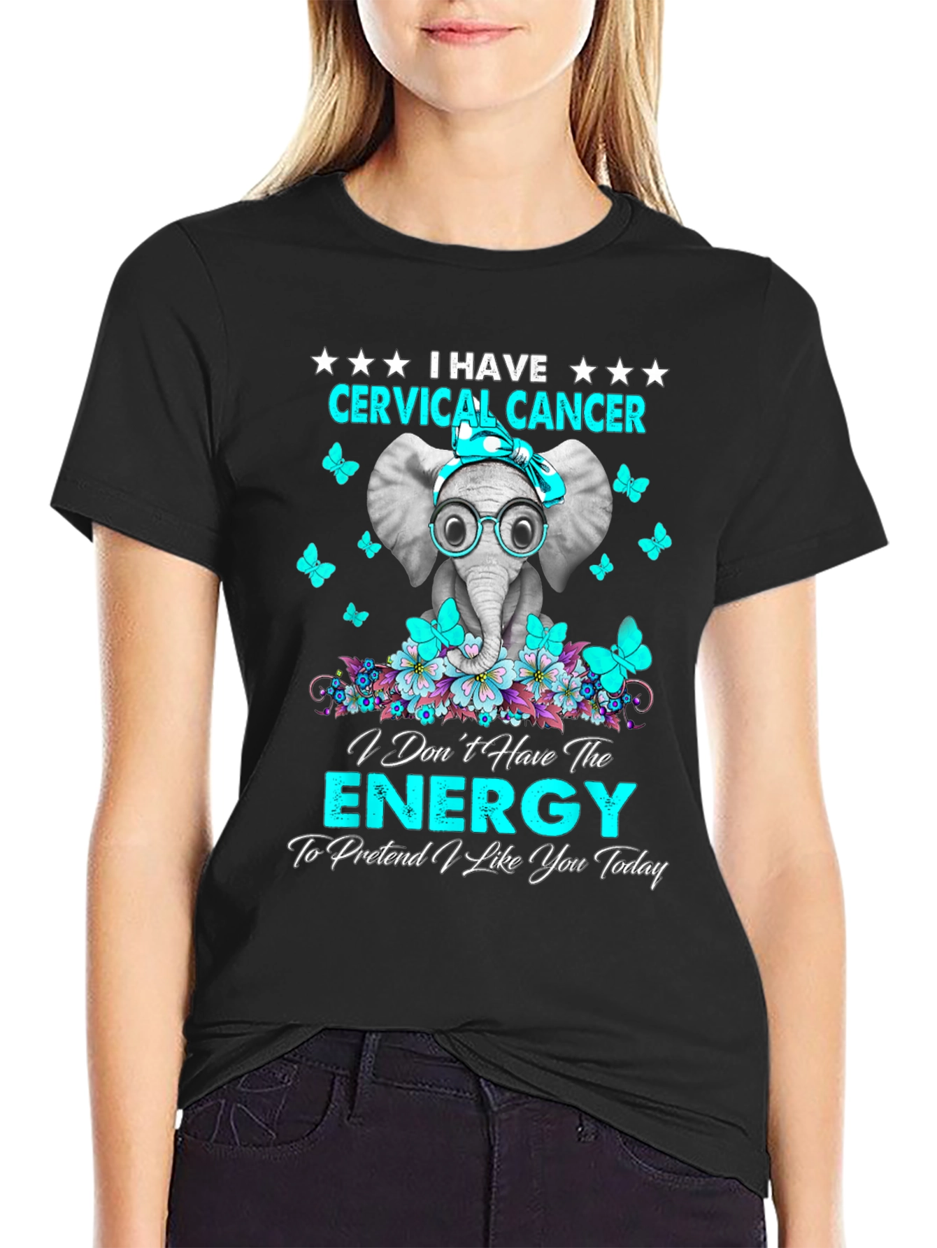 Esta camiseta negra unisex presenta un diseño único y llamativo. Muestra un elefante adorable con gafas y un lazo, rodeado de flores y mariposas turquesas. El texto "I HAVE CERVICAL CANCER" y "I Don't Have The ENERGY To Pretend I Like You Today" está impreso en fuente turquesa brillante, agregando un toque de humor y conciencia. Fabricada con materiales suaves y cómodos, esta camiseta es perfecta para uso diario, eventos de concientización o como un regalo especial para alguien que apoya la causa. Demuestra tu solidaridad y estilo con esta prenda única y significativa.