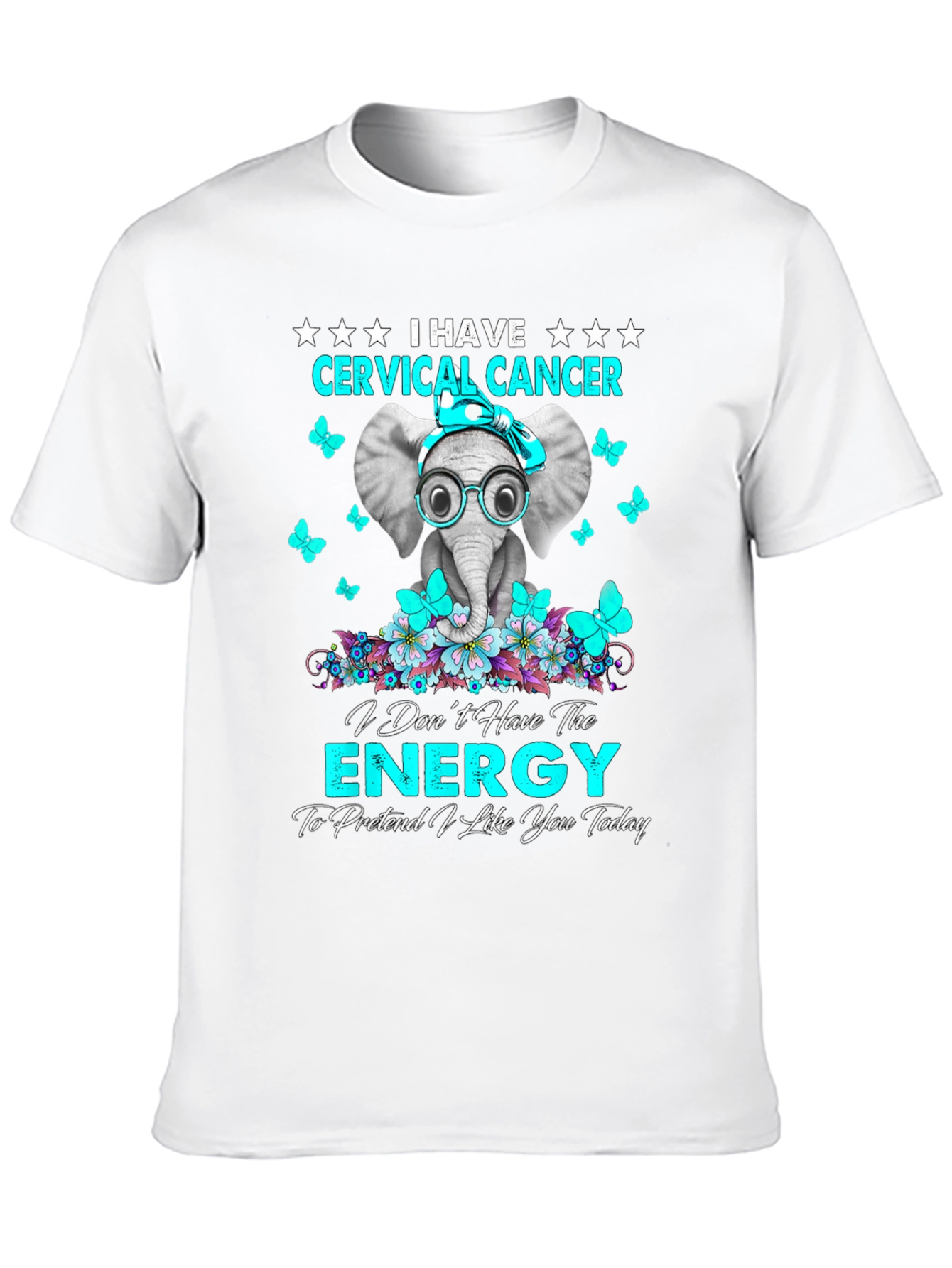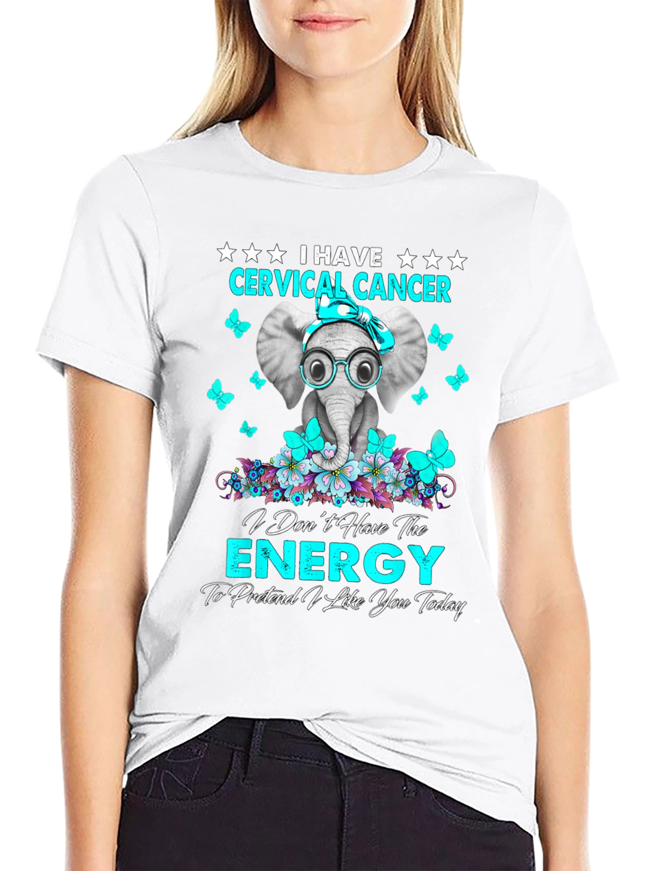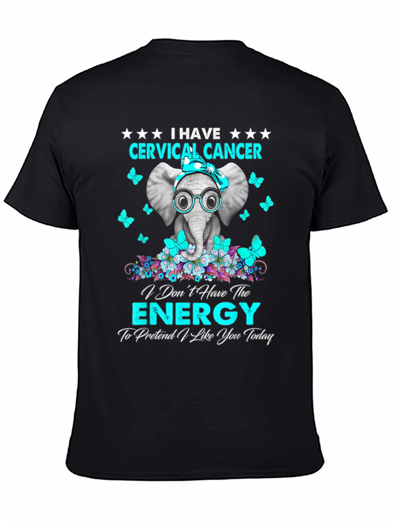 Esta camiseta negra unisex presenta un diseño único y llamativo. Muestra un elefante adorable con gafas y un lazo, rodeado de flores y mariposas turquesas. El texto "I HAVE CERVICAL CANCER" y "I Don't Have The ENERGY To Pretend I Like You Today" está impreso en fuente turquesa brillante, agregando un toque de humor y conciencia. Fabricada con materiales suaves y cómodos, esta camiseta es perfecta para uso diario, eventos de concientización o como un regalo especial para alguien que apoya la causa. Demuestra tu solidaridad y estilo con esta prenda única y significativa.