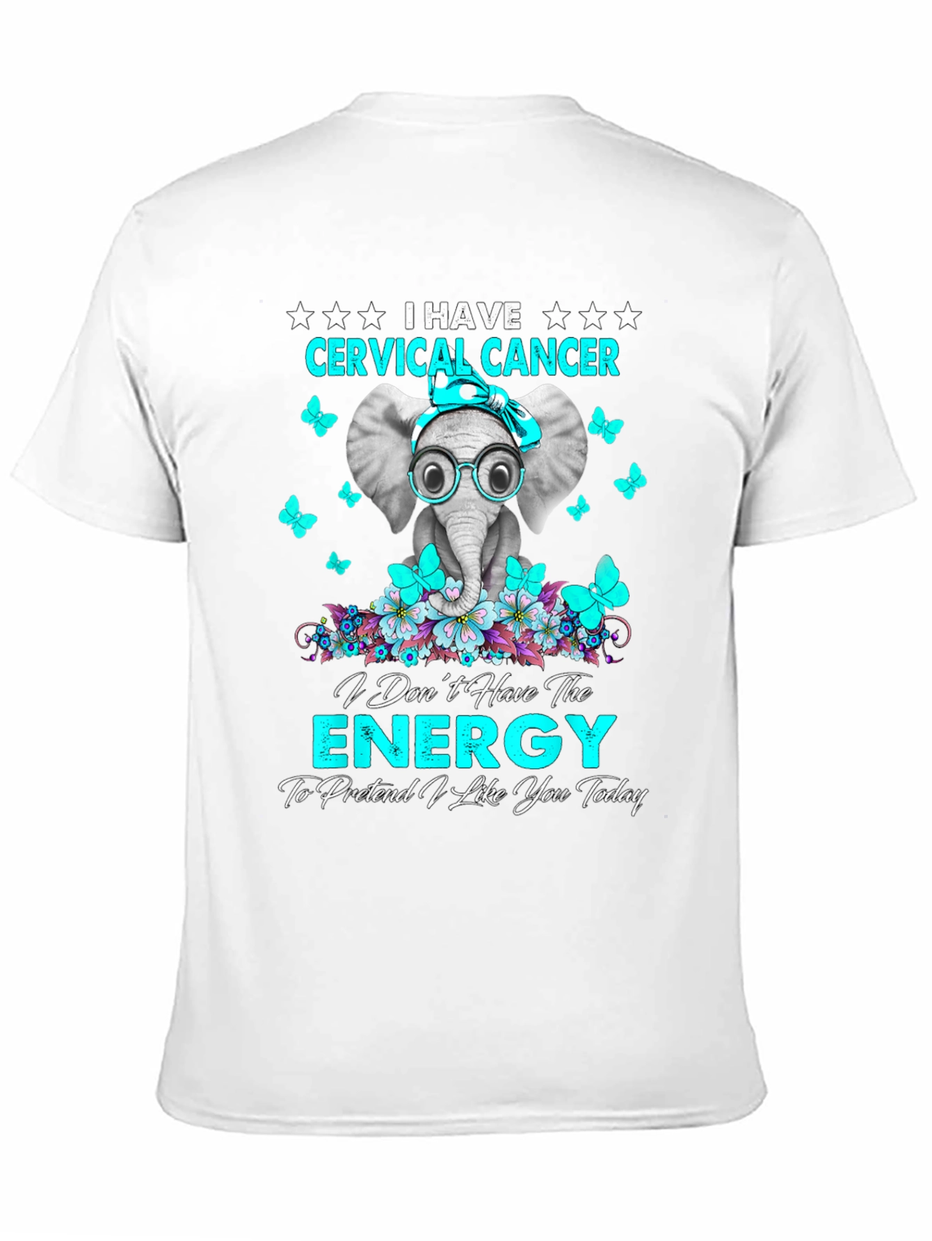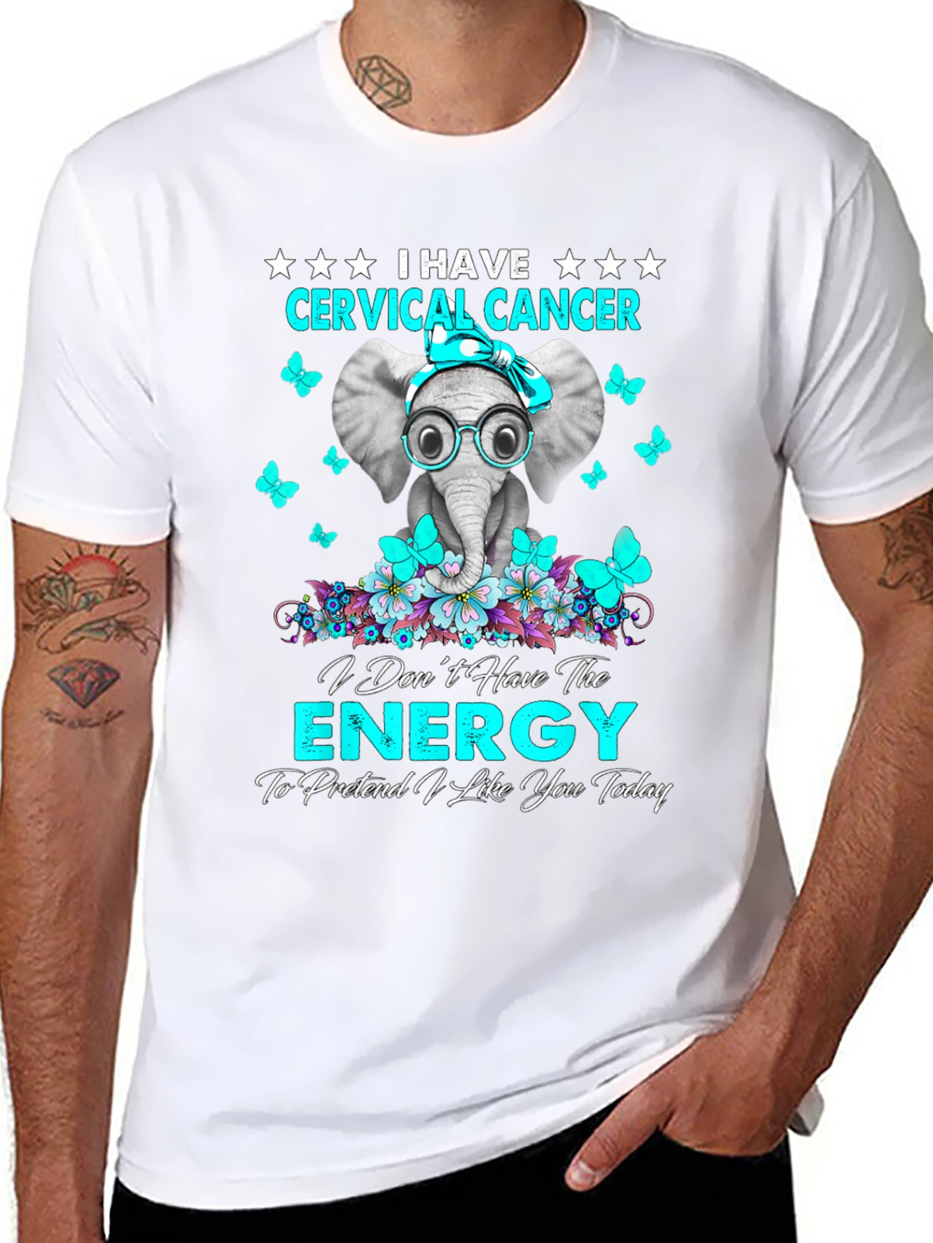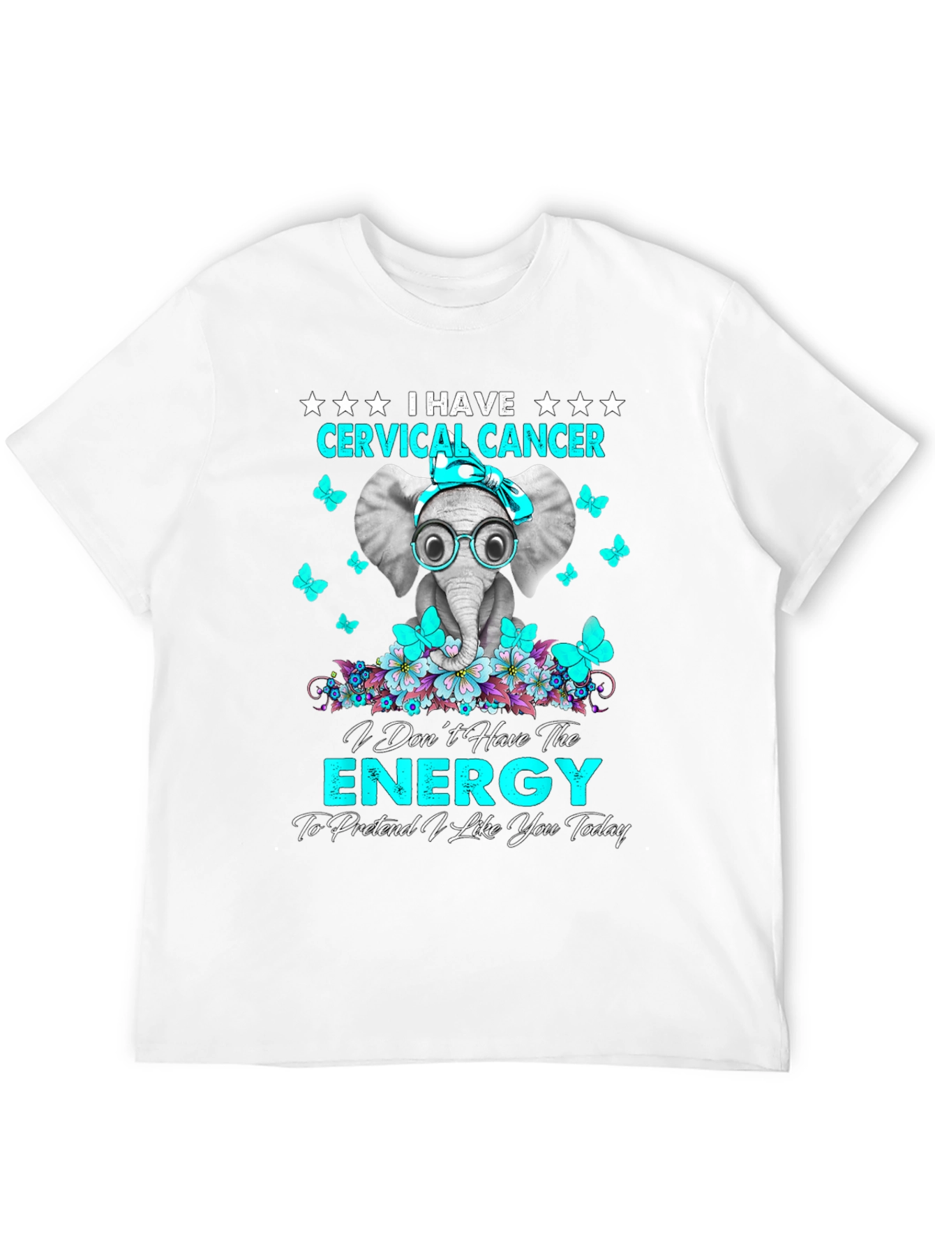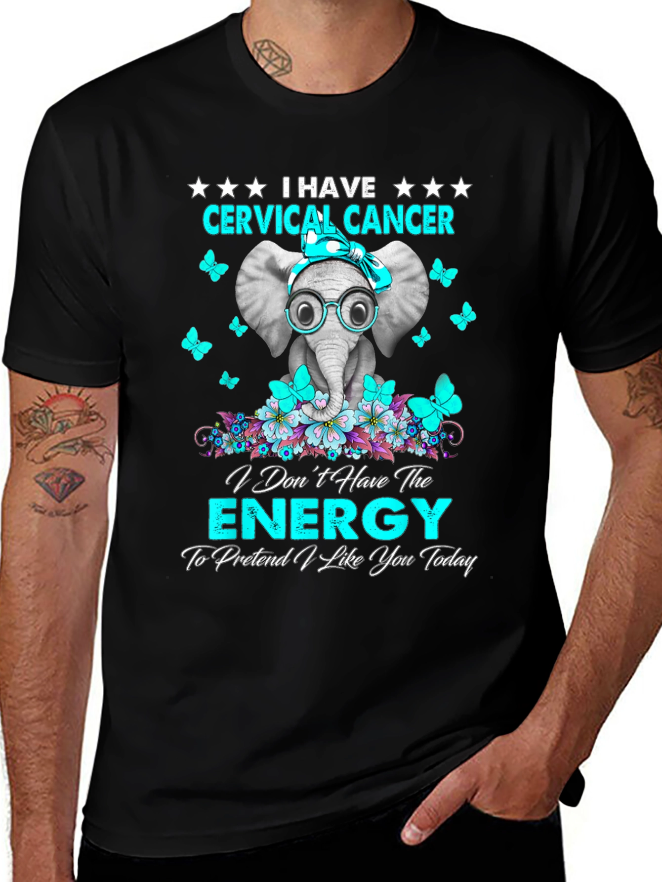 Esta camiseta negra unisex presenta un diseño único y llamativo. Muestra un elefante adorable con gafas y un lazo, rodeado de flores y mariposas turquesas. El texto "I HAVE CERVICAL CANCER" y "I Don't Have The ENERGY To Pretend I Like You Today" está impreso en fuente turquesa brillante, agregando un toque de humor y conciencia. Fabricada con materiales suaves y cómodos, esta camiseta es perfecta para uso diario, eventos de concientización o como un regalo especial para alguien que apoya la causa. Demuestra tu solidaridad y estilo con esta prenda única y significativa.