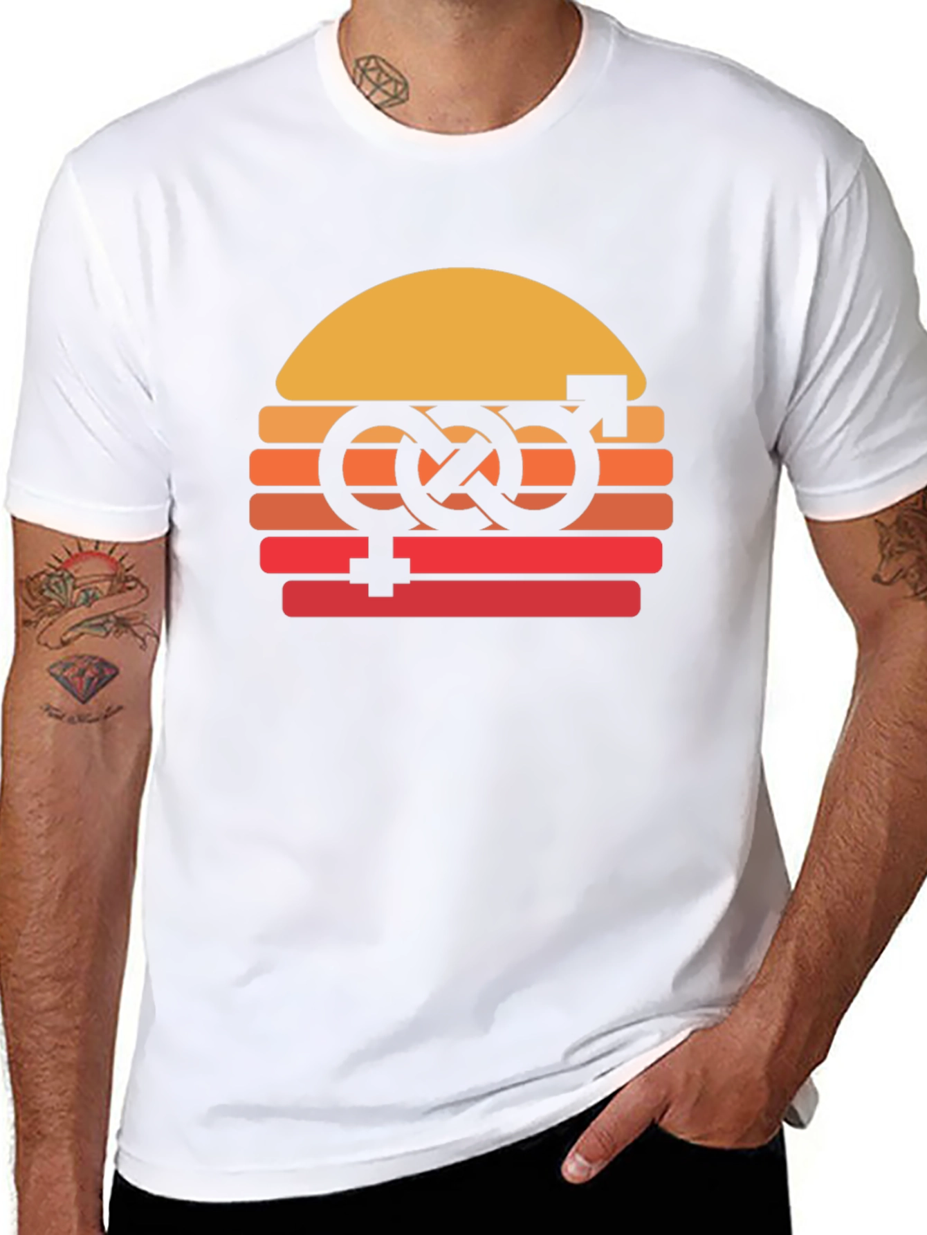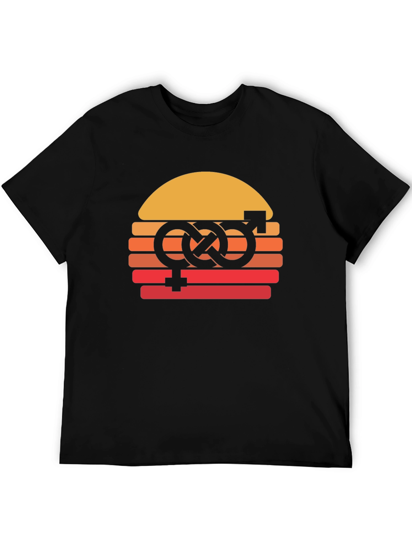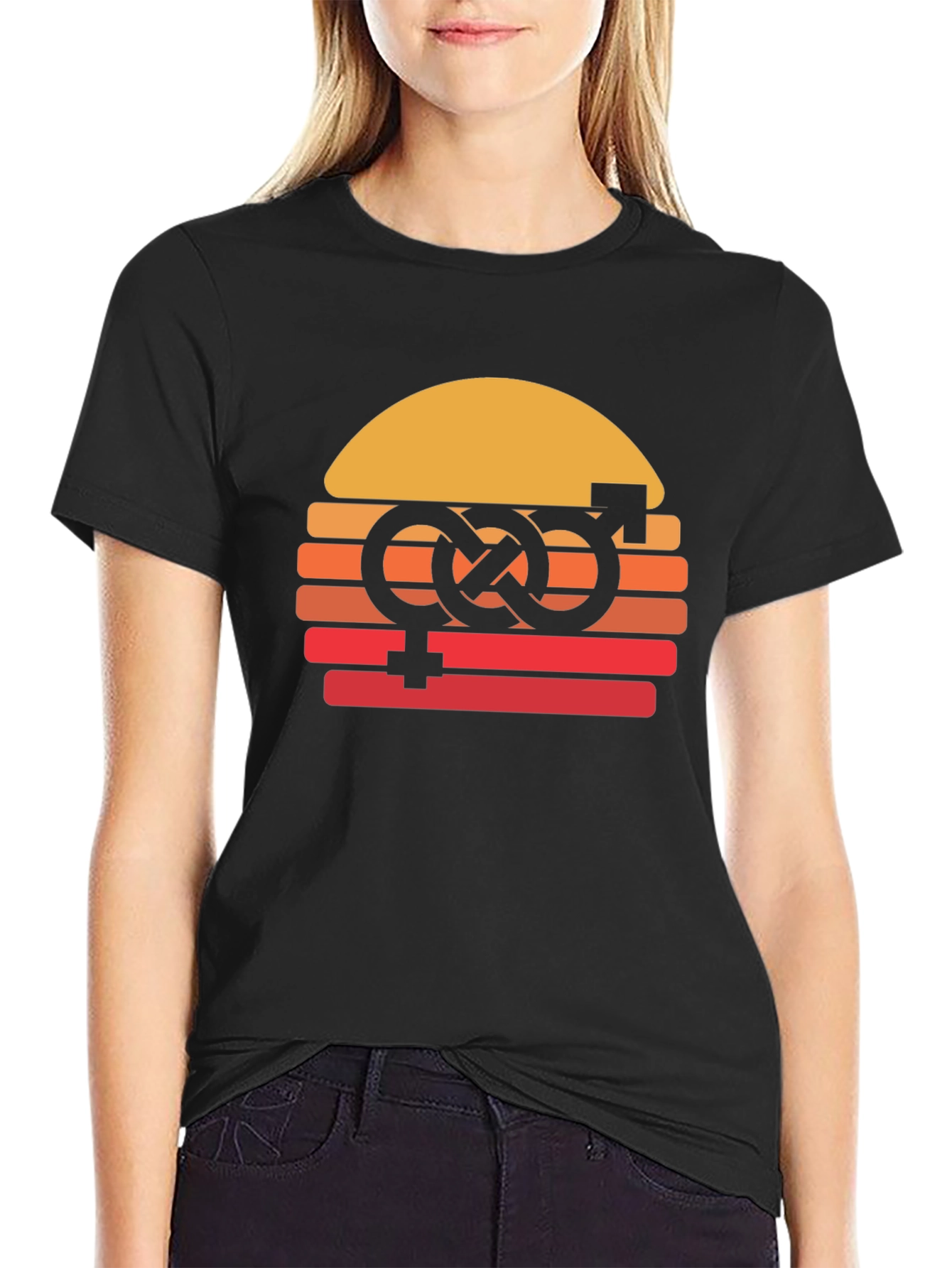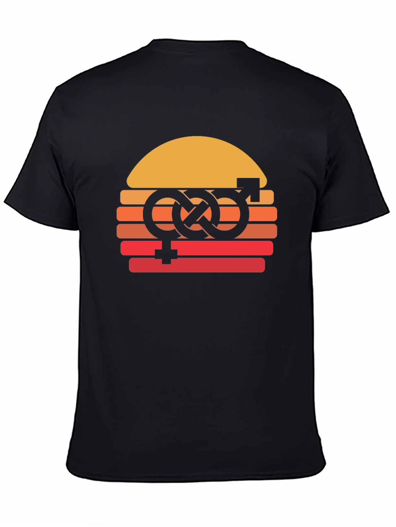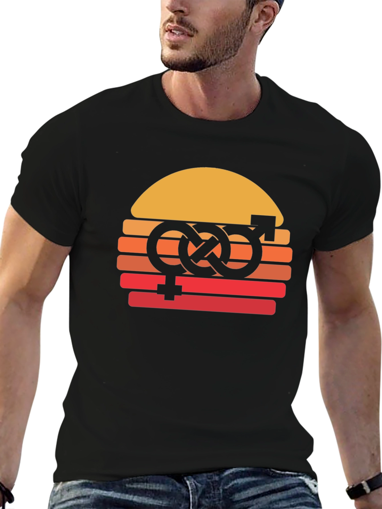 Muestra tu apoyo al amor igualitario con esta camiseta negra de diseño retro. La impresión presenta símbolos de género entrelazados sobre un fondo de puesta de sol a rayas horizontales en tonos naranja y rojo. Perfecta para expresar tu apoyo al movimiento LGBTQ+ y destacar con un estilo único y moderno. Hecha con materiales suaves y cómodos, ideal para usar en eventos, manifestaciones o en tu día a día. Una prenda versátil que combina conciencia social con moda.