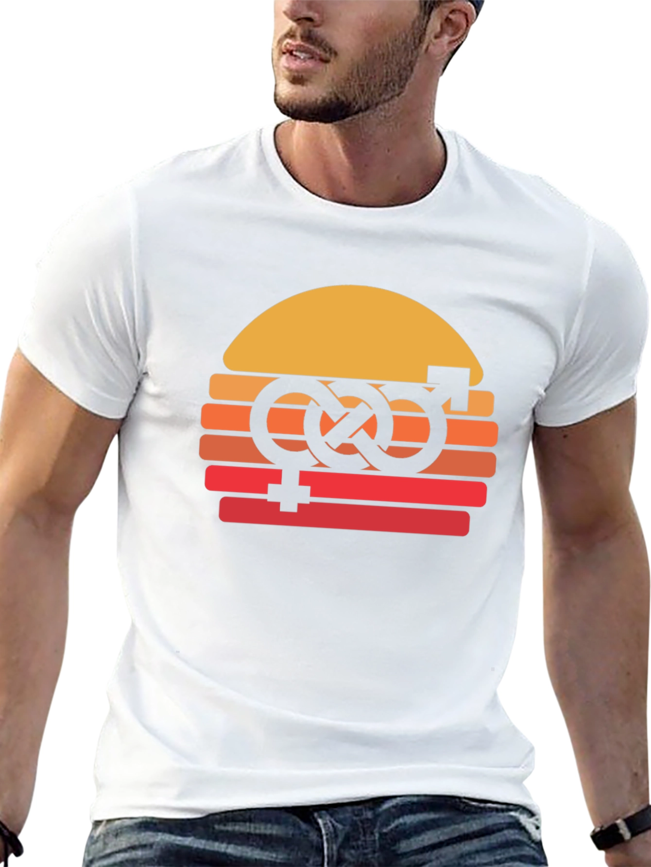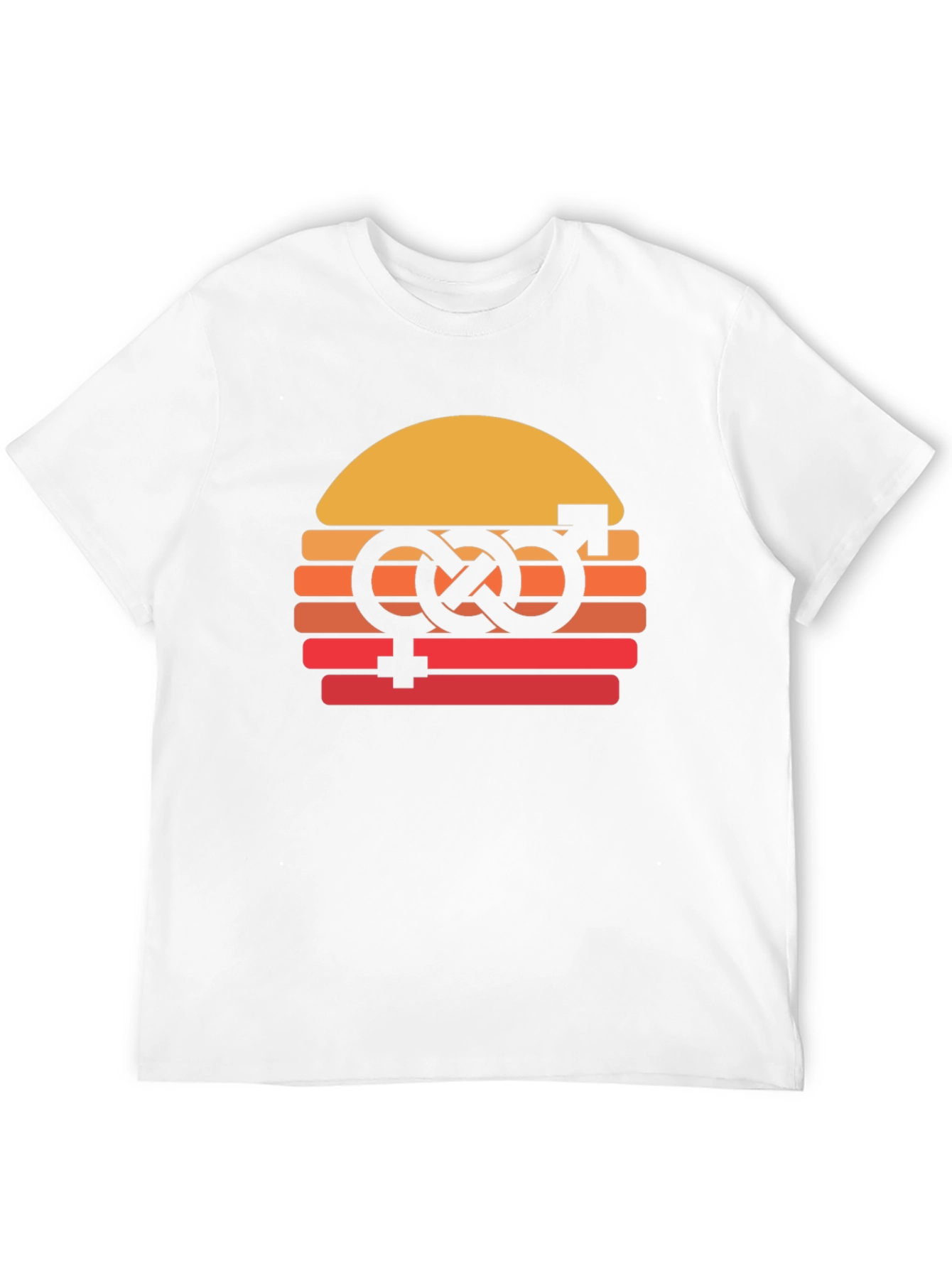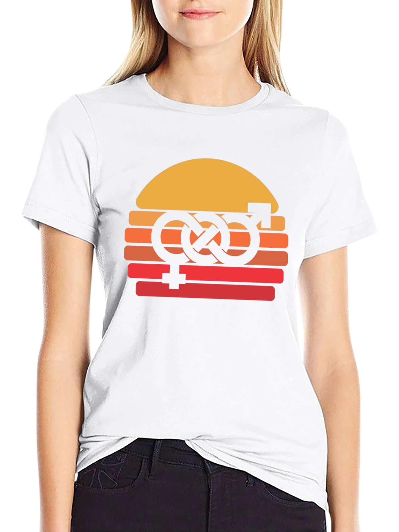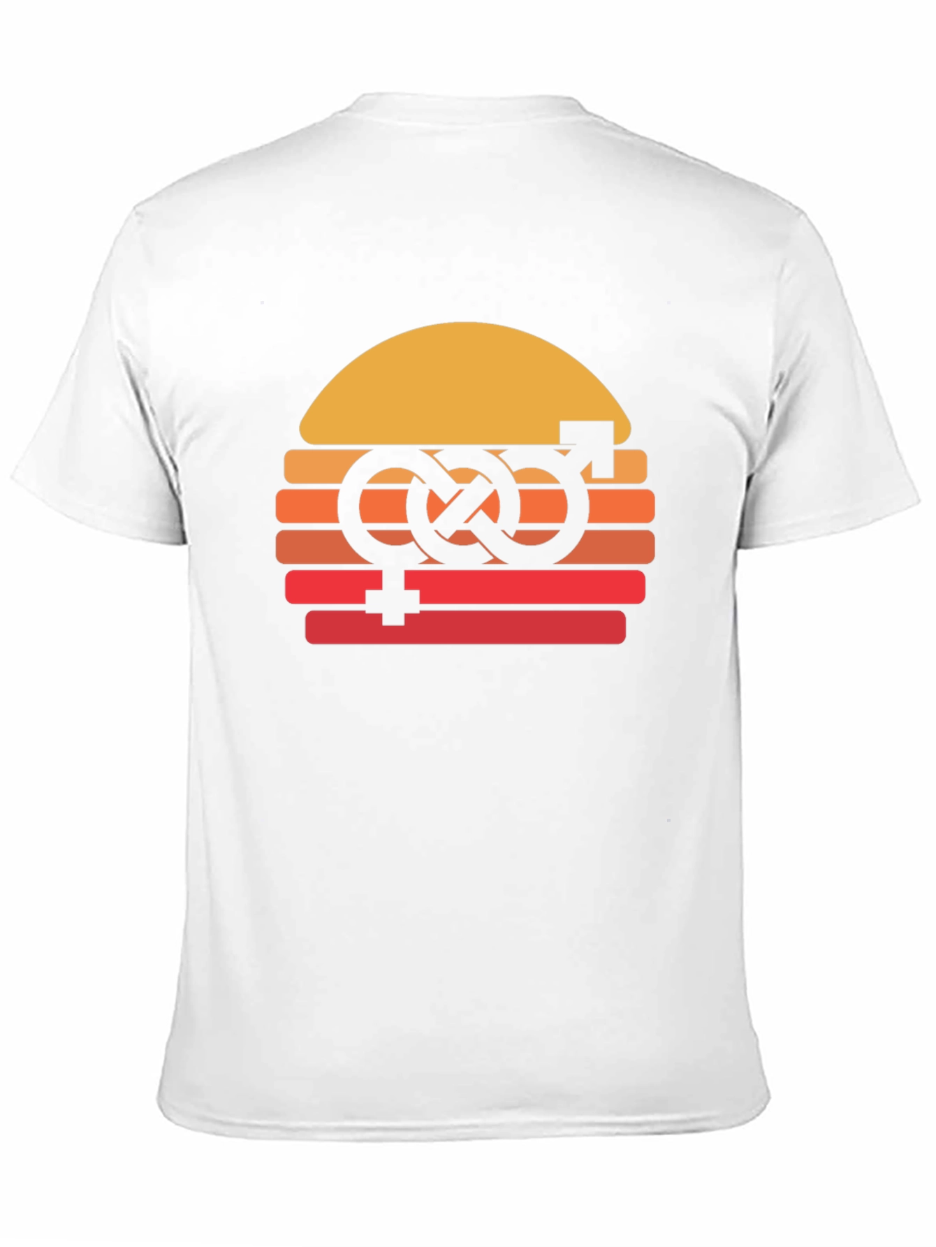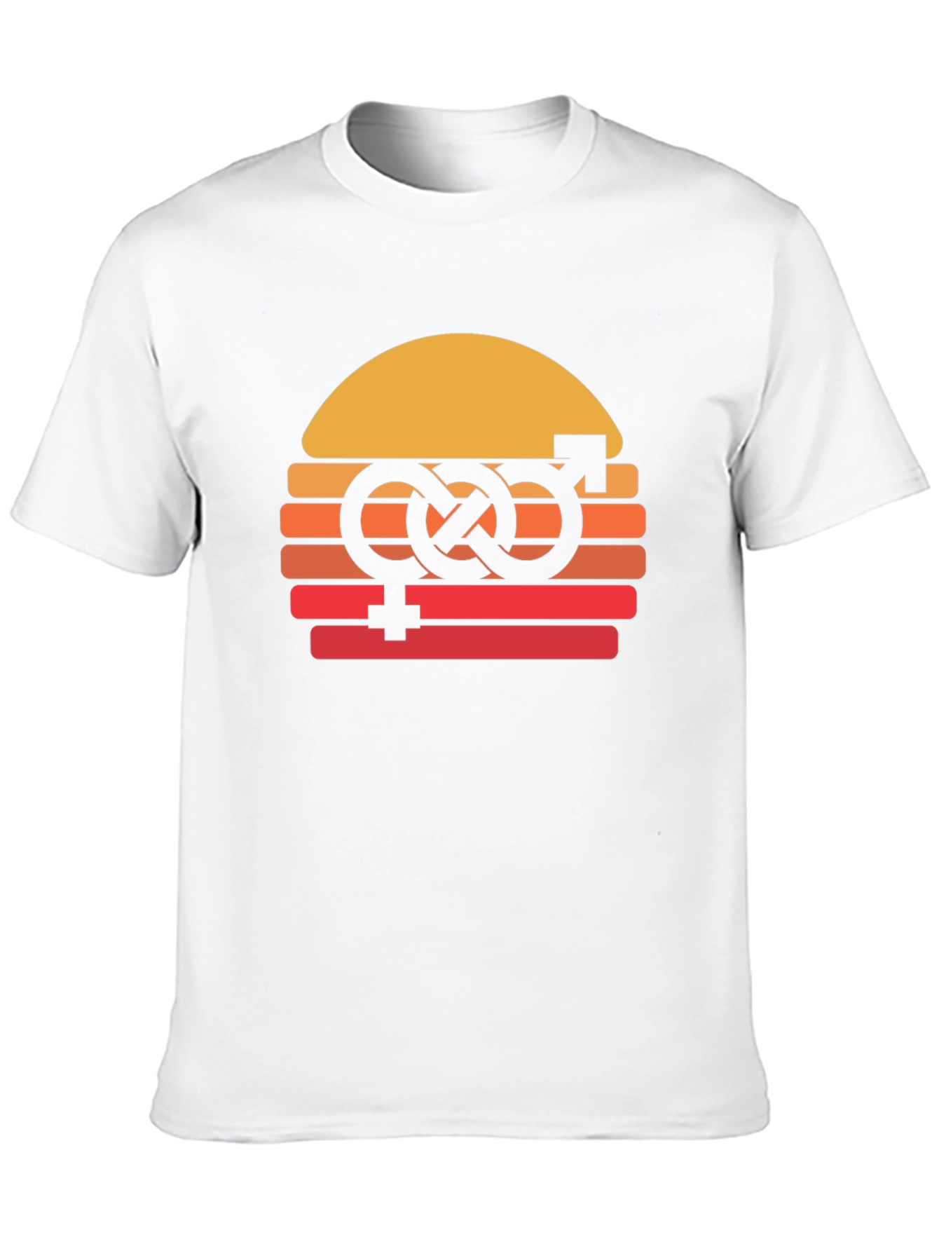 Muestra tu apoyo al amor igualitario con esta camiseta negra de diseño retro. La impresión presenta símbolos de género entrelazados sobre un fondo de puesta de sol a rayas horizontales en tonos naranja y rojo. Perfecta para expresar tu apoyo al movimiento LGBTQ+ y destacar con un estilo único y moderno. Hecha con materiales suaves y cómodos, ideal para usar en eventos, manifestaciones o en tu día a día. Una prenda versátil que combina conciencia social con moda.