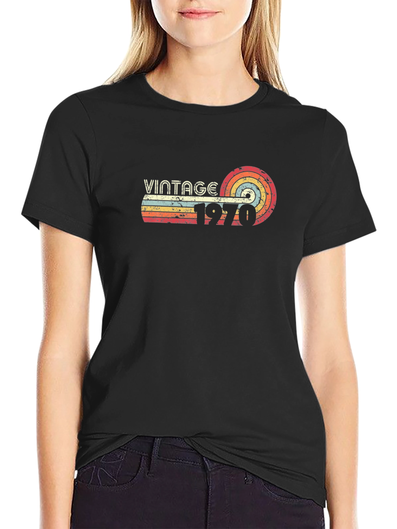 Esta camiseta negra de manga corta presenta un diseño de estilo retro que evoca la época de 1970. La impresión vintage, con la palabra "VINTAGE" sobre franjas horizontales de colores cálidos y un círculo concéntrico desgastado, le da un toque auténtico y nostálgico. Confeccionada en un tejido suave y cómodo, esta camiseta es perfecta para el uso diario, ya sea para salir con amigos, ir a un concierto o simplemente relajarse en casa. Su diseño único la convierte en una excelente opción para aquellos que buscan expresar su estilo individual con un toque de historia y originalidad. Combínala con jeans, pantalones cortos o una falda para un look casual y a la moda.