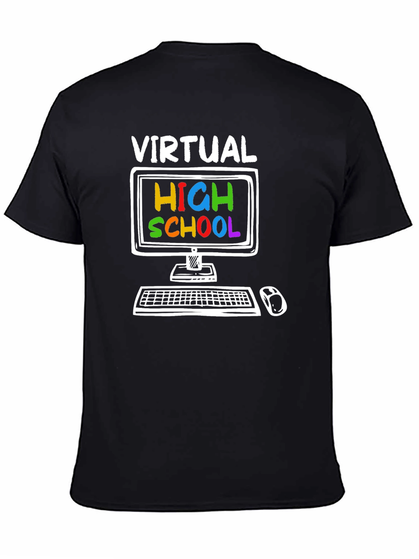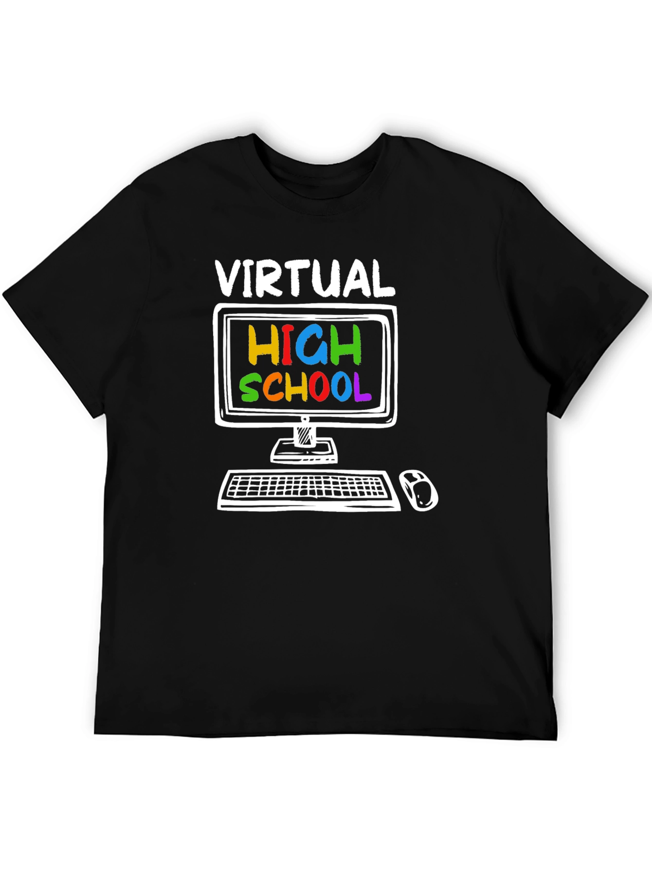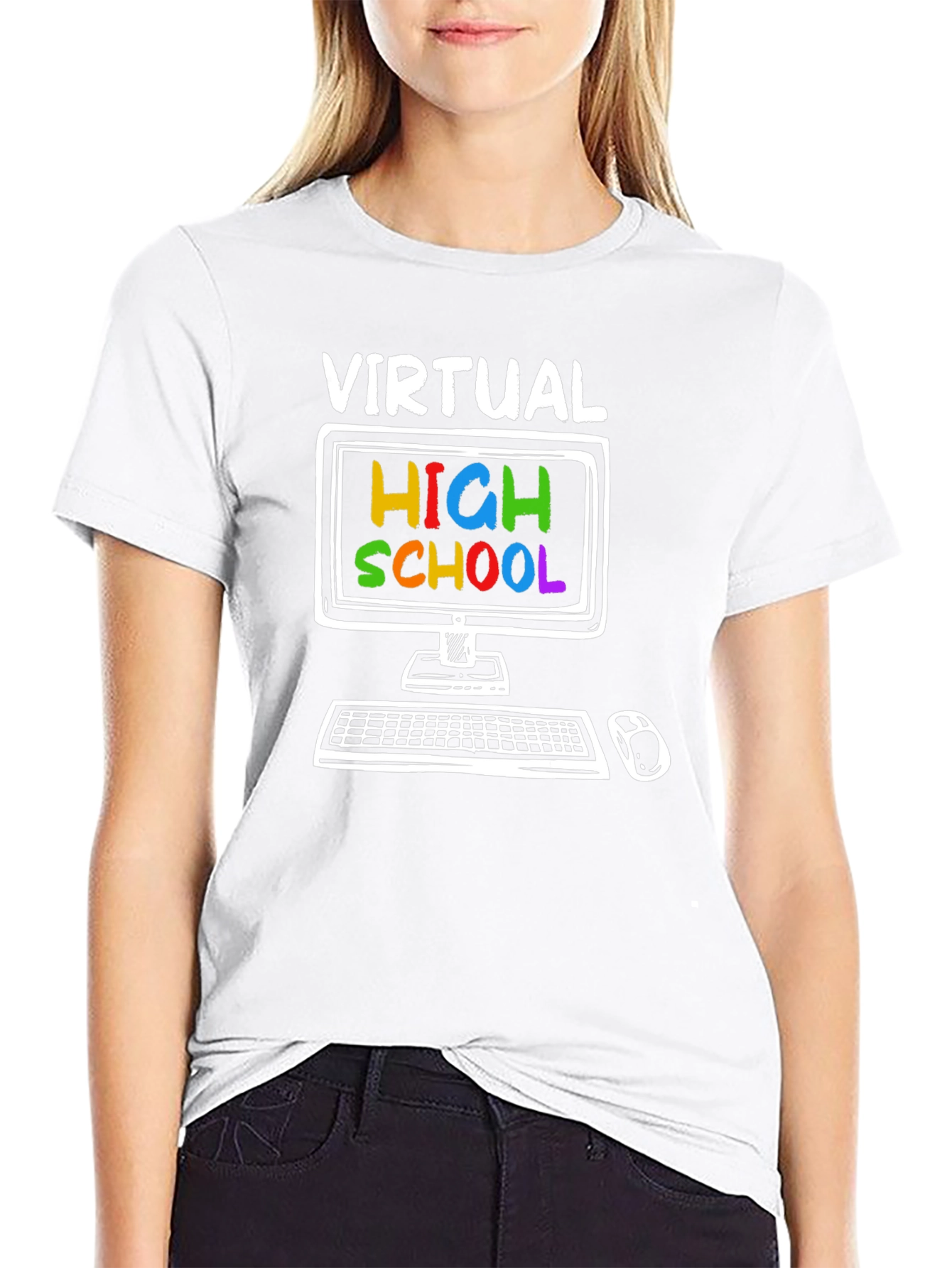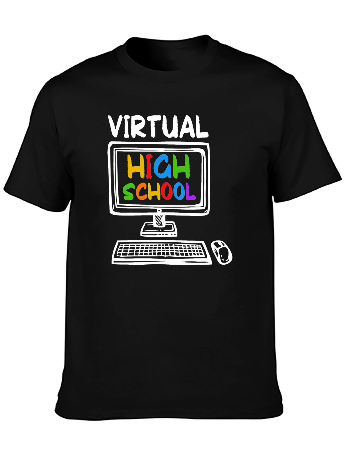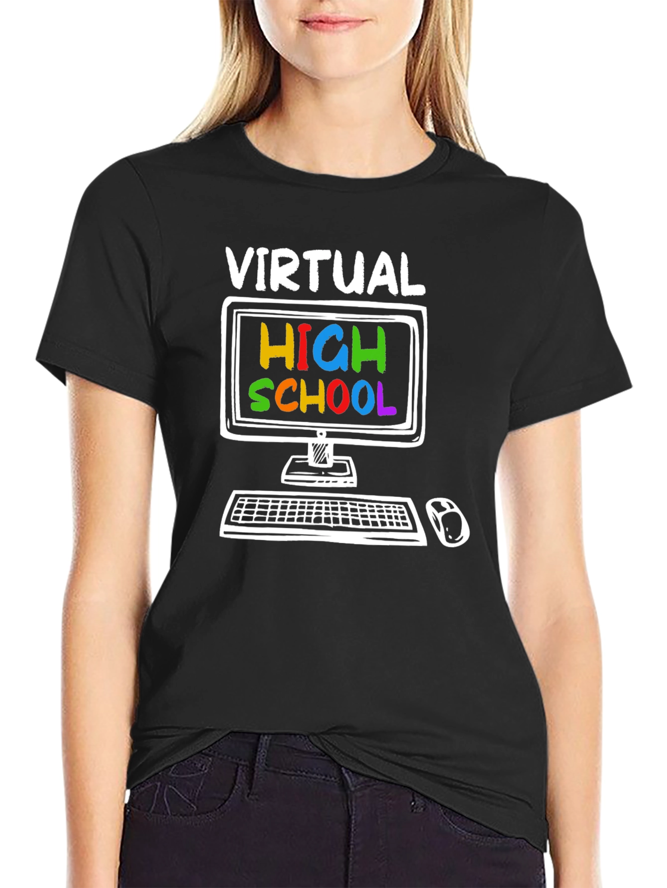 ¡Prepárate para la escuela virtual con estilo! Esta camiseta negra presenta un diseño llamativo de 'Virtual High School' con una ilustración de computadora y teclado en blanco, resaltada con letras de colores vibrantes. Fabricada con materiales suaves y cómodos, esta camiseta es perfecta para largas sesiones de estudio en casa o para mostrar tu orgullo escolar virtual. Ideal para estudiantes de secundaria que asisten a clases en línea y desean expresar su entusiasmo por la educación a distancia. ¡Lleva tu espíritu escolar virtual a donde quiera que vayas con esta camiseta única y divertida!
