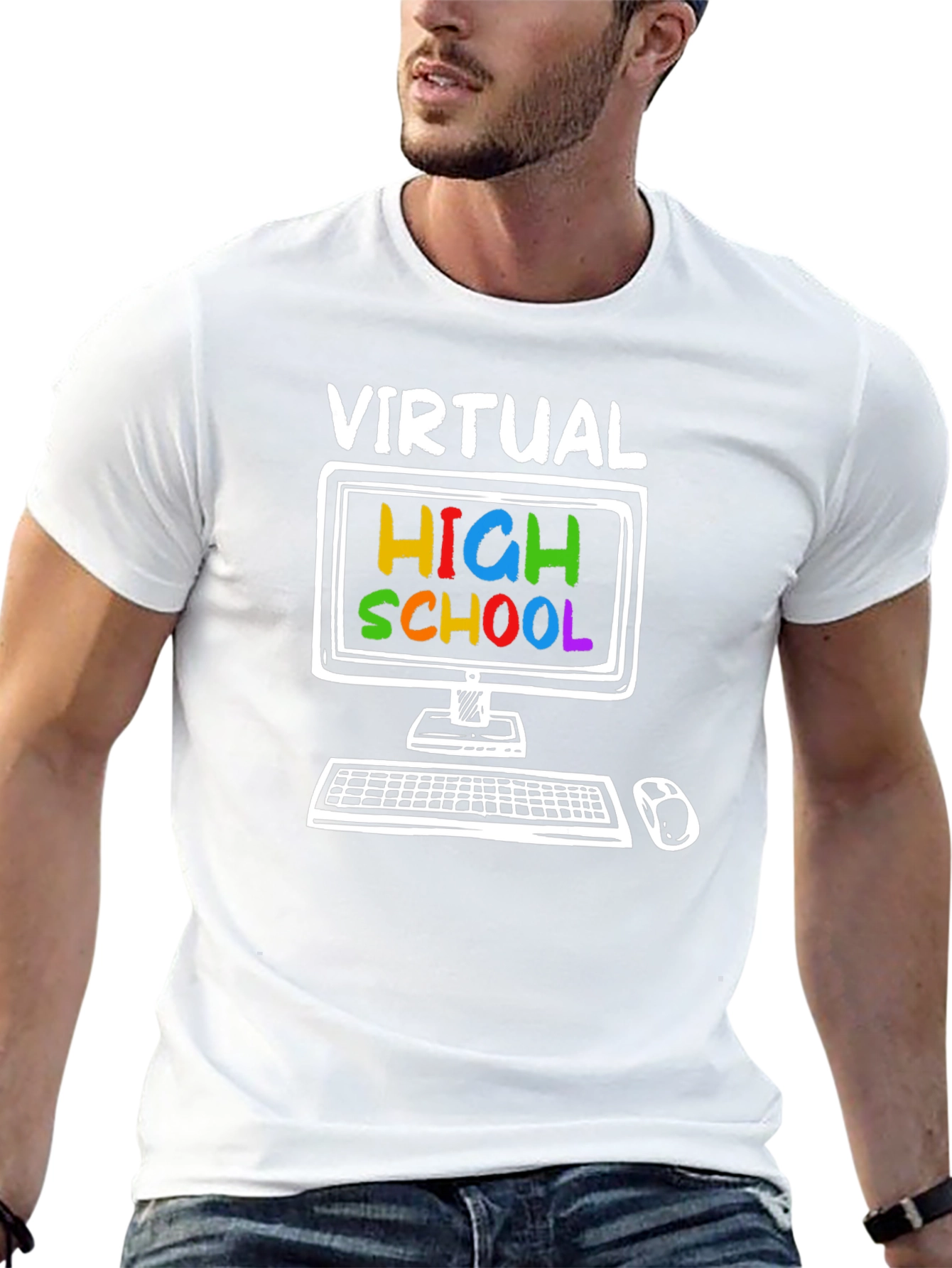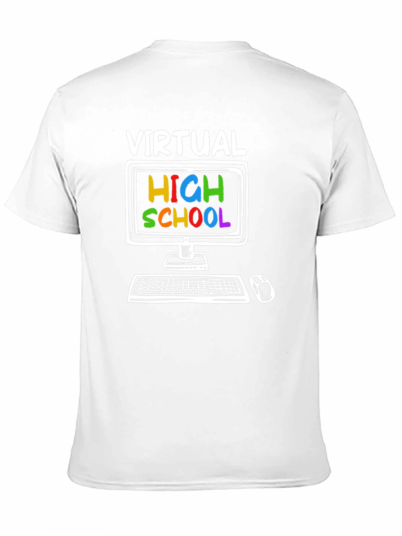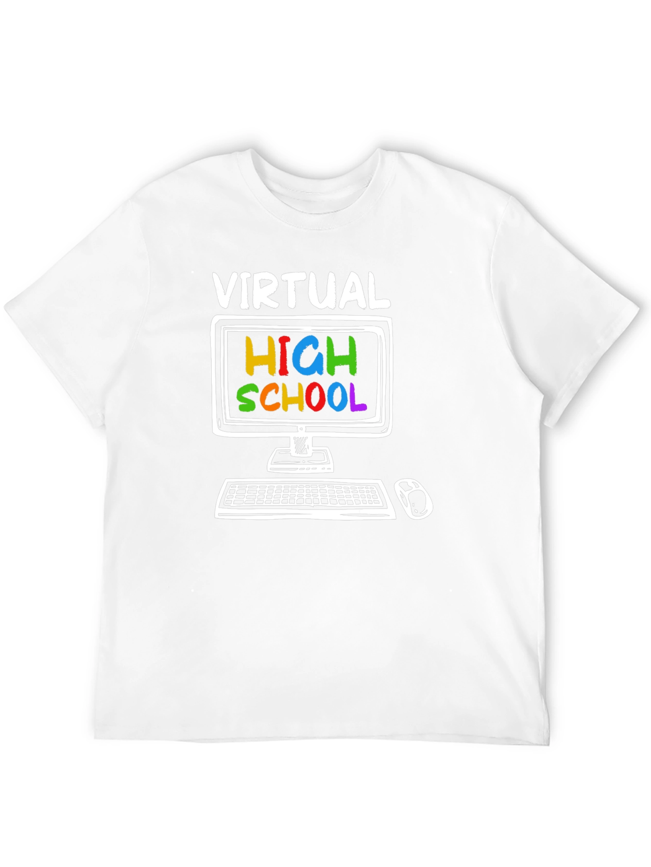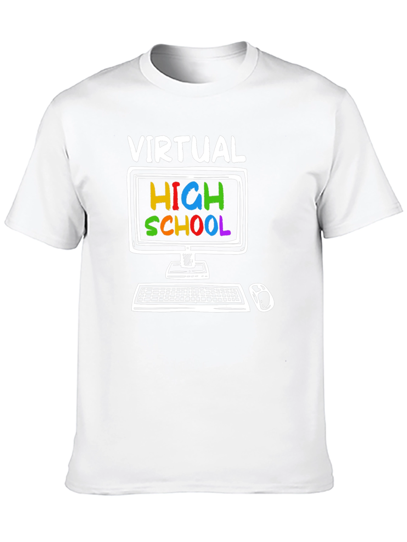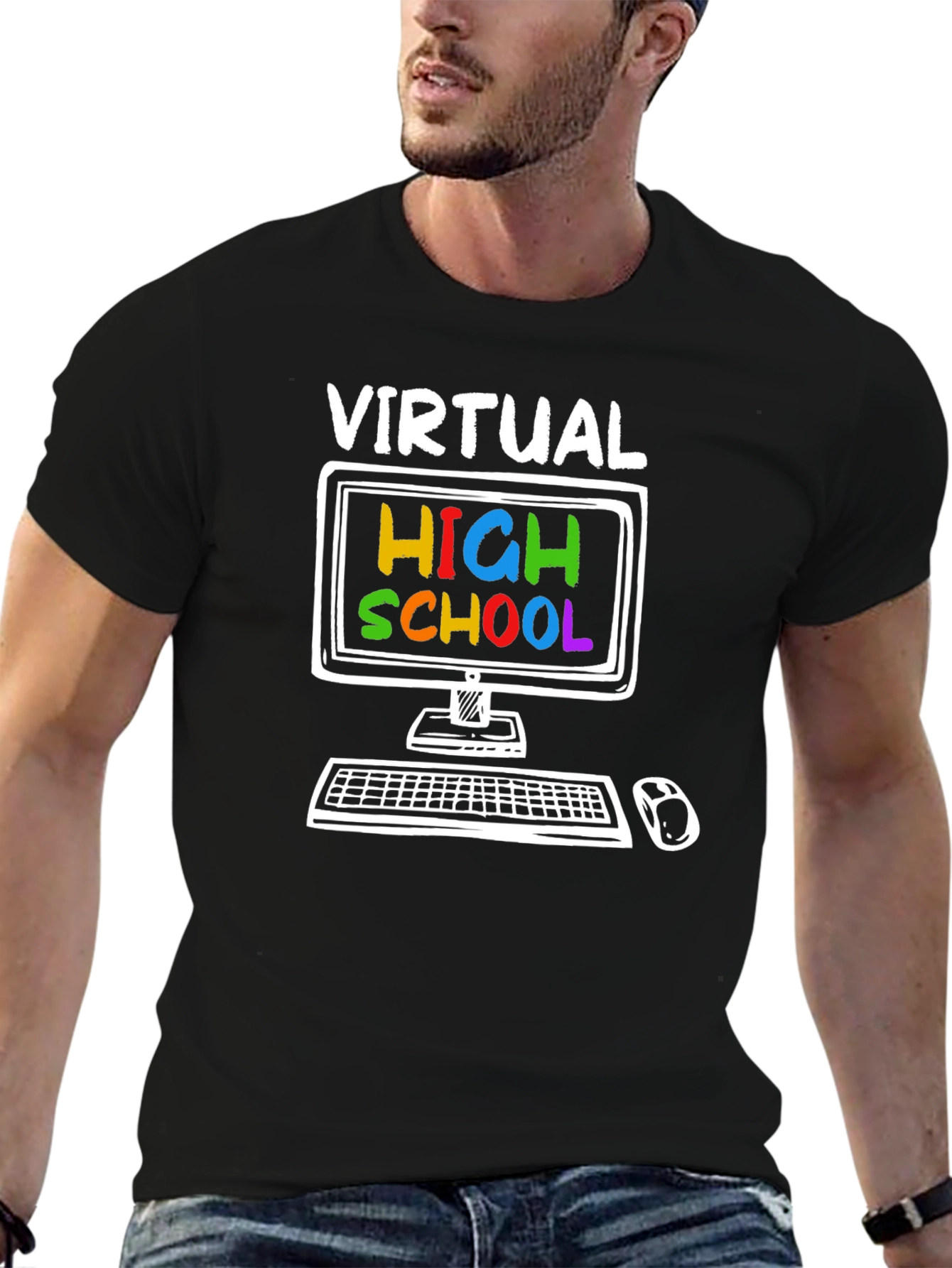 ¡Prepárate para la escuela virtual con estilo! Esta camiseta negra presenta un diseño llamativo de 'Virtual High School' con una ilustración de computadora y teclado en blanco, resaltada con letras de colores vibrantes. Fabricada con materiales suaves y cómodos, esta camiseta es perfecta para largas sesiones de estudio en casa o para mostrar tu orgullo escolar virtual. Ideal para estudiantes de secundaria que asisten a clases en línea y desean expresar su entusiasmo por la educación a distancia. ¡Lleva tu espíritu escolar virtual a donde quiera que vayas con esta camiseta única y divertida!