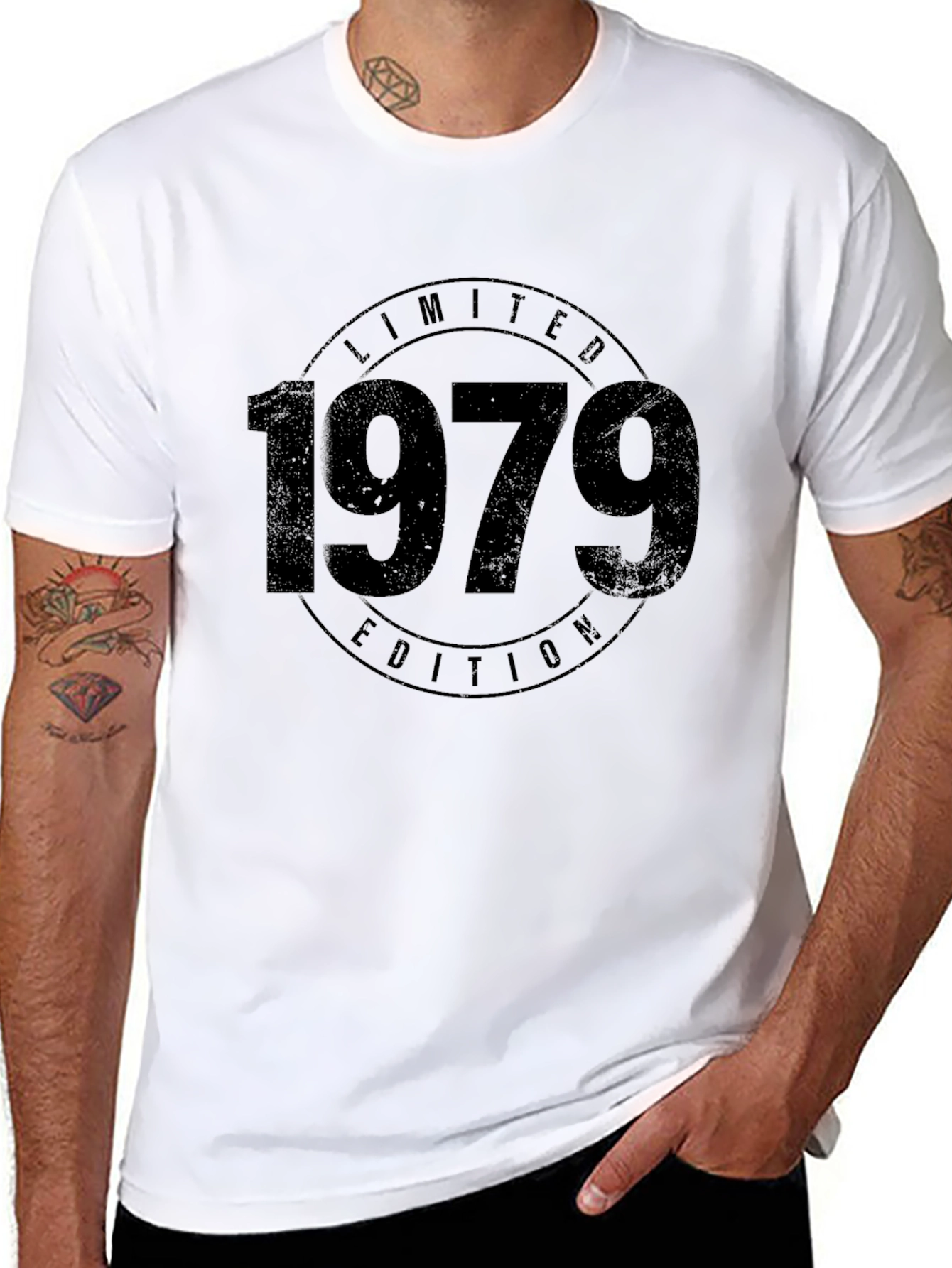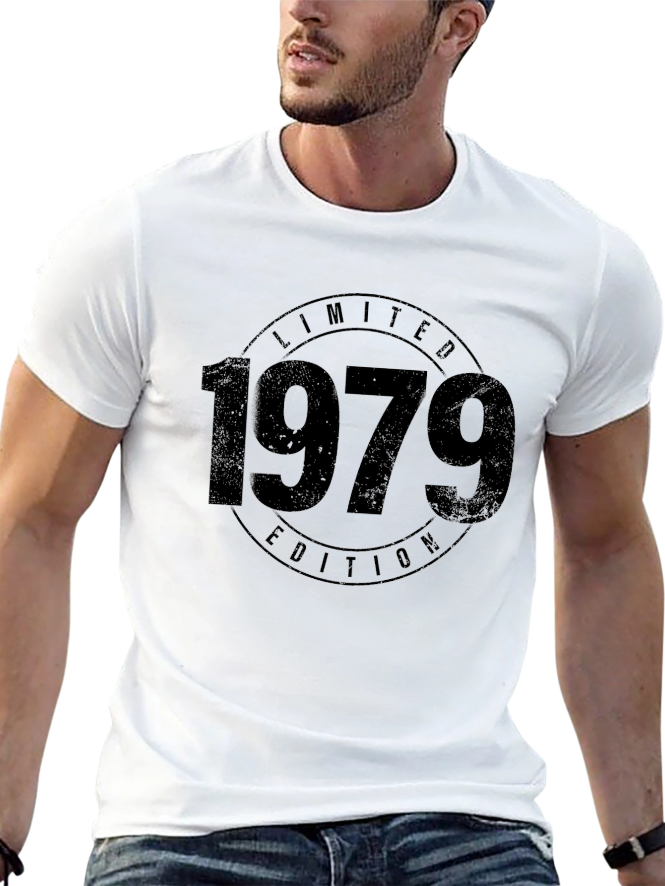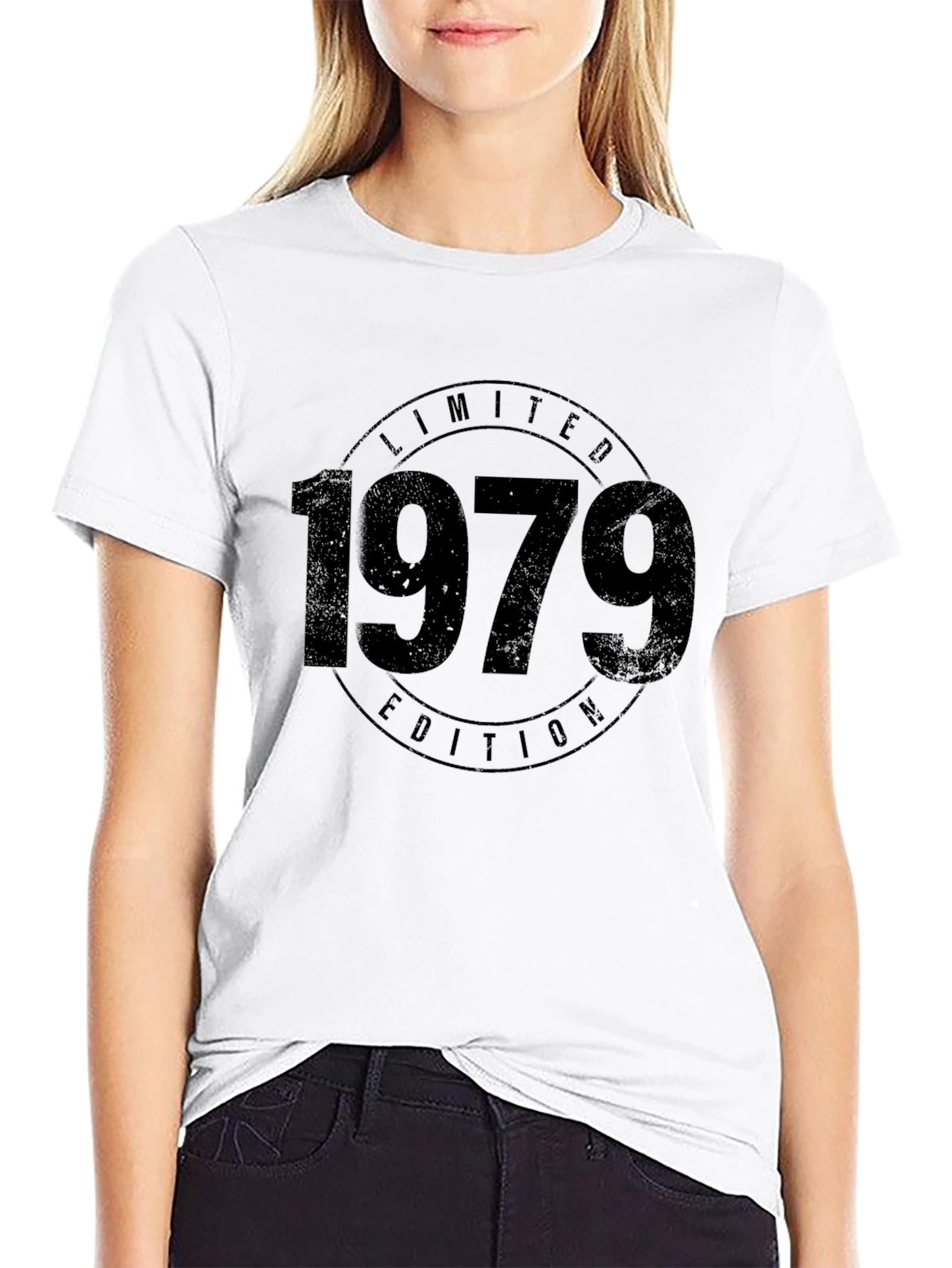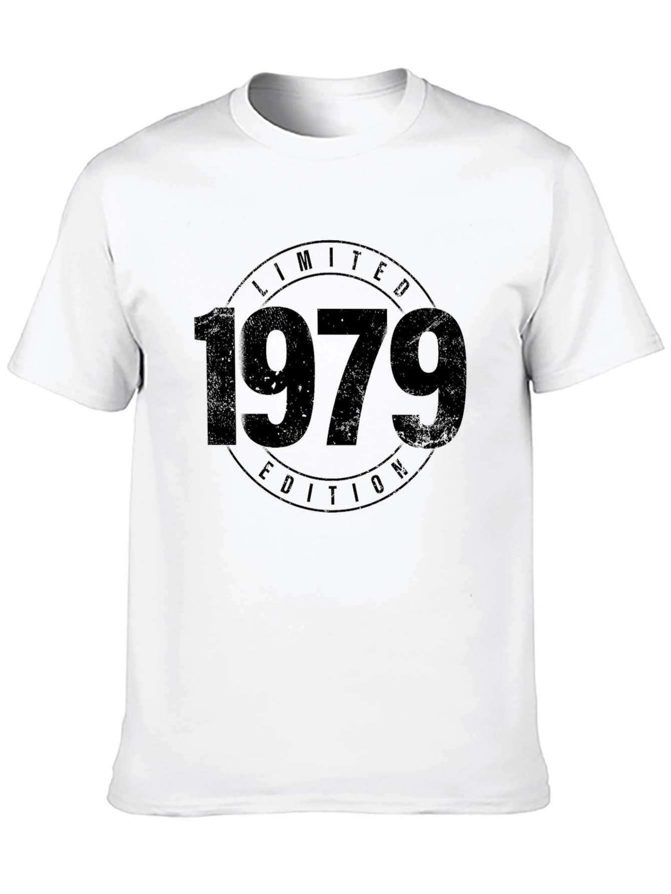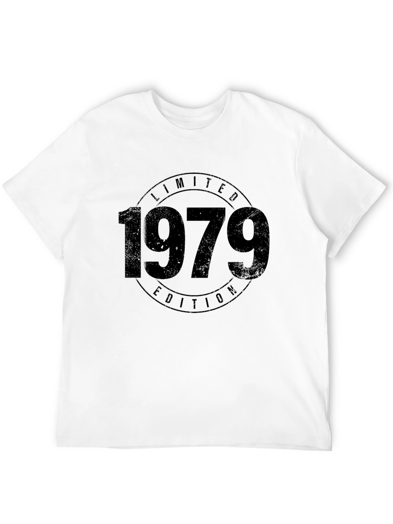 This classic black t-shirt features a bold "1979 Limited Edition" graphic. The vintage-inspired design adds a touch of retro charm. Made from a comfortable, soft fabric, this tee is perfect for casual wear. The classic fit ensures a flattering silhouette for everyday style. Ideal for those born in 1979 or anyone who appreciates a vintage aesthetic, this shirt makes a statement. Dress it up with jeans and a jacket, or keep it casual with shorts. Show off your unique style with this eye-catching piece!